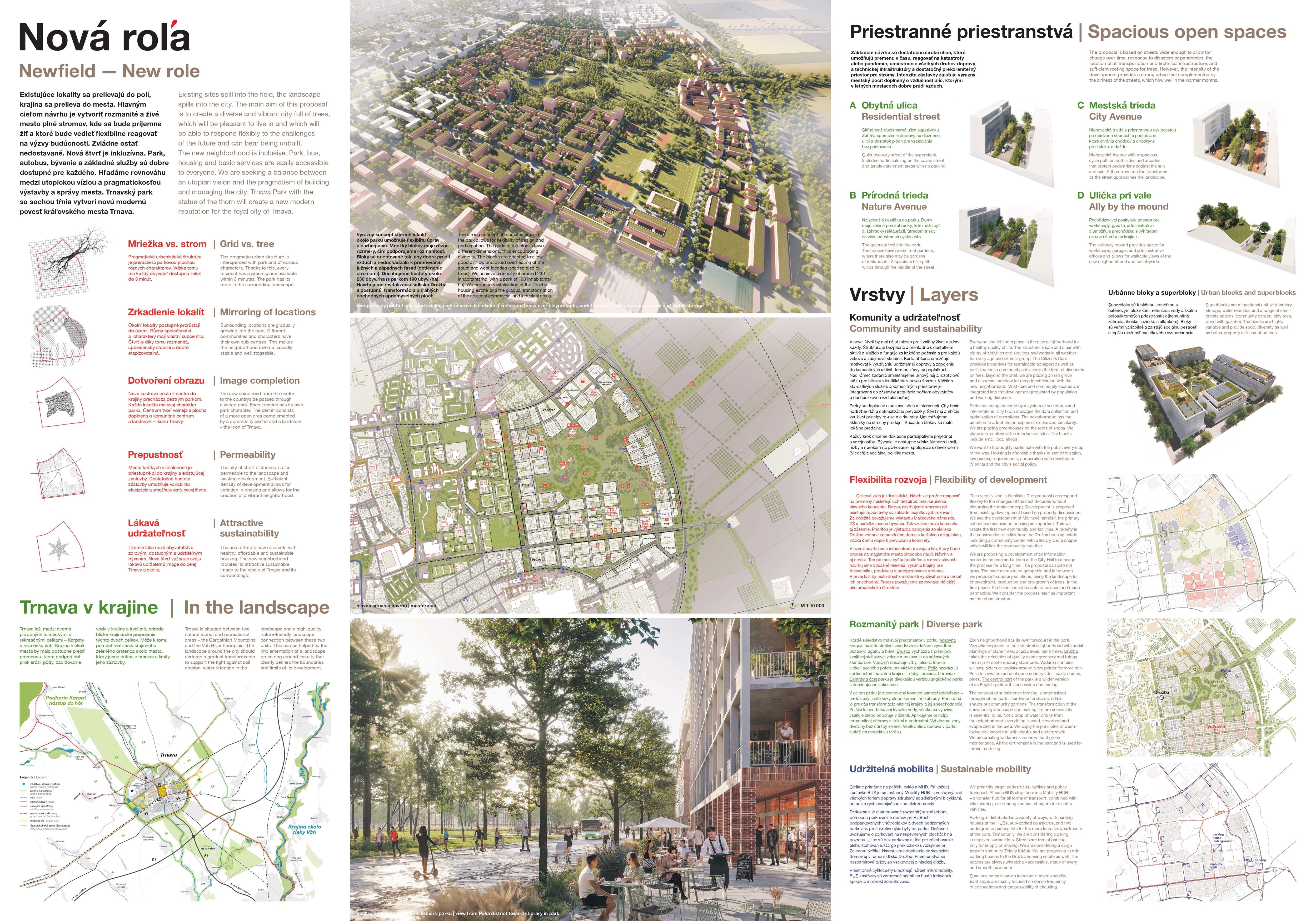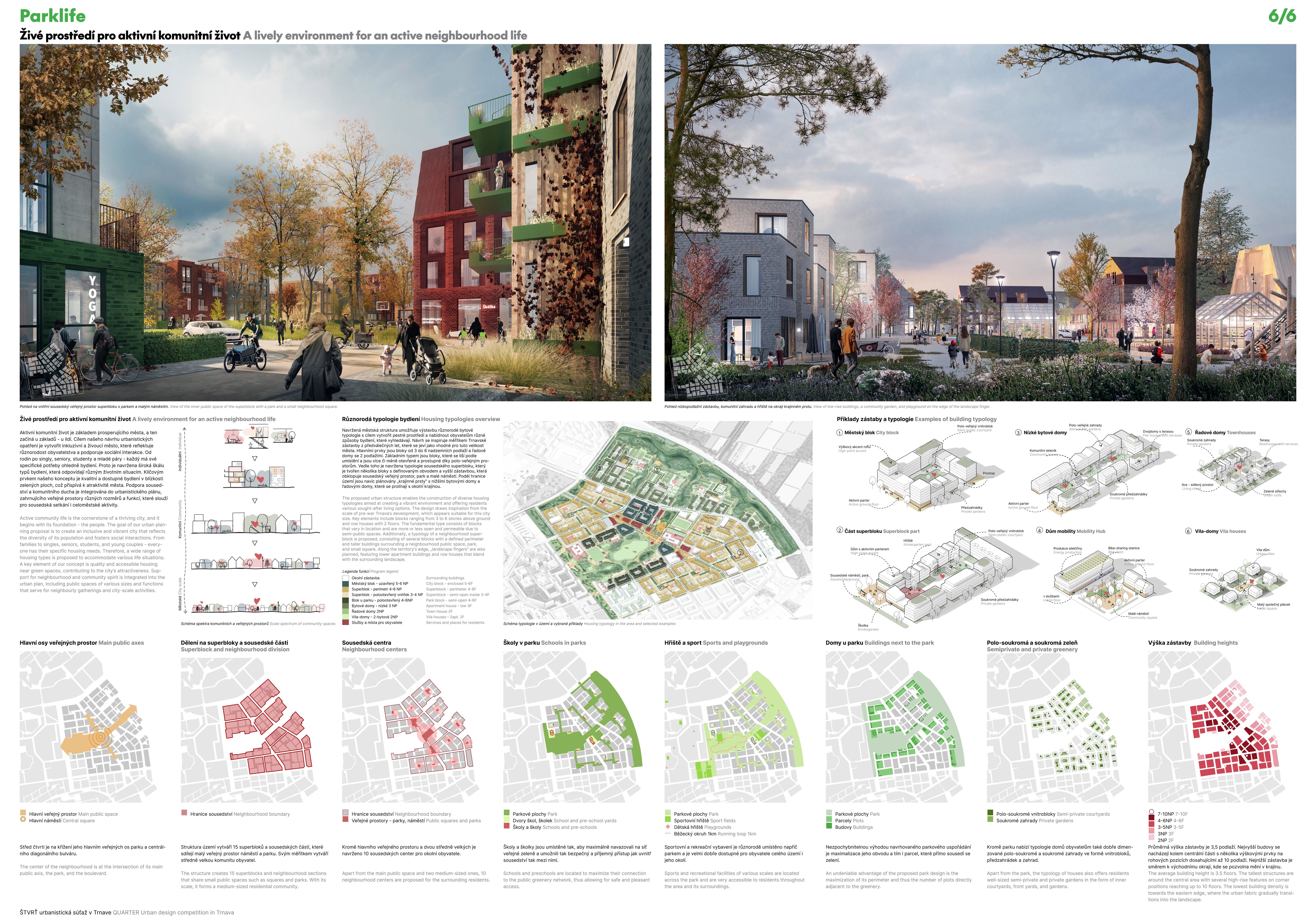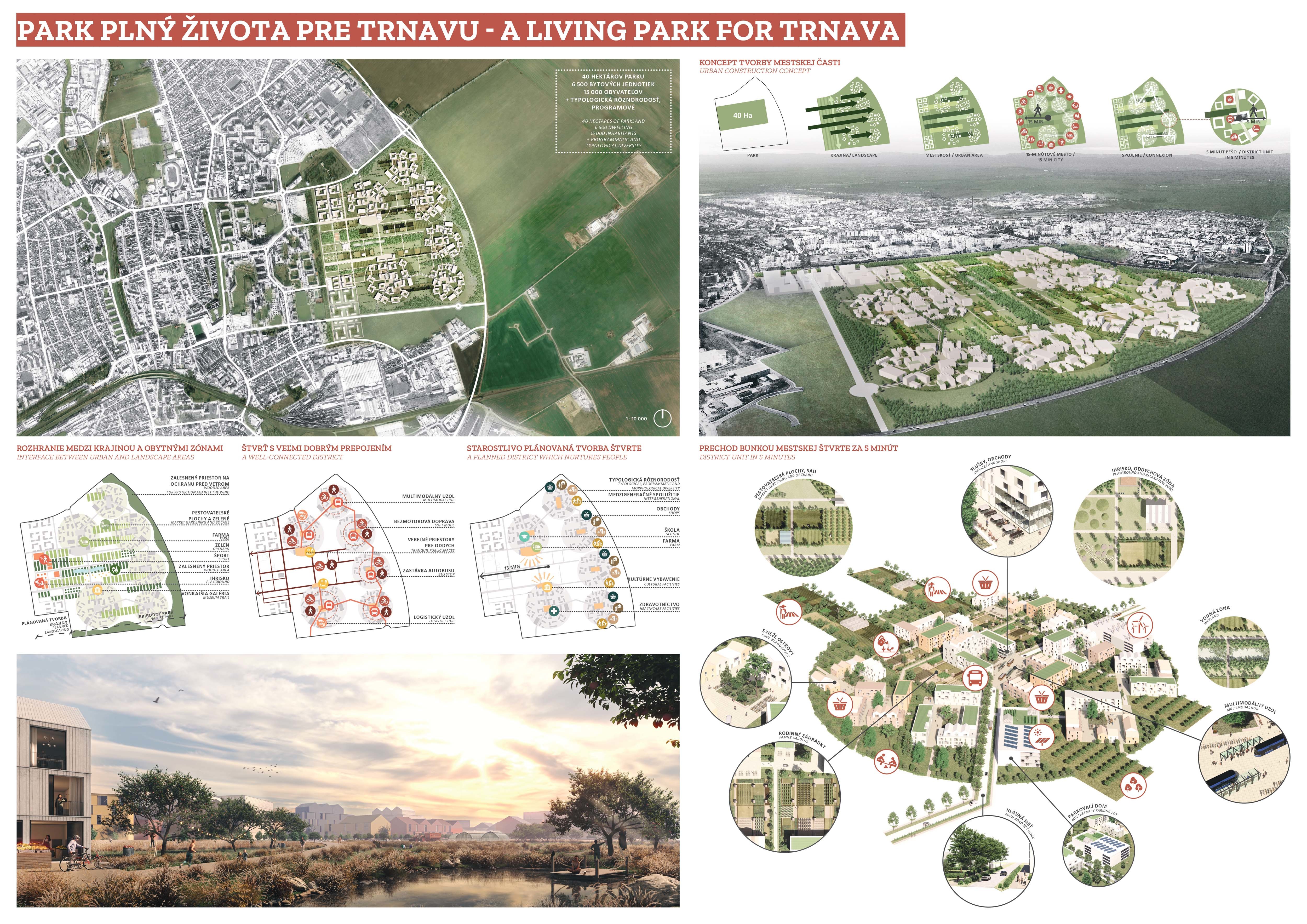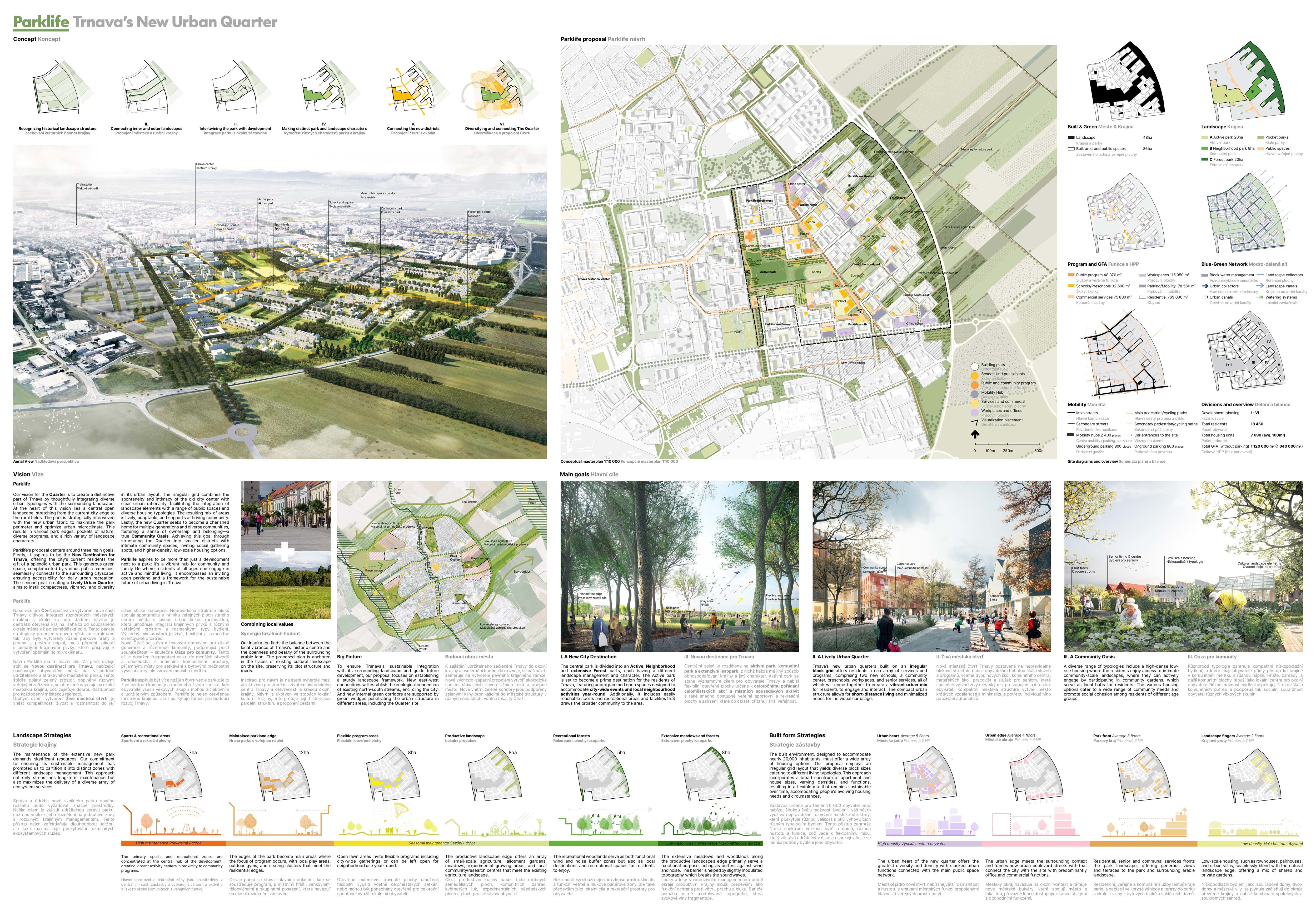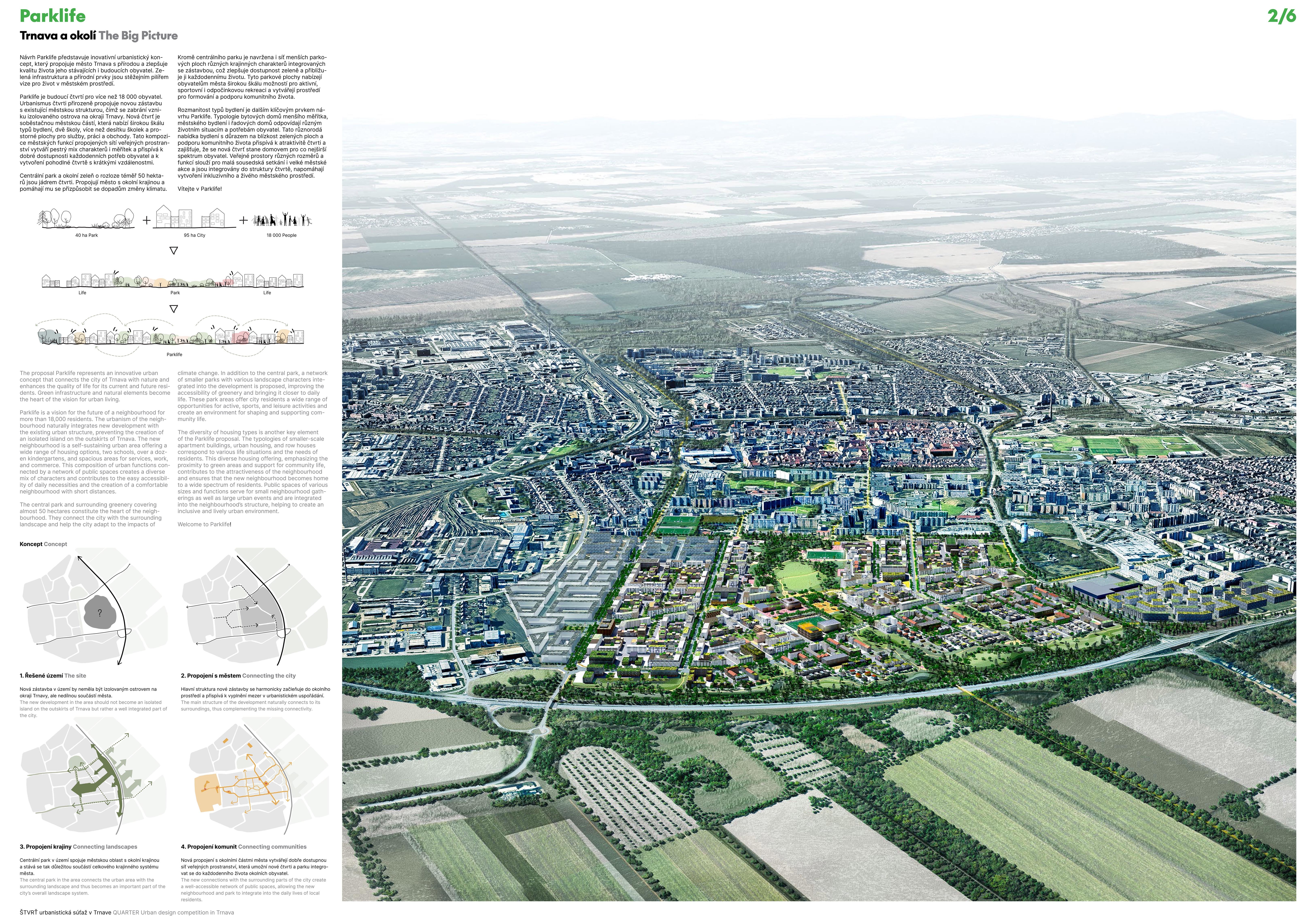 Holistický projekt, ktorý zachytáva podstatu plánovania miest budúcnosti, kde krajina tvorí základ návrhu a kde sú aspekty ako odolnosť voči zmene klímy, reziliencia a ekológia od základu zakotvené v DNA návrhu. Výsledný rámec sa nepozerá iba do budúcnosti, ale je prekvapivo dobre ukotvený v mierke a charaktere mesta Trnava. Parklife dokáže šikovne pretaviť myšlienku centrálneho parku do robustnej siete zelených plôch, ktoré majú potrebnú mierku na to, aby mali ekologický dopad, ale nie sú predimenzované tak, aby tvorili bariéry. Táto nová modro-zelená infraštruktúra bude slúžiť nielen ako klimatická infraštruktúra, ale zároveň vdýchne charakter a identitu rôznym susedstvám. Rozmanitosť mierky a charakteru zabezpečí pocit komunity a príslušnosti v rôznych mierkach štvrte, od skupiny domov sústredených okolo zeleného neformálneho námestia, cez štvrť točiacu sa okolo zeleného prsta, až po priestory pre celú Trnavu.