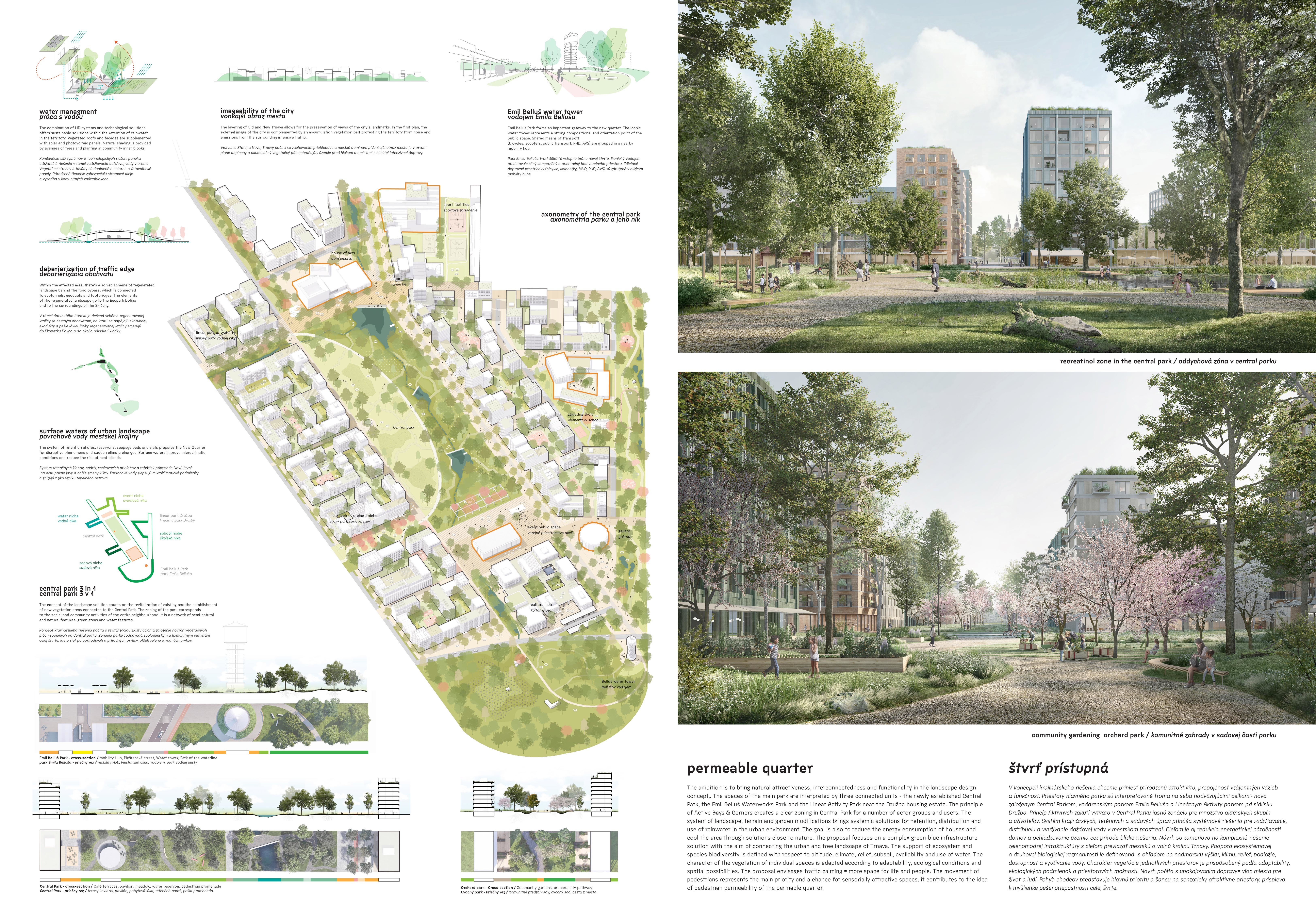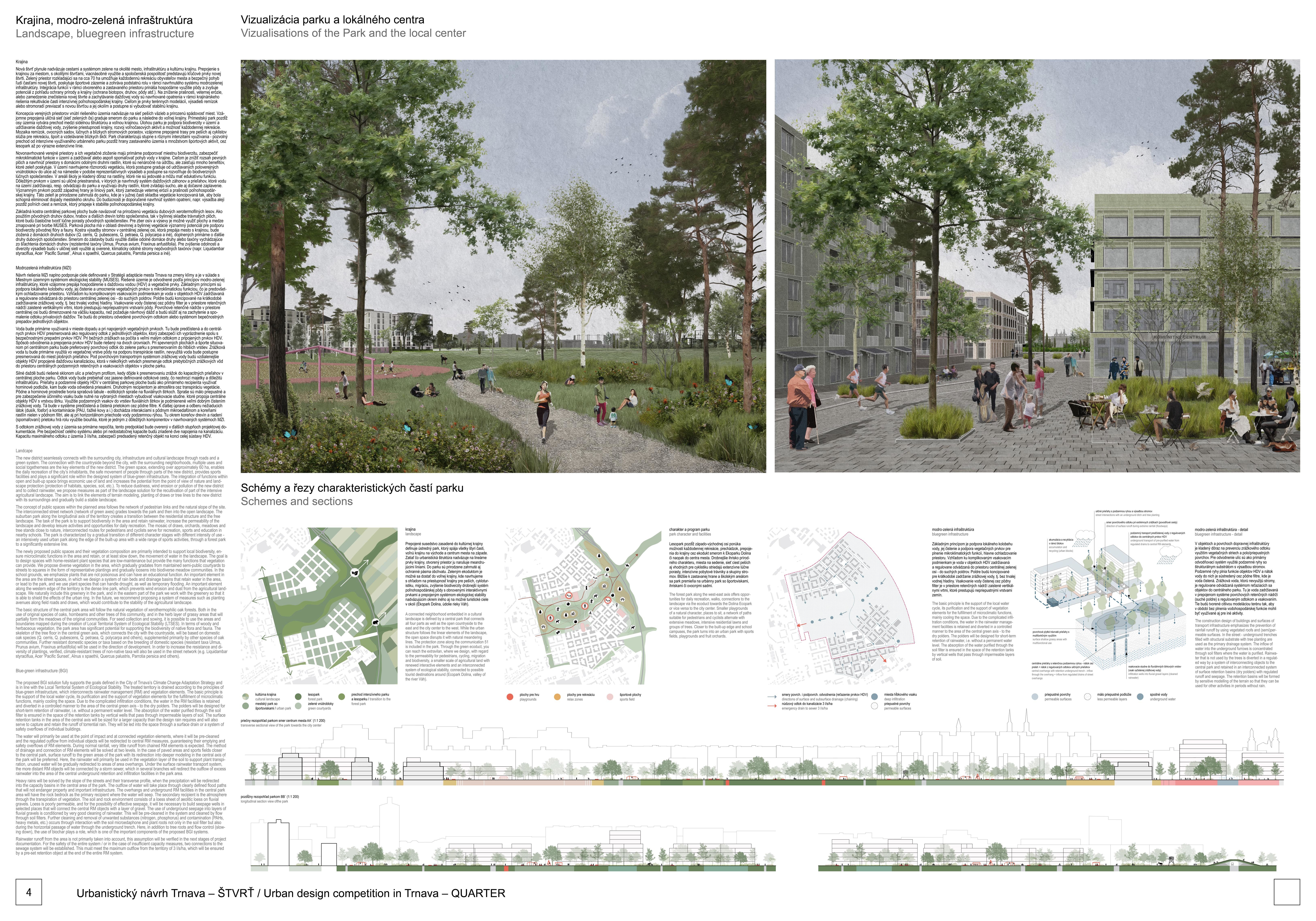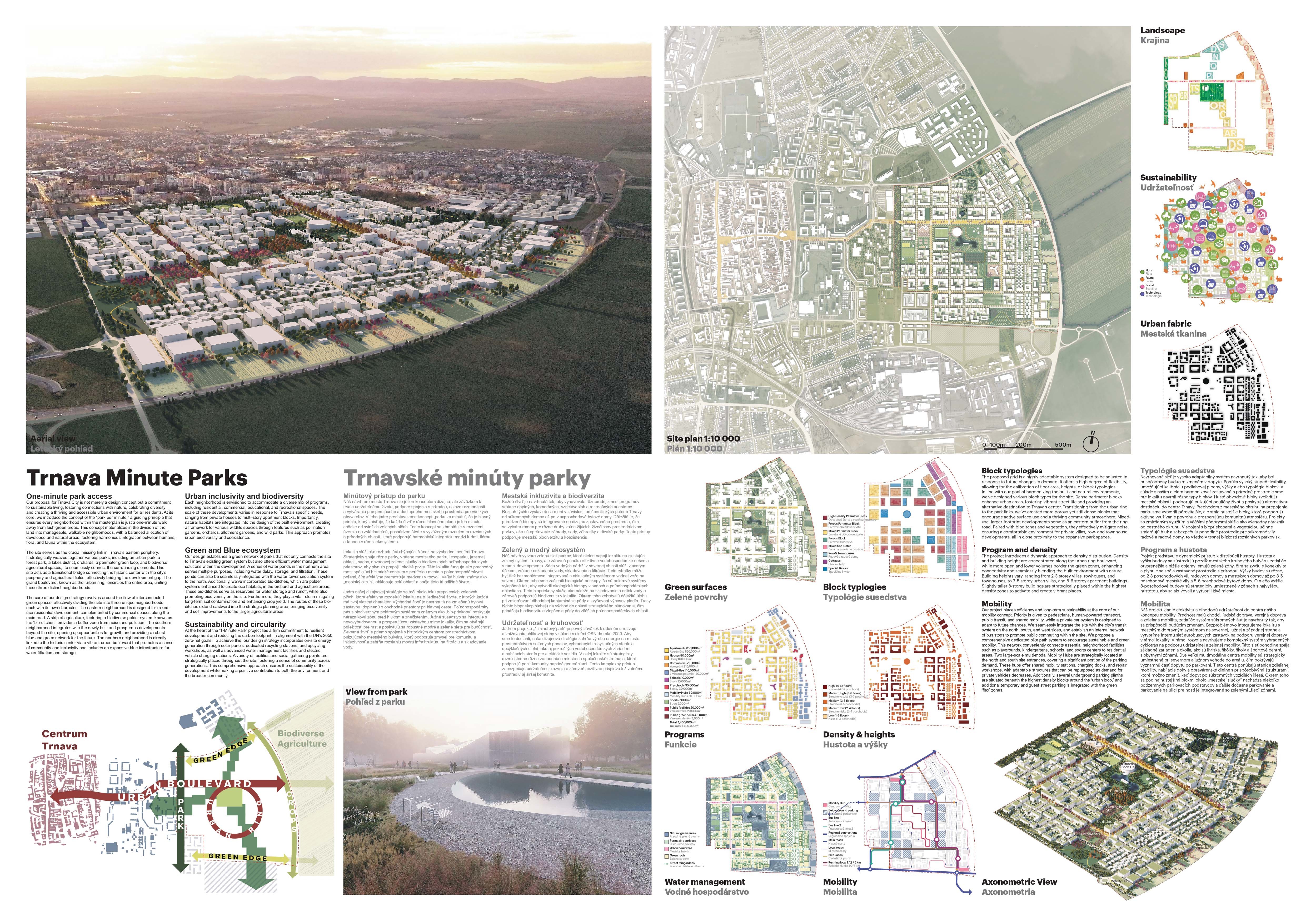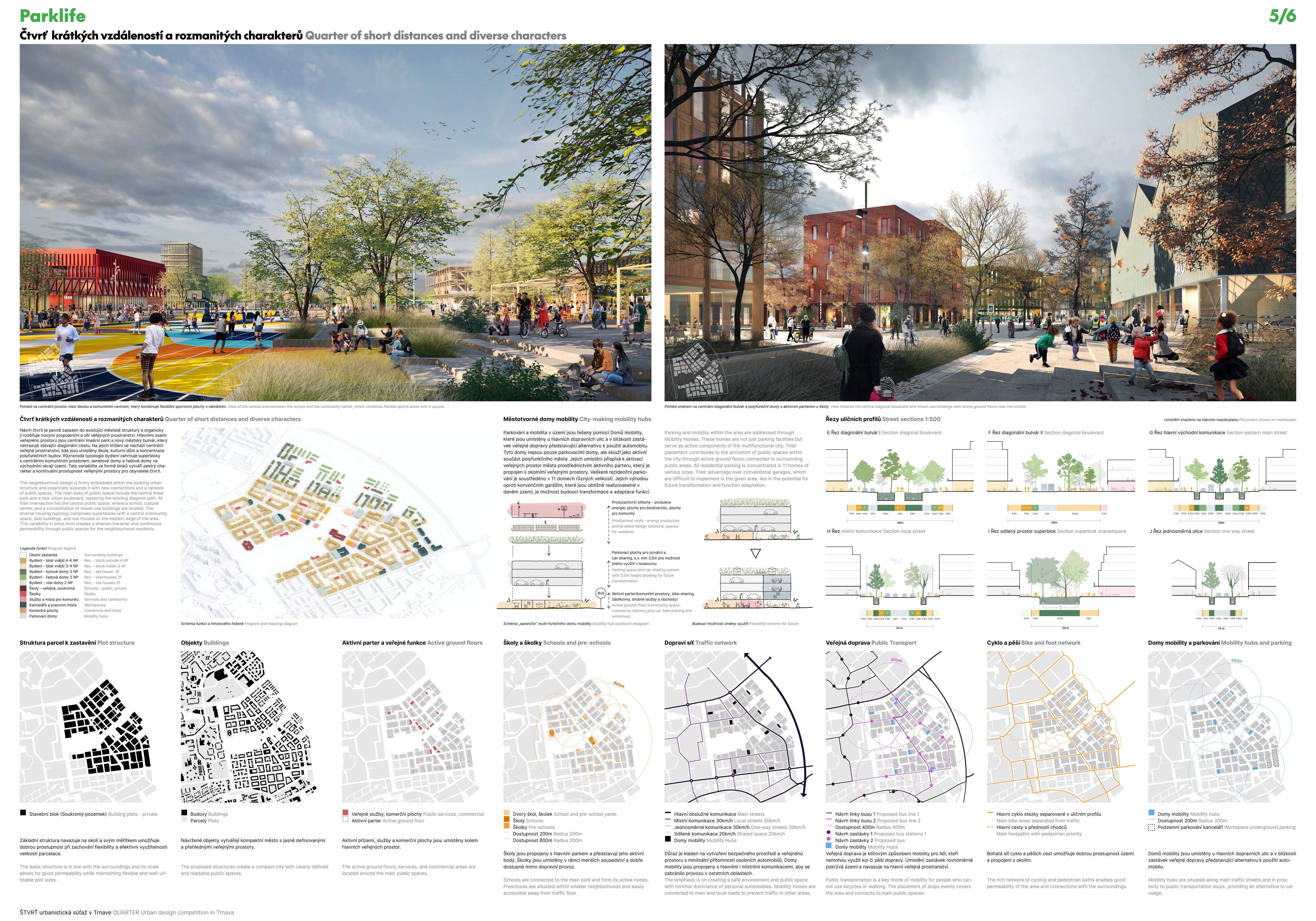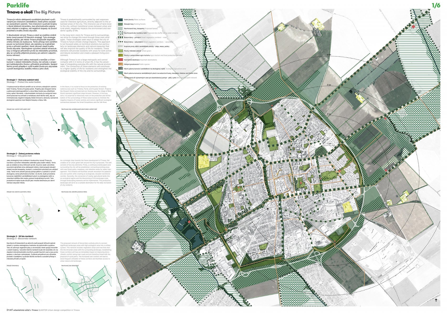 Holistický projekt, ktorý zachytáva podstatu plánovania miest budúcnosti, kde krajina tvorí základ návrhu a kde sú aspekty ako odolnosť voči zmene klímy, reziliencia a ekológia od základu zakotvené v DNA návrhu. Výsledný rámec sa nepozerá iba do budúcnosti, ale je prekvapivo dobre ukotvený v mierke a charaktere mesta Trnava. Parklife dokáže šikovne pretaviť myšlienku centrálneho parku do robustnej siete zelených plôch, ktoré majú potrebnú mierku na to, aby mali ekologický dopad, ale nie sú predimenzované tak, aby tvorili bariéry. Táto nová modro-zelená infraštruktúra bude slúžiť nielen ako klimatická infraštruktúra, ale zároveň vdýchne charakter a identitu rôznym susedstvám. Rozmanitosť mierky a charakteru zabezpečí pocit komunity a príslušnosti v rôznych mierkach štvrte, od skupiny domov sústredených okolo zeleného neformálneho námestia, cez štvrť točiacu sa okolo zeleného prsta, až po priestory pre celú Trnavu.
