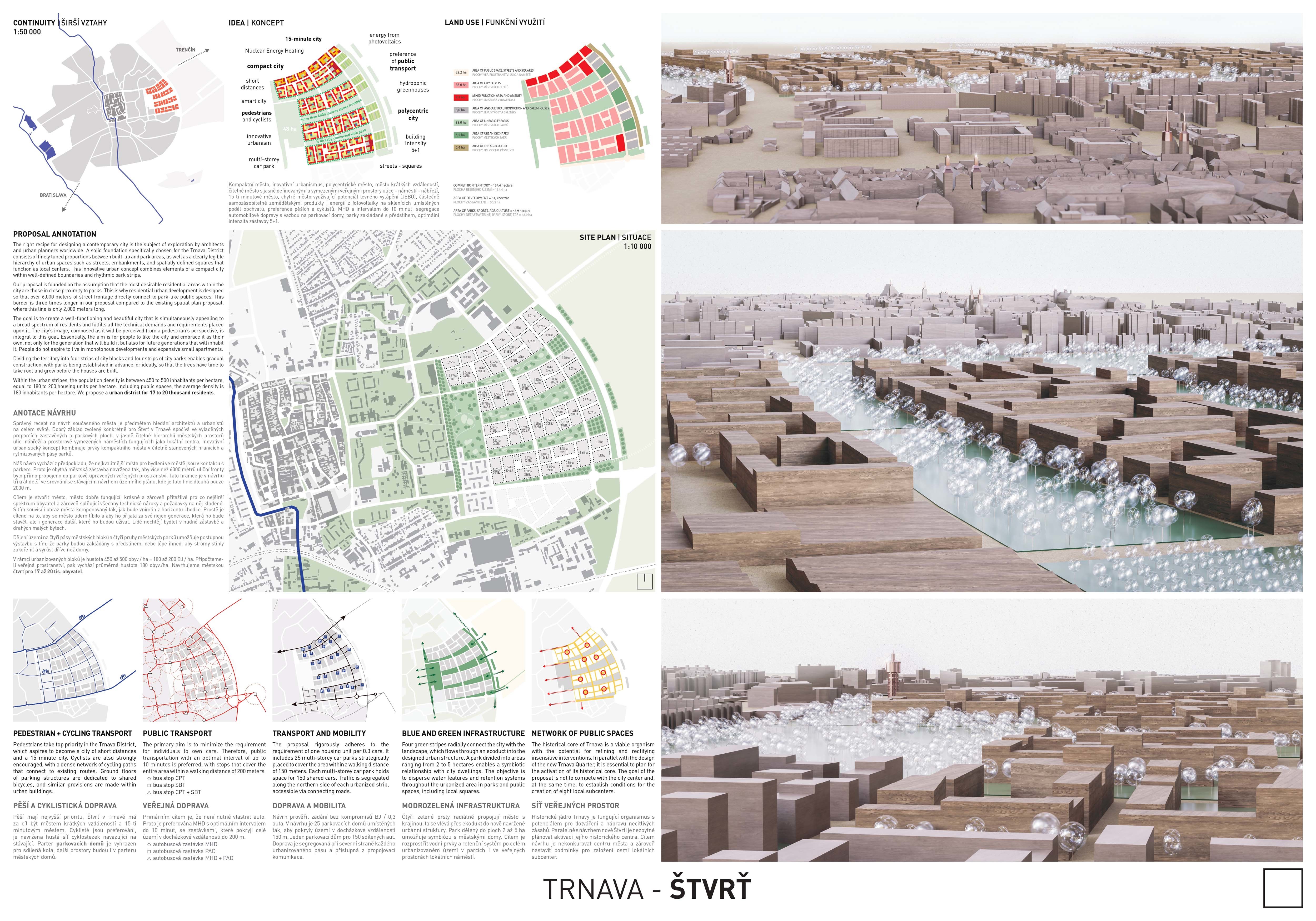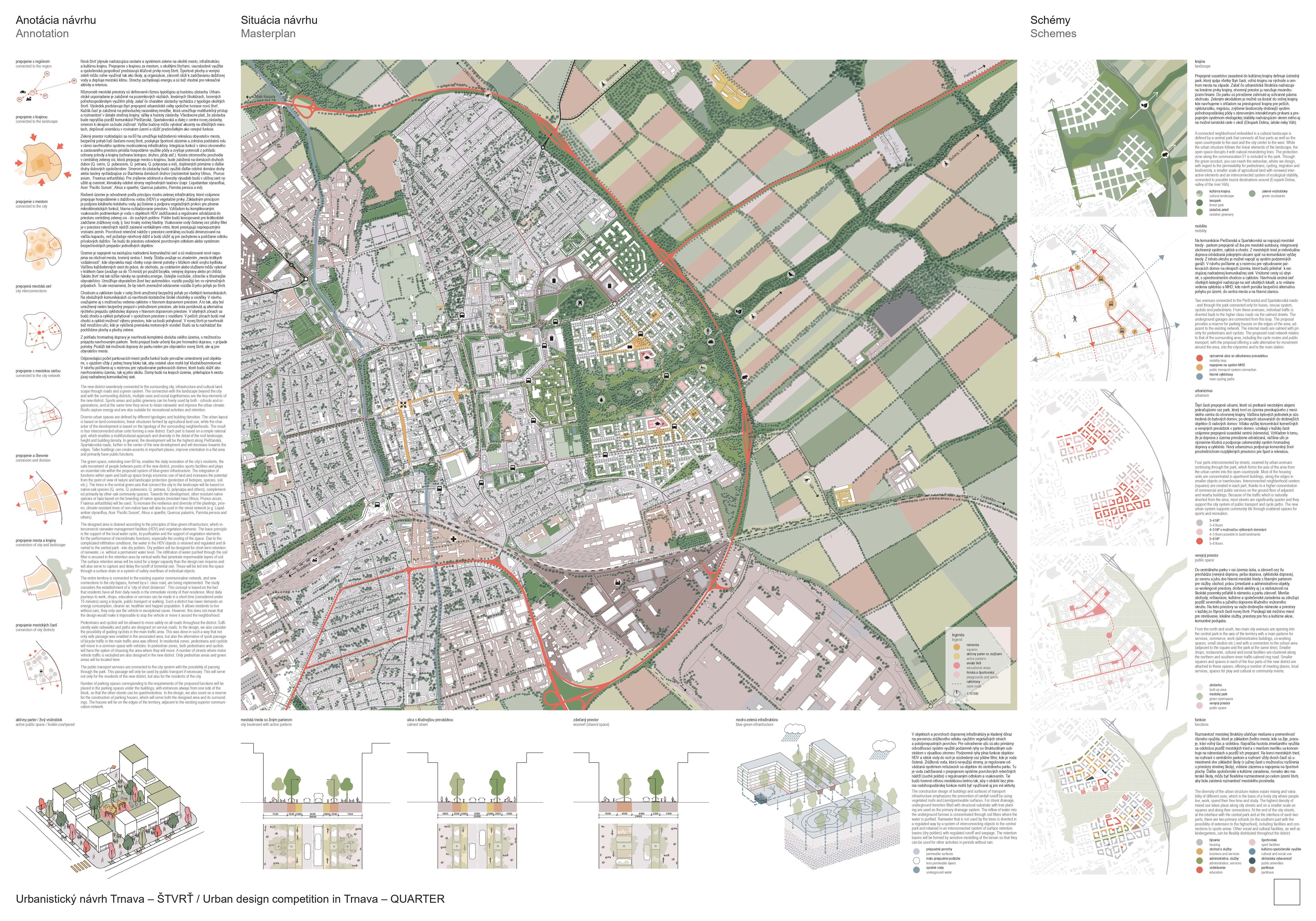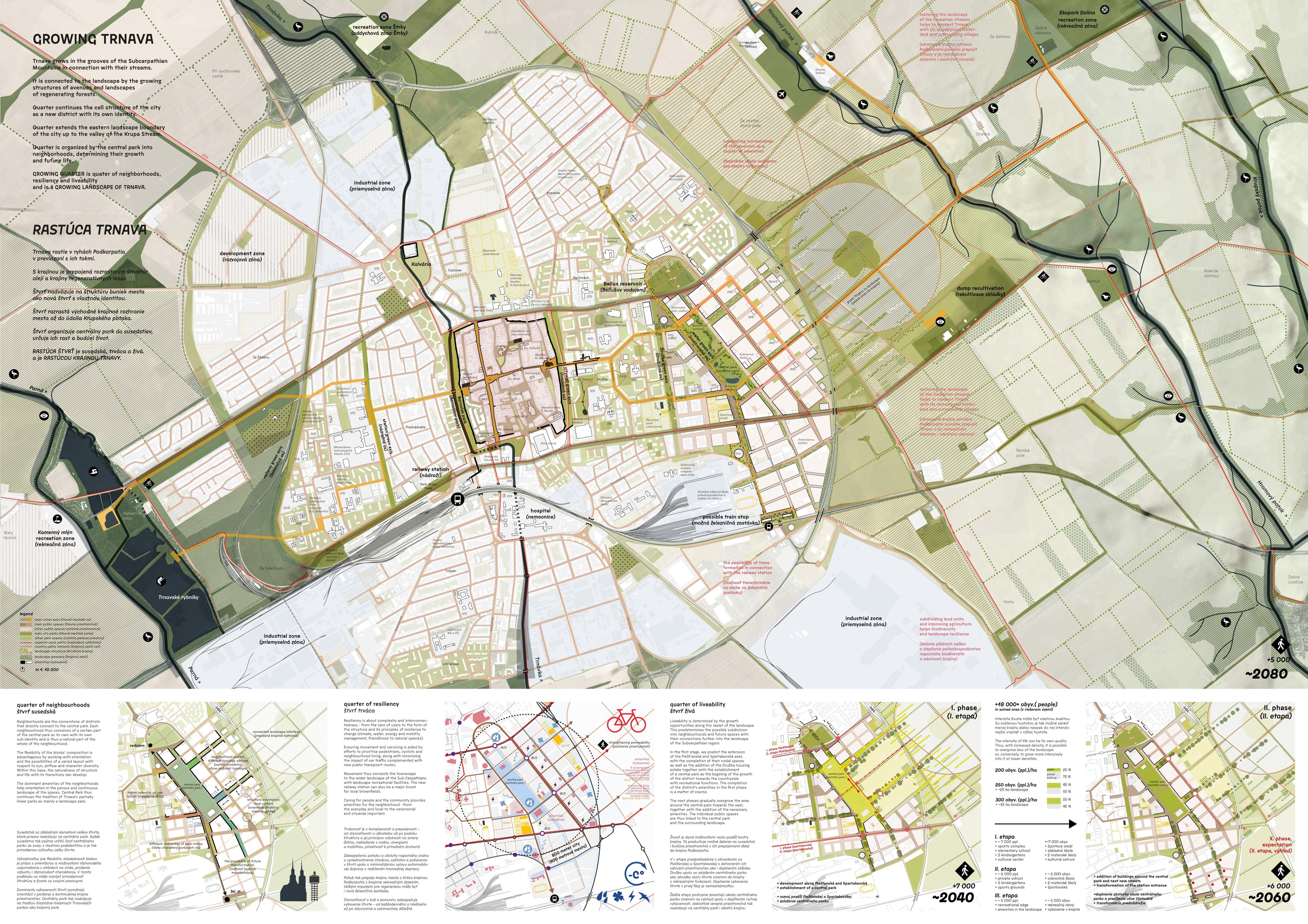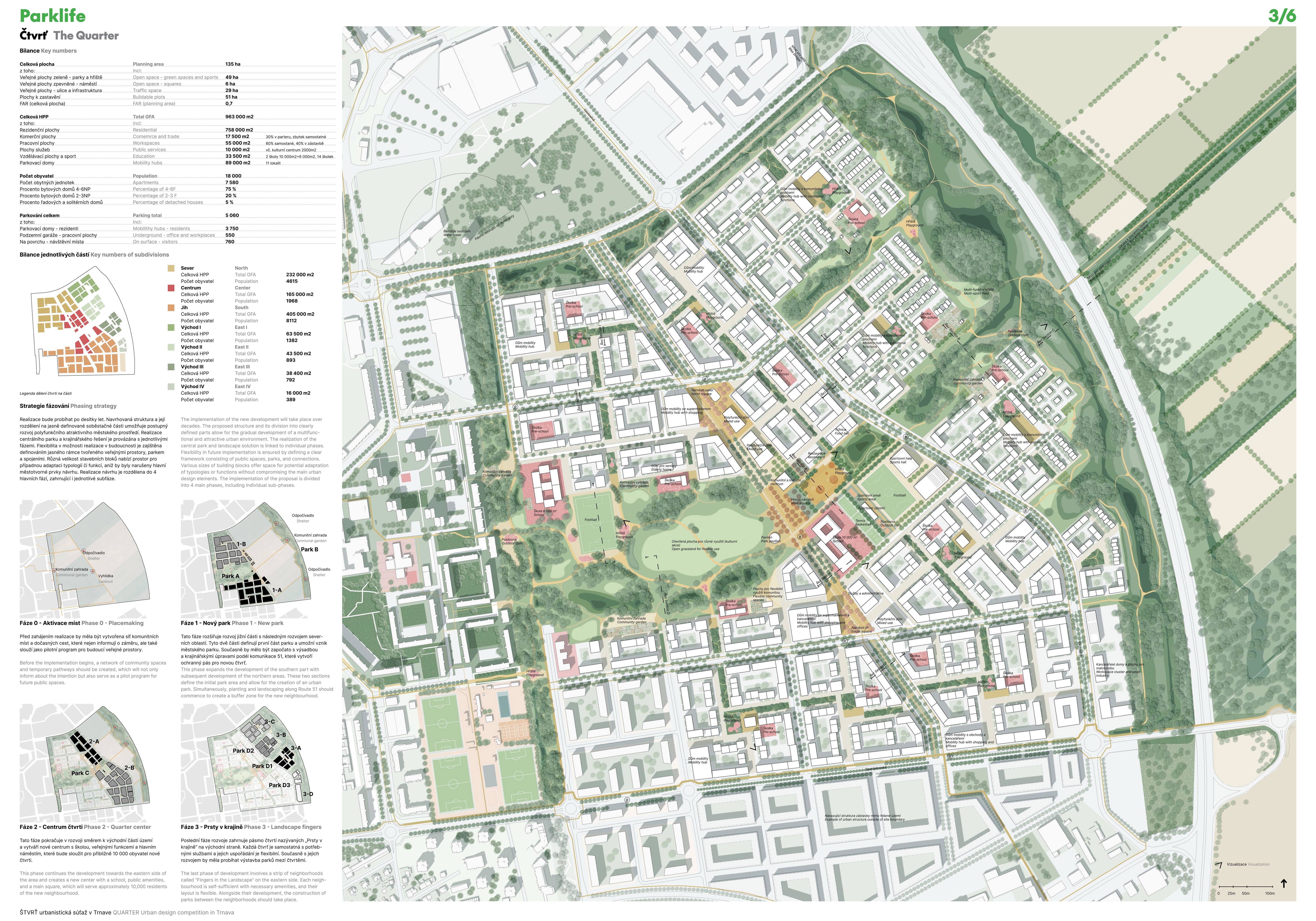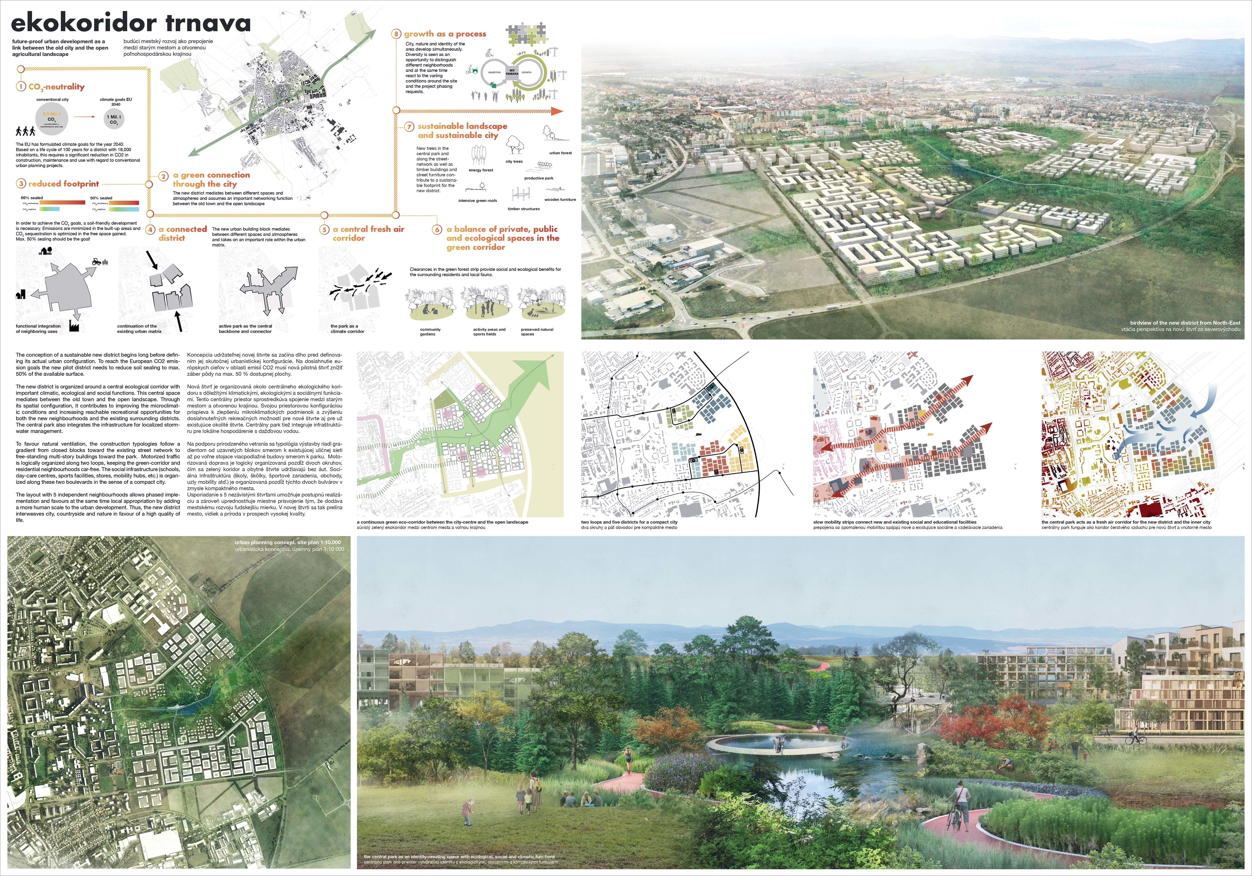 Holistický projekt, ktorý zachytáva podstatu plánovania miest budúcnosti, kde krajina tvorí základ návrhu a kde sú aspekty ako odolnosť voči zmene klímy, reziliencia a ekológia od základu zakotvené v DNA návrhu. Výsledný rámec sa nepozerá iba do budúcnosti, ale je prekvapivo dobre ukotvený v mierke a charaktere mesta Trnava. Parklife dokáže šikovne pretaviť myšlienku centrálneho parku do robustnej siete zelených plôch, ktoré majú potrebnú mierku na to, aby mali ekologický dopad, ale nie sú predimenzované tak, aby tvorili bariéry. Táto nová modro-zelená infraštruktúra bude slúžiť nielen ako klimatická infraštruktúra, ale zároveň vdýchne charakter a identitu rôznym susedstvám. Rozmanitosť mierky a charakteru zabezpečí pocit komunity a príslušnosti v rôznych mierkach štvrte, od skupiny domov sústredených okolo zeleného neformálneho námestia, cez štvrť točiacu sa okolo zeleného prsta, až po priestory pre celú Trnavu.