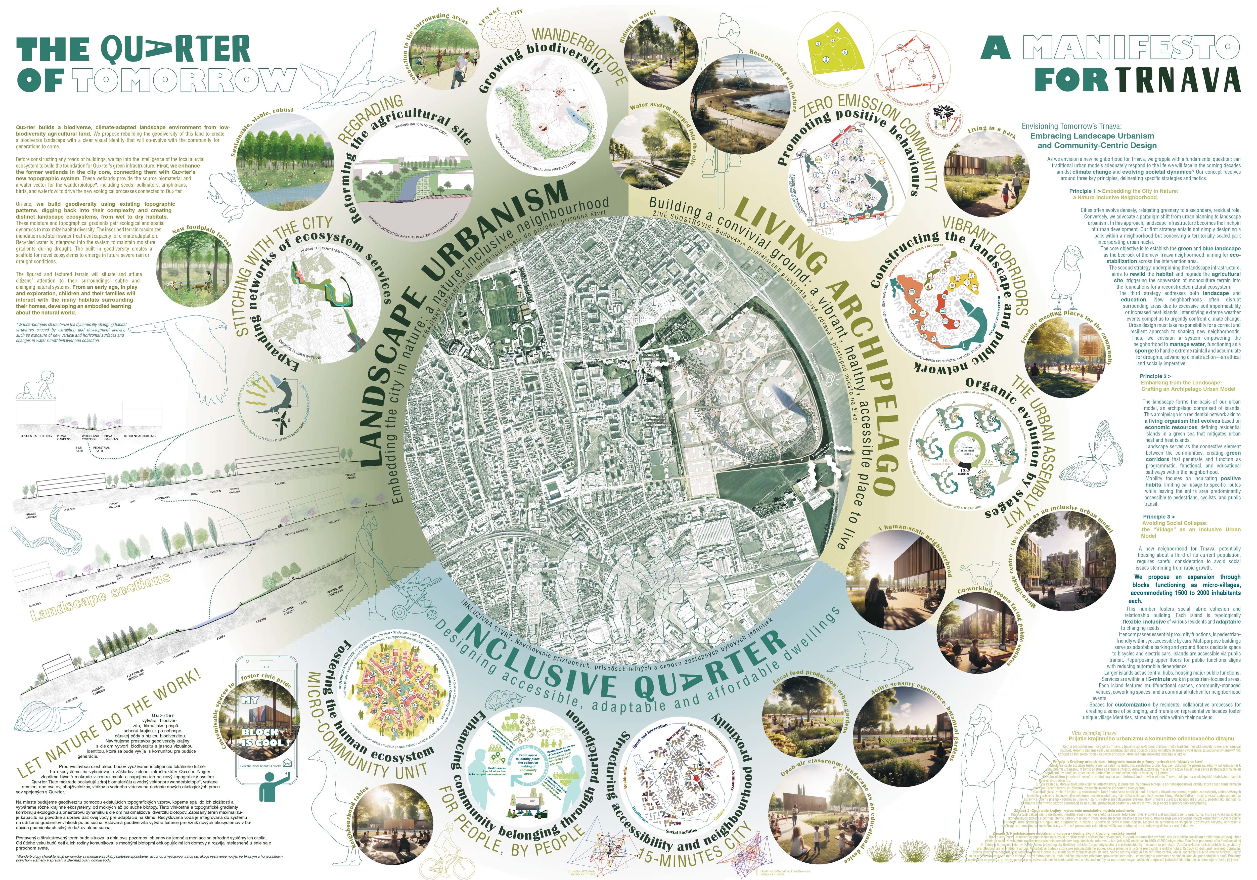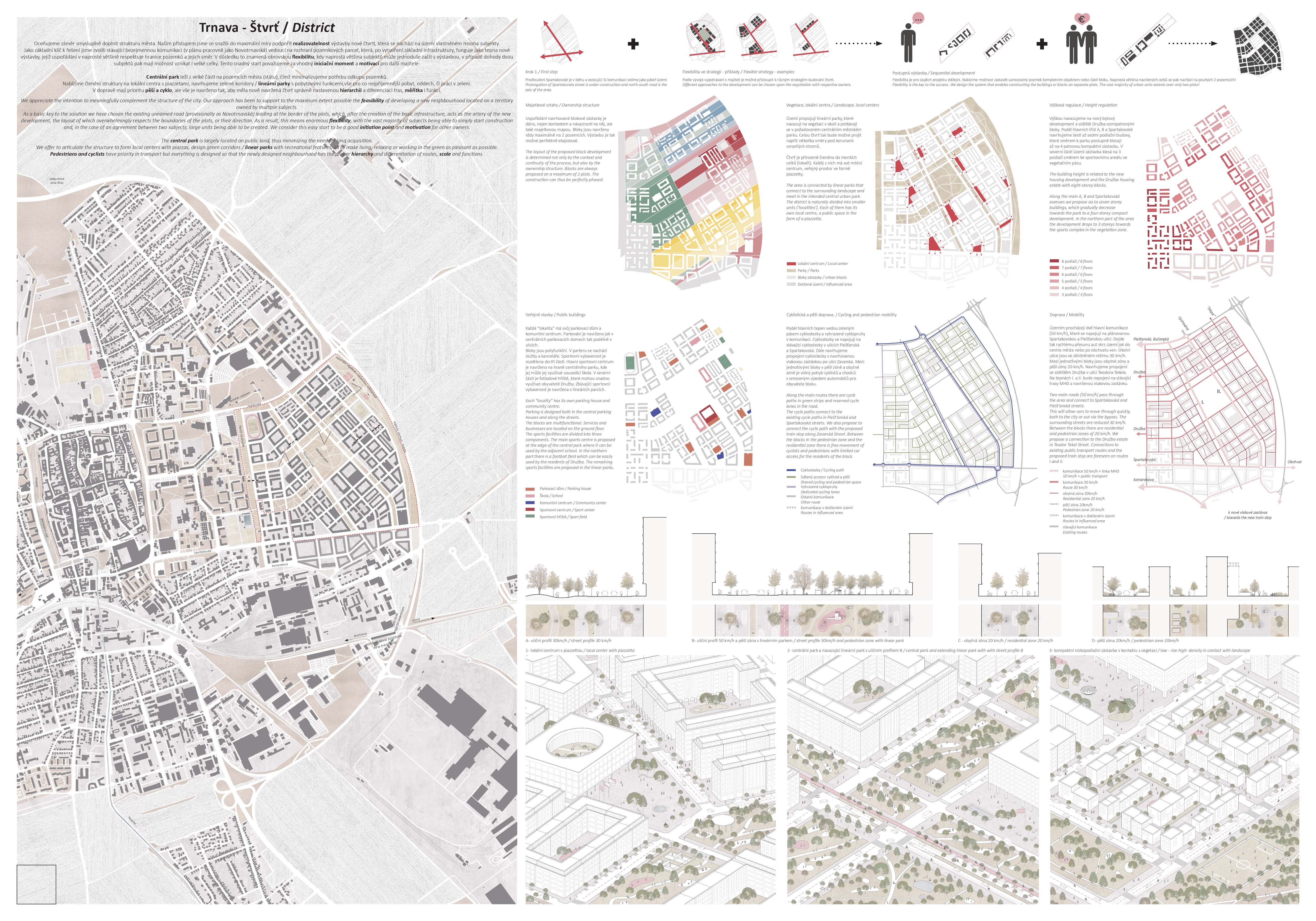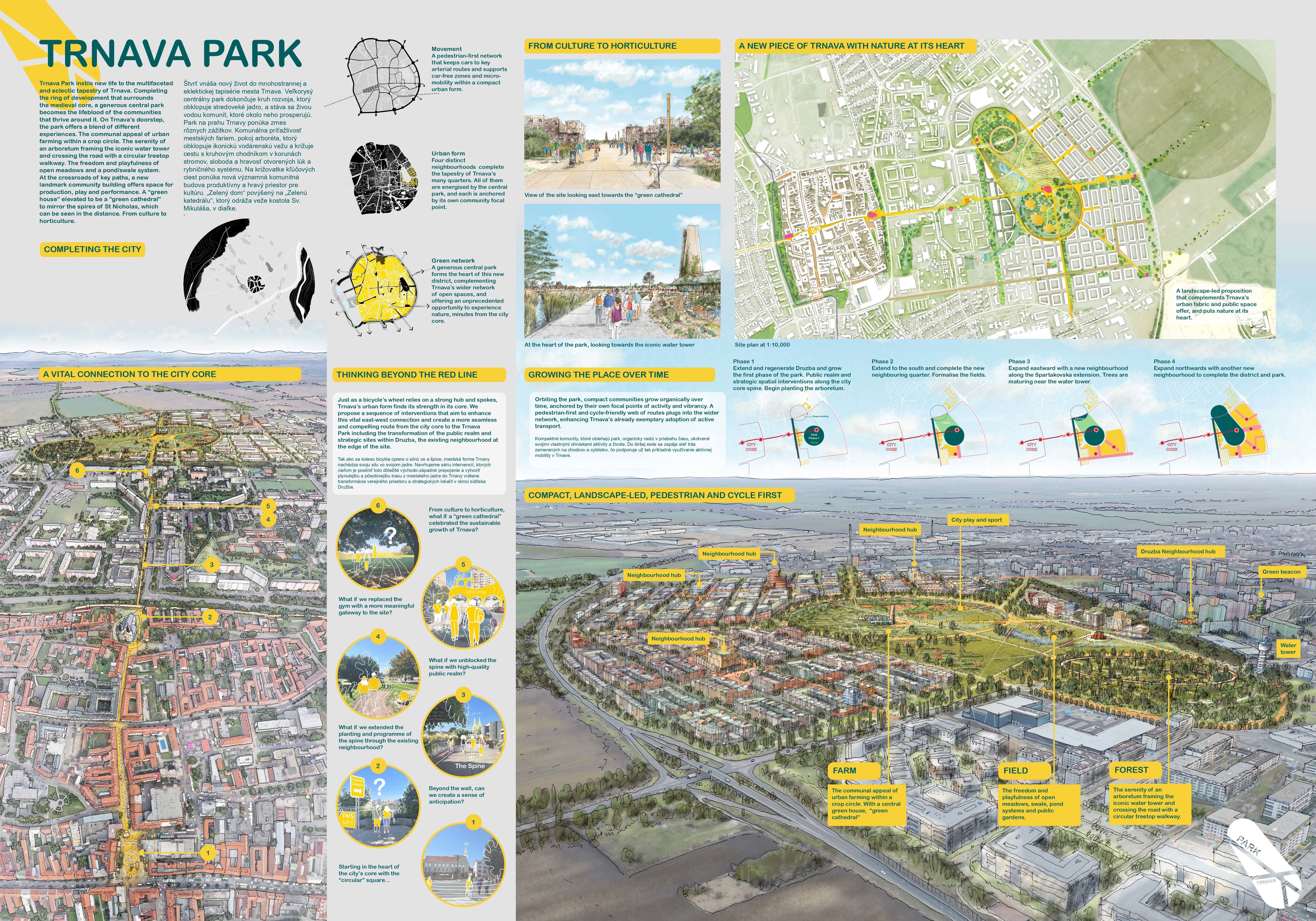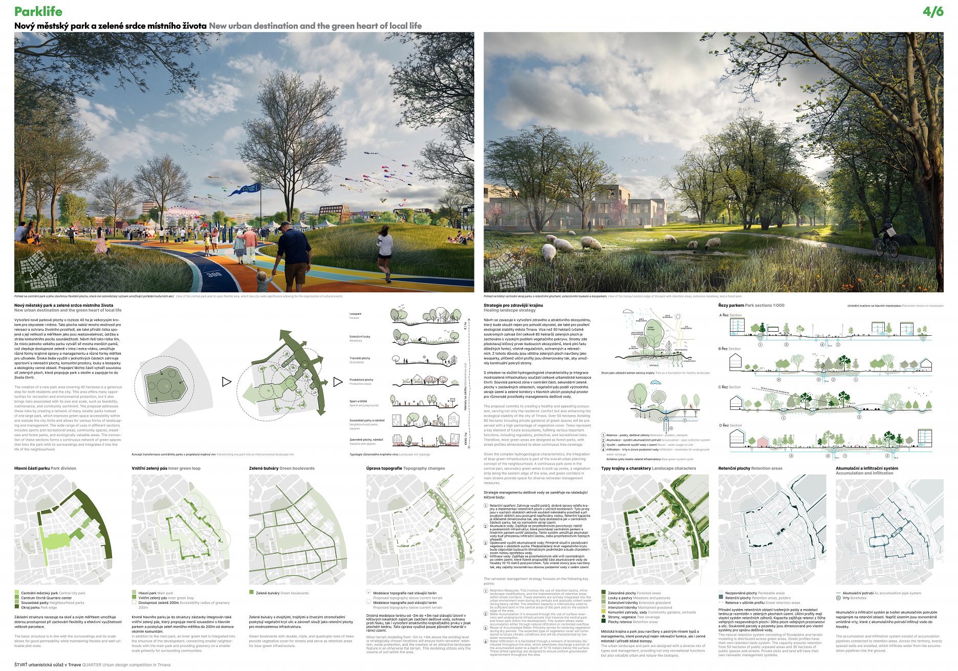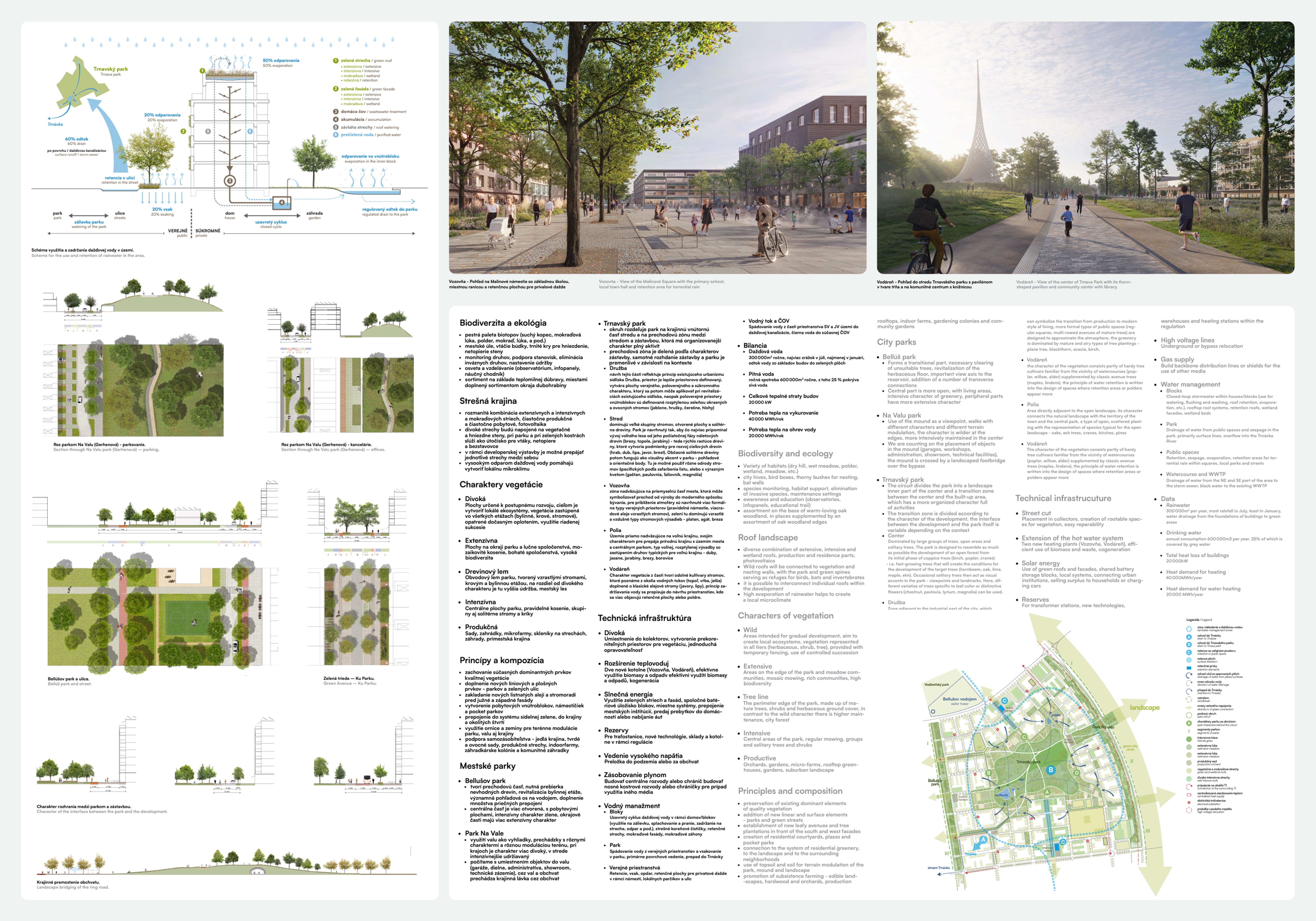Holistický projekt, ktorý zachytáva podstatu plánovania miest budúcnosti, kde krajina tvorí základ návrhu a kde sú aspekty ako odolnosť voči zmene klímy, reziliencia a ekológia od základu zakotvené v DNA návrhu. Výsledný rámec sa nepozerá iba do budúcnosti, ale je prekvapivo dobre ukotvený v mierke a charaktere mesta Trnava. Parklife dokáže šikovne pretaviť myšlienku centrálneho parku do robustnej siete zelených plôch, ktoré majú potrebnú mierku na to, aby mali ekologický dopad, ale nie sú predimenzované tak, aby tvorili bariéry. Táto nová modro-zelená infraštruktúra bude slúžiť nielen ako klimatická infraštruktúra, ale zároveň vdýchne charakter a identitu rôznym susedstvám. Rozmanitosť mierky a charakteru zabezpečí pocit komunity a príslušnosti v rôznych mierkach štvrte, od skupiny domov sústredených okolo zeleného neformálneho námestia, cez štvrť točiacu sa okolo zeleného prsta, až po priestory pre celú Trnavu.