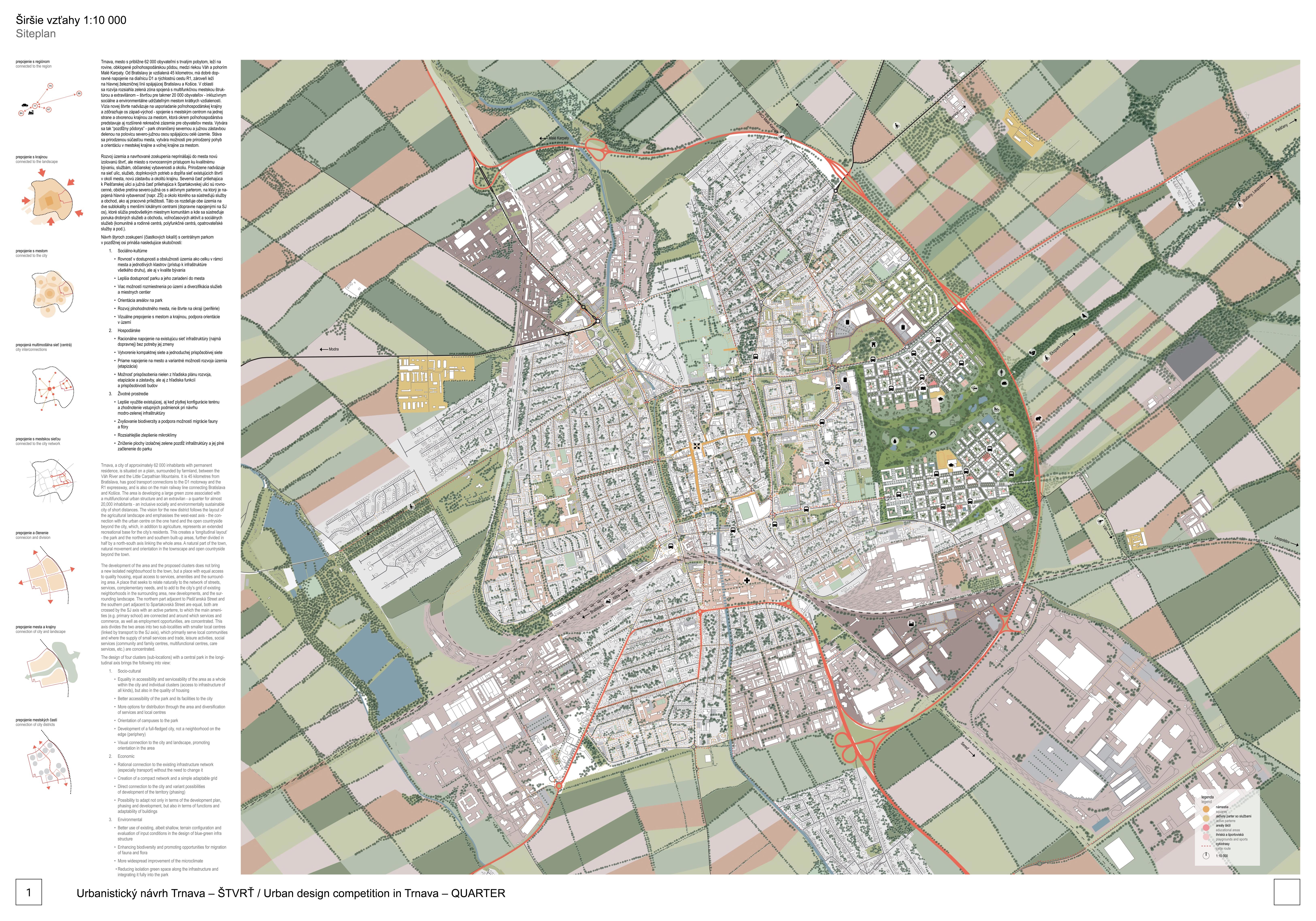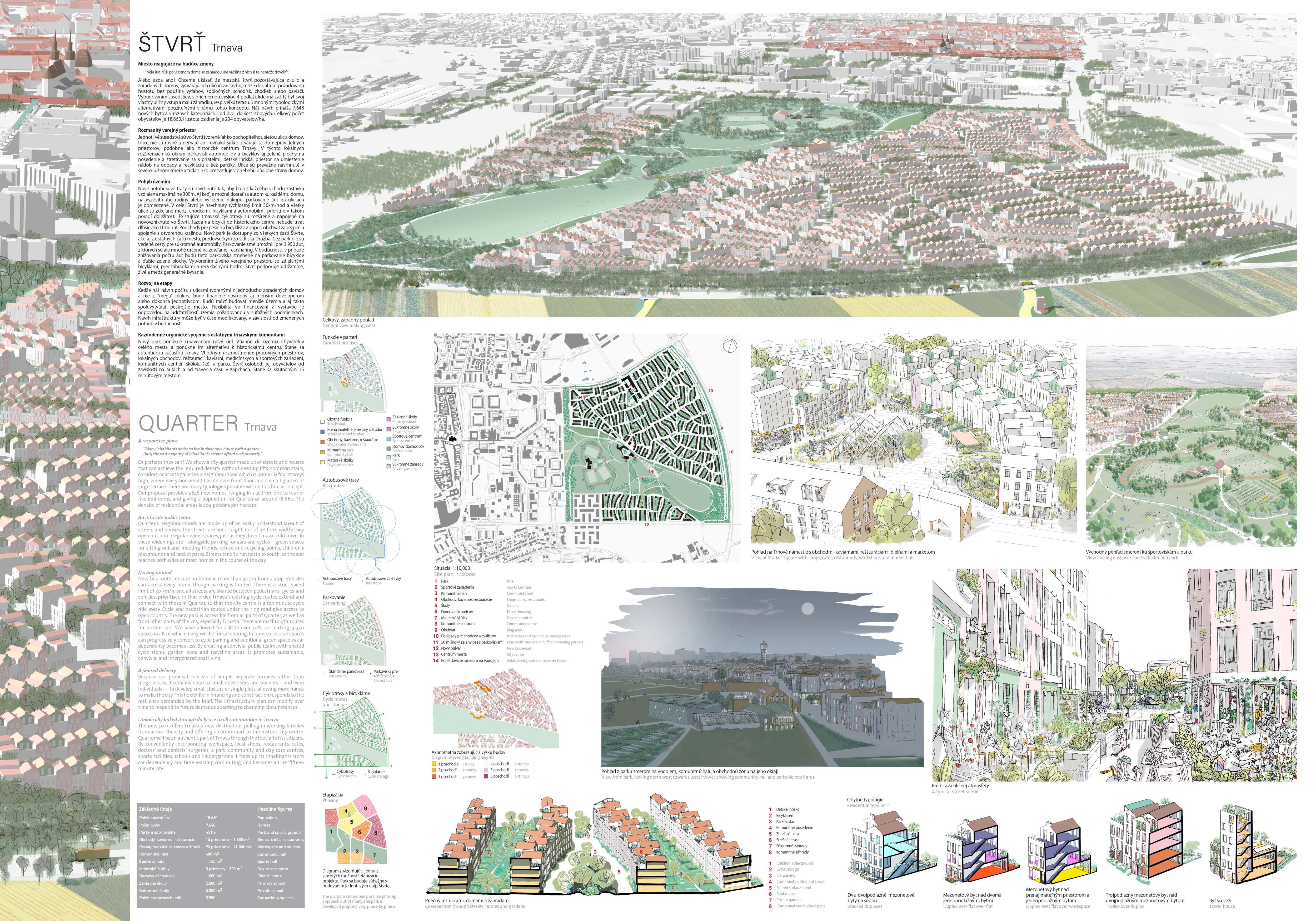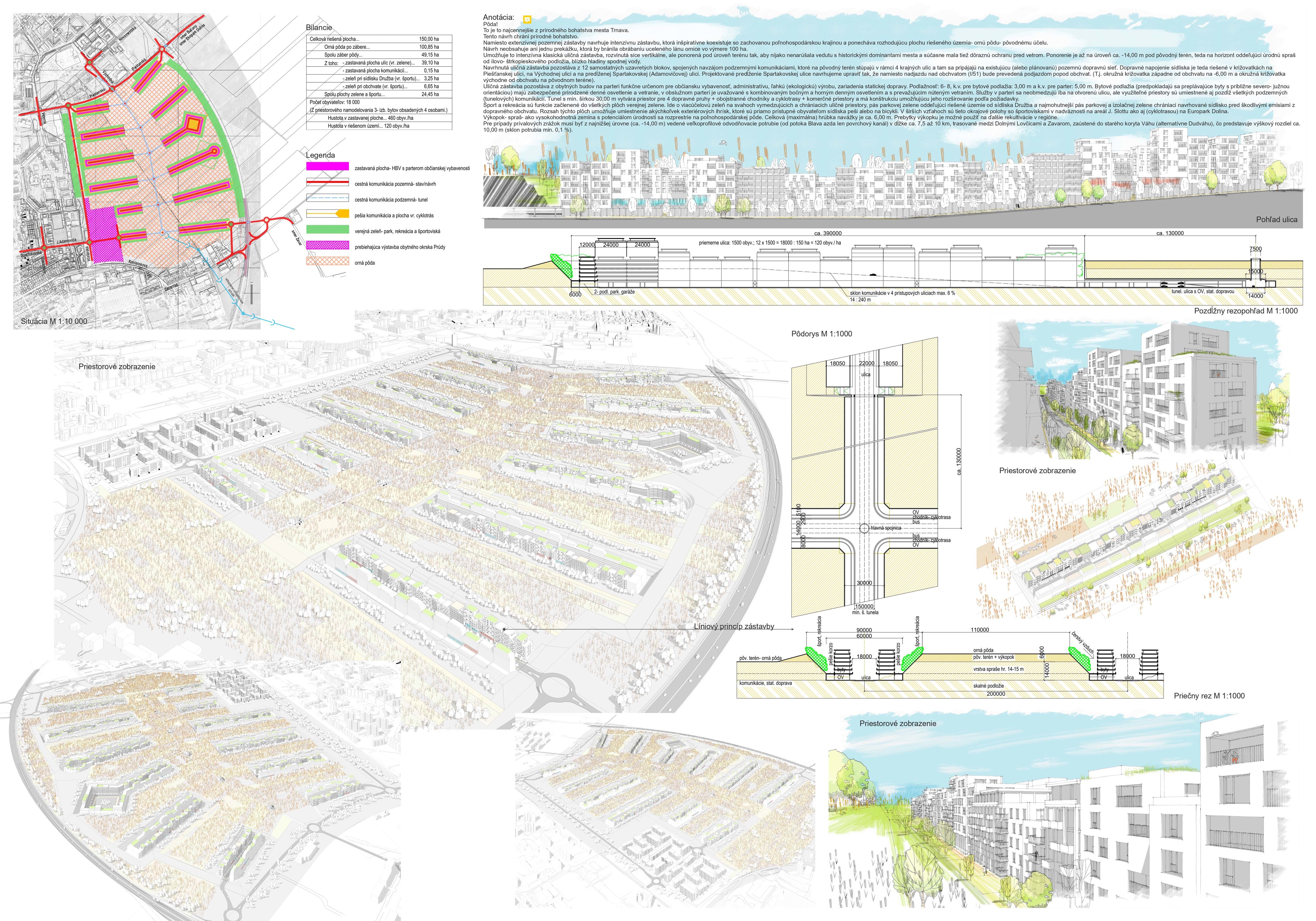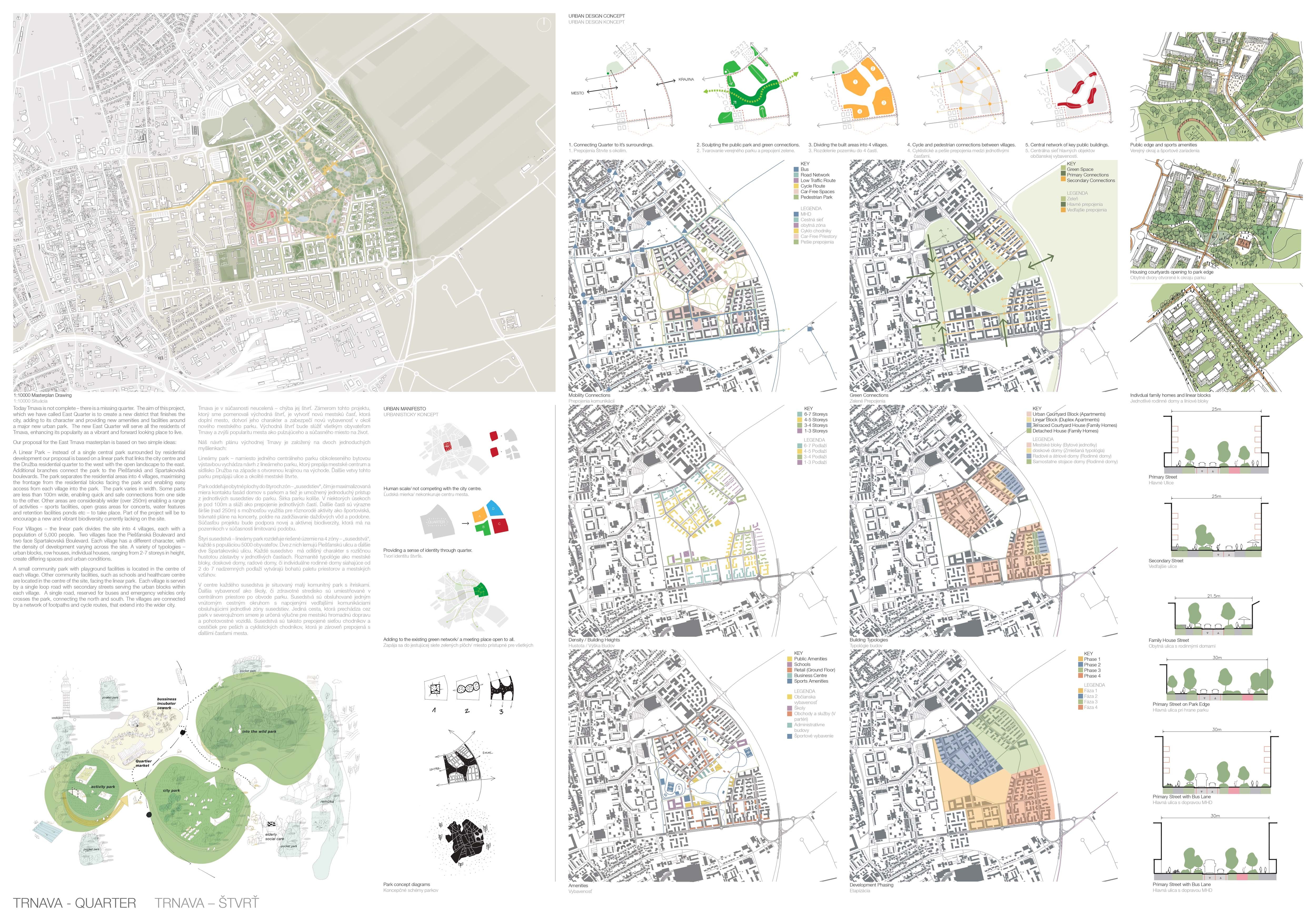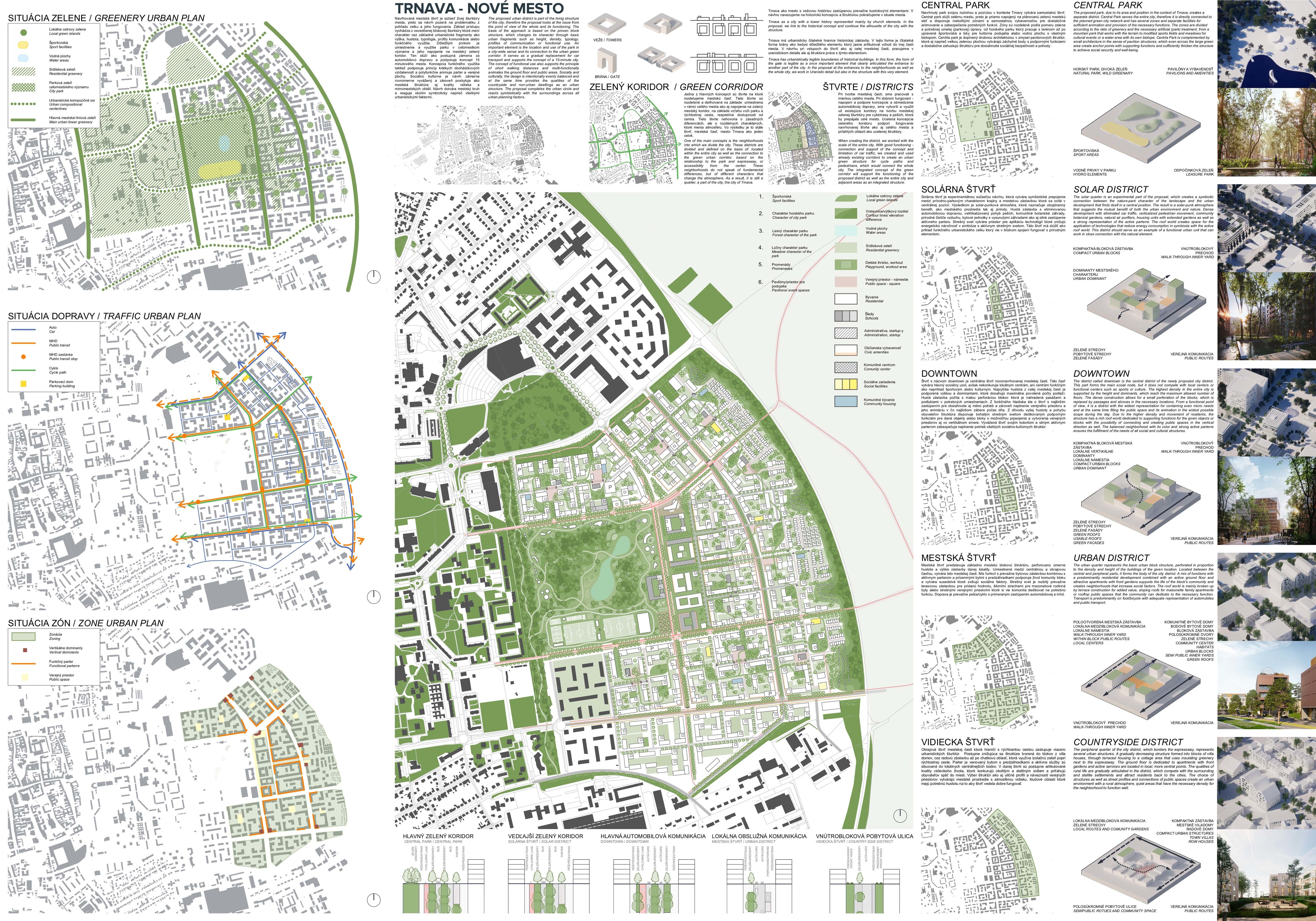 Holistický projekt, ktorý zachytáva podstatu plánovania miest budúcnosti, kde krajina tvorí základ návrhu a kde sú aspekty ako odolnosť voči zmene klímy, reziliencia a ekológia od základu zakotvené v DNA návrhu. Výsledný rámec sa nepozerá iba do budúcnosti, ale je prekvapivo dobre ukotvený v mierke a charaktere mesta Trnava. Parklife dokáže šikovne pretaviť myšlienku centrálneho parku do robustnej siete zelených plôch, ktoré majú potrebnú mierku na to, aby mali ekologický dopad, ale nie sú predimenzované tak, aby tvorili bariéry. Táto nová modro-zelená infraštruktúra bude slúžiť nielen ako klimatická infraštruktúra, ale zároveň vdýchne charakter a identitu rôznym susedstvám. Rozmanitosť mierky a charakteru zabezpečí pocit komunity a príslušnosti v rôznych mierkach štvrte, od skupiny domov sústredených okolo zeleného neformálneho námestia, cez štvrť točiacu sa okolo zeleného prsta, až po priestory pre celú Trnavu.