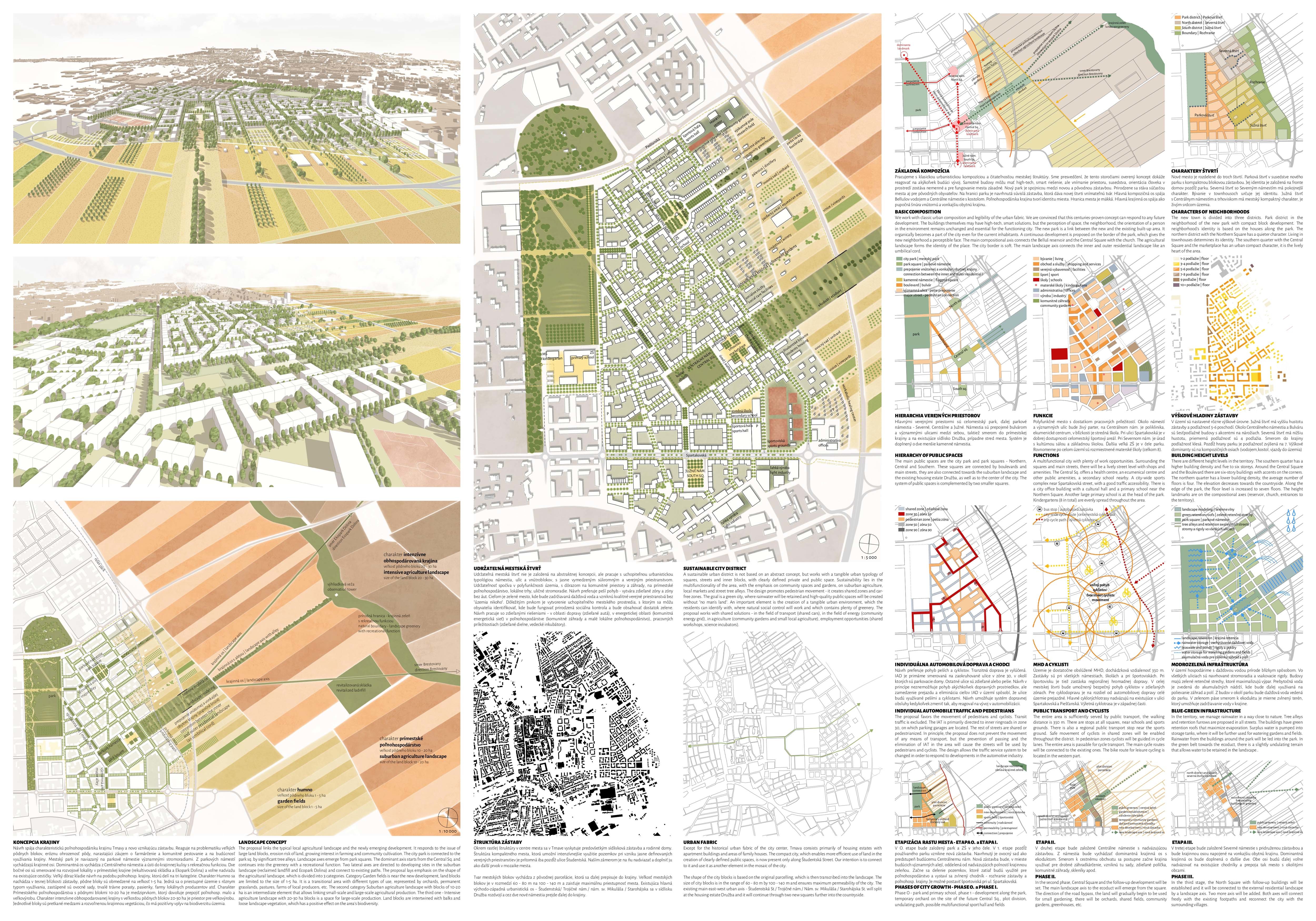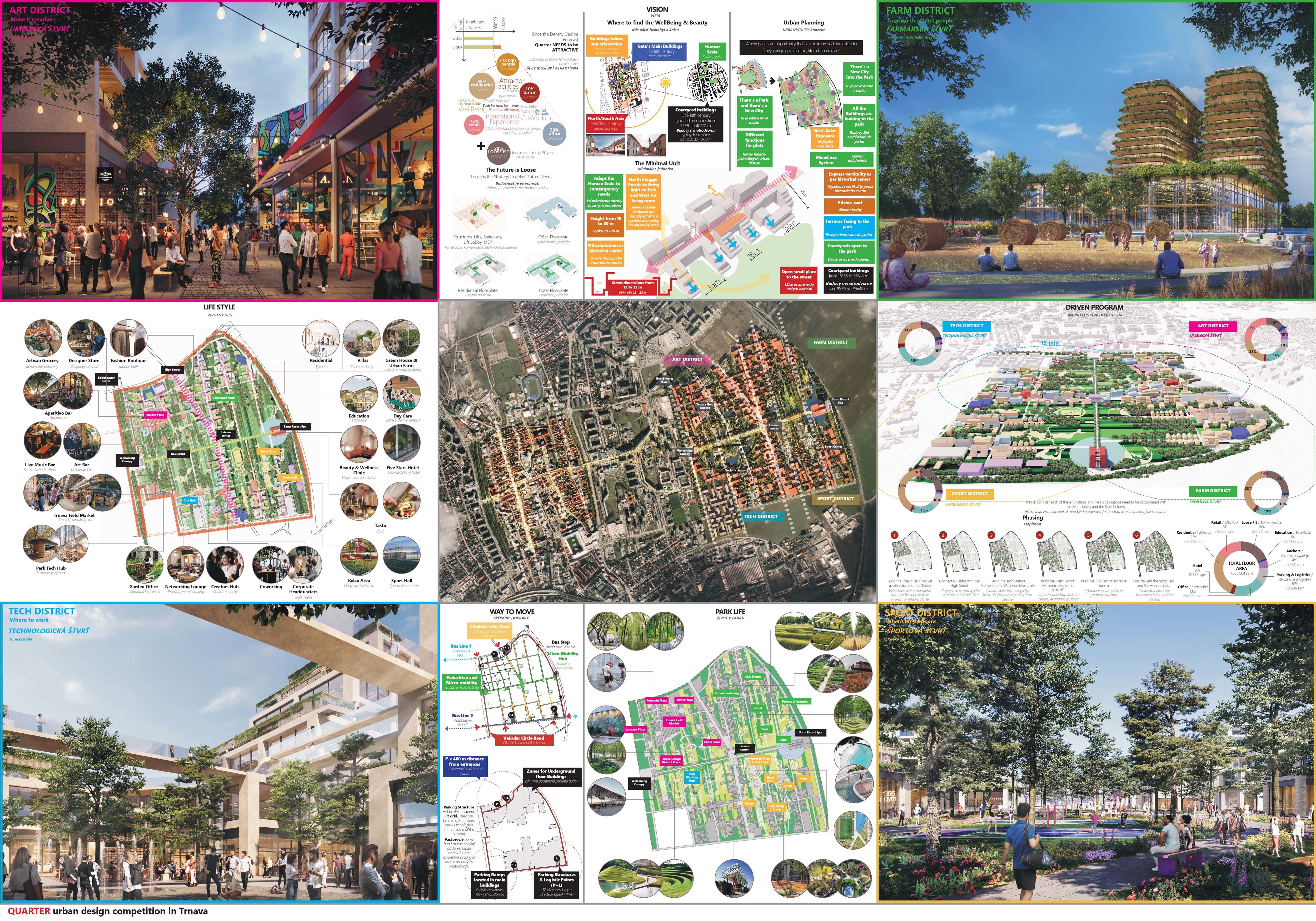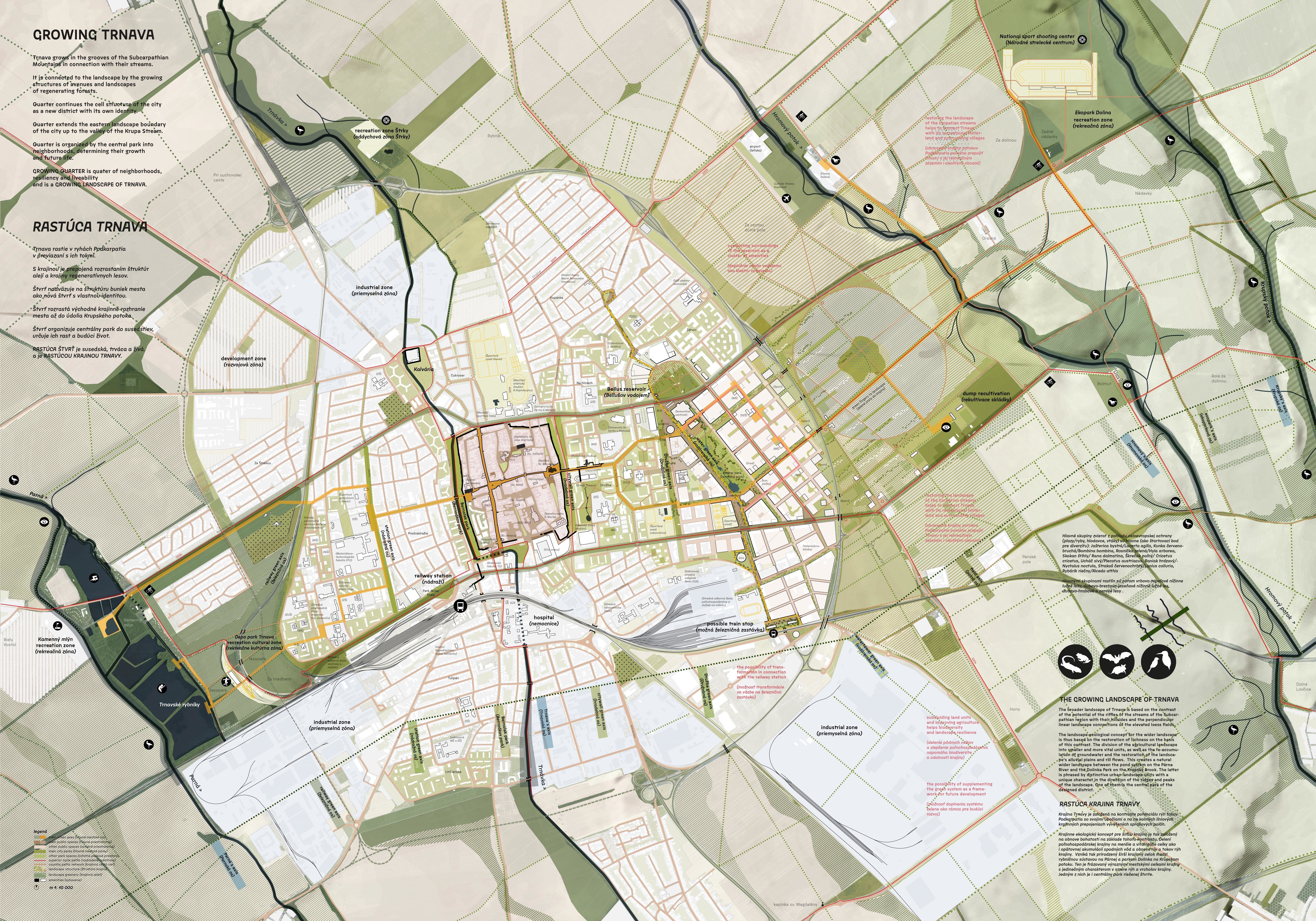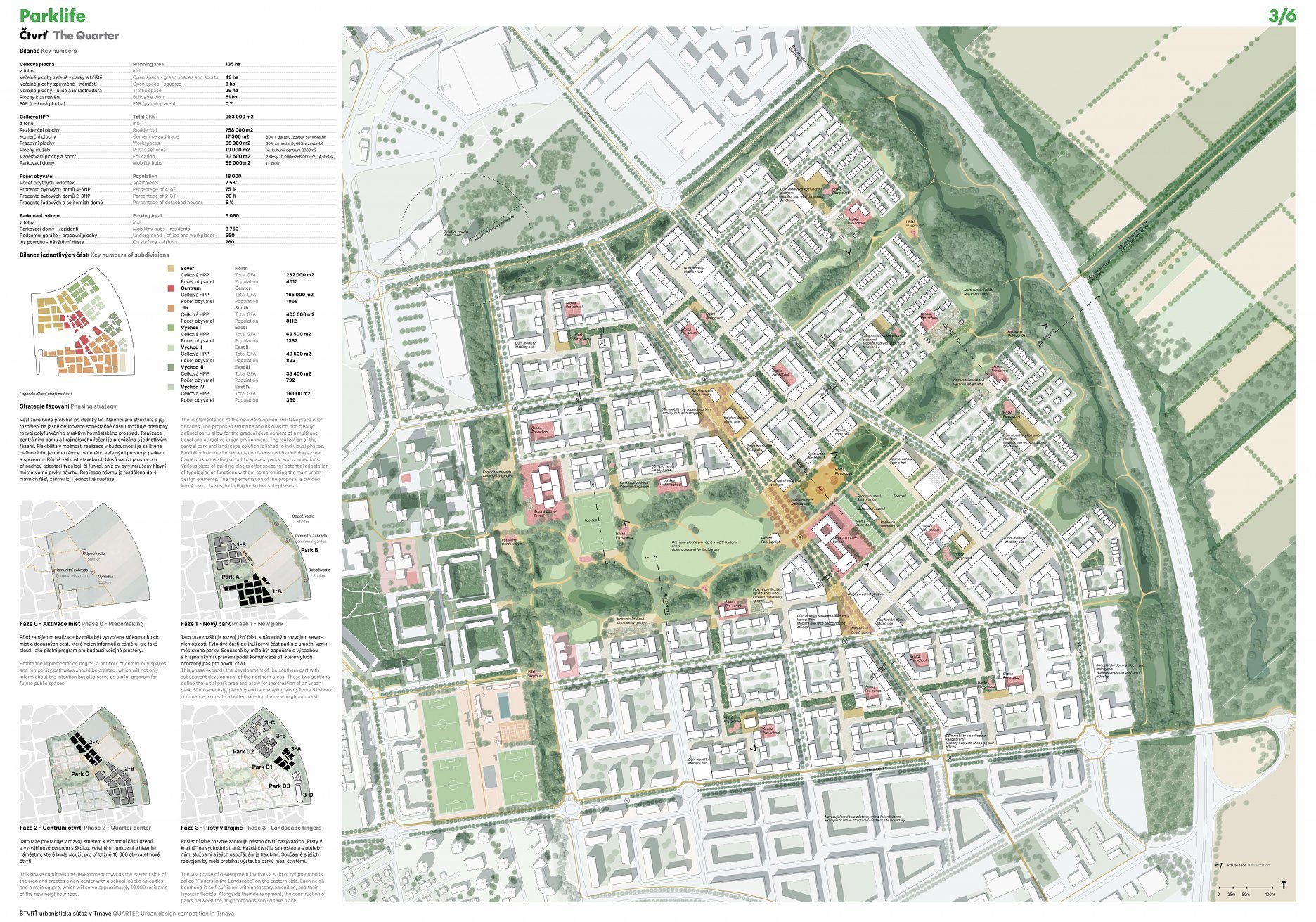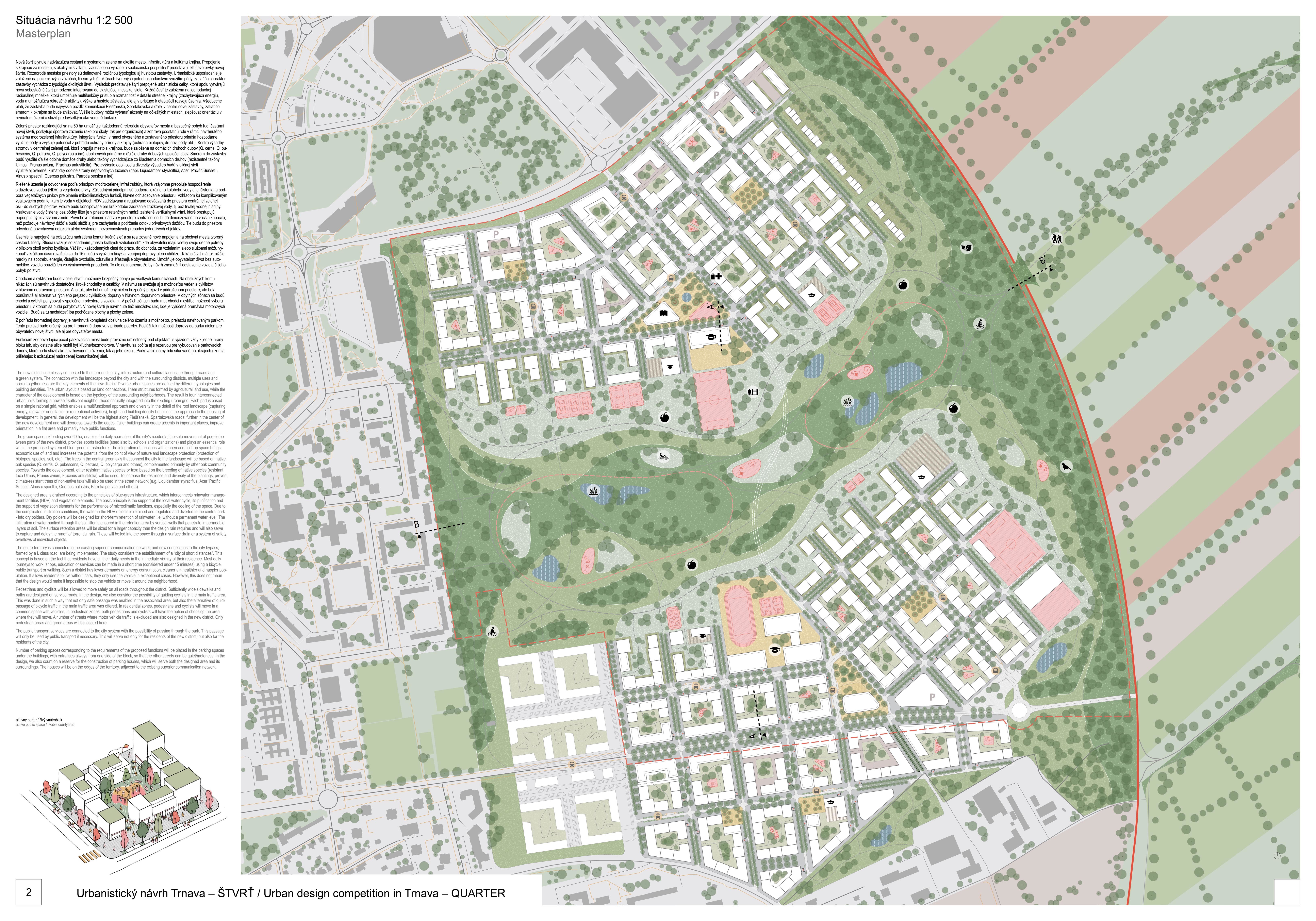 Holistický projekt, ktorý zachytáva podstatu plánovania miest budúcnosti, kde krajina tvorí základ návrhu a kde sú aspekty ako odolnosť voči zmene klímy, reziliencia a ekológia od základu zakotvené v DNA návrhu. Výsledný rámec sa nepozerá iba do budúcnosti, ale je prekvapivo dobre ukotvený v mierke a charaktere mesta Trnava. Parklife dokáže šikovne pretaviť myšlienku centrálneho parku do robustnej siete zelených plôch, ktoré majú potrebnú mierku na to, aby mali ekologický dopad, ale nie sú predimenzované tak, aby tvorili bariéry. Táto nová modro-zelená infraštruktúra bude slúžiť nielen ako klimatická infraštruktúra, ale zároveň vdýchne charakter a identitu rôznym susedstvám. Rozmanitosť mierky a charakteru zabezpečí pocit komunity a príslušnosti v rôznych mierkach štvrte, od skupiny domov sústredených okolo zeleného neformálneho námestia, cez štvrť točiacu sa okolo zeleného prsta, až po priestory pre celú Trnavu.