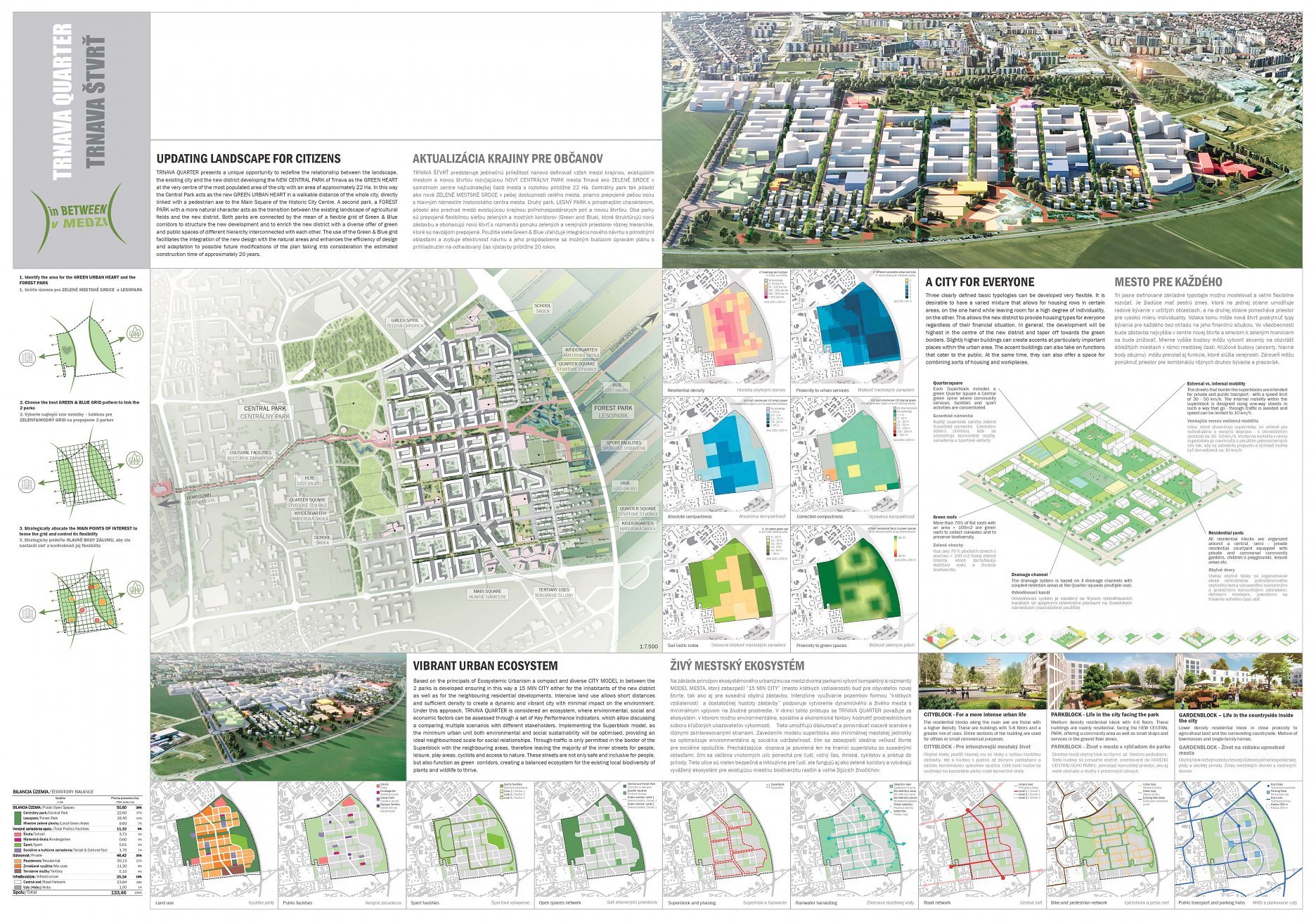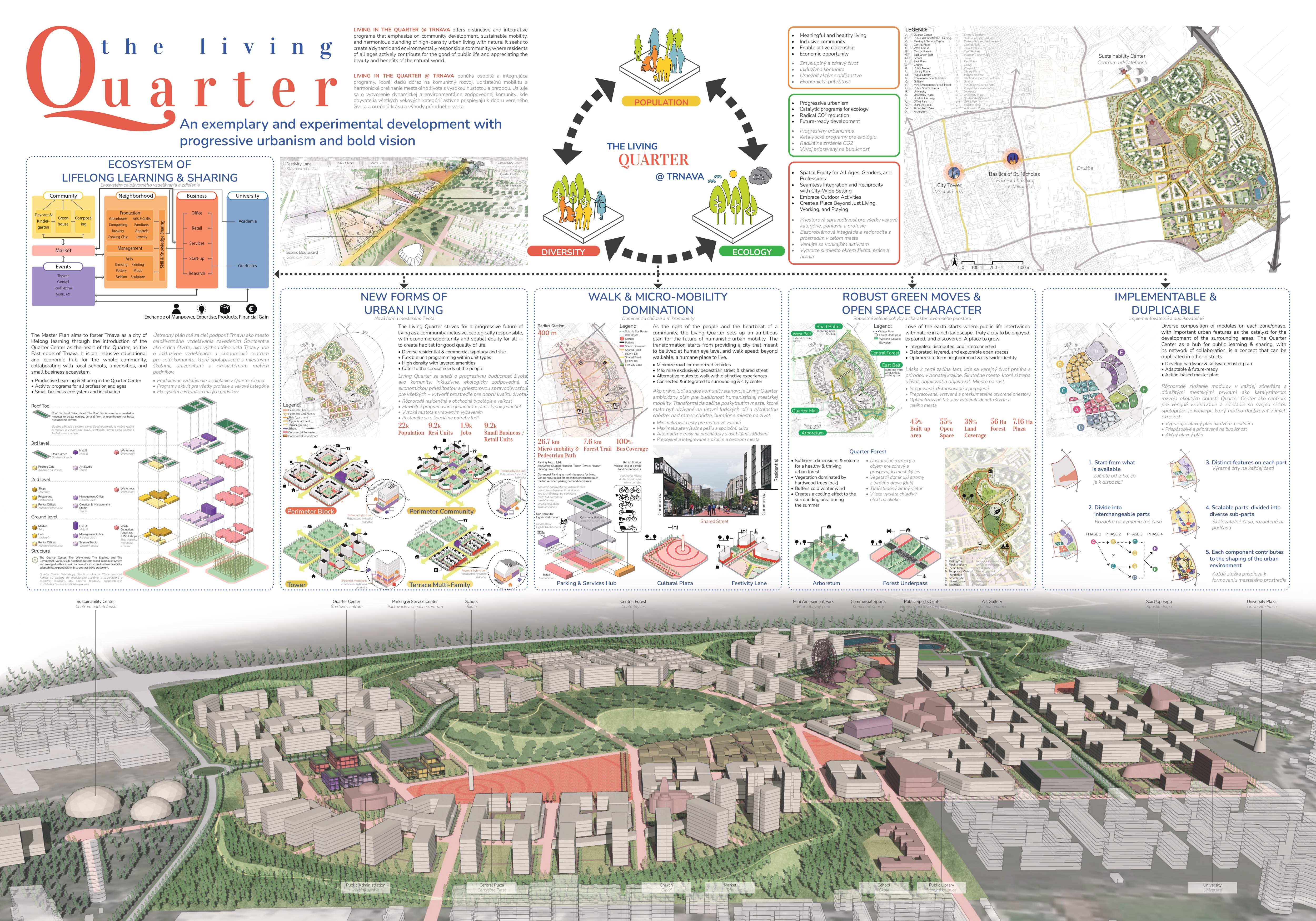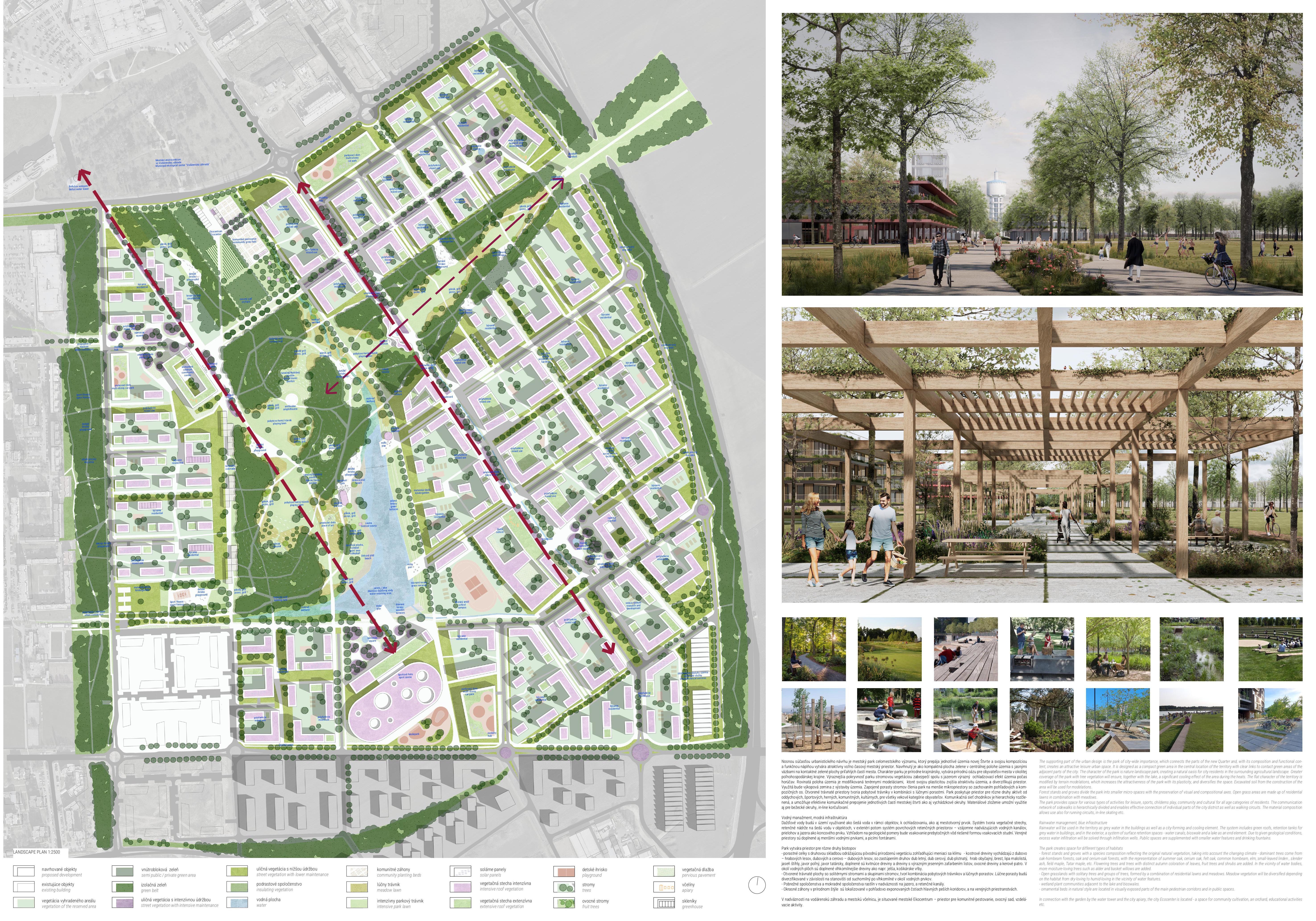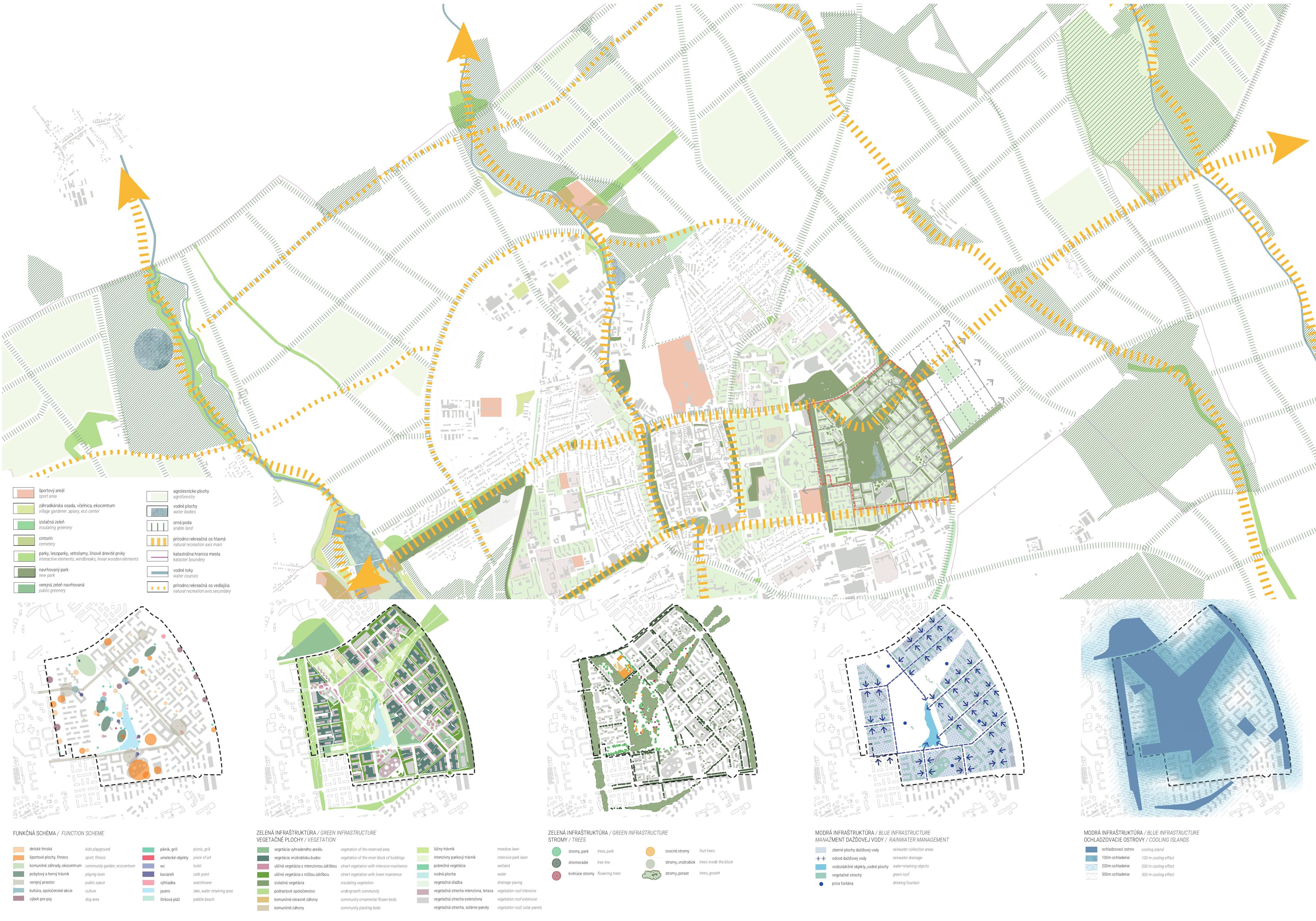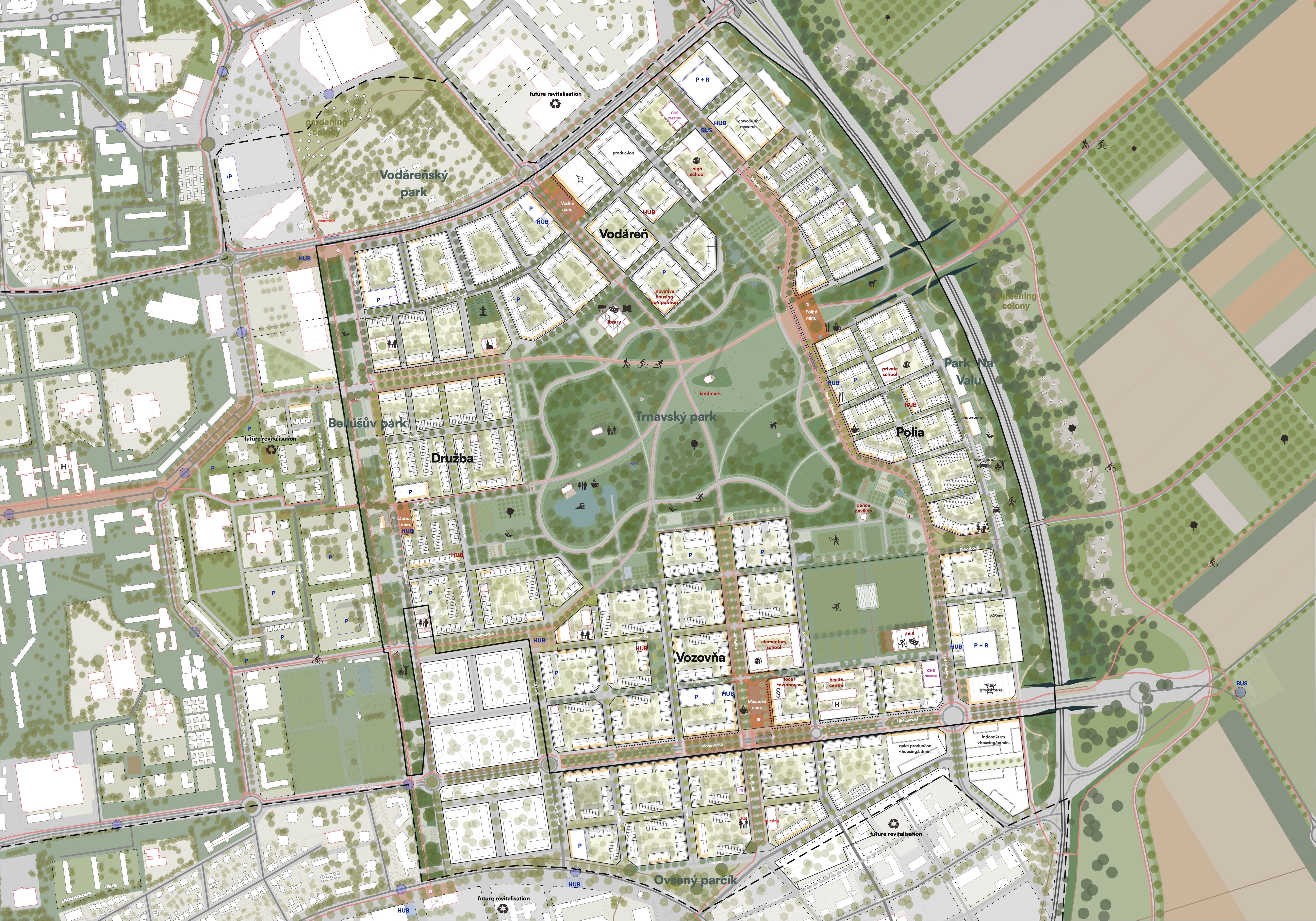 Holistický projekt, ktorý zachytáva podstatu plánovania miest budúcnosti, kde krajina tvorí základ návrhu a kde sú aspekty ako odolnosť voči zmene klímy, reziliencia a ekológia od základu zakotvené v DNA návrhu. Výsledný rámec sa nepozerá iba do budúcnosti, ale je prekvapivo dobre ukotvený v mierke a charaktere mesta Trnava. Parklife dokáže šikovne pretaviť myšlienku centrálneho parku do robustnej siete zelených plôch, ktoré majú potrebnú mierku na to, aby mali ekologický dopad, ale nie sú predimenzované tak, aby tvorili bariéry. Táto nová modro-zelená infraštruktúra bude slúžiť nielen ako klimatická infraštruktúra, ale zároveň vdýchne charakter a identitu rôznym susedstvám. Rozmanitosť mierky a charakteru zabezpečí pocit komunity a príslušnosti v rôznych mierkach štvrte, od skupiny domov sústredených okolo zeleného neformálneho námestia, cez štvrť točiacu sa okolo zeleného prsta, až po priestory pre celú Trnavu.