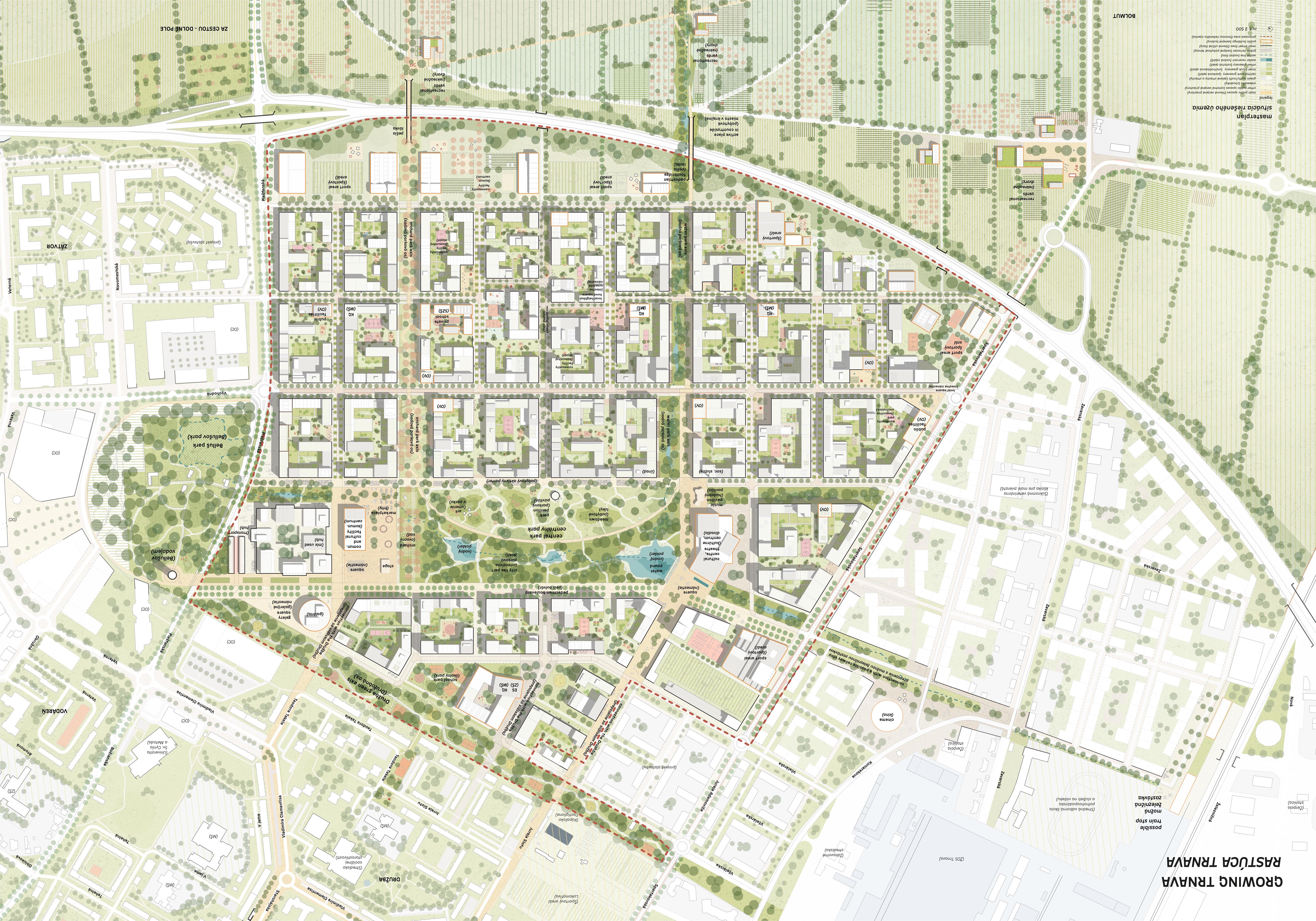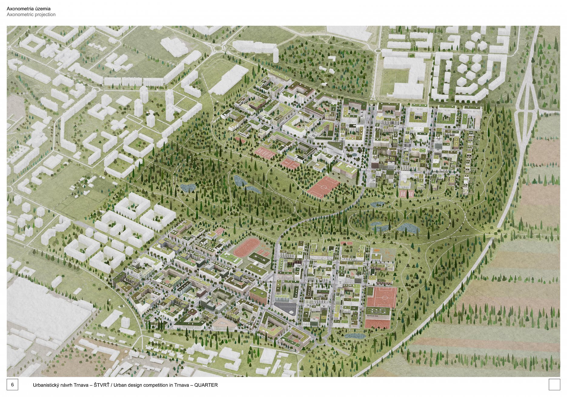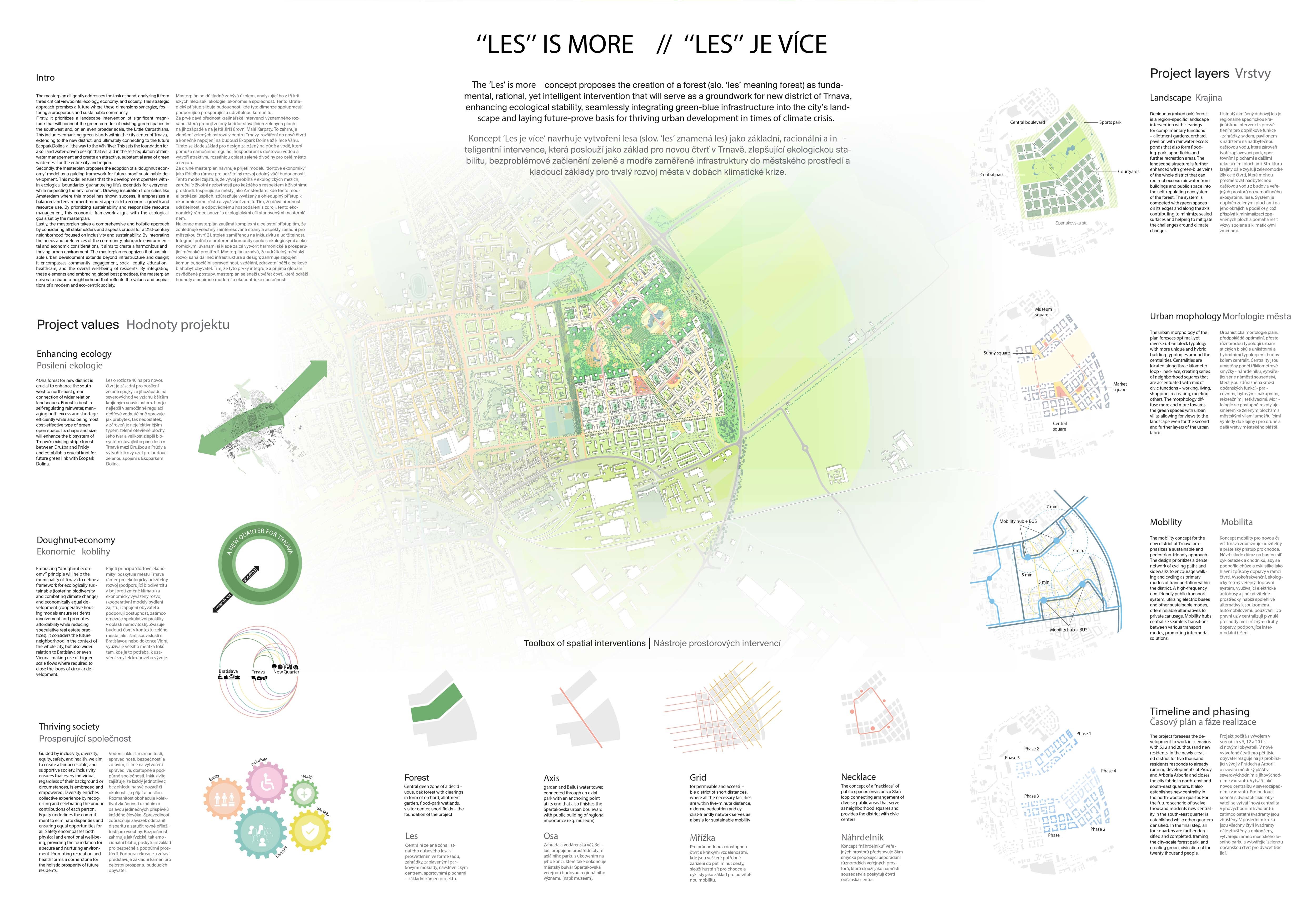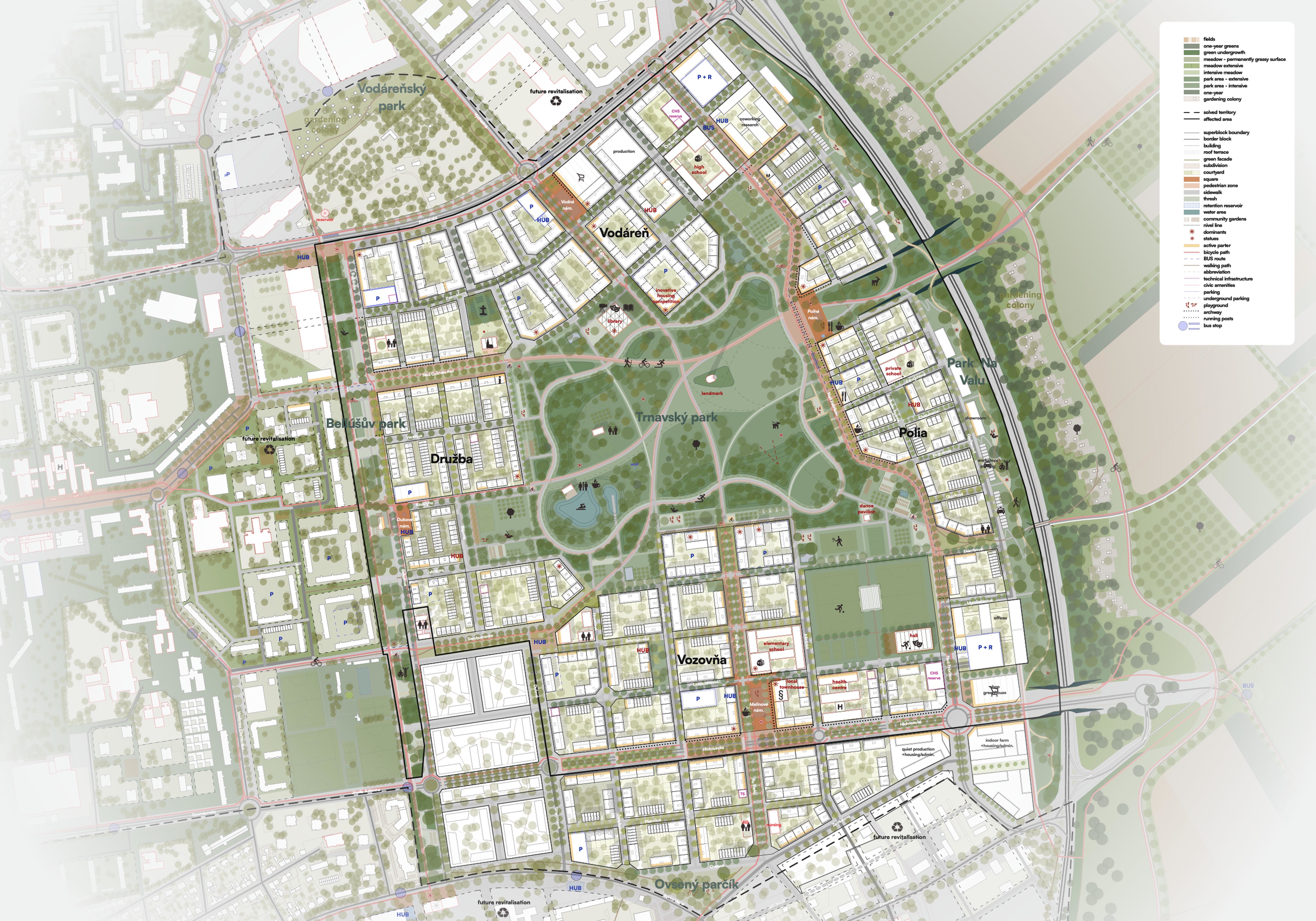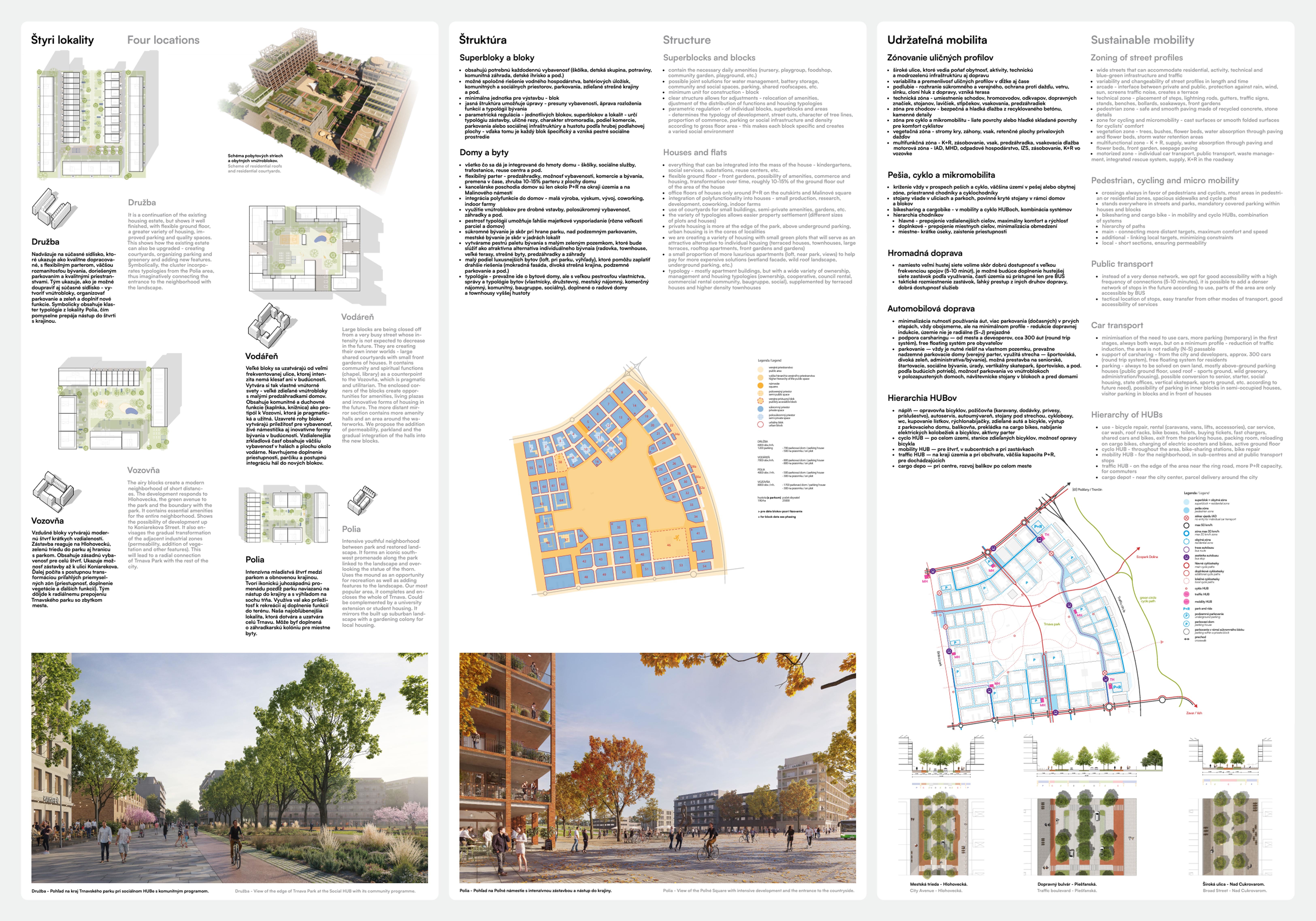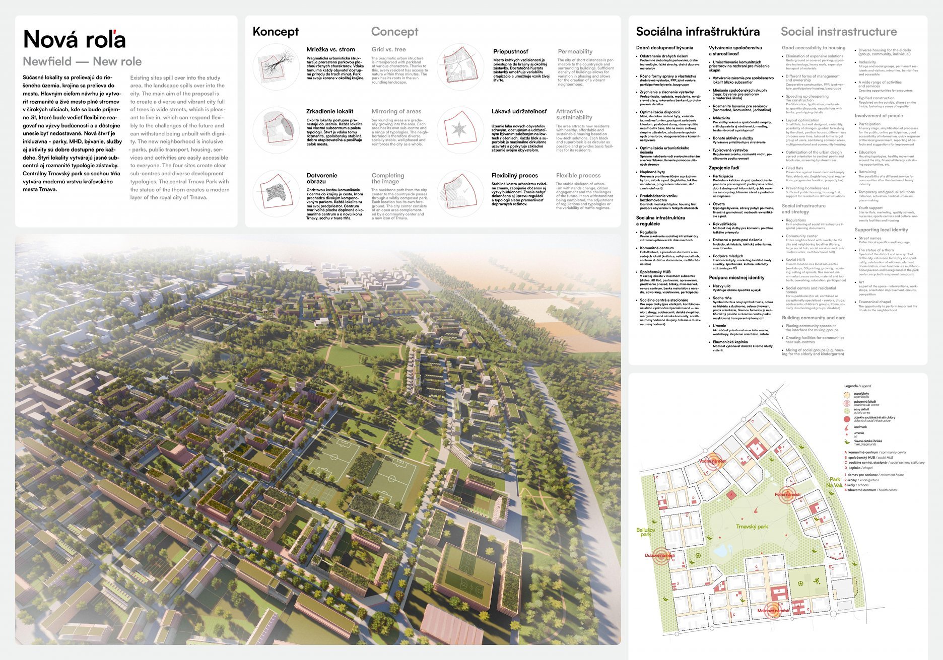 Holistický projekt, ktorý zachytáva podstatu plánovania miest budúcnosti, kde krajina tvorí základ návrhu a kde sú aspekty ako odolnosť voči zmene klímy, reziliencia a ekológia od základu zakotvené v DNA návrhu. Výsledný rámec sa nepozerá iba do budúcnosti, ale je prekvapivo dobre ukotvený v mierke a charaktere mesta Trnava. Parklife dokáže šikovne pretaviť myšlienku centrálneho parku do robustnej siete zelených plôch, ktoré majú potrebnú mierku na to, aby mali ekologický dopad, ale nie sú predimenzované tak, aby tvorili bariéry. Táto nová modro-zelená infraštruktúra bude slúžiť nielen ako klimatická infraštruktúra, ale zároveň vdýchne charakter a identitu rôznym susedstvám. Rozmanitosť mierky a charakteru zabezpečí pocit komunity a príslušnosti v rôznych mierkach štvrte, od skupiny domov sústredených okolo zeleného neformálneho námestia, cez štvrť točiacu sa okolo zeleného prsta, až po priestory pre celú Trnavu.
