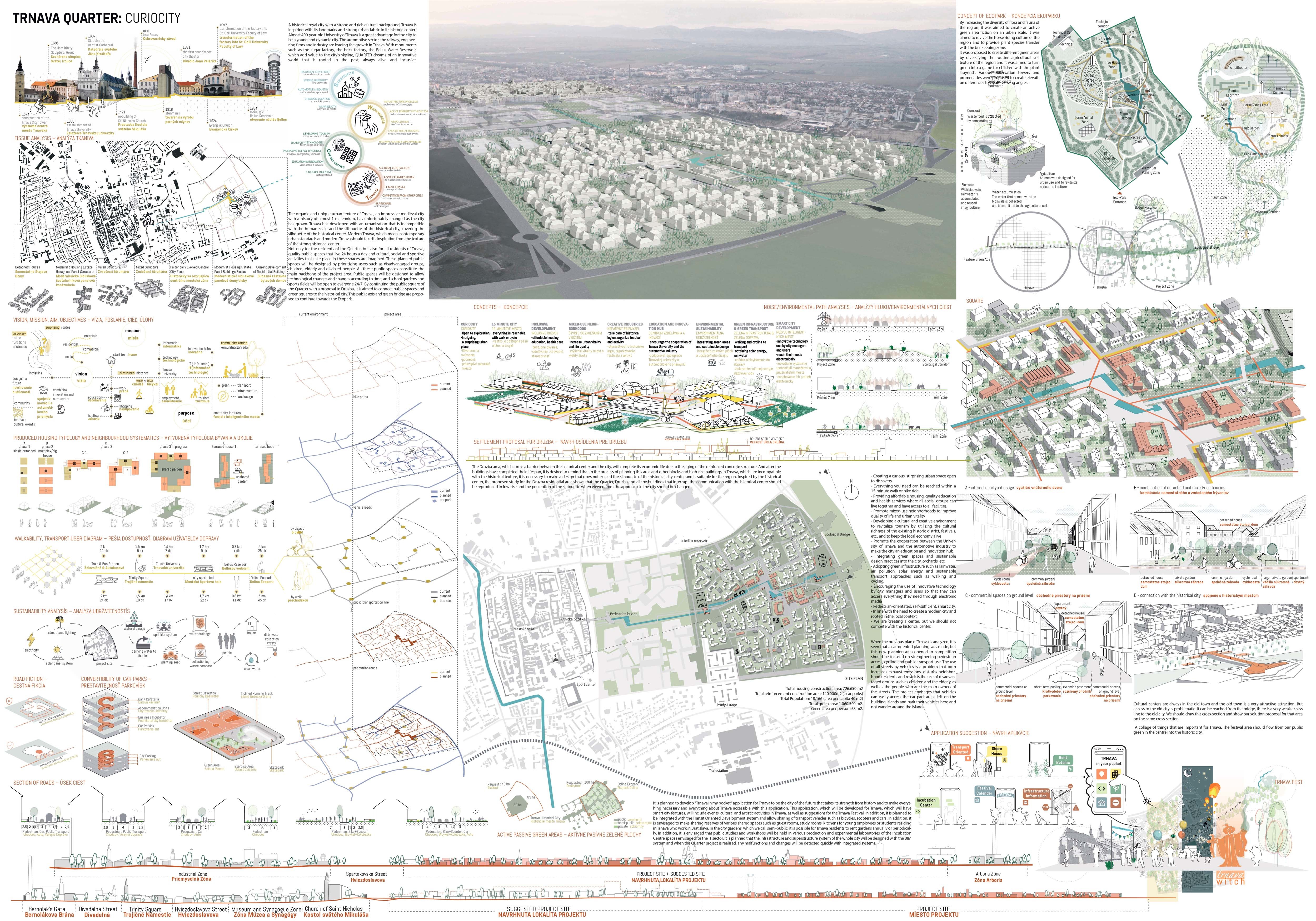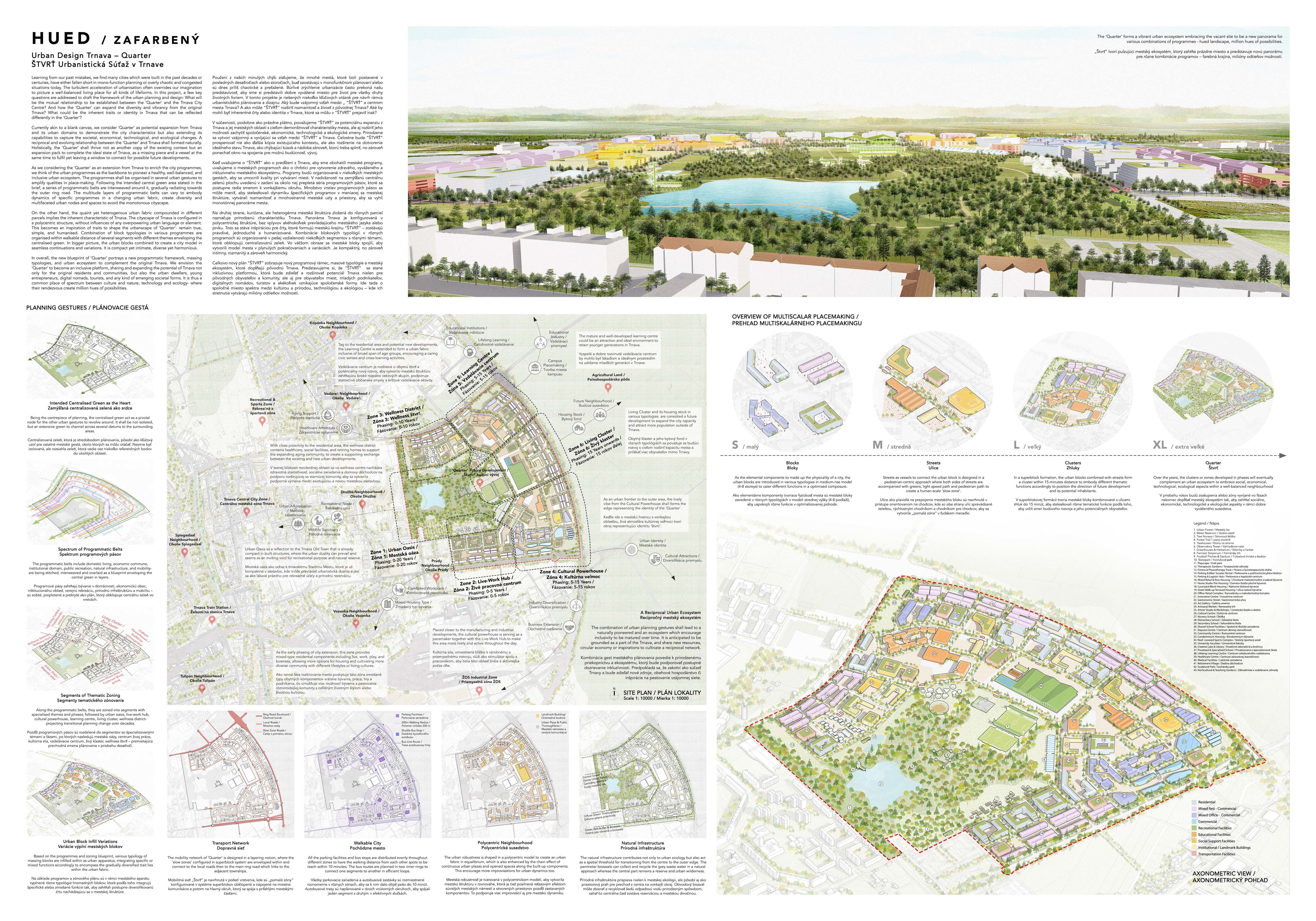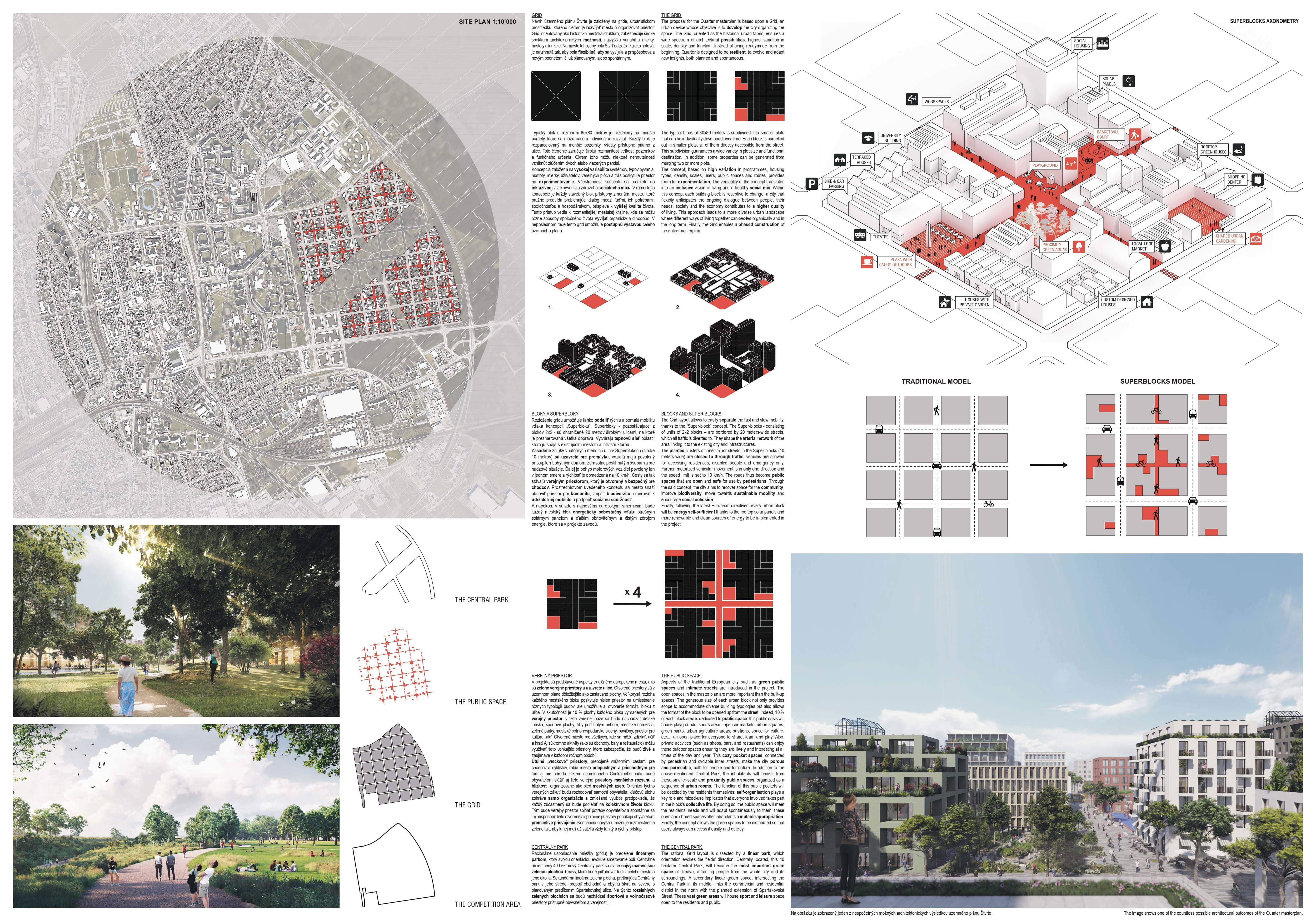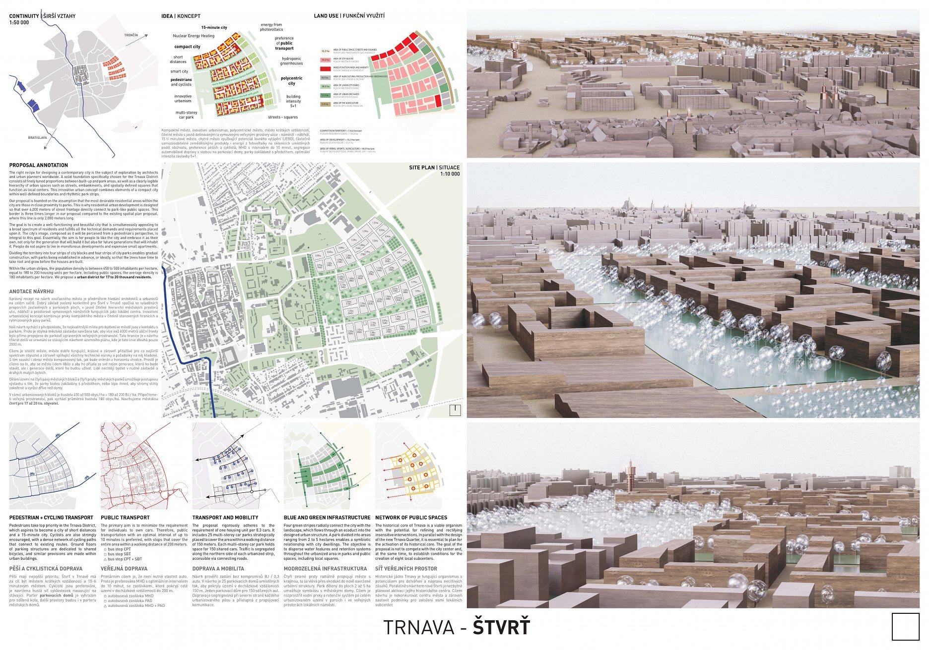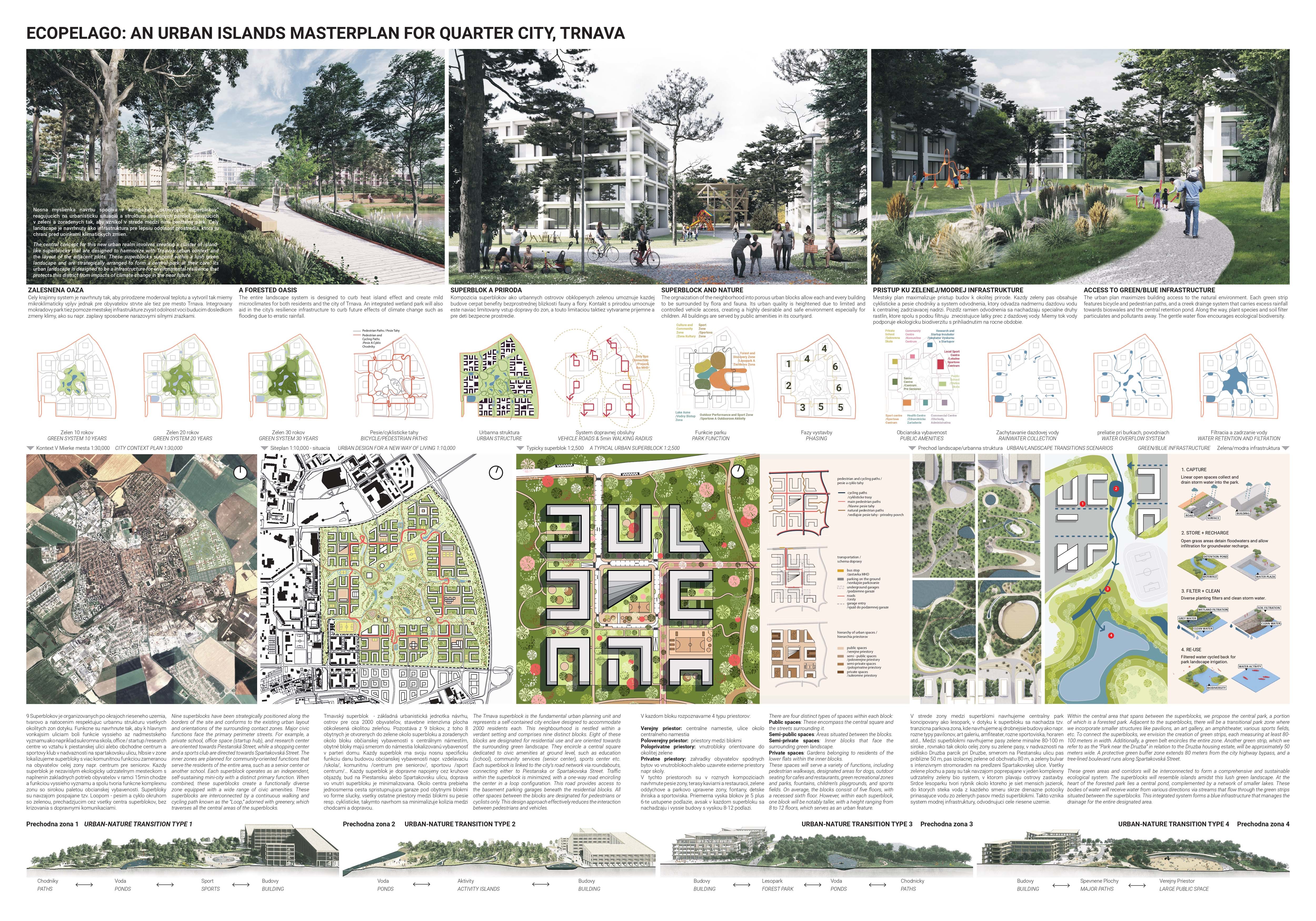 Holistický projekt, ktorý zachytáva podstatu plánovania miest budúcnosti, kde krajina tvorí základ návrhu a kde sú aspekty ako odolnosť voči zmene klímy, reziliencia a ekológia od základu zakotvené v DNA návrhu. Výsledný rámec sa nepozerá iba do budúcnosti, ale je prekvapivo dobre ukotvený v mierke a charaktere mesta Trnava. Parklife dokáže šikovne pretaviť myšlienku centrálneho parku do robustnej siete zelených plôch, ktoré majú potrebnú mierku na to, aby mali ekologický dopad, ale nie sú predimenzované tak, aby tvorili bariéry. Táto nová modro-zelená infraštruktúra bude slúžiť nielen ako klimatická infraštruktúra, ale zároveň vdýchne charakter a identitu rôznym susedstvám. Rozmanitosť mierky a charakteru zabezpečí pocit komunity a príslušnosti v rôznych mierkach štvrte, od skupiny domov sústredených okolo zeleného neformálneho námestia, cez štvrť točiacu sa okolo zeleného prsta, až po priestory pre celú Trnavu.