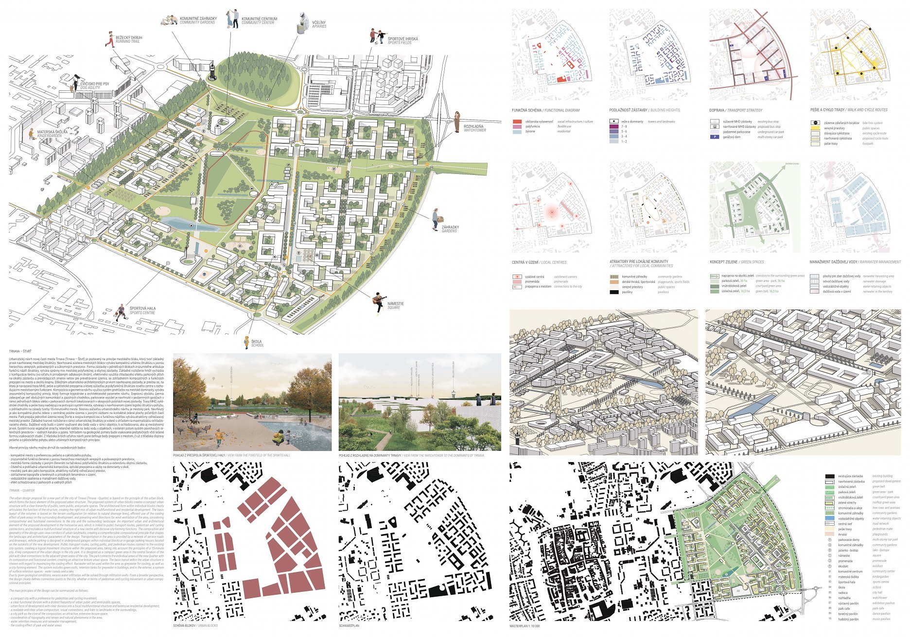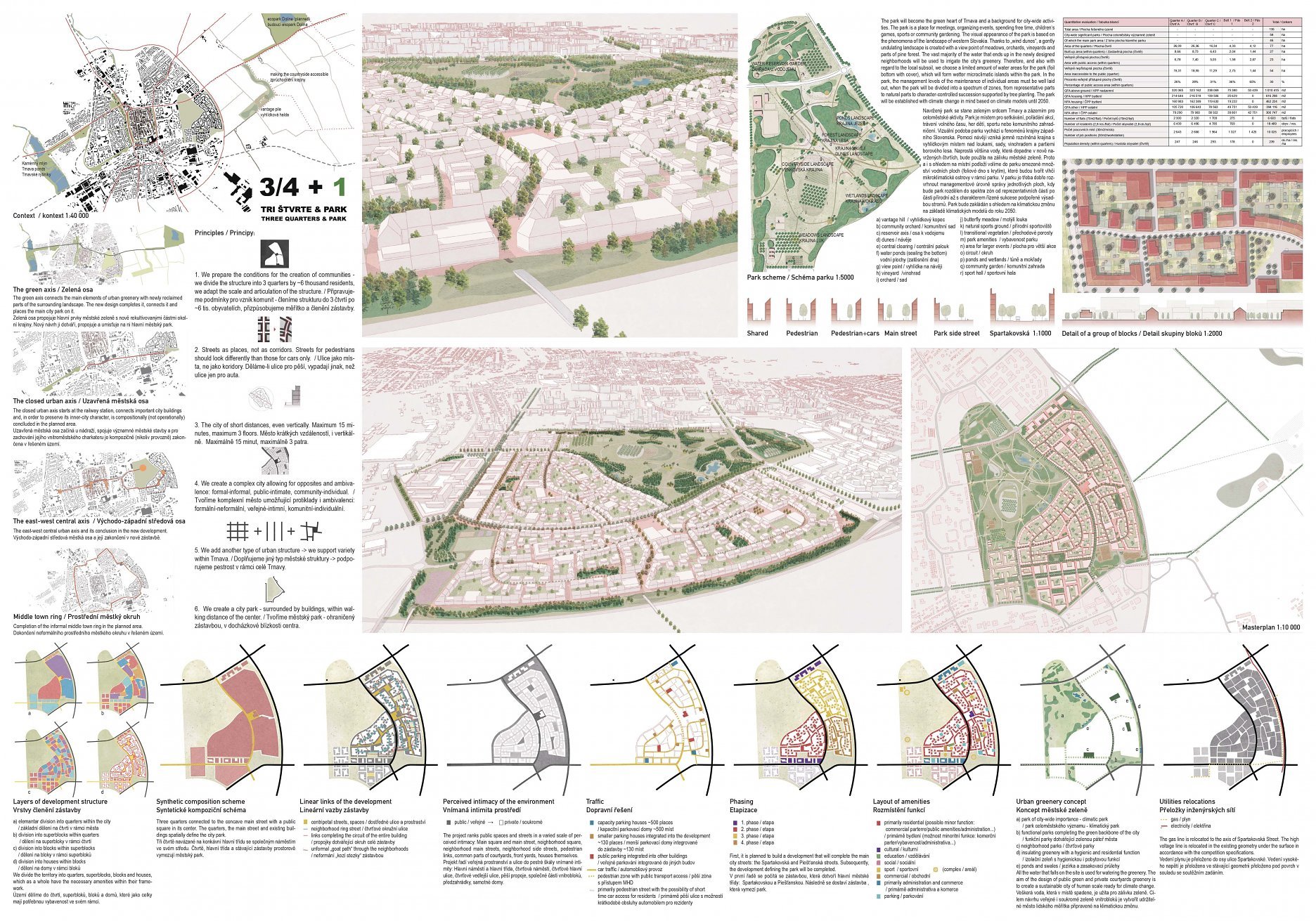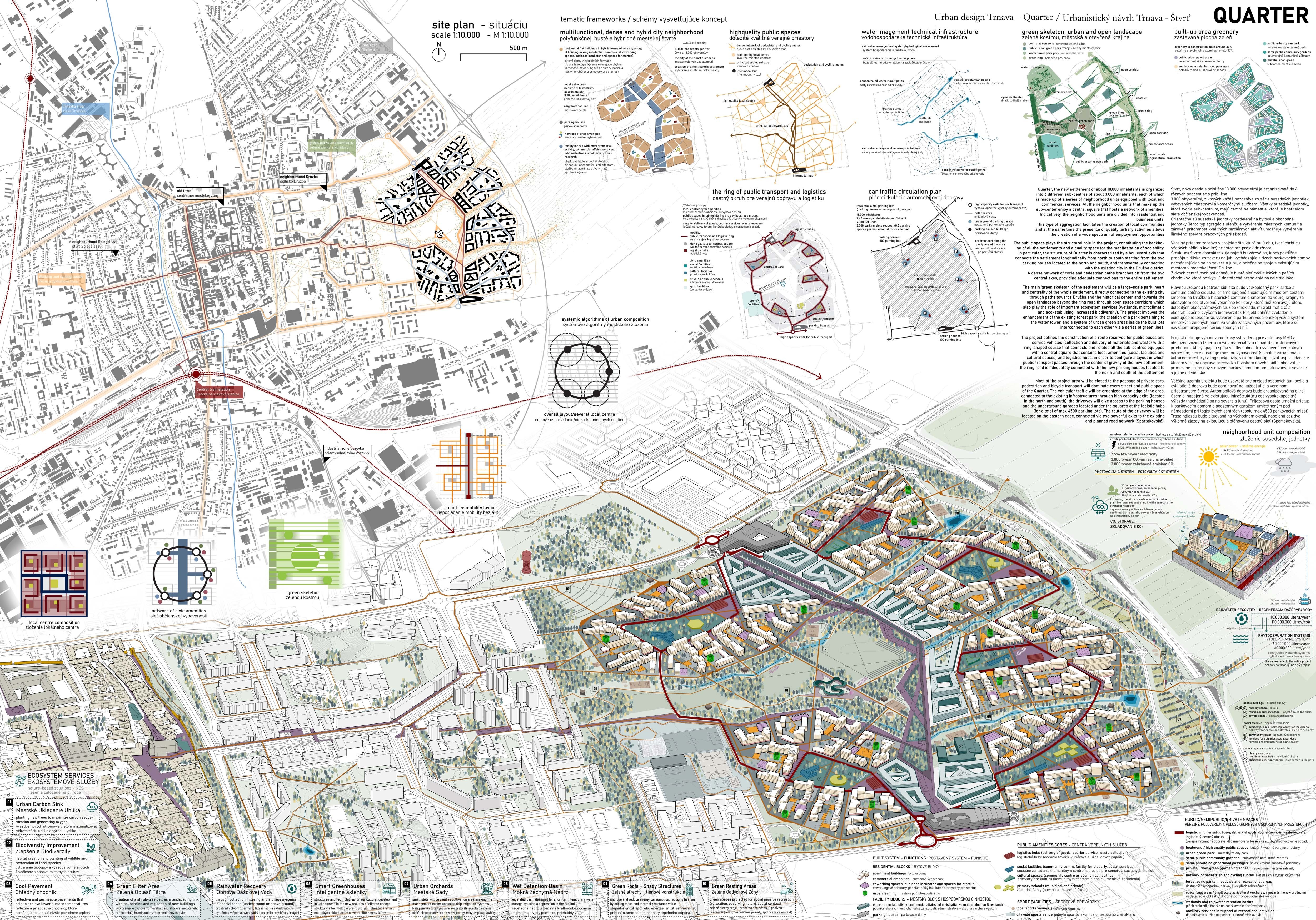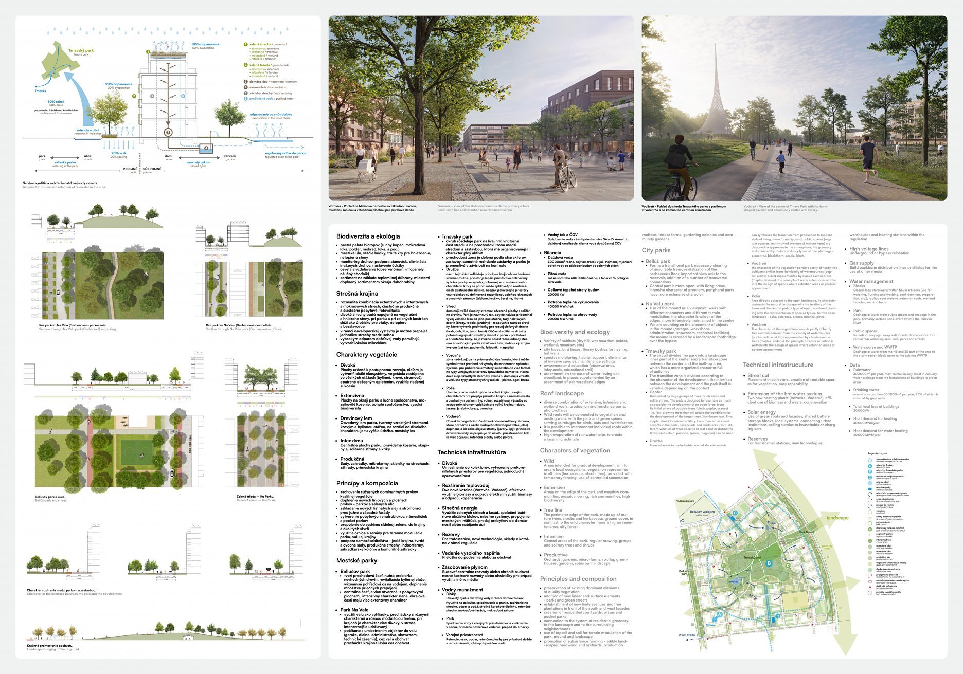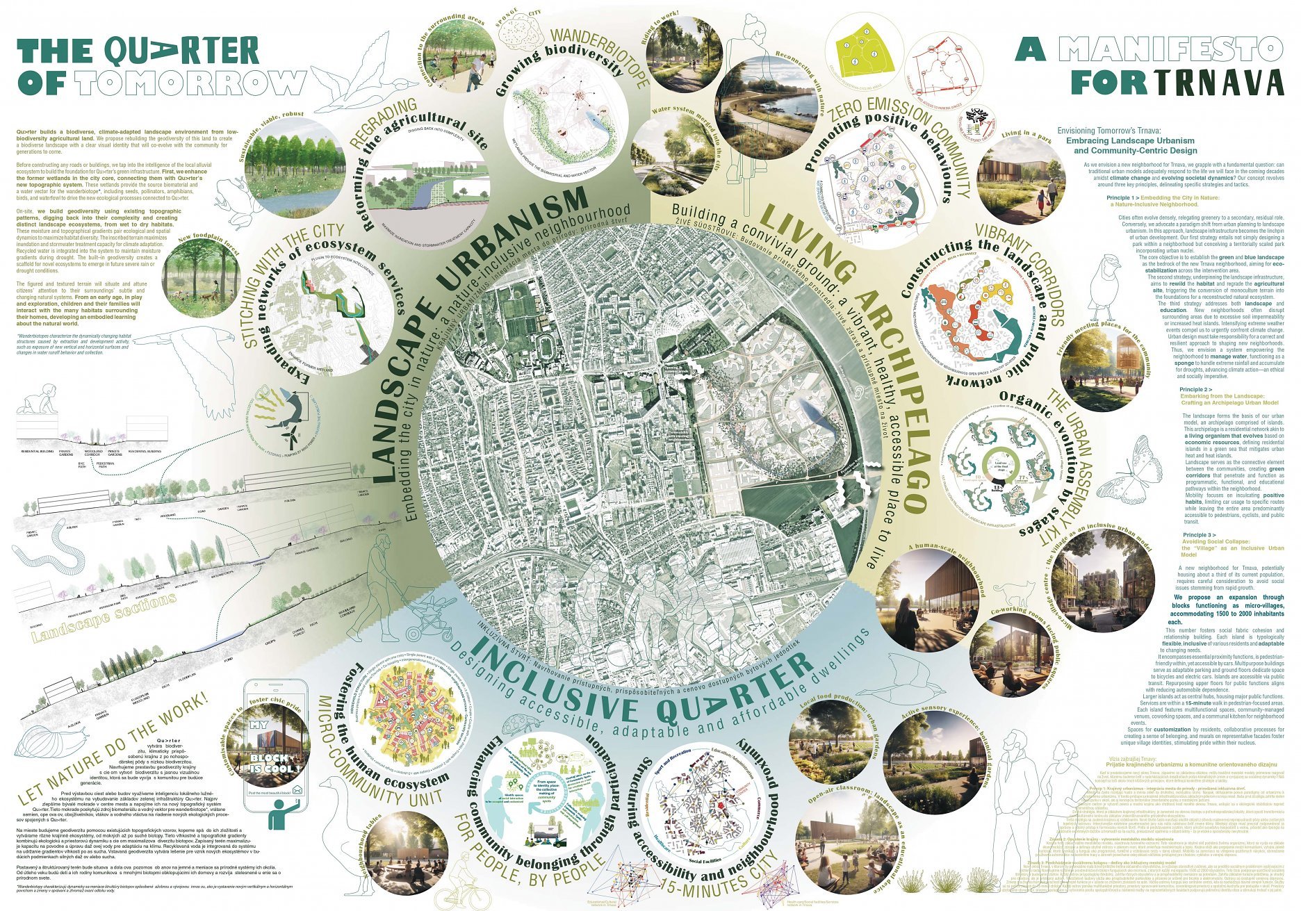 Holistický projekt, ktorý zachytáva podstatu plánovania miest budúcnosti, kde krajina tvorí základ návrhu a kde sú aspekty ako odolnosť voči zmene klímy, reziliencia a ekológia od základu zakotvené v DNA návrhu. Výsledný rámec sa nepozerá iba do budúcnosti, ale je prekvapivo dobre ukotvený v mierke a charaktere mesta Trnava. Parklife dokáže šikovne pretaviť myšlienku centrálneho parku do robustnej siete zelených plôch, ktoré majú potrebnú mierku na to, aby mali ekologický dopad, ale nie sú predimenzované tak, aby tvorili bariéry. Táto nová modro-zelená infraštruktúra bude slúžiť nielen ako klimatická infraštruktúra, ale zároveň vdýchne charakter a identitu rôznym susedstvám. Rozmanitosť mierky a charakteru zabezpečí pocit komunity a príslušnosti v rôznych mierkach štvrte, od skupiny domov sústredených okolo zeleného neformálneho námestia, cez štvrť točiacu sa okolo zeleného prsta, až po priestory pre celú Trnavu.