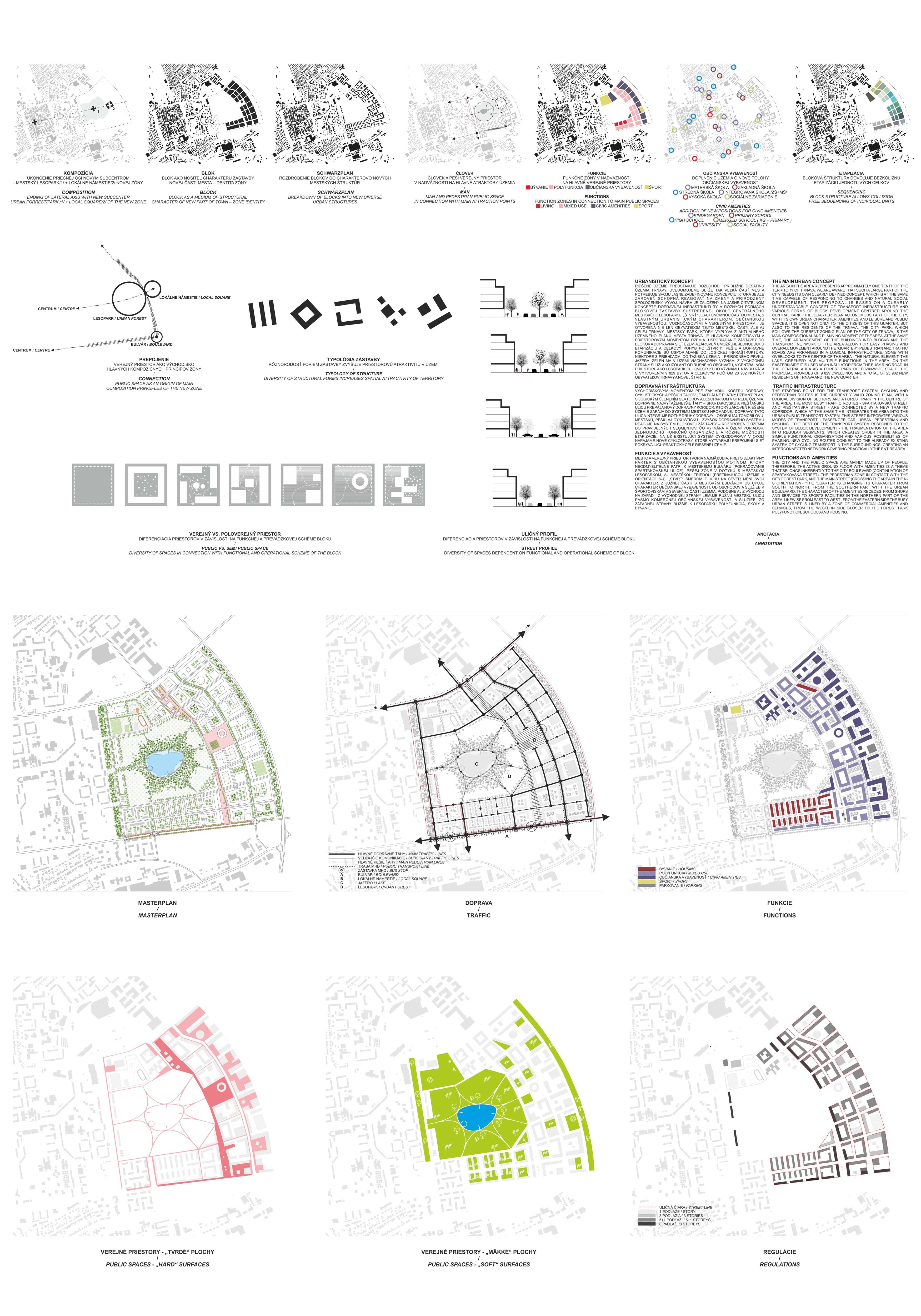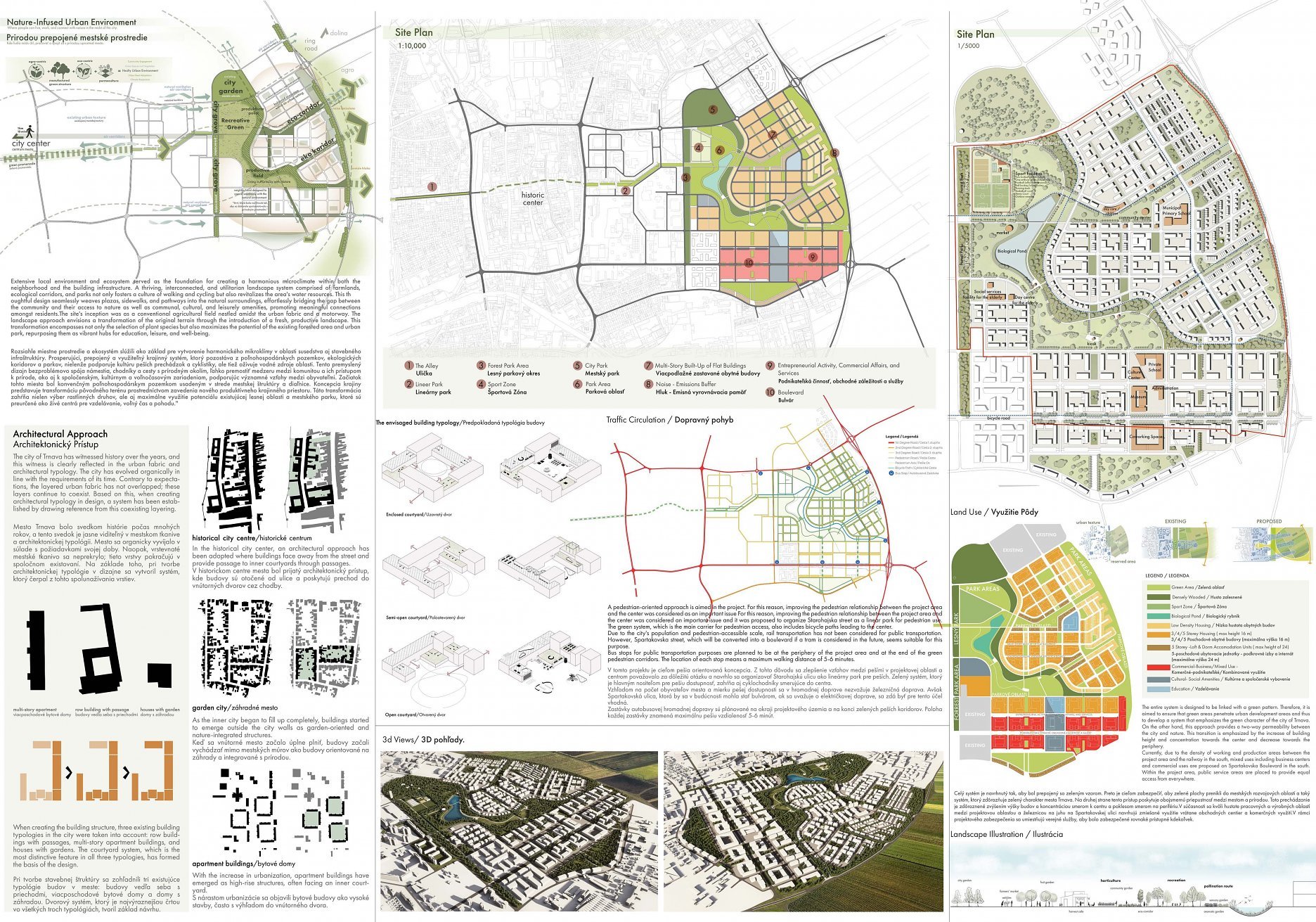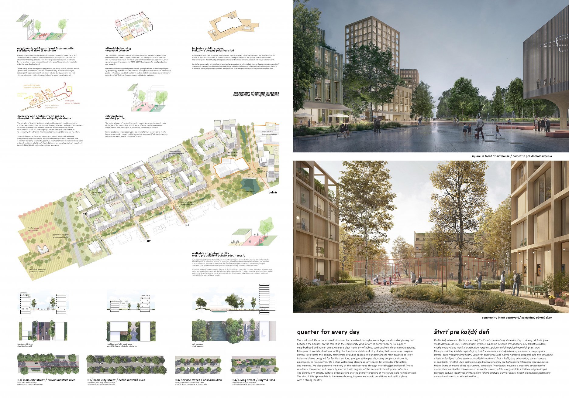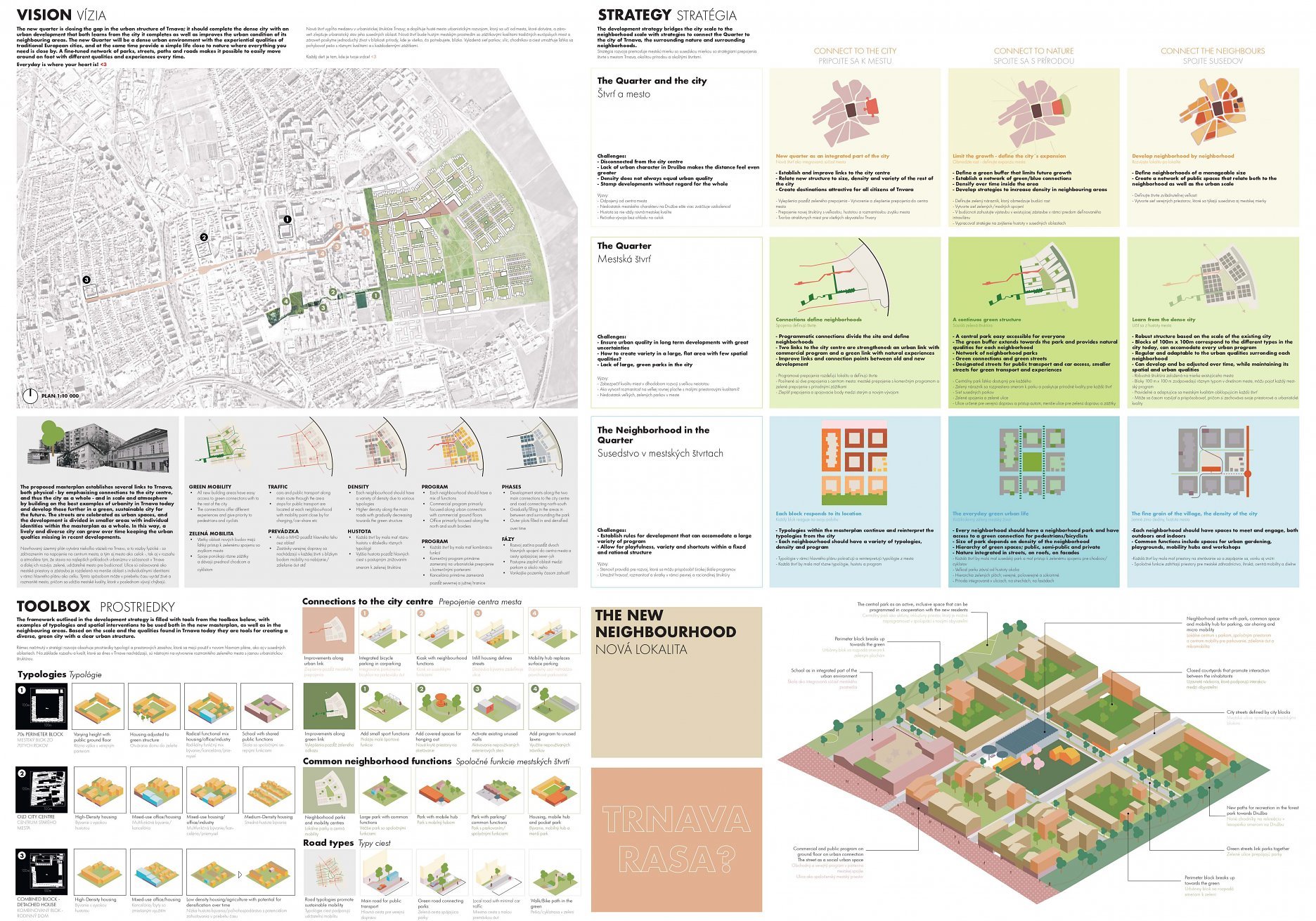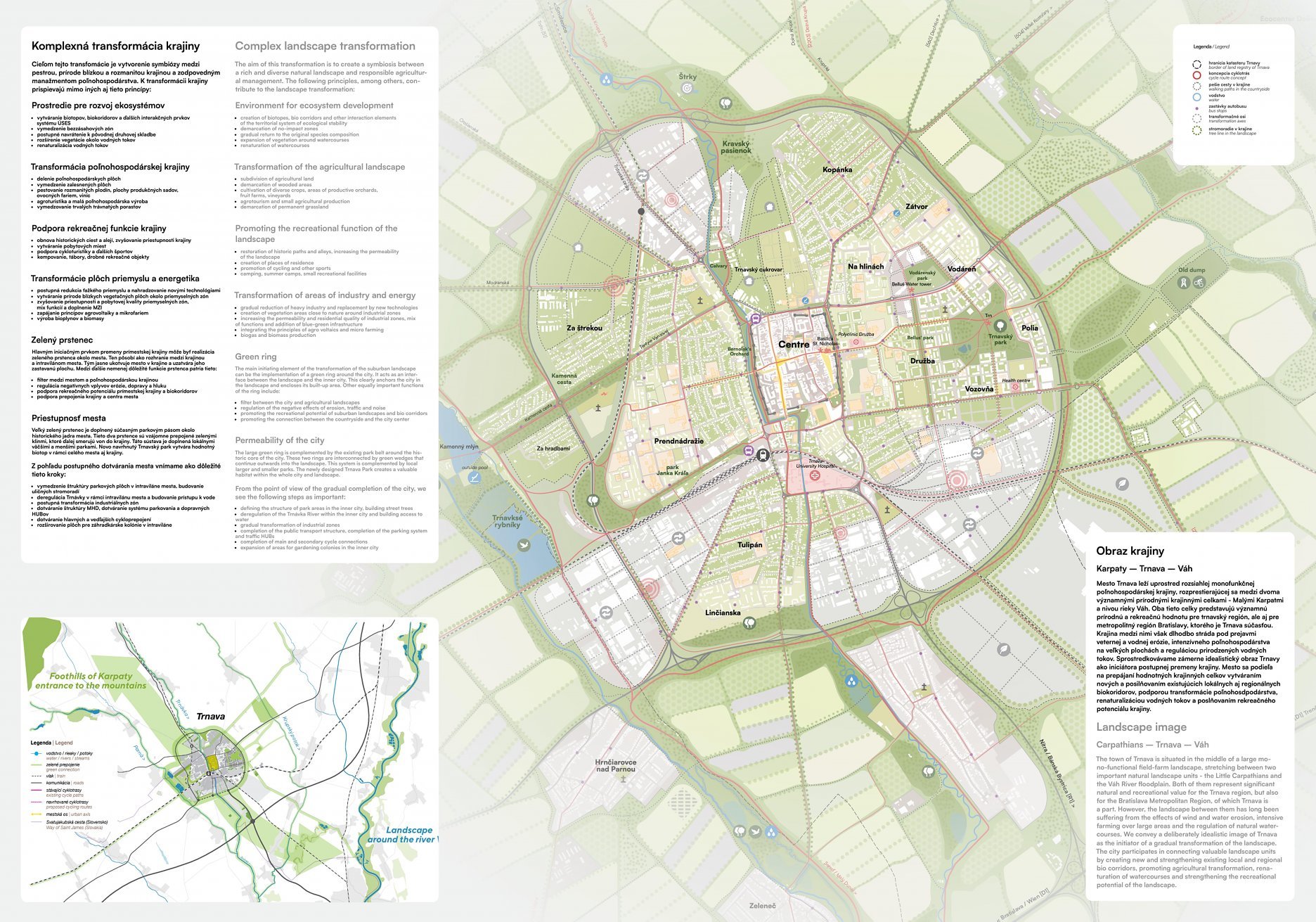 Holistický projekt, ktorý zachytáva podstatu plánovania miest budúcnosti, kde krajina tvorí základ návrhu a kde sú aspekty ako odolnosť voči zmene klímy, reziliencia a ekológia od základu zakotvené v DNA návrhu. Výsledný rámec sa nepozerá iba do budúcnosti, ale je prekvapivo dobre ukotvený v mierke a charaktere mesta Trnava. Parklife dokáže šikovne pretaviť myšlienku centrálneho parku do robustnej siete zelených plôch, ktoré majú potrebnú mierku na to, aby mali ekologický dopad, ale nie sú predimenzované tak, aby tvorili bariéry. Táto nová modro-zelená infraštruktúra bude slúžiť nielen ako klimatická infraštruktúra, ale zároveň vdýchne charakter a identitu rôznym susedstvám. Rozmanitosť mierky a charakteru zabezpečí pocit komunity a príslušnosti v rôznych mierkach štvrte, od skupiny domov sústredených okolo zeleného neformálneho námestia, cez štvrť točiacu sa okolo zeleného prsta, až po priestory pre celú Trnavu.