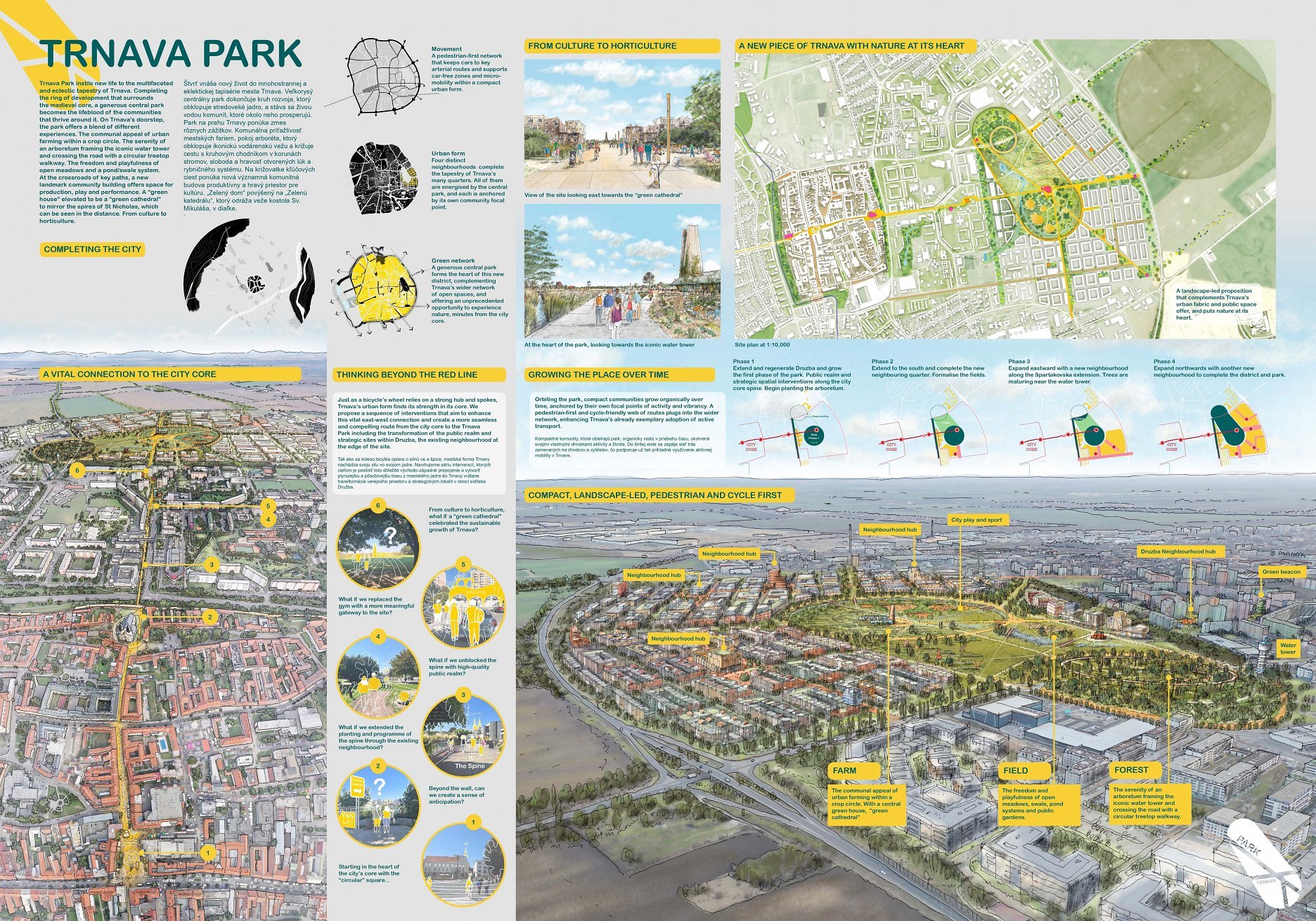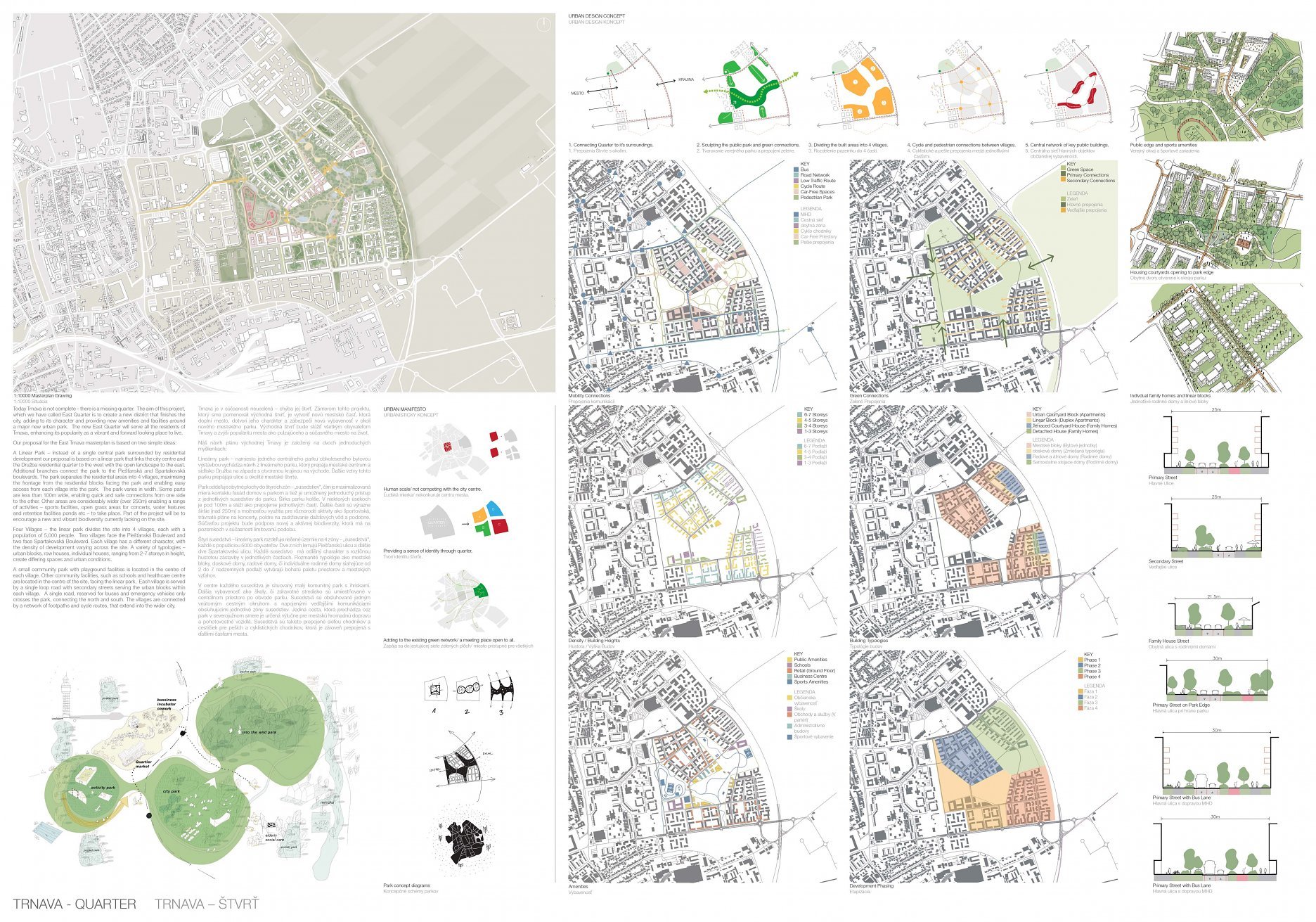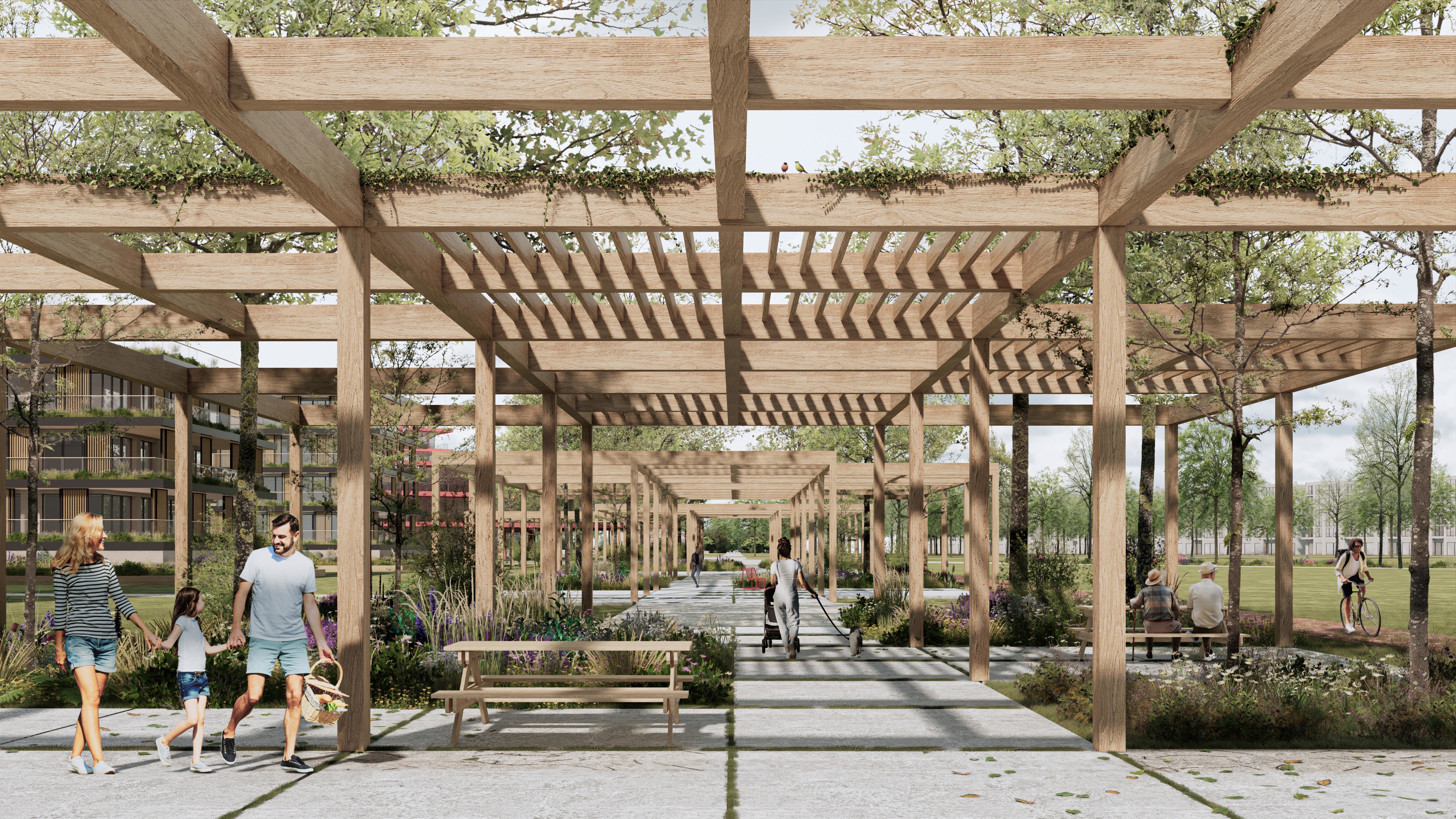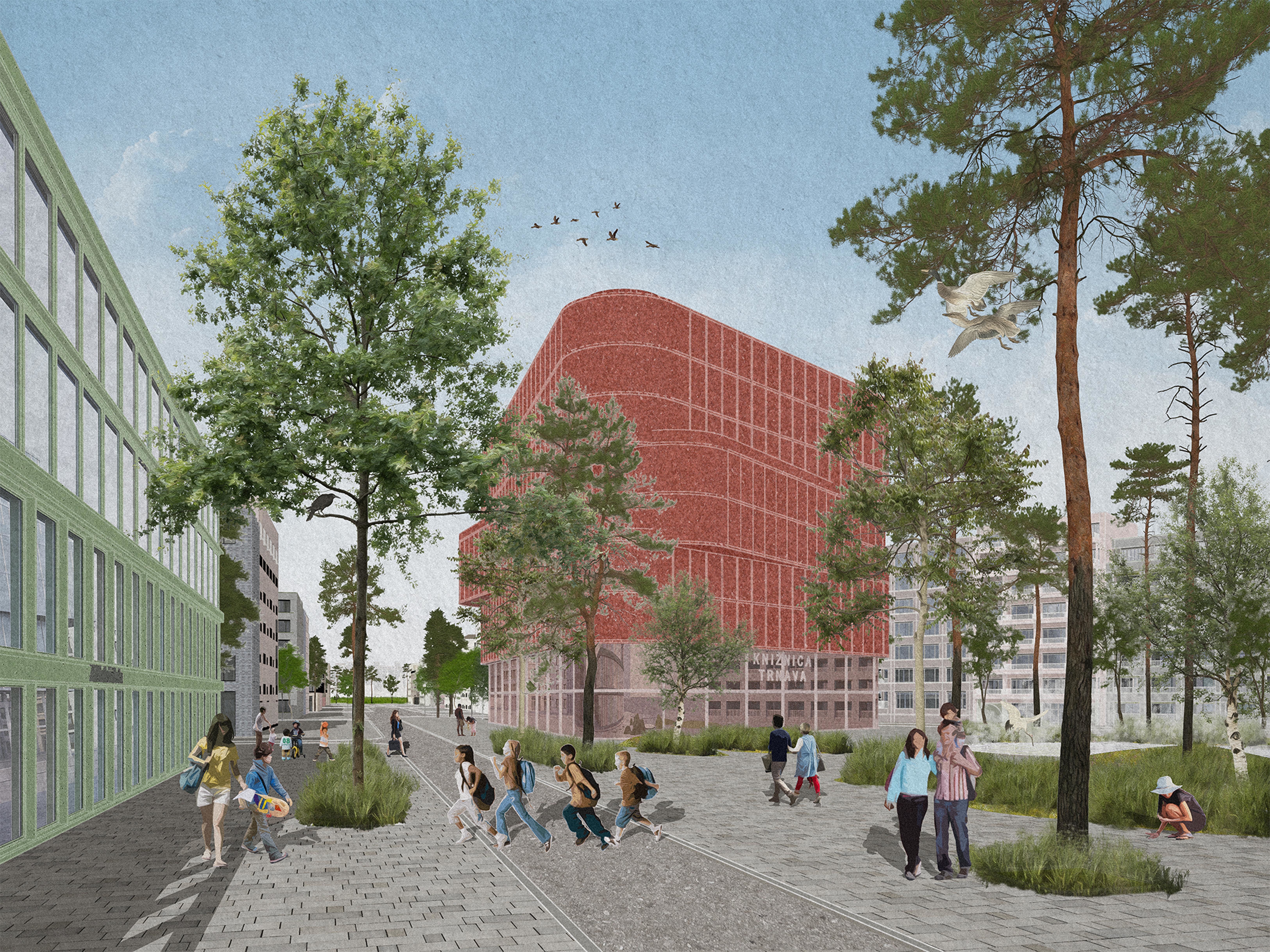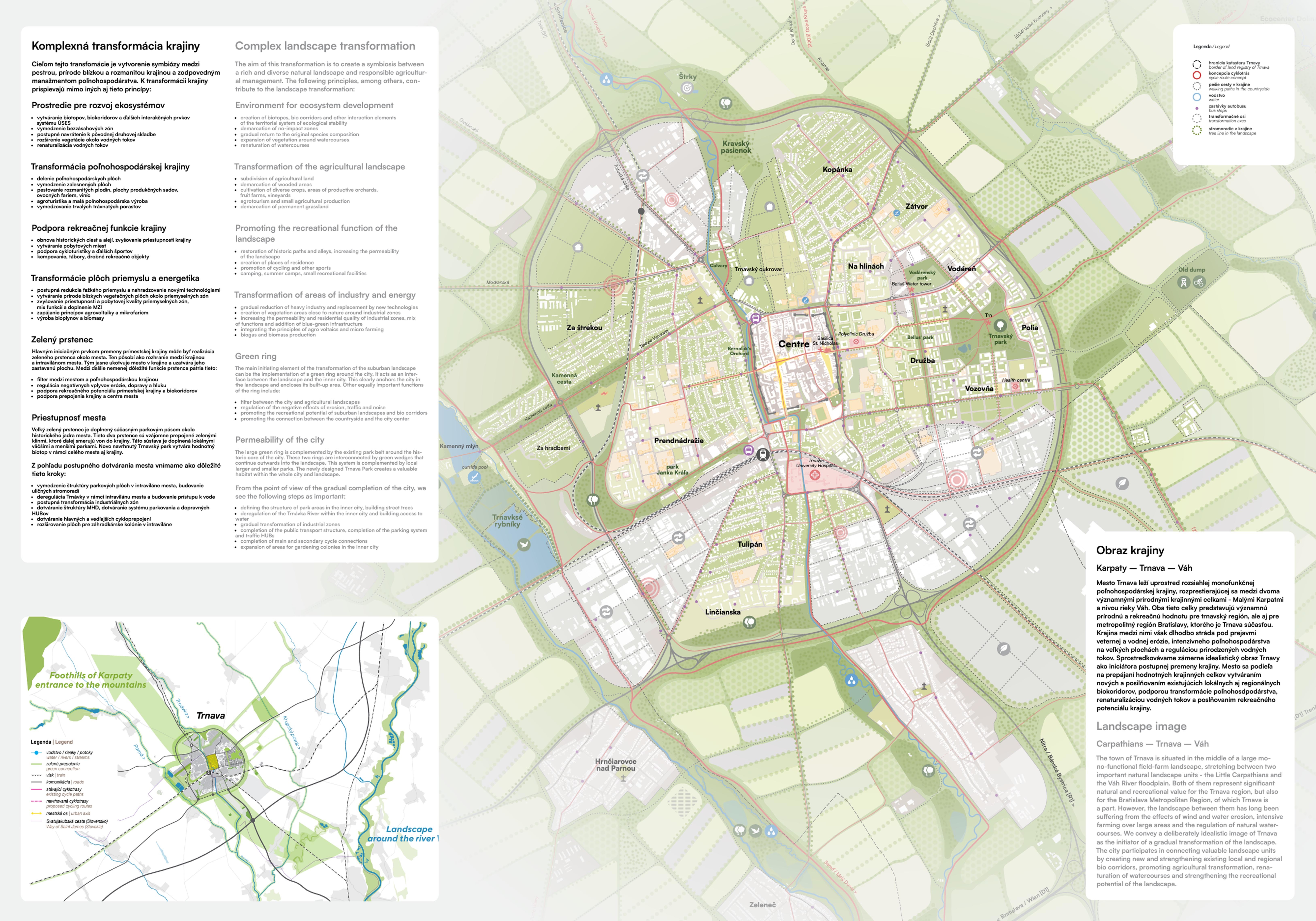 Holistický projekt, ktorý zachytáva podstatu plánovania miest budúcnosti, kde krajina tvorí základ návrhu a kde sú aspekty ako odolnosť voči zmene klímy, reziliencia a ekológia od základu zakotvené v DNA návrhu. Výsledný rámec sa nepozerá iba do budúcnosti, ale je prekvapivo dobre ukotvený v mierke a charaktere mesta Trnava. Parklife dokáže šikovne pretaviť myšlienku centrálneho parku do robustnej siete zelených plôch, ktoré majú potrebnú mierku na to, aby mali ekologický dopad, ale nie sú predimenzované tak, aby tvorili bariéry. Táto nová modro-zelená infraštruktúra bude slúžiť nielen ako klimatická infraštruktúra, ale zároveň vdýchne charakter a identitu rôznym susedstvám. Rozmanitosť mierky a charakteru zabezpečí pocit komunity a príslušnosti v rôznych mierkach štvrte, od skupiny domov sústredených okolo zeleného neformálneho námestia, cez štvrť točiacu sa okolo zeleného prsta, až po priestory pre celú Trnavu.