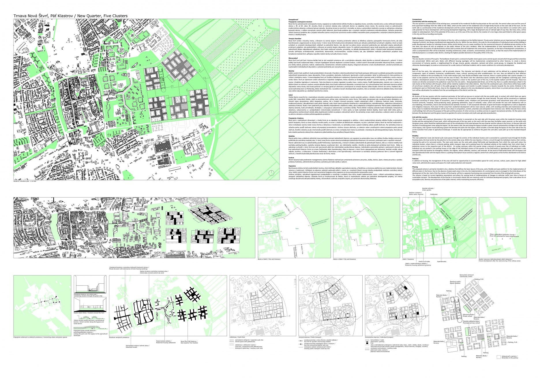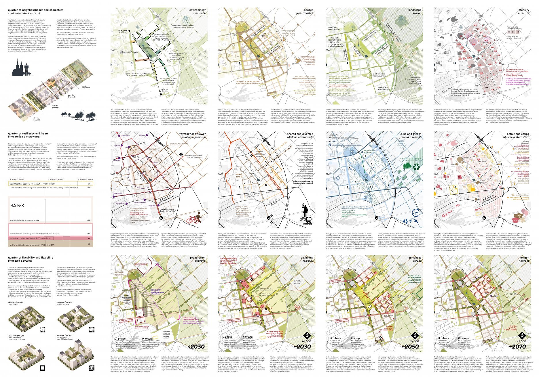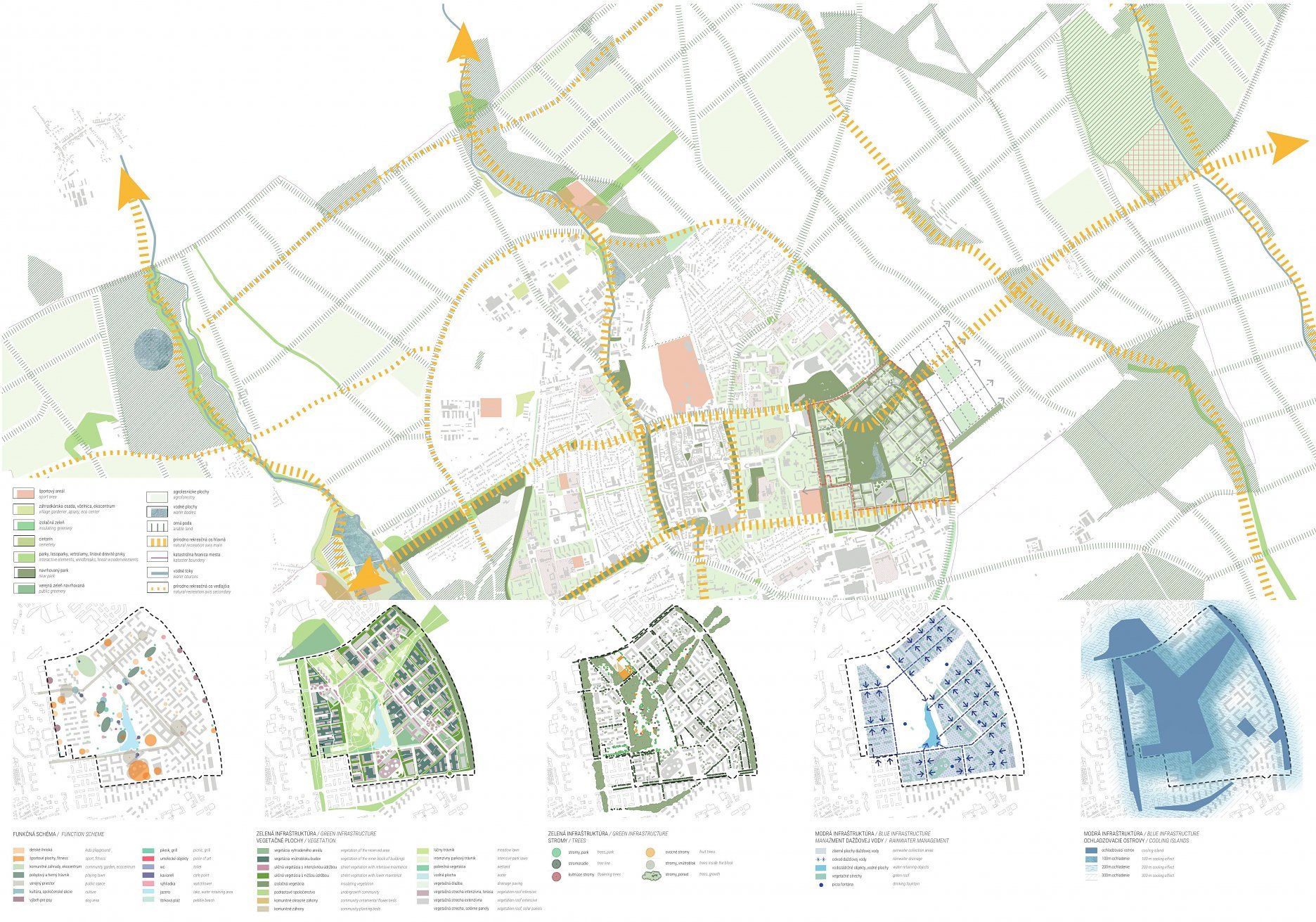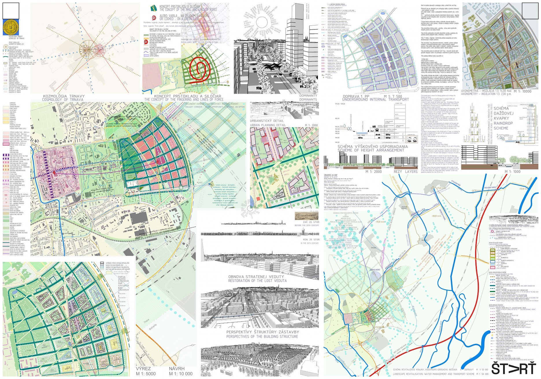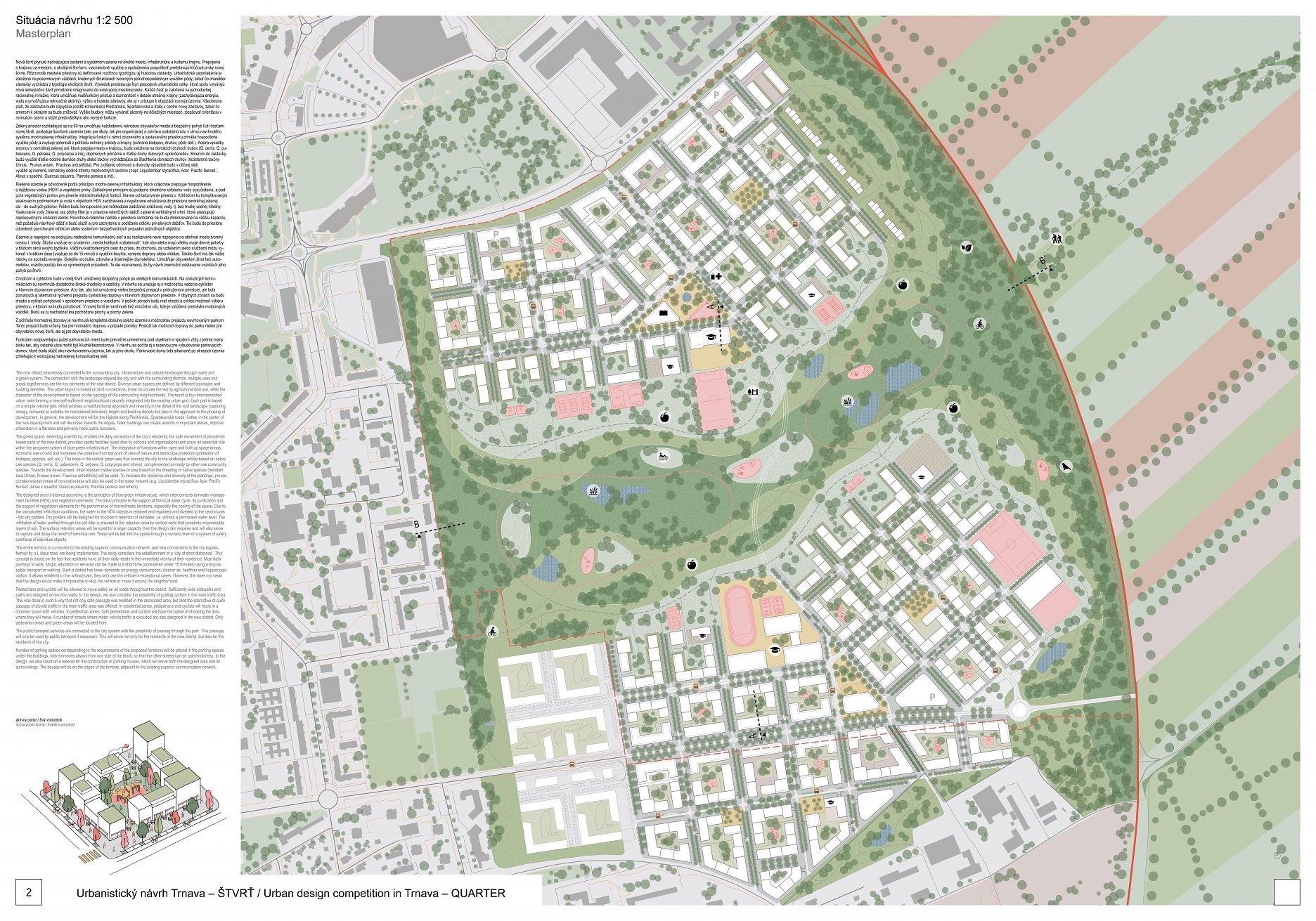 Holistický projekt, ktorý zachytáva podstatu plánovania miest budúcnosti, kde krajina tvorí základ návrhu a kde sú aspekty ako odolnosť voči zmene klímy, reziliencia a ekológia od základu zakotvené v DNA návrhu. Výsledný rámec sa nepozerá iba do budúcnosti, ale je prekvapivo dobre ukotvený v mierke a charaktere mesta Trnava. Parklife dokáže šikovne pretaviť myšlienku centrálneho parku do robustnej siete zelených plôch, ktoré majú potrebnú mierku na to, aby mali ekologický dopad, ale nie sú predimenzované tak, aby tvorili bariéry. Táto nová modro-zelená infraštruktúra bude slúžiť nielen ako klimatická infraštruktúra, ale zároveň vdýchne charakter a identitu rôznym susedstvám. Rozmanitosť mierky a charakteru zabezpečí pocit komunity a príslušnosti v rôznych mierkach štvrte, od skupiny domov sústredených okolo zeleného neformálneho námestia, cez štvrť točiacu sa okolo zeleného prsta, až po priestory pre celú Trnavu.