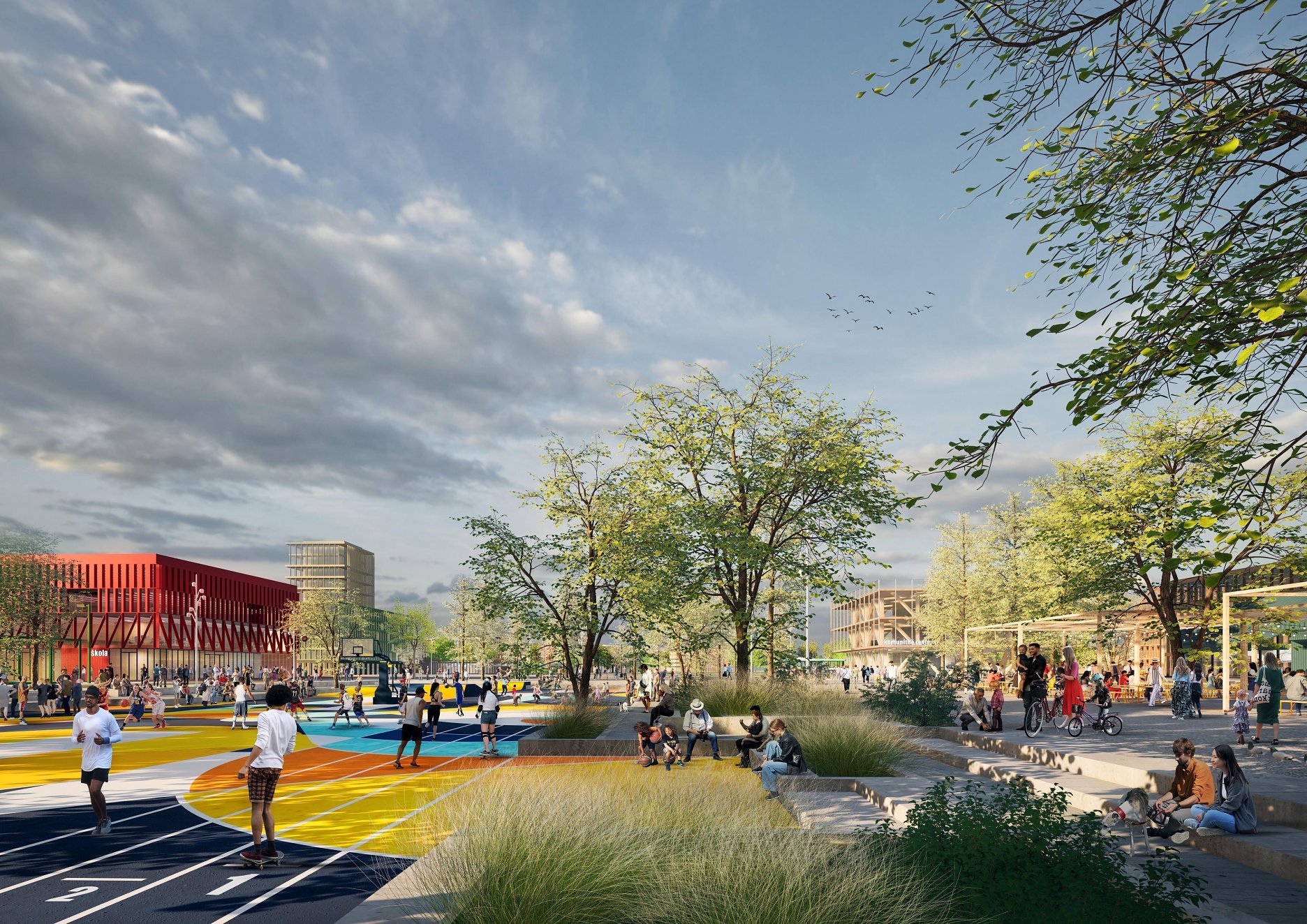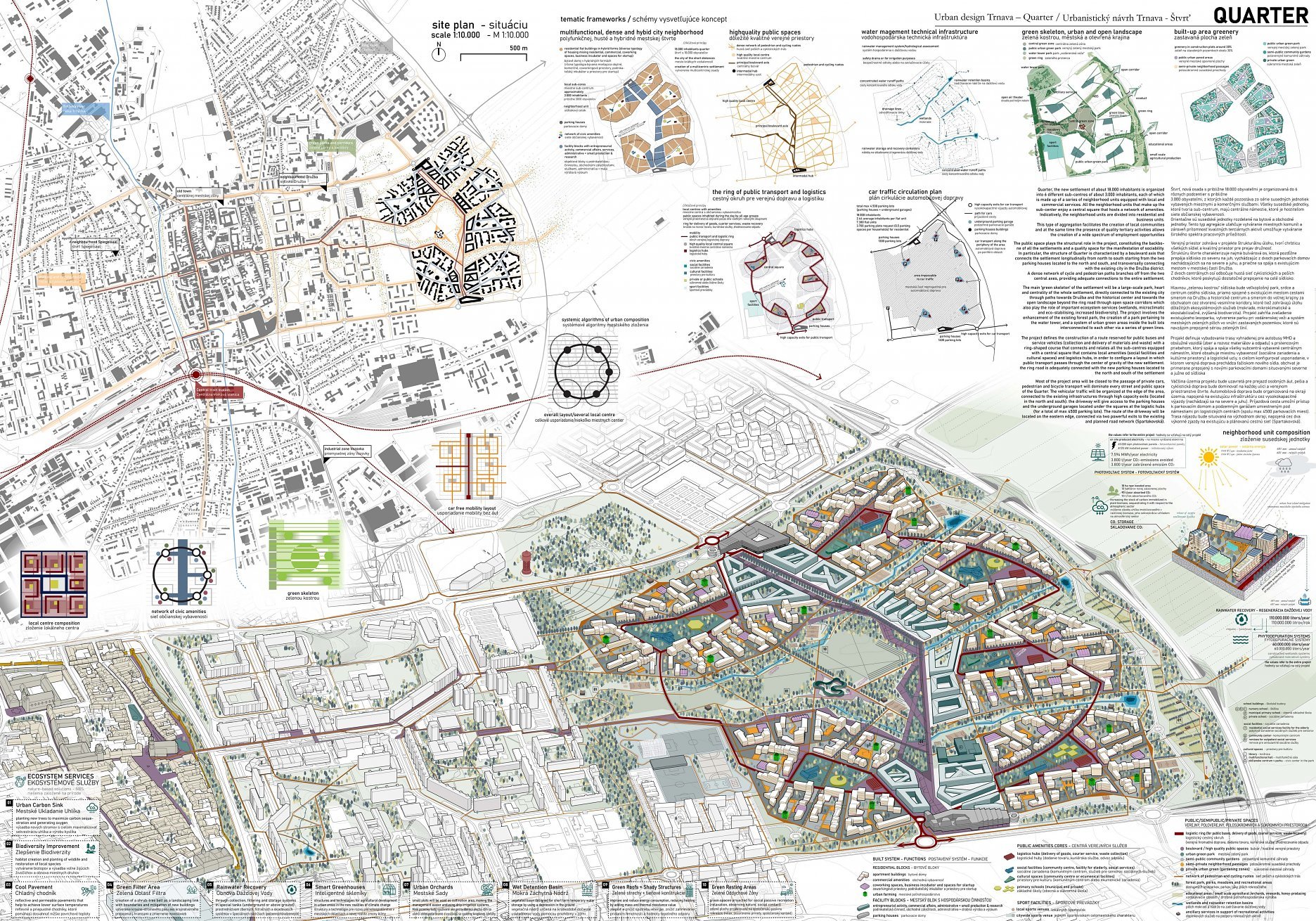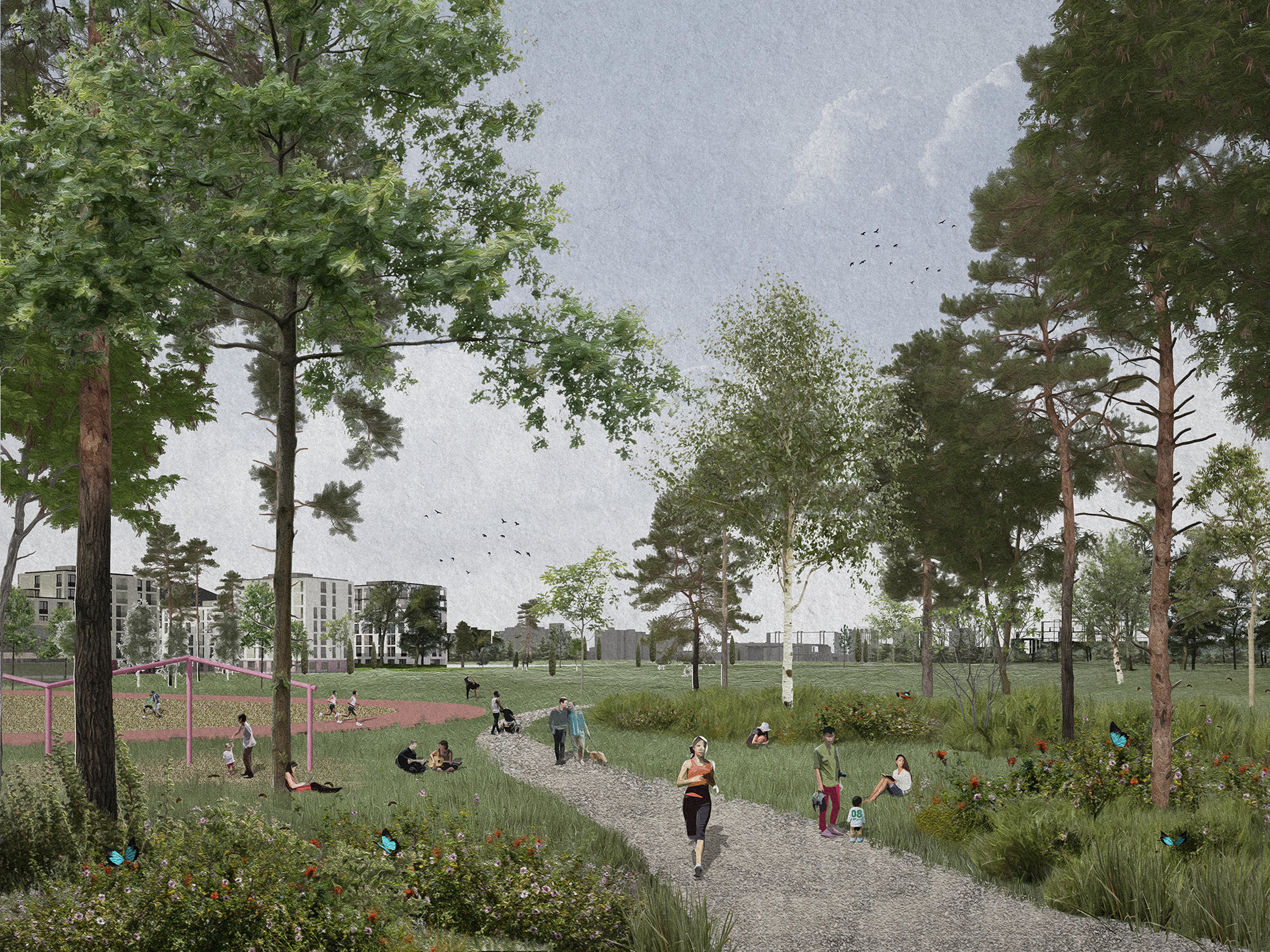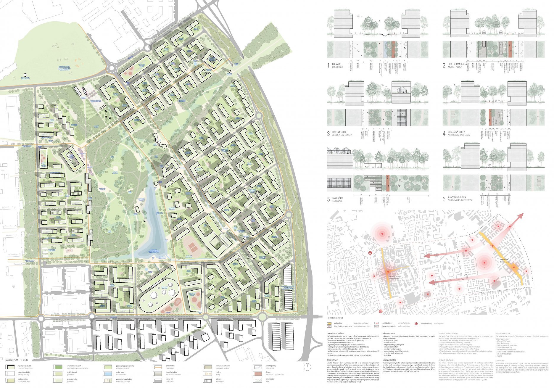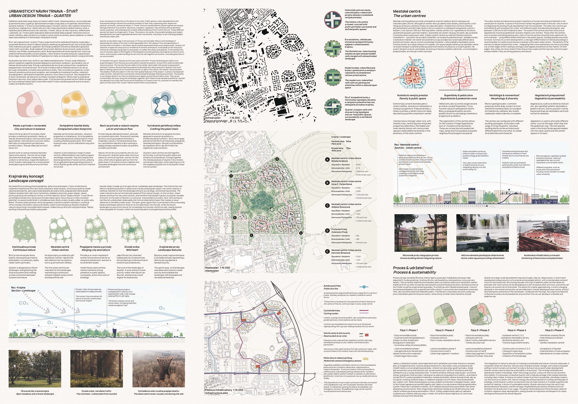 Holistický projekt, ktorý zachytáva podstatu plánovania miest budúcnosti, kde krajina tvorí základ návrhu a kde sú aspekty ako odolnosť voči zmene klímy, reziliencia a ekológia od základu zakotvené v DNA návrhu. Výsledný rámec sa nepozerá iba do budúcnosti, ale je prekvapivo dobre ukotvený v mierke a charaktere mesta Trnava. Parklife dokáže šikovne pretaviť myšlienku centrálneho parku do robustnej siete zelených plôch, ktoré majú potrebnú mierku na to, aby mali ekologický dopad, ale nie sú predimenzované tak, aby tvorili bariéry. Táto nová modro-zelená infraštruktúra bude slúžiť nielen ako klimatická infraštruktúra, ale zároveň vdýchne charakter a identitu rôznym susedstvám. Rozmanitosť mierky a charakteru zabezpečí pocit komunity a príslušnosti v rôznych mierkach štvrte, od skupiny domov sústredených okolo zeleného neformálneho námestia, cez štvrť točiacu sa okolo zeleného prsta, až po priestory pre celú Trnavu.