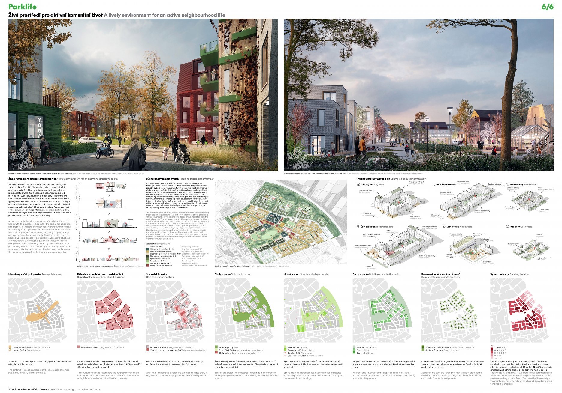 Navrhovaná štruktúra zástavby je mimoriadne bohatá a rozmanitá a pozostáva z hravého mixu mestských a vidieckych typológií. Práve v tejto živej kombinácii medzi mestskosťou a vidiekom dokáže Parklife predstaviť veľmi špecifickú mierku a charakter, ktorý zodpovedá dedičstvu Trnavy a zároveň je orientovaný do budúcnosti. Porota odporúča tento mix ďalej skúmať a zabezpečiť, aby mal ešte výraznejší charakter a ešte rozmanitejší mix vo všetkých fázach projektu.