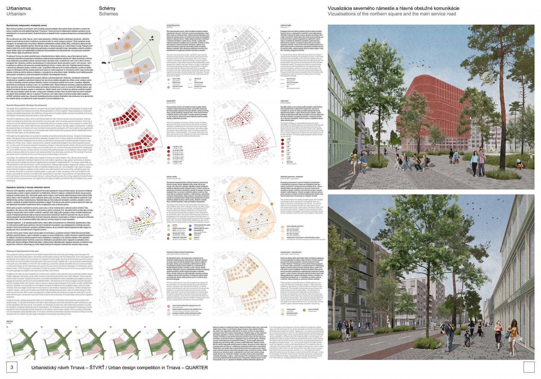 V čom podľa poroty návrh zaostal, je jeho extrémna hustota a príliš ambiciózna urbanita. Toto predimenzovanie má za následok rozpačitý pomer medzi obytnými a nebytovými priestormi (s obrovským počtom štvorcových metrov venovaných komerčnému a kultúrnemu programu), ale predovšetkým posúva projekt do miery urbanity, ktorá je úplne oddelená od kontextu Trnavy. To je viditeľné vo vysoko mestských blokoch, ale ešte zásadnejšie vo verejných priestoroch. Ich metropolitný charakter a proporcie konkurujúce centru mesta preto porota vníma kriticky. Mestské priestory, ako námestia, sa stávajú predimenzovanými, zatiaľ čo zelené plochy sú kompaktné a formálne, čo má za následok celkový charakter, ktorý nie celkom zodpovedá sviežemu, prírodnému a biologicky rozmanitému charakteru, ku ktorému mierilo súťažné zadanie.
