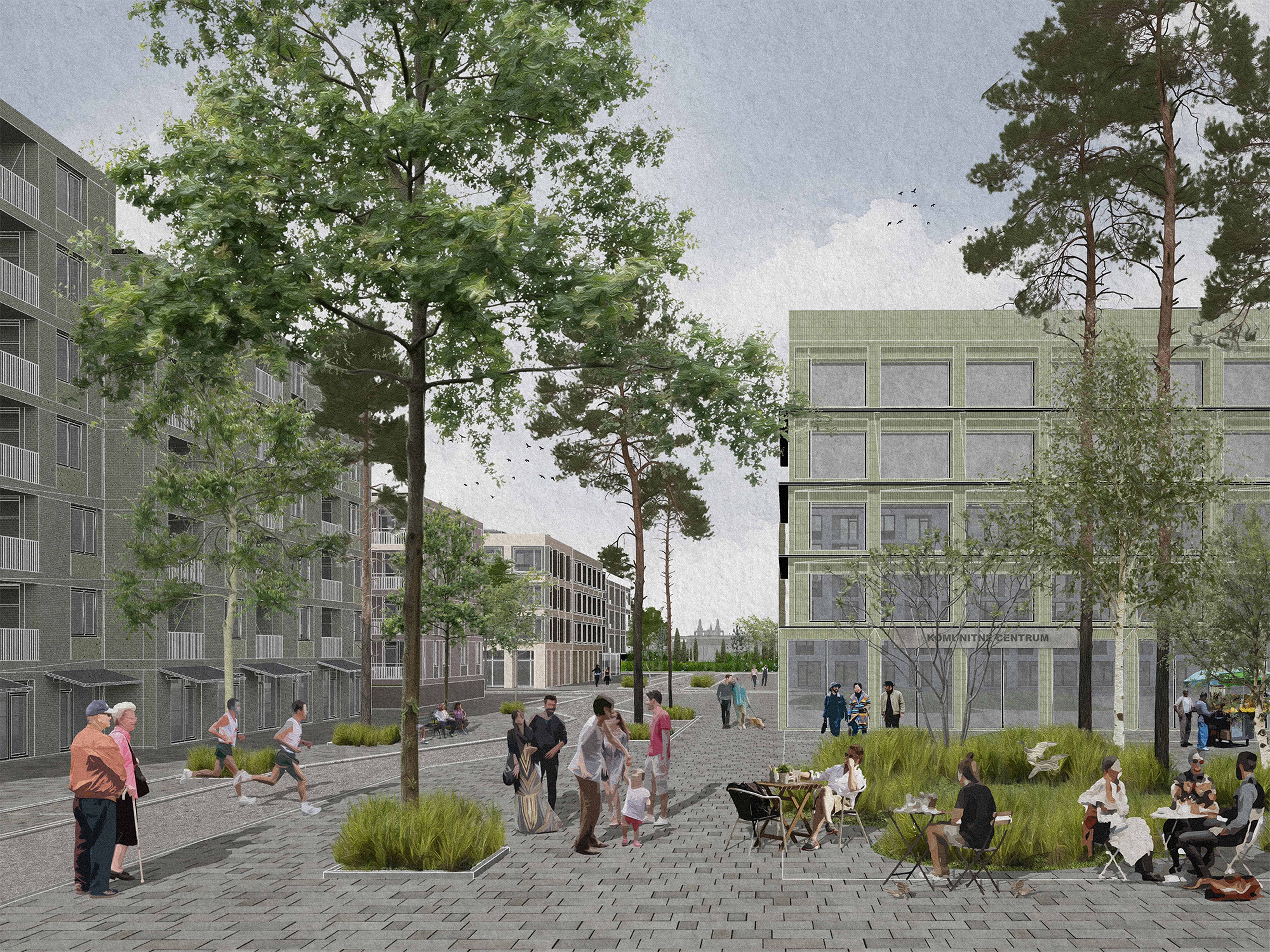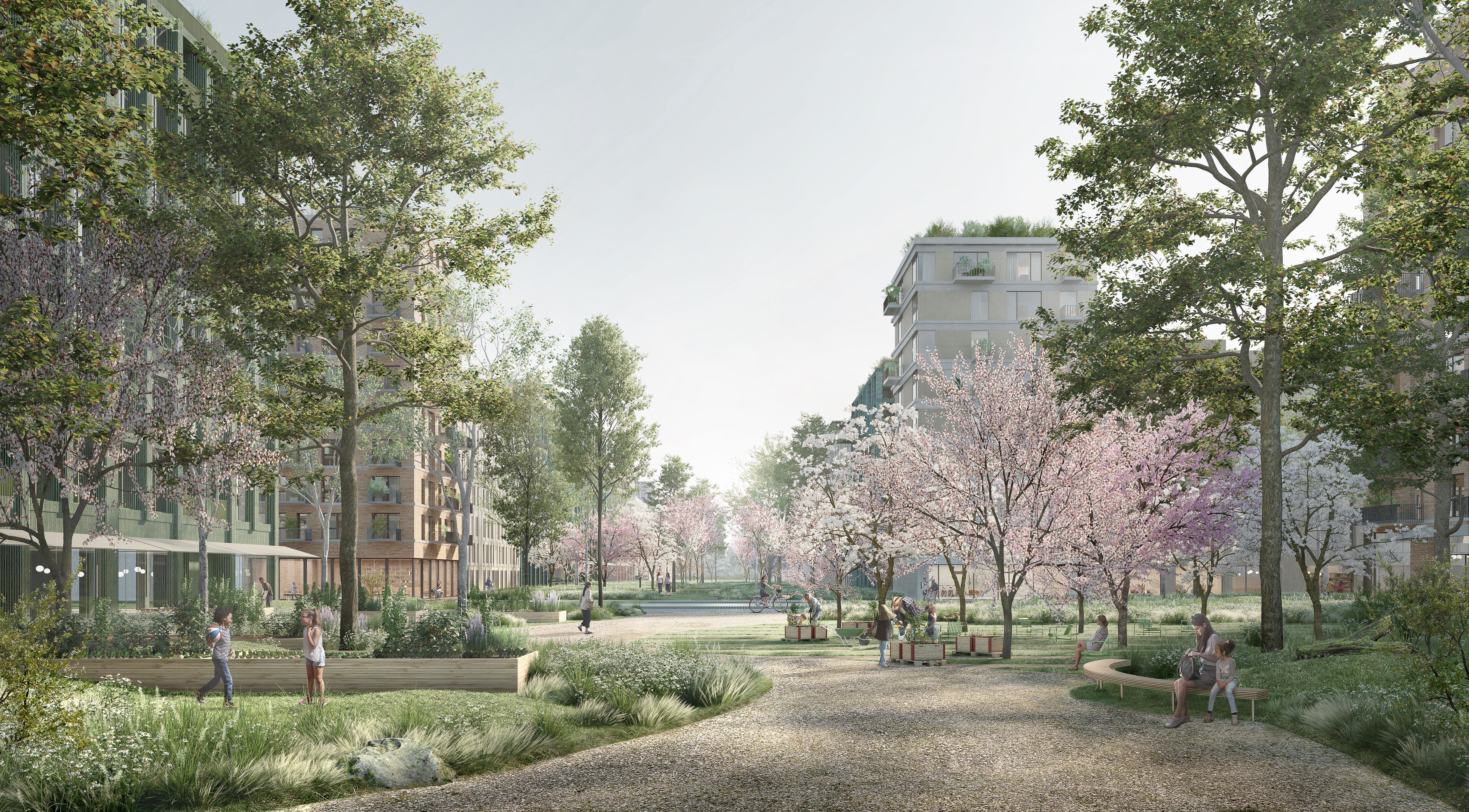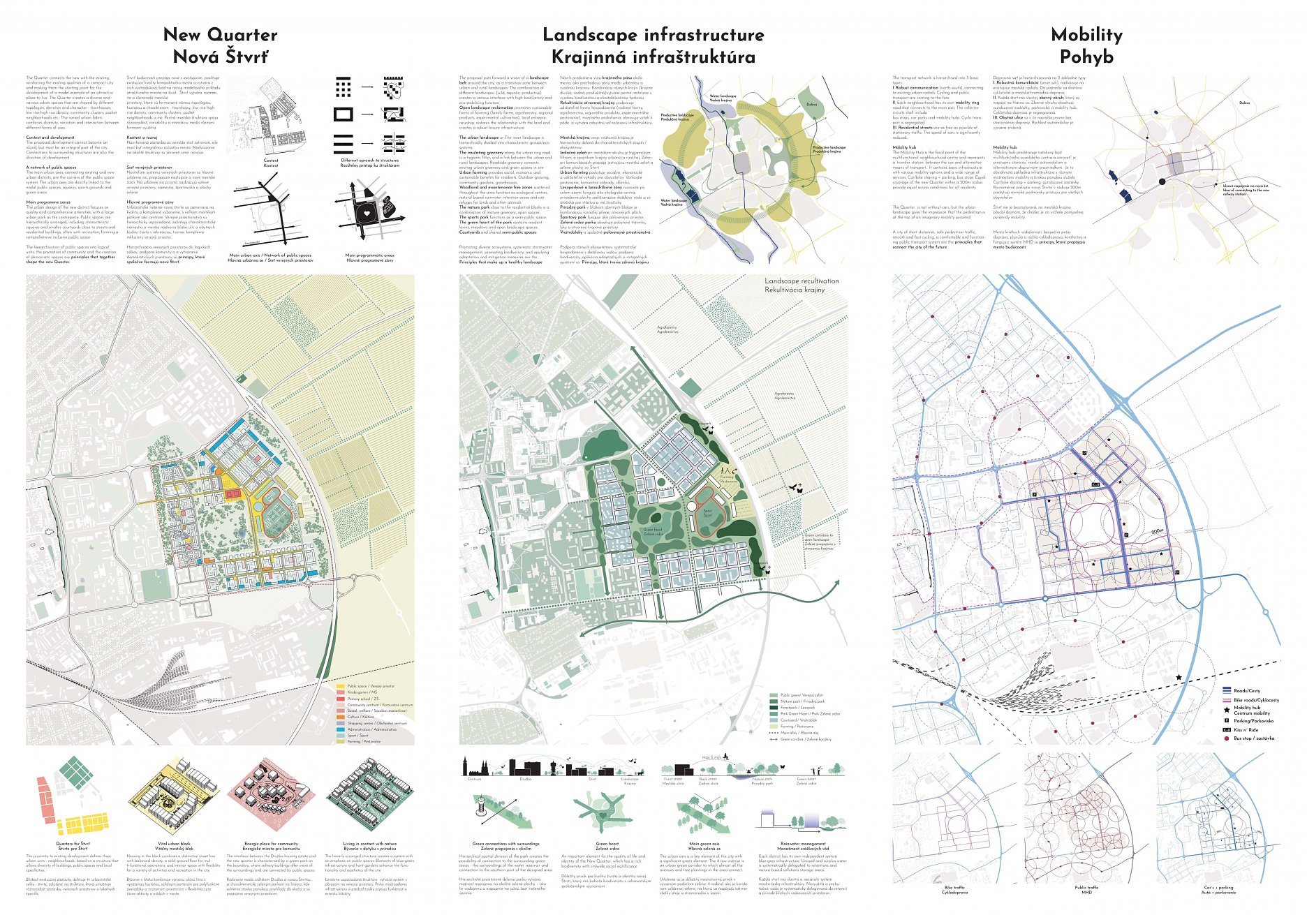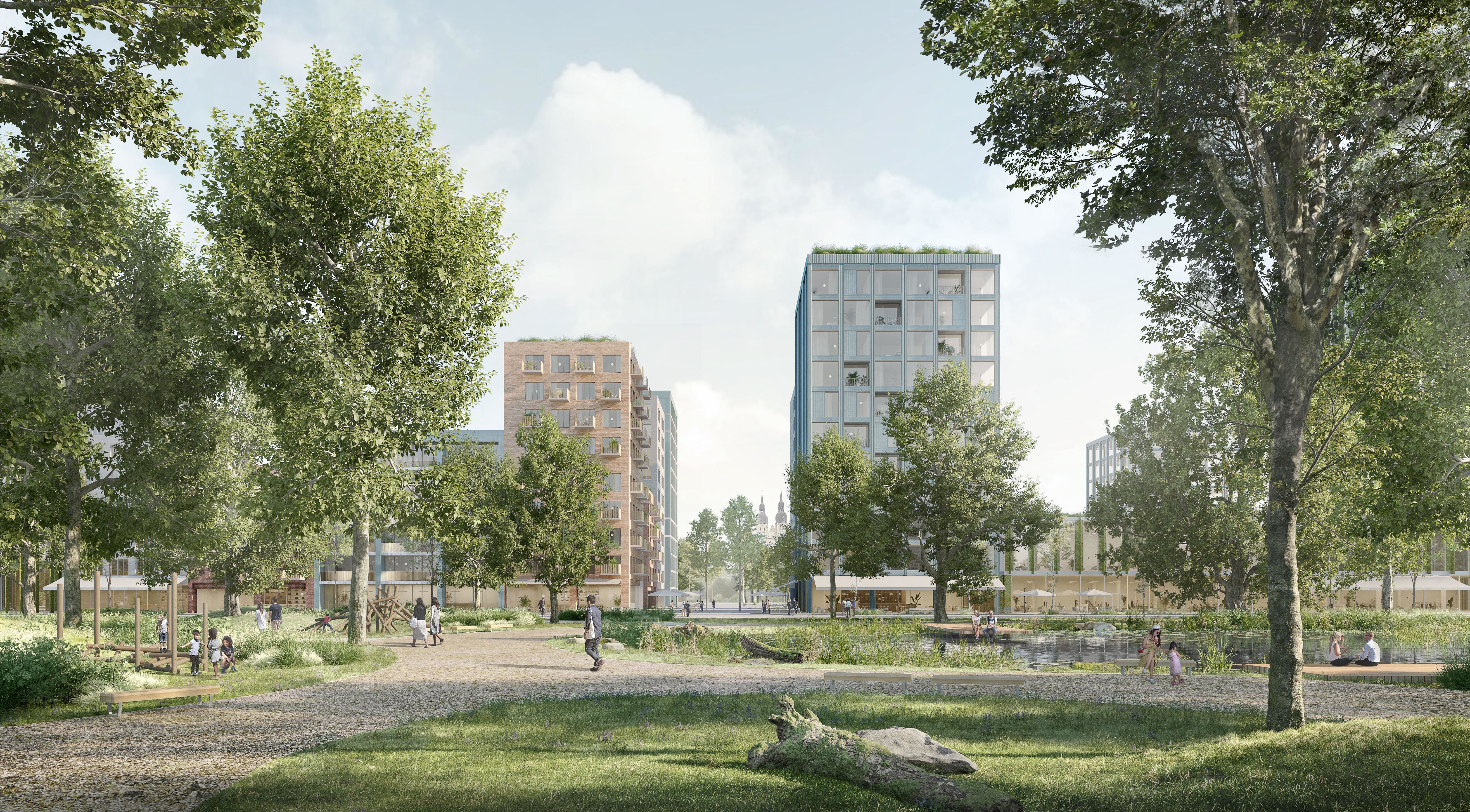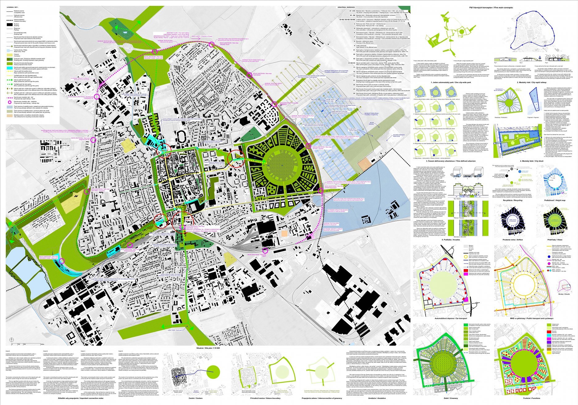 Tento návrh stavia do centra štvrte veľkorysý park, čo porota hodnotila veľmi pozitívne. Park je silný a robustný a má obrovský potenciál v boji proti problémom, akým je napríklad efekt mestského tepelného ostrova. Chvályhodný výber centrálneho parku má však svoje nevýhody z hľadiska rozloženia mestskej štruktúry. Veľkosť a proporcie centrálnej zelenej plochy predstavujú riziko, že bude pôsobiť skôr ako bariéra, než ako spojovací článok, a vytlačí urbanitu na okraje v pomerne úzkych pásoch (najmä vo východnej časti). Potenciál týchto oblastí stať sa skutočne susedstvami zameranými na človeka je otázny. Ambícia prepojenia s okolím je chvályhodná, pretože má potenciál skutočne prepojiť nielen z hľadiska infraštruktúry, ale aj z hľadiska urbanistickej štruktúry. Úloha preklenúť dopravnú infraštruktúru na hranici lokality sa však ukazuje ako ťažko riešiteľná a nebola dostatočne presvedčivá, čoho výsledkom sú verejné priestranstvá na okraji štvrte.