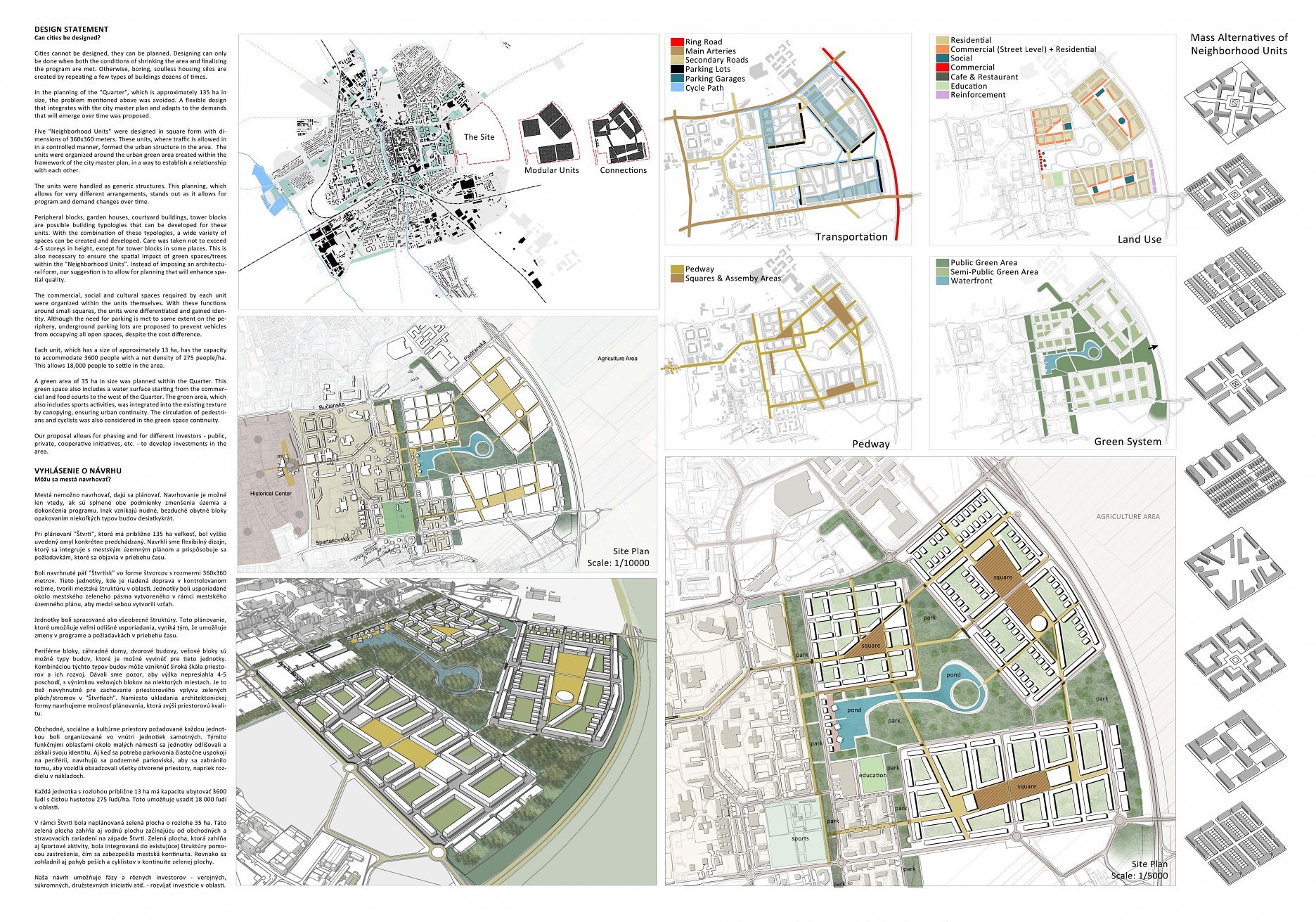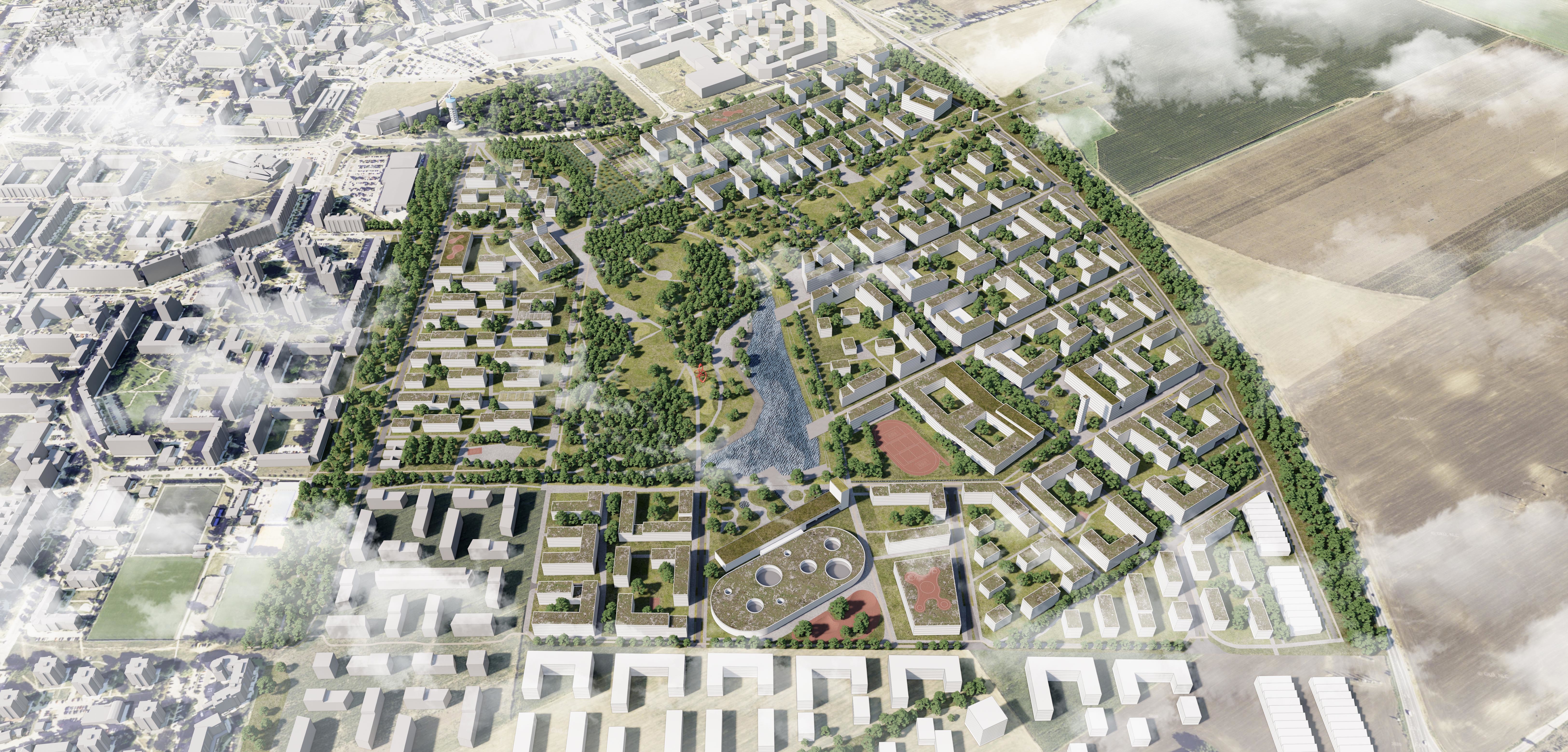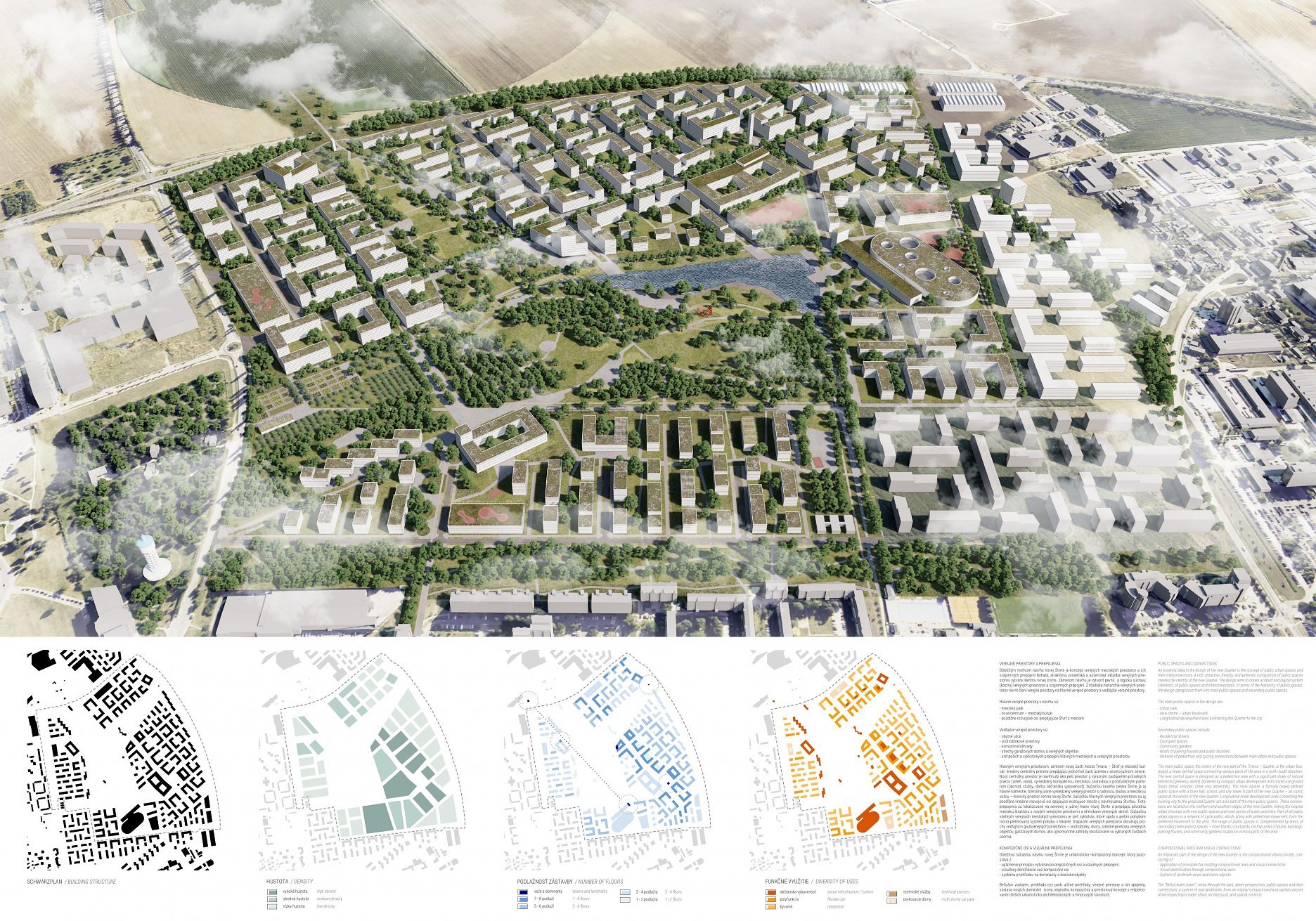 Návrh má veľmi silnú priestorovú štruktúru s dobrým centrálnym parkom dobre prepojeným s okolím. Zasahuje do krajiny veľkorysým zeleným výbežkom a presvedčivo nadväzuje na miestne dominanty, ako je vodárenská veža. Zámer je veľmi čitateľný s jasnými kompozičnými kvalitami.