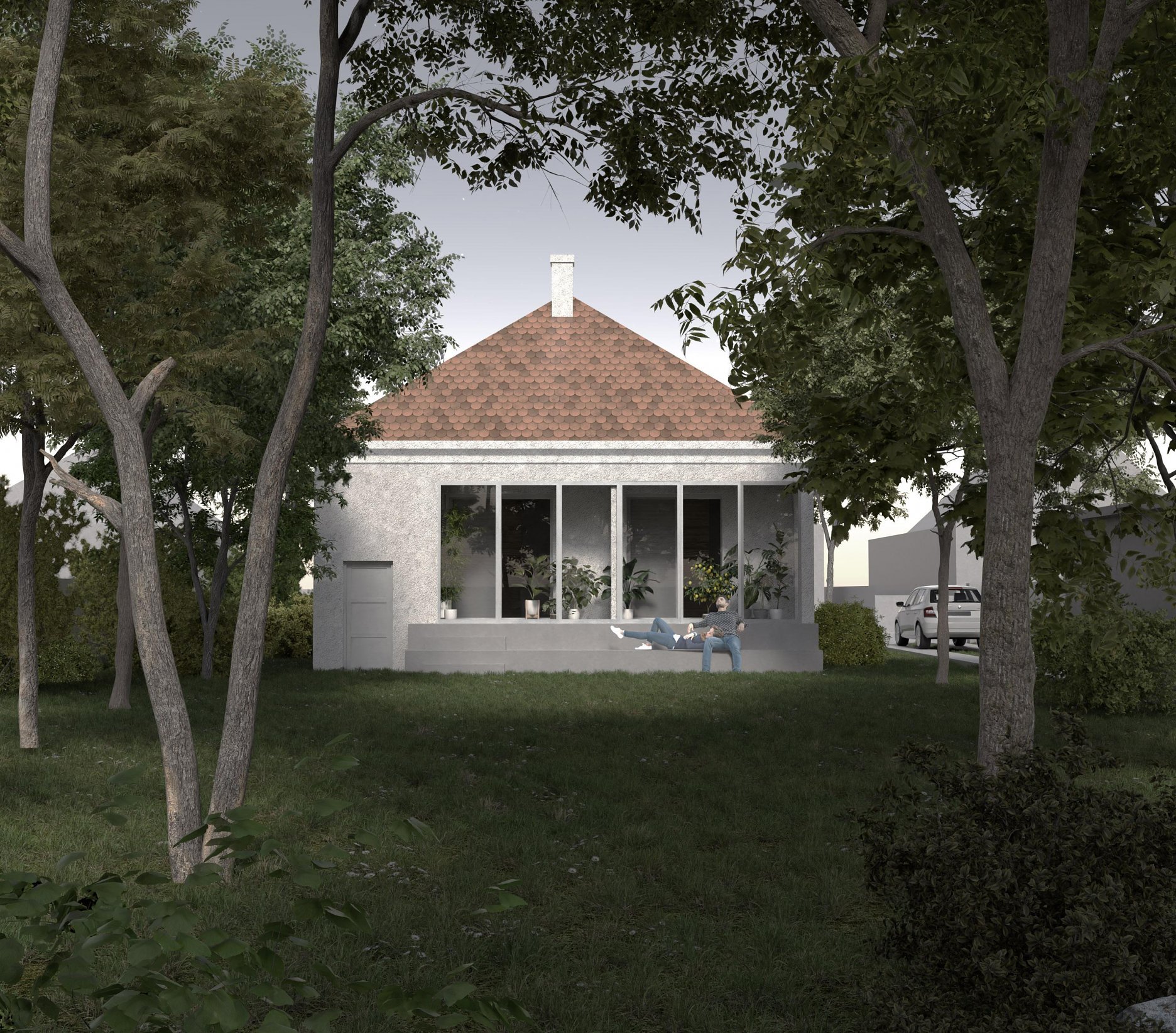 Návrh vyznieva presvedčivo, racionálne a je dobre realizovateľný. Dispozične je riešený konzervatívnym spôsobom a nezasahuje veľmi do pôvodného usporiadania. V kontexte Plánu obnovy a odolnosti tak presúva investície skôr na opatrenia k prvkom ako je zelená strecha (čo má vplyv na chladenie domu). Technicky návrh rieši očakávané náležitosti. Zateplenie domu je navrhované zaujímavo, vytváraním akýchsi ustúpených rohov – „zubov“ a zbiehanými stenami, čo vyznieva citlivejšie ako u iných návrhov. Otvorenie sa domu voči záhrade prostredníctvom gánku na bočnej strane domu však vytvára len minimálne prepojenie obytných častí domu so záhradou.