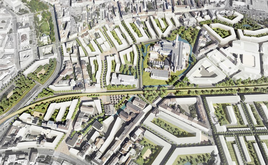 The city is the program. It means the determination of public spaces, their character, and quality. That defines the potential of the environment regarding habitation. The strategy is simple: to work with the urban typology and comprehensible types of urban spaces. We link fragments of the buildings formed in the past in order to create the whole of the city district, which we then connect to the surrounding city by the streets already existing on the borderline of the territory. The new and old is then unified by the scale of the urban structure.