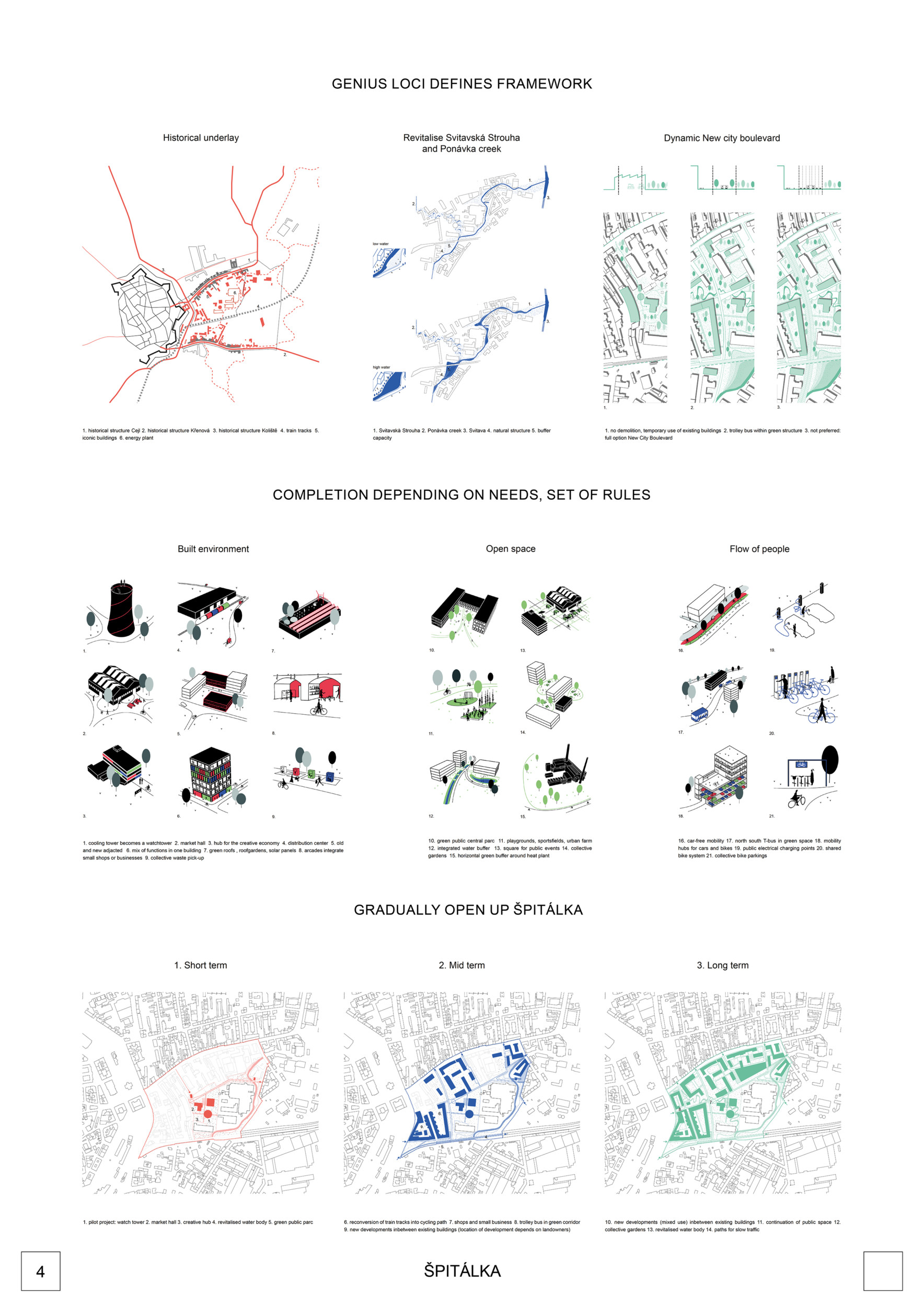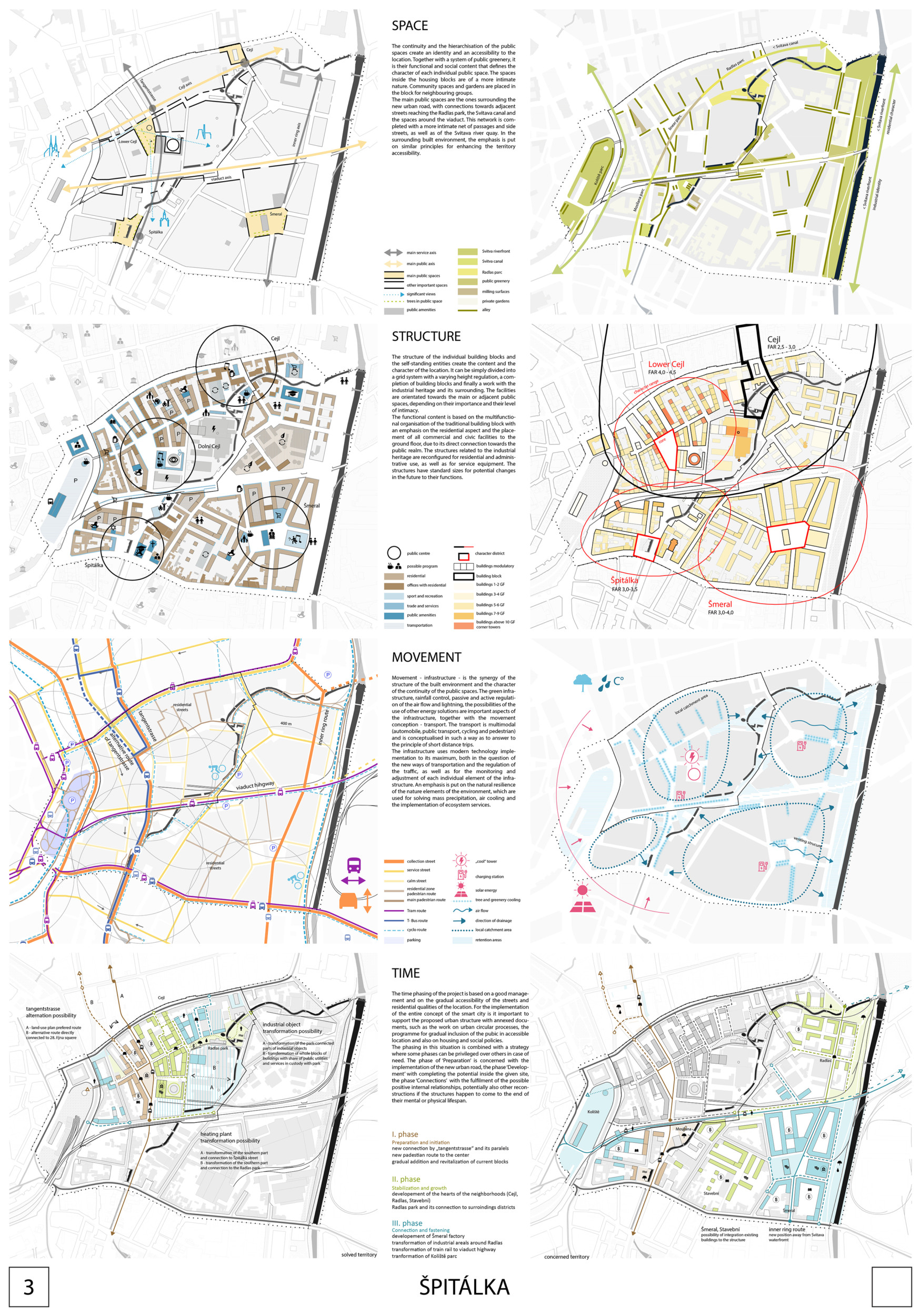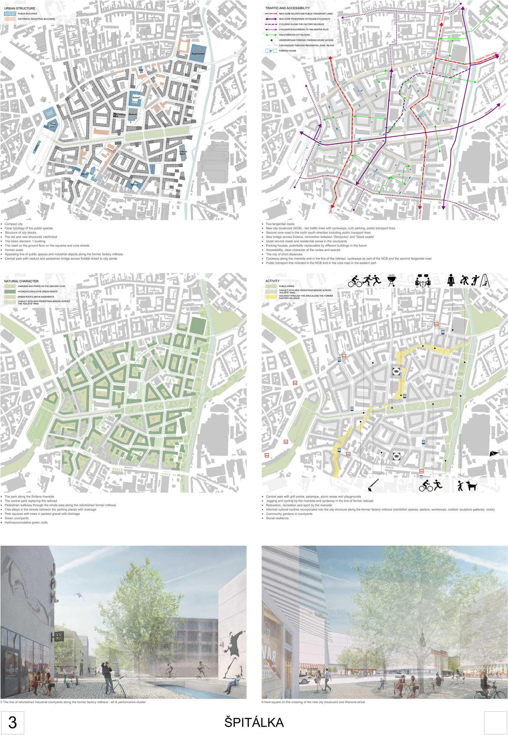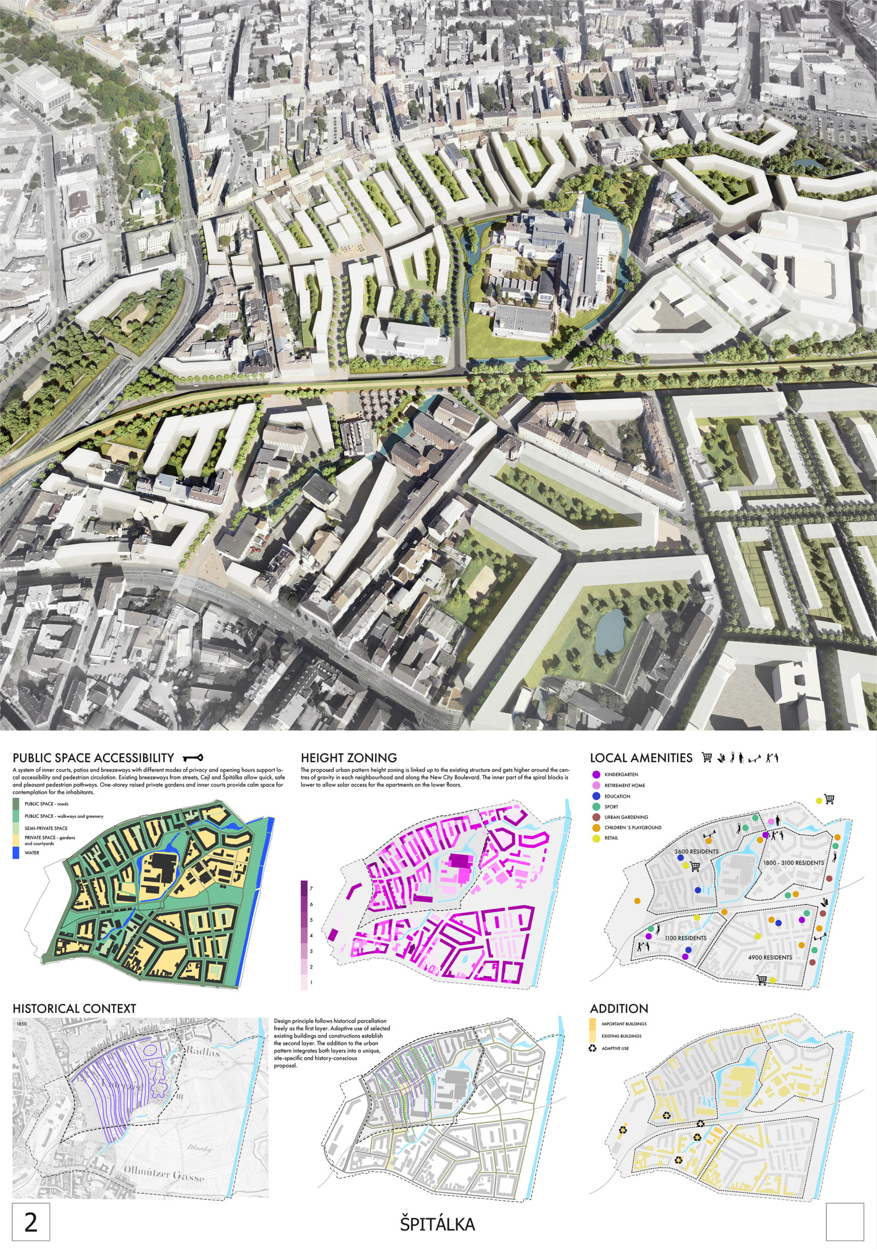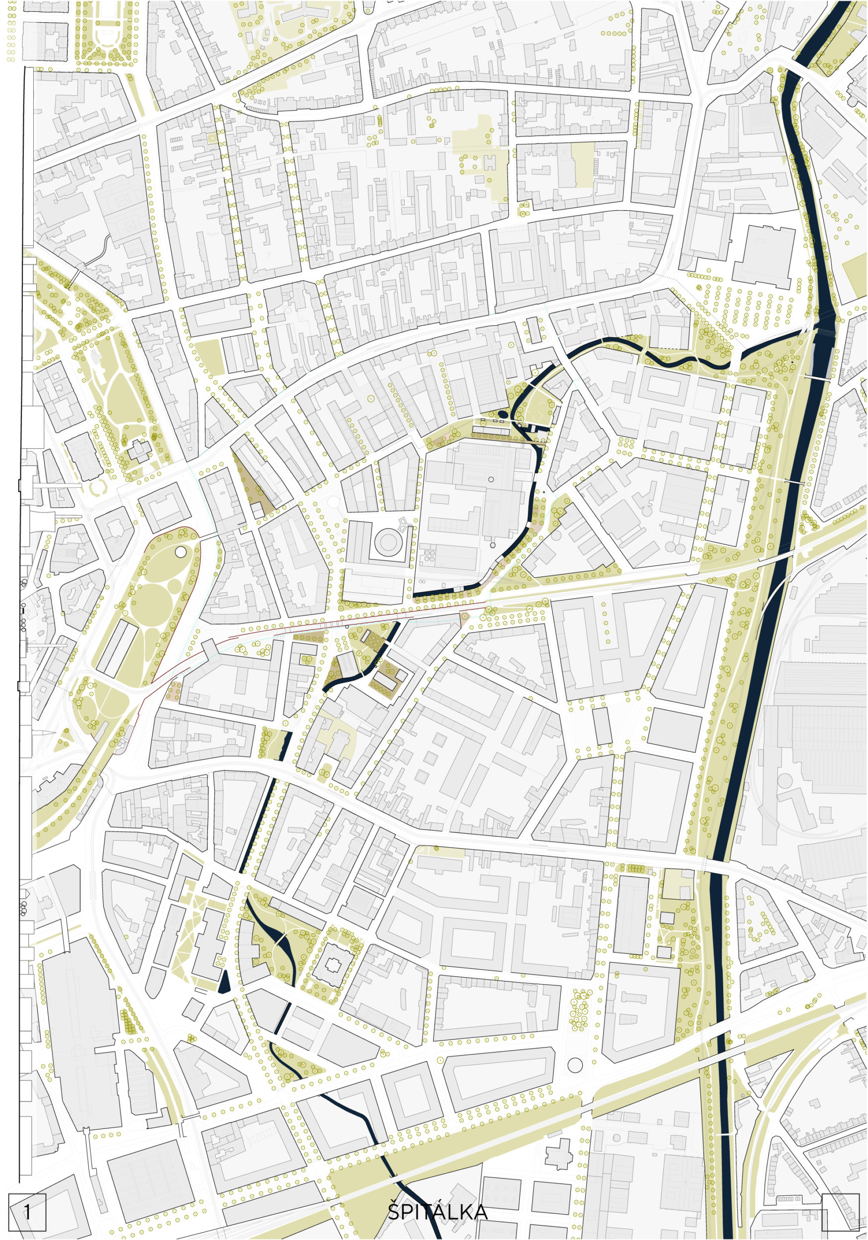 We propose an urban environment that we think has a potential to become a living, safe, sustainable (socially, economically, energy-wise, ecologically) and healthy city quarter. Our spatial concept is derived from a traditional square raster. We respect the historical direction of the division of land, which enables us to preserve quite a lot of existing buildings. We picked a few of the most attractive and valuable of them and made them dominate individual squares, which get formed around them. These are the focal points of development of the quarter and its community life.