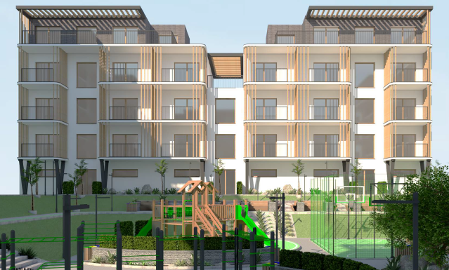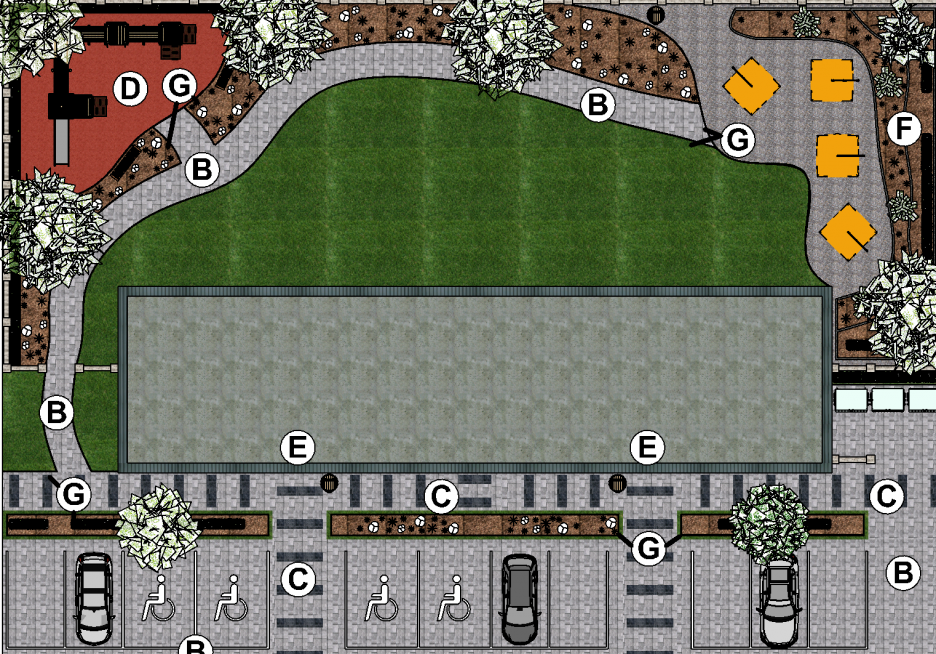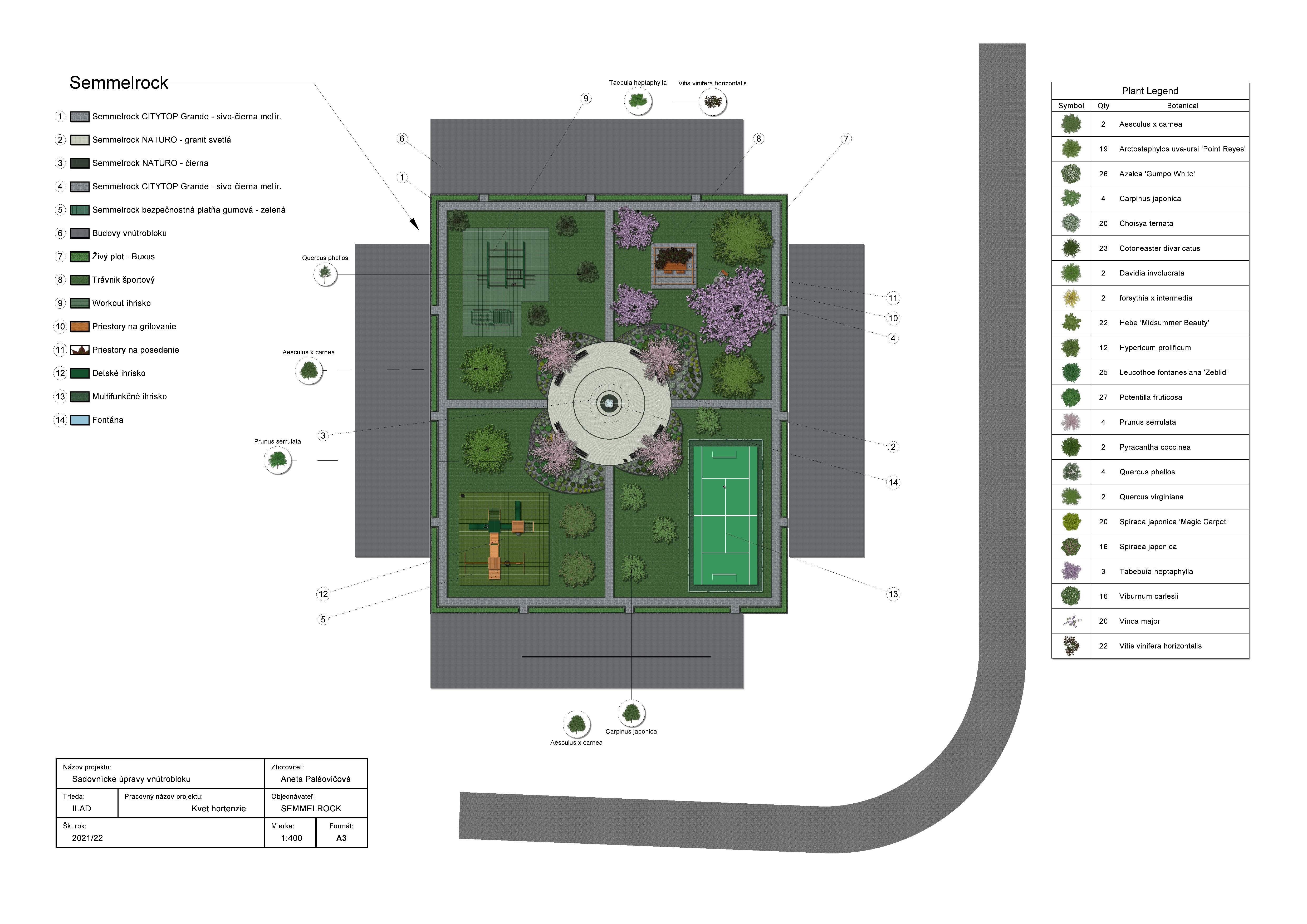 Súčasťou tohto zadania bolo vypracovanie návrhu spevnených plôch vo dvore polyfunkčnej budovy vrátane vyriešenia parkovania, návrhu oddychovej zóny a oplotenia. Zadanie sa podarilo zvládnuť najlepšie Tatiane Jankovskej zo SPŠ Stavebná v Prešove. Autorka použila plotové systémy BELLAMONTE a BRADSTONE MILLDALE, kombináciu dlažieb UMBRIANO, RETTANGO kombi a CITYTOP Smart a ďalšie doplnky, ktoré dotvorili celkový návrh.