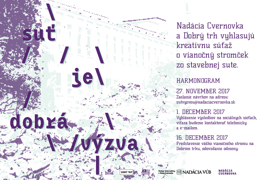 Vyzývajú preto umelcov, architektov, dizajnérov (a kohokoľvek, kto si trúfa), aby navštívili Kreatívne a kultúrne centrum Nová Cvernovka, prešli sa po halde stavebnej sute, zapojili fantáziu a navrhli z nej originálny vianočný stromček, ktorý bude súčasťou vianočného Dobrého trhu v Starej tržnici a okolí. Okrem toho, že prispejú k propagácii myšlienky udržateľnosti a zodpovedného prístupu k odpadom, stanú sa prvými čestnými účastníkmi jedinečného festivalu site-specific umenia a ekológie.