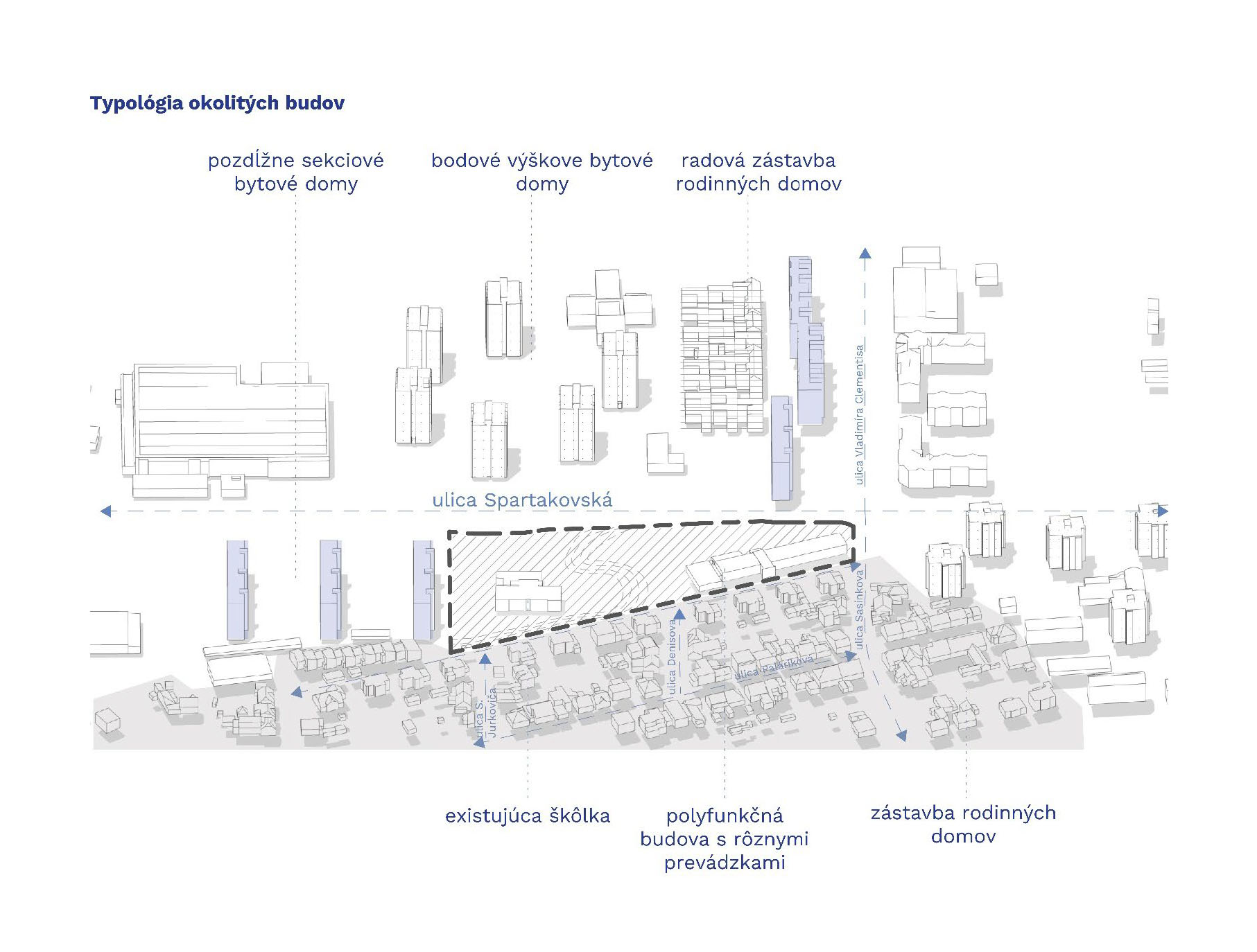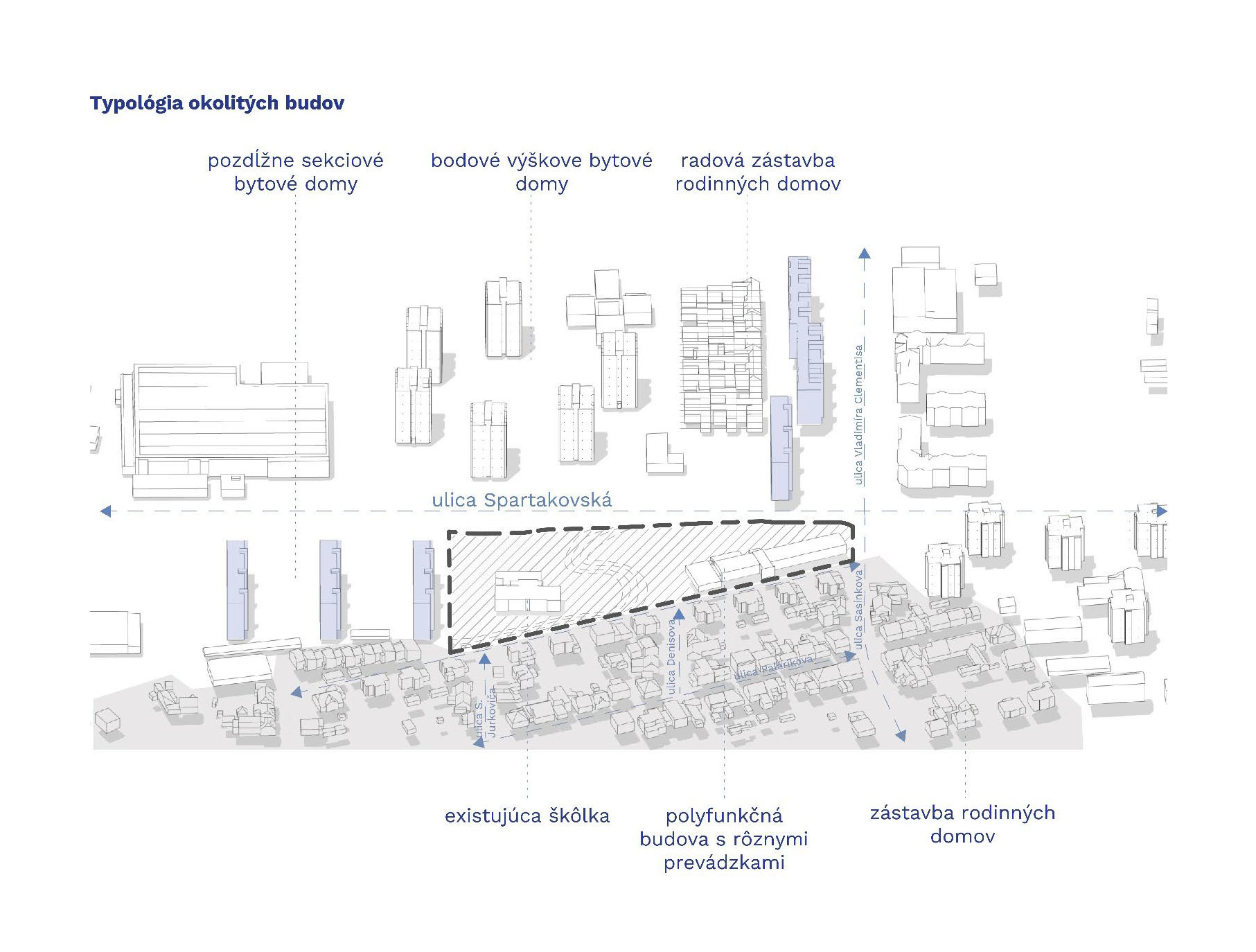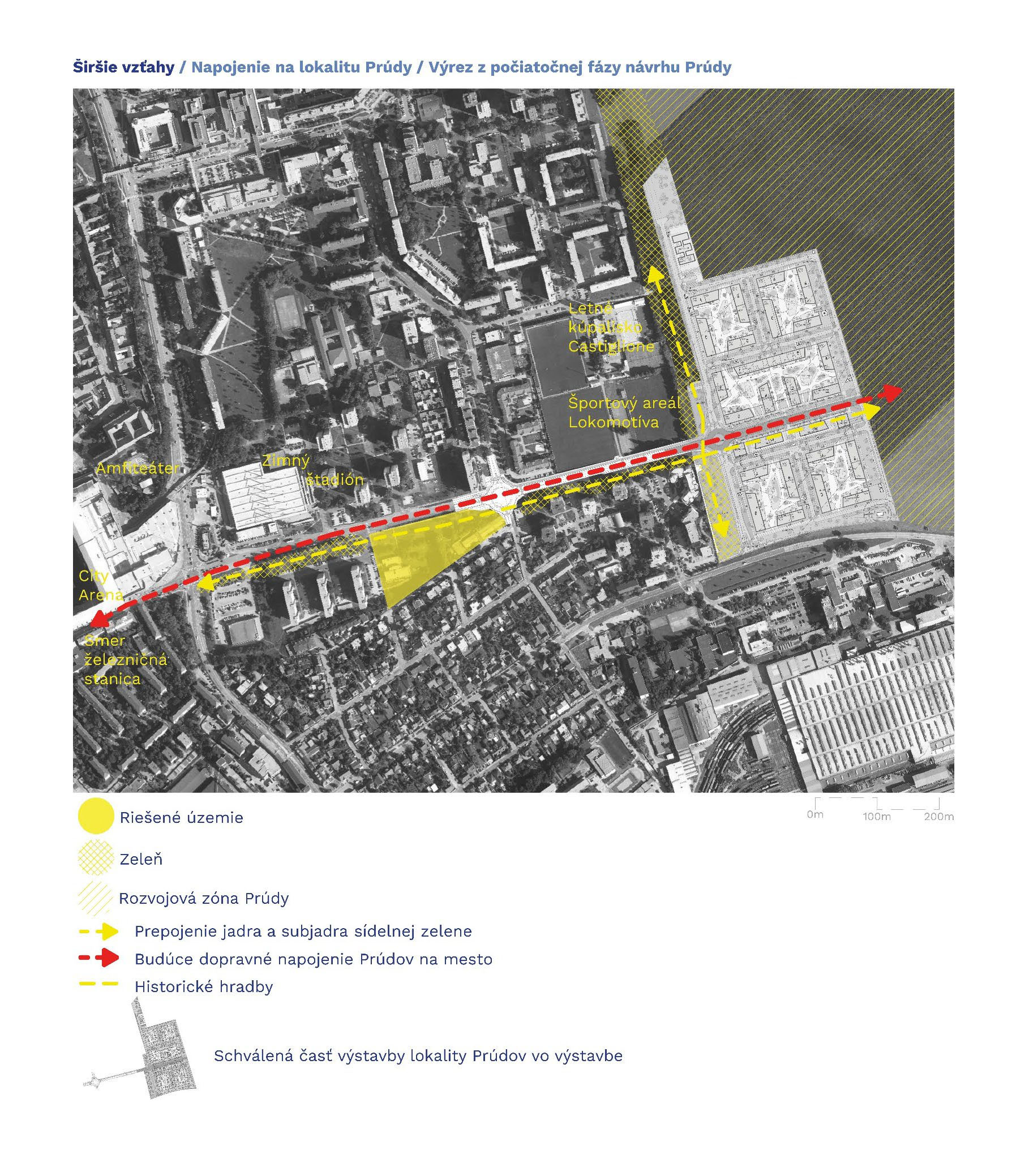 Zámer musí logicky urbanisticky s rešpektom nadviazať na jestvujúcu okolitú zástavbu a plánovaný nadväzujúci bytový komplex Prúdy východne od lokality. Súčasťou bude vybudovanie kvalitných verejných priestorov, prvkov zelenej a modrej infraštruktúry, dopravnej infraštruktúry s dôrazom na udržateľnú mobilitu a technickej infraštruktúry, zohľadňujúcej potreby znižovania uhlíkovej stopy a adaptácie na zmenu klímy.