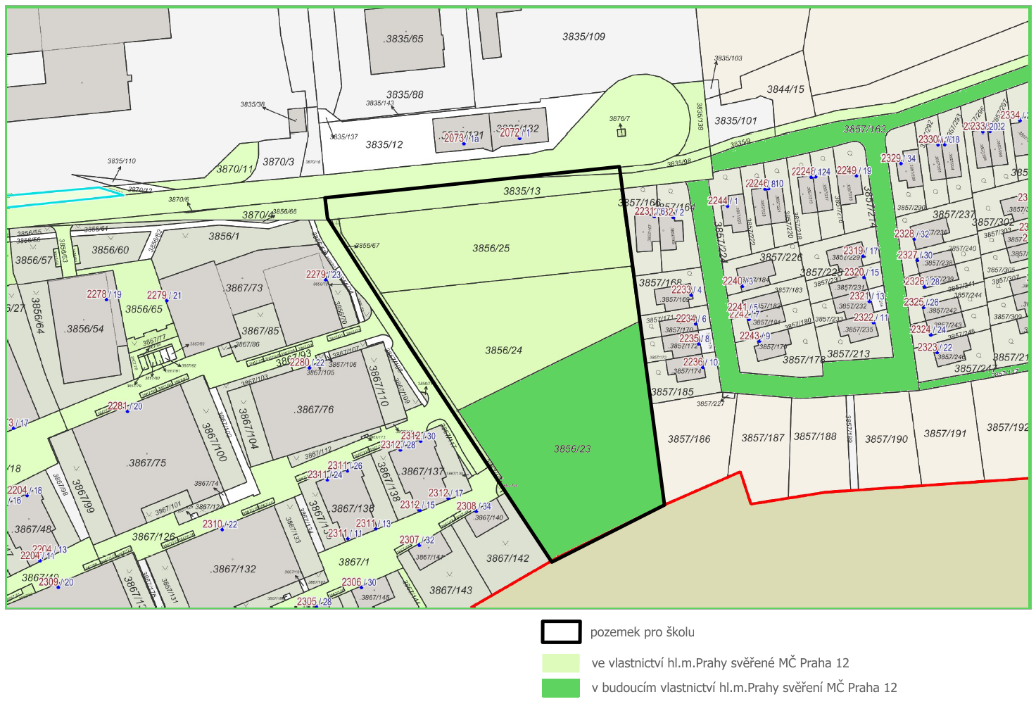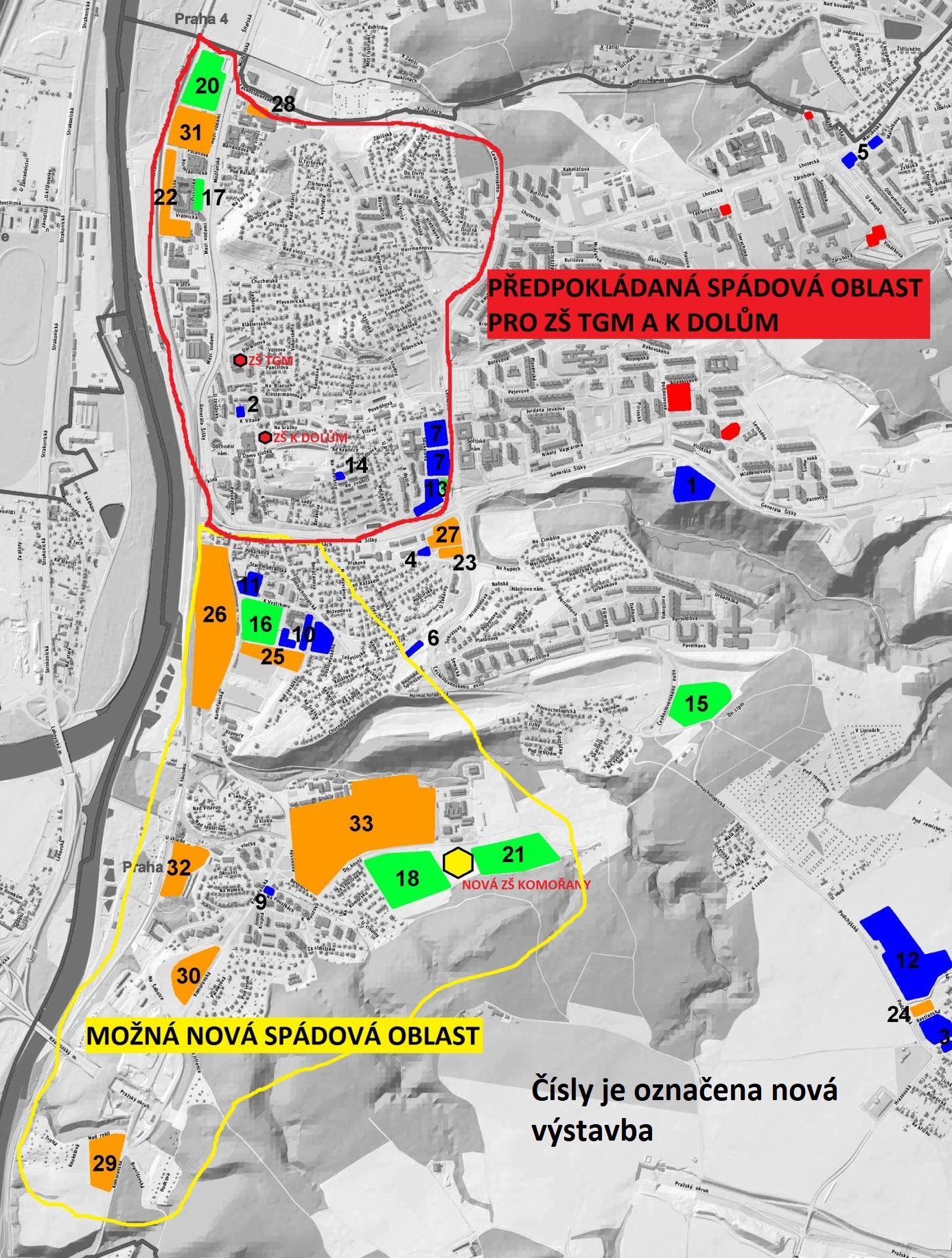 Predmetom súťaže je spracovanie architektonického návrhu novostavby základnej školy v Prahe 12-Komořanoch, ktorá bude slúžiť 840 žiakom prvého a druhého stupňa. Okrem 27 kmeňových tried a ďalších odborných učební zámer počíta s dvoma telocvičňami, školské jedálňou a kuchyňou, družinou a ďalšími nevyhnutnými prevádzkami. Predmet súťaže je možné realizovať na pozemkoch parc. č. 3856/25, 3856/24, 3856/23, 3835/13, všetko v k. ú. Modřany, priliehajúcich k ulici do kúta, Praha 12.