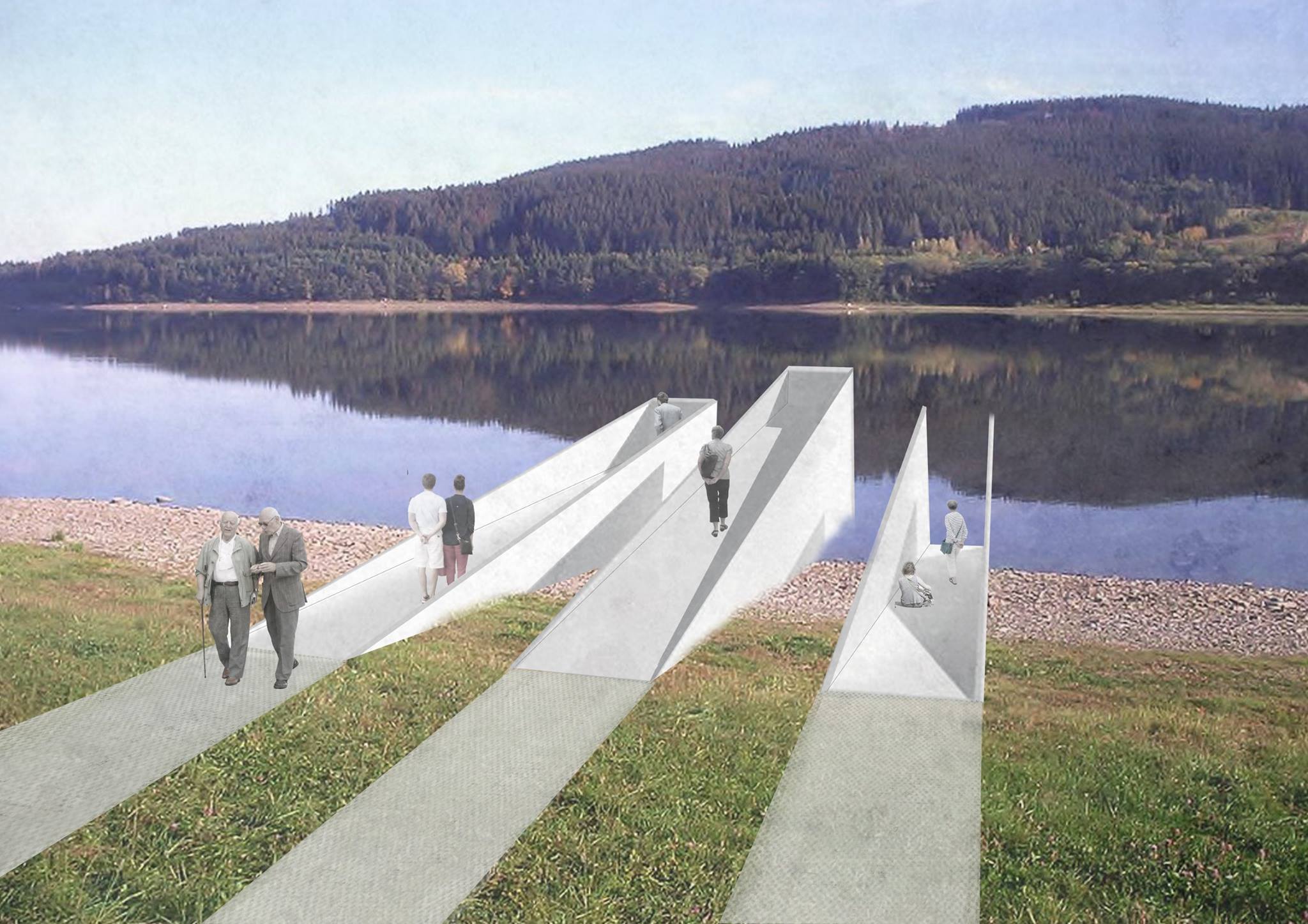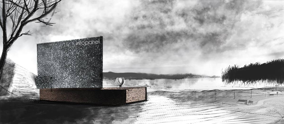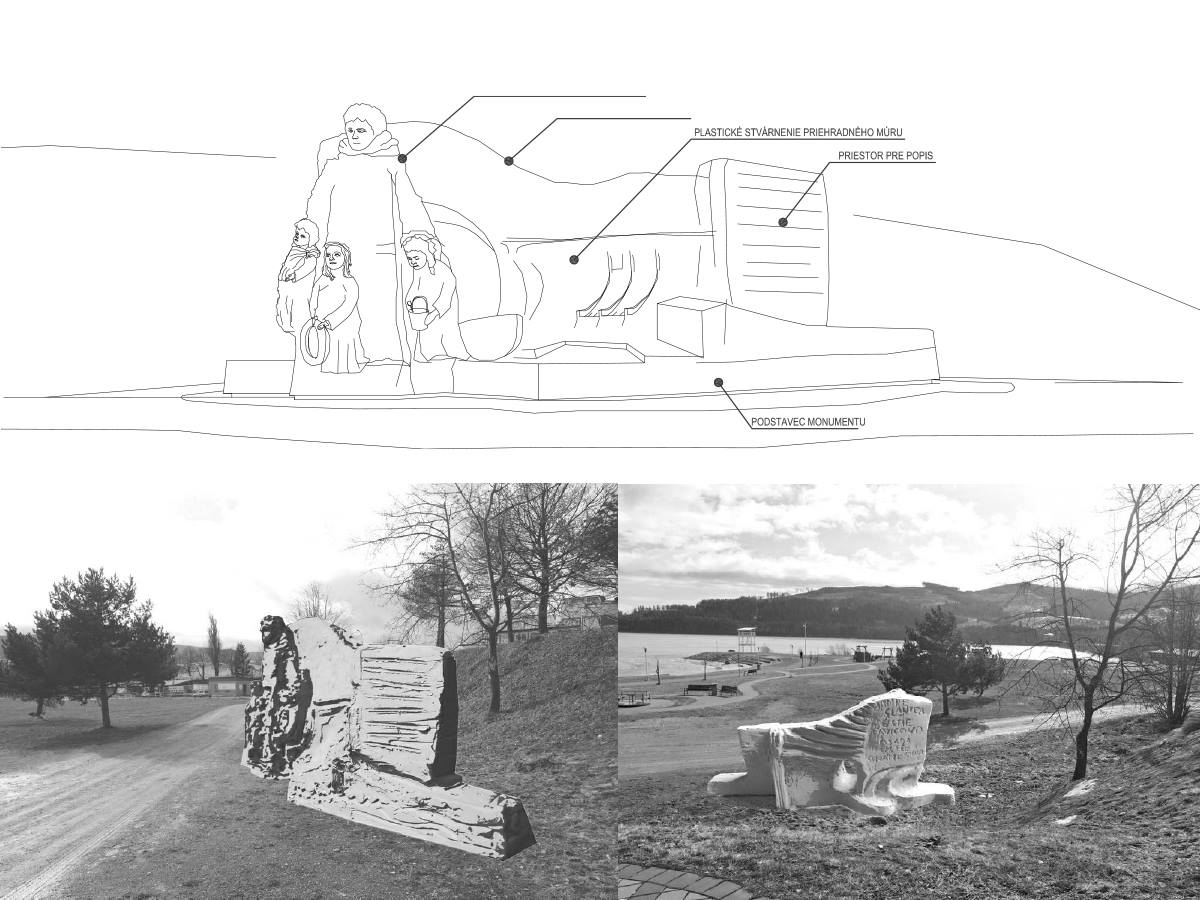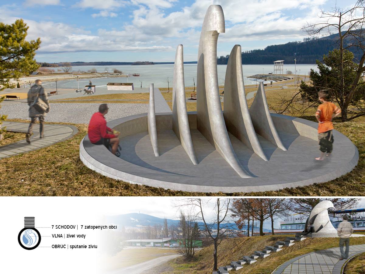 Obnovenie myšlienky pamätníka, ako pietného, spomienkového miesta je dobrou ideou, ktorá môže celú lokalitu Oravskej priehrady obohatiť o nový kultúrny impulz. Po dlhej úvahe nad koncepciou pamätníka sa dospelo k tomu, že zadaná lokalita nie je vhodná, dostatočne pietna, i preto je v koncepte navrhnuté hľadanie vhodnejšej lokality pre pamätník so svojimi náležitými a zadanými funkciami. Oravská priehrada poskytuje niekoľko tichým miest, vhodnejších pre lokalizáciu pamätníka, či už samotného diela alebo objektu s tichou prezentáciou. Navrhujeme preto zadanú lokalitu nábrežia kultivovať a pridať jej význam 'miesta prvého kontaktu', osadiť pozinkovaný info panel s informáciami o výstavbe vodného diela, či grafickou a textovou dokumentáciou k zatopeným dedinám. Jeho okolie doplníme sedením, prevedeným v žule ( lámaný a leštený kameň ), s celkovou rekonštrukciou okolia, teda povrchov prístupových ciest, či výsadbou trvácnej zelene. Samozrejmosťou je doplnenie košov a ostatnej vybavenosti “ mestského interiéru “, lampy a pod.