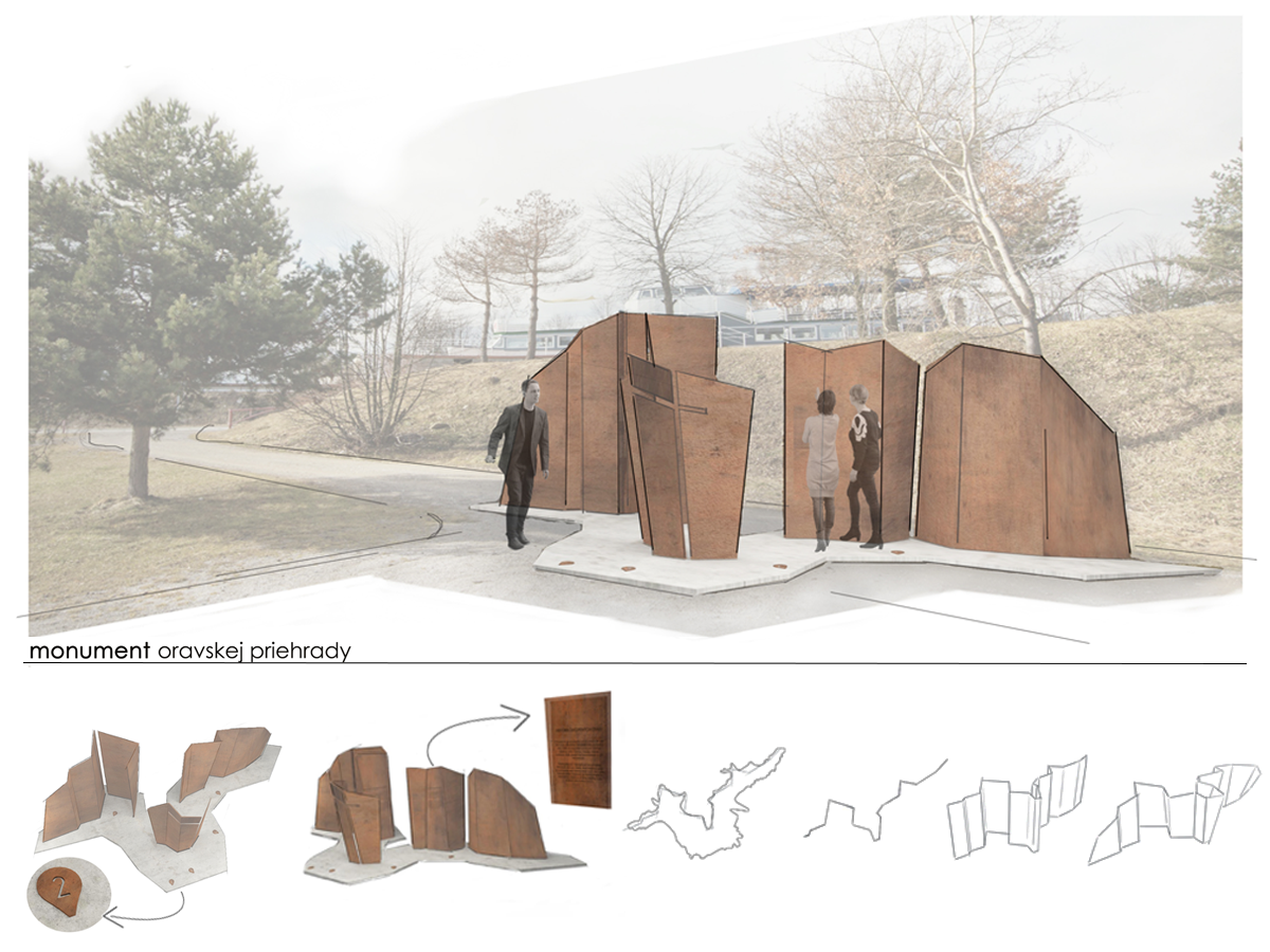 Dve ďalšie časti ponúkajú priestor na osadenie textových a grafických informácií o technických parametroch priehrady, možnostiach rekreácií, ako aj na informácie o zatopených osadách. Vizuál sme navrhovali s citom pre okolité prostredie, v kontexte s hornatou oravskou prírodou, čo odráža vizuálne tvarovanie a taktiež použitý materiál. Corten je materiál, ktorý svoju farbu mení časom, až do takého vzhľadu kedy sa monument zlúči s krajinou dohromady.