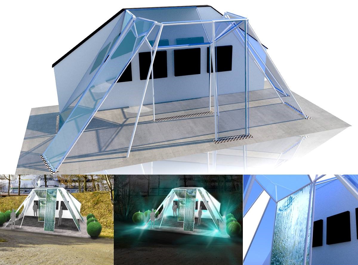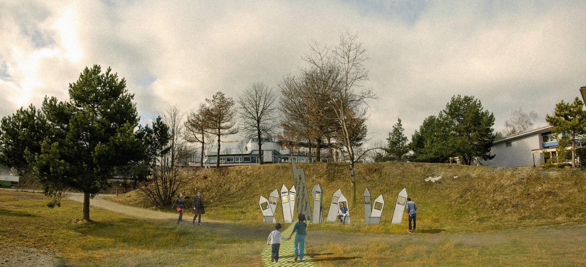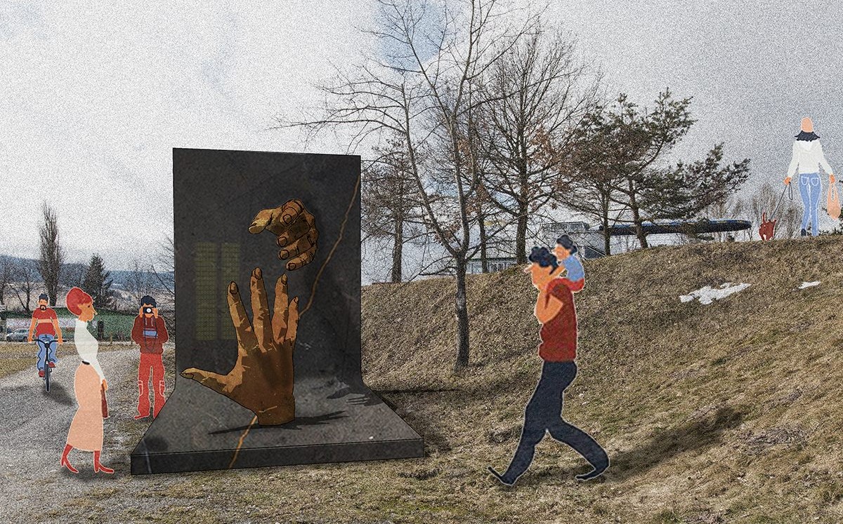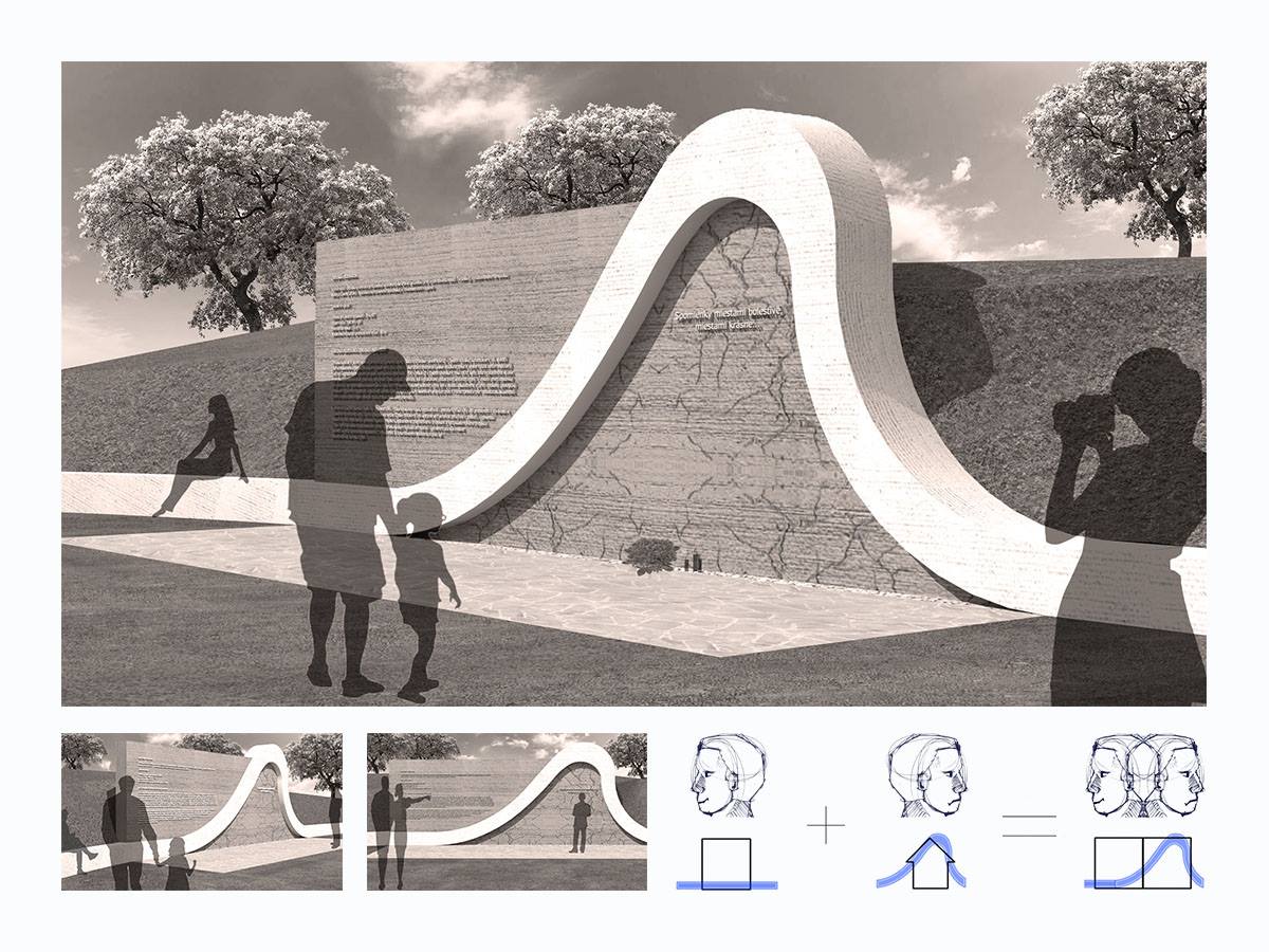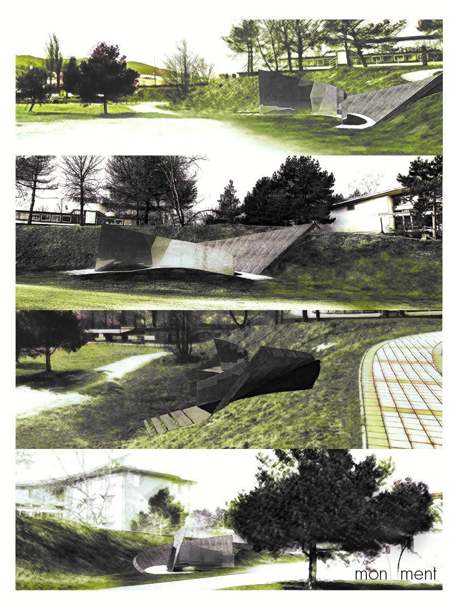 Návrh sa skladá z dvoch častí, pričom každá z nich stvárňuje iný jav, no napriek tomu dokopy vytvárajú celok založený na interaktivite a reflexii použitého materiálu. Objekt je zasadený priamo do terénu a stáva sa jeho súčasťou, no zároveň sa rozrastá do priestoru čím na diváka pôsobí dynamicky. Pozorovateľ sa dostáva priamo do kontaktu s monumentom pri vstupe do samotného objektu, kde má možnosť nazrieť do fiktívneho priestoru vytvoreného pomocou odrazu nerezového plechu. Tento moment je umocnený tým, že priestor je obojstranne ohraničený, čo dodáva pocit väčšej intimity z celého dojmu v súvislosti s vnímaním informácii. Objekt je mnoho pohľadový a nech stoji divák kdekoľvek, z každého pohľadu naňho bude pôsobiť inak. Môže v ňom vidieť stavbu priehradného múru, pietne miesto, padajúcu vlnu, alebo taktiež otvárajúcu sa cestu k zabudnutým spomienkam.
