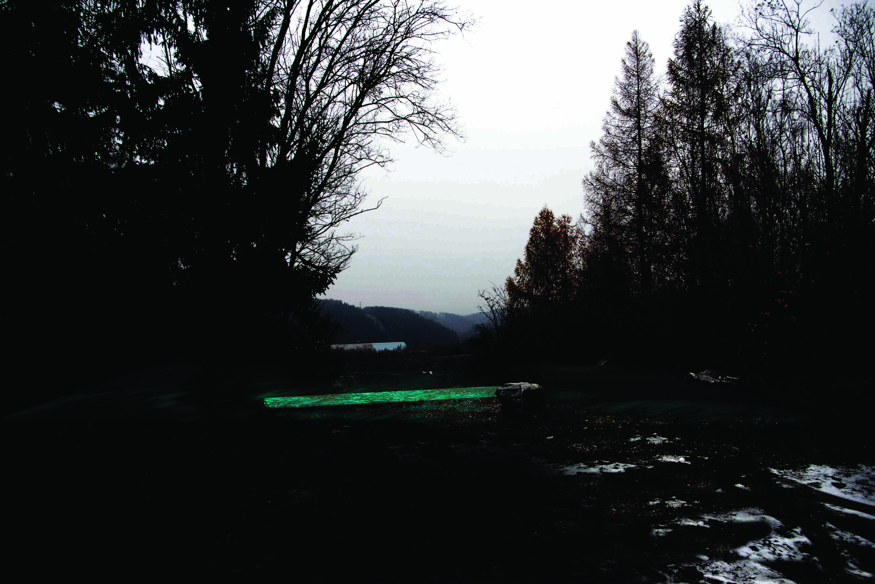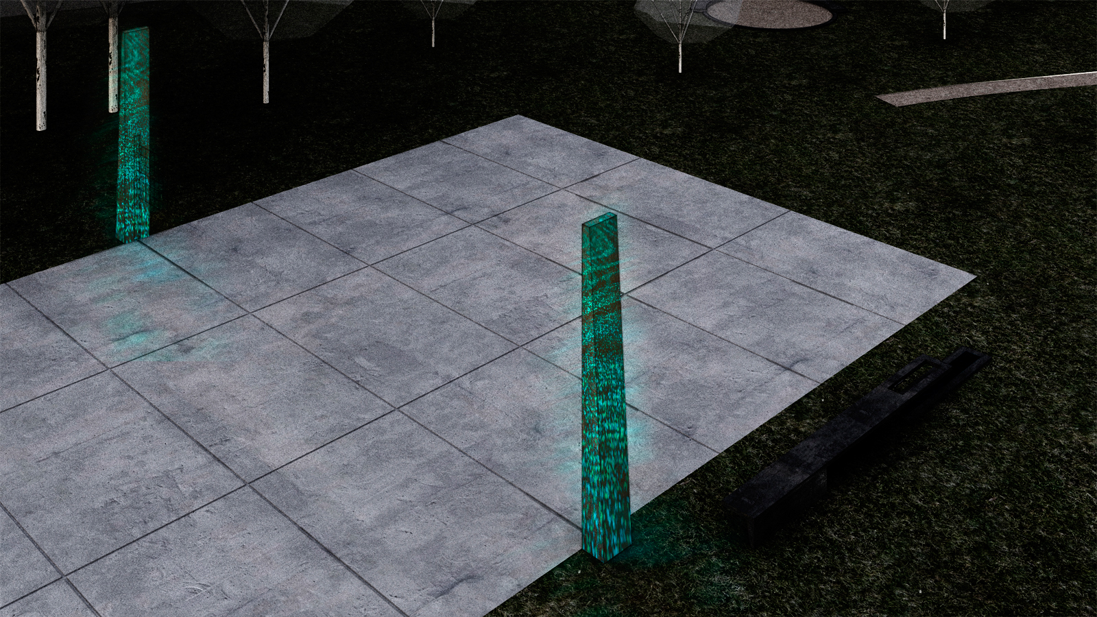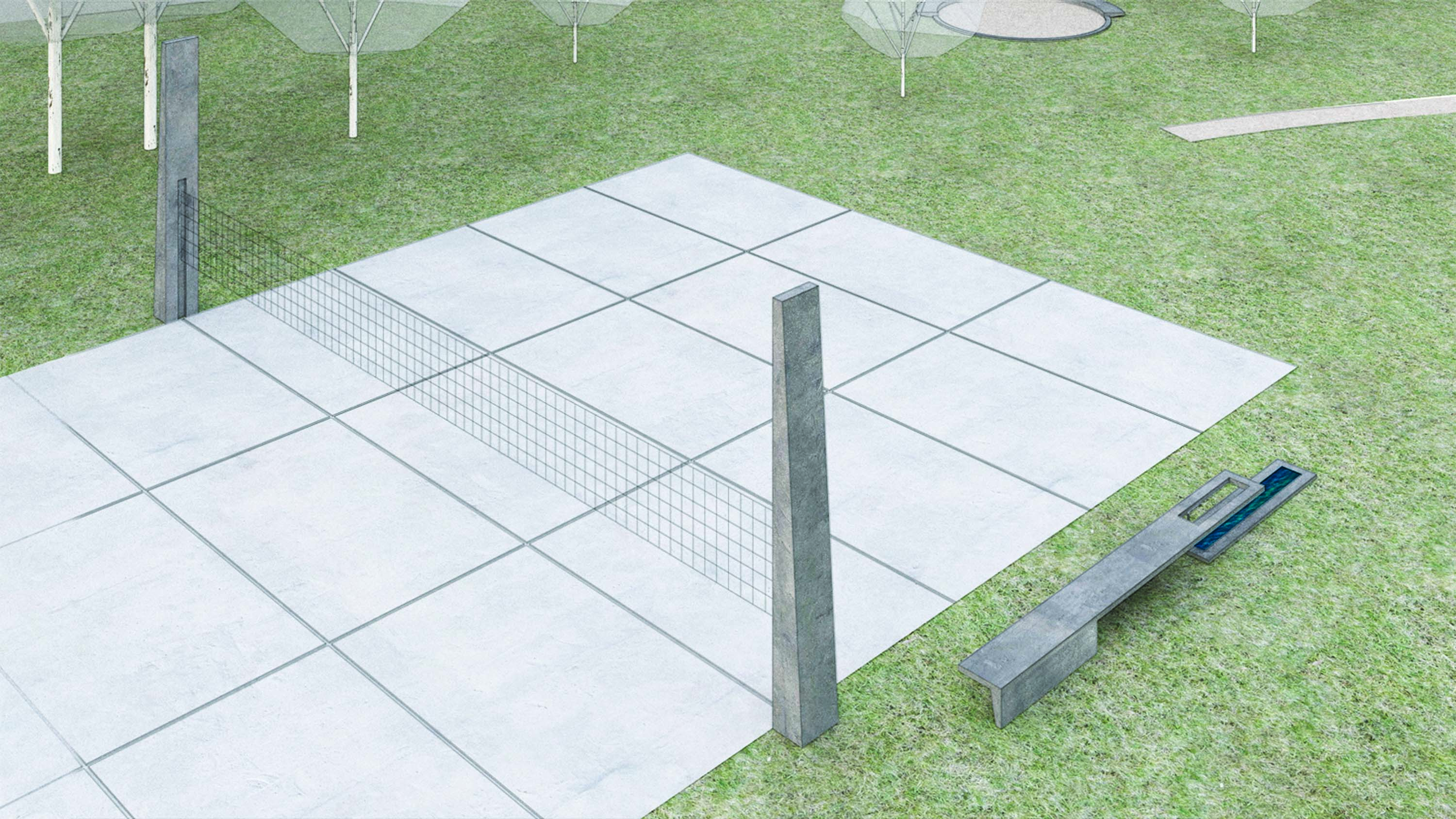 „Starou betonovou plochu mezi panelovou zástavbou se zelení, u které ústí cesta od Vápenného Podolu, doplňujeme dvěma sloupy jako pomyslnou bránu. Do jejich niky je možné upevnit síť v různých výškách pro sportovní aktivity. V noci betonové sloupy tlumeně září, fosforeskují. U této plochy situujeme delší lavičku s pítkem a žlabem v zemi pro odpočinek po hře i hru samotnou."