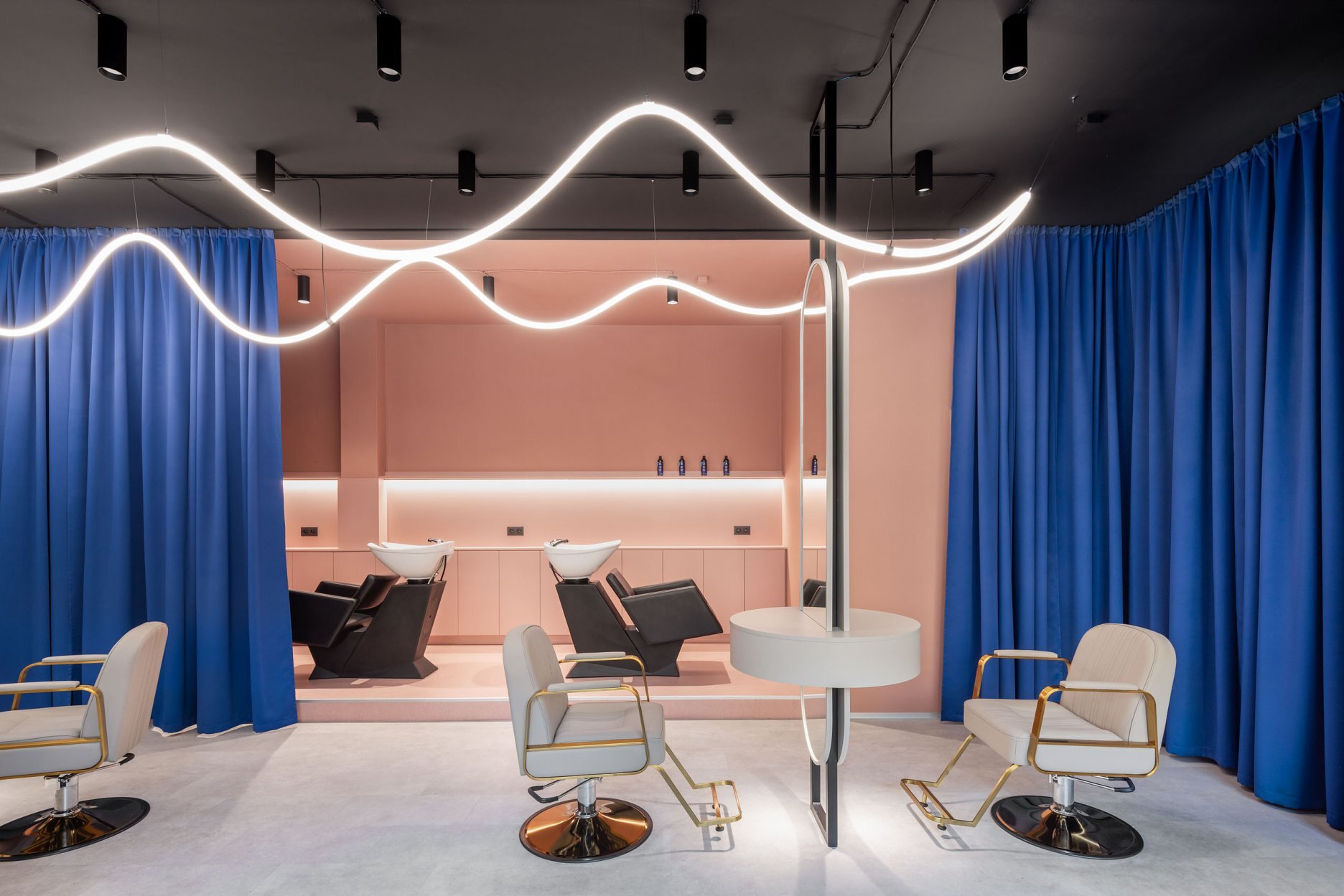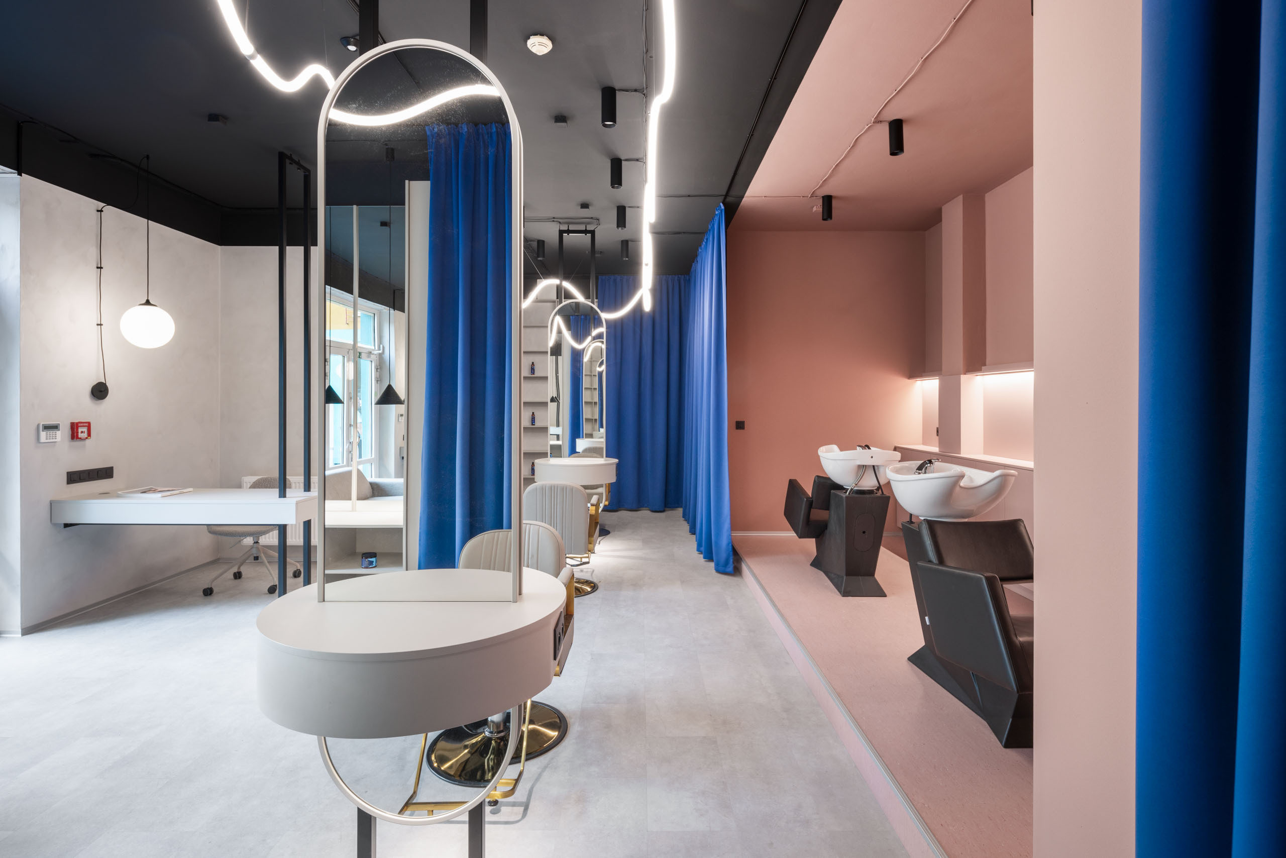 Kľúčové dizajnové prvky, ako zakrivená lampa a odvážne farebné kontrasty kráľovskej modrej a svetloružovej, definovali priestor. Ťažké závesy a ľahké kožené stoličky dopĺňali estetiku. Závesy boli použité na zónovanie priestoru, čo poskytlo flexibilitu a pocit priestrannosti. Materiály boli zvolené s ohľadom na udržateľnosť, pričom textilné steny a jediné zdroje osvetlenia prispeli k minimalistickému, no pôsobivému dizajnu.