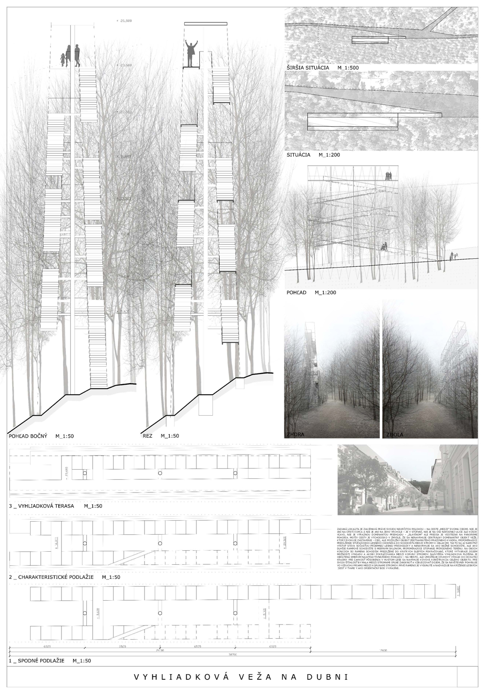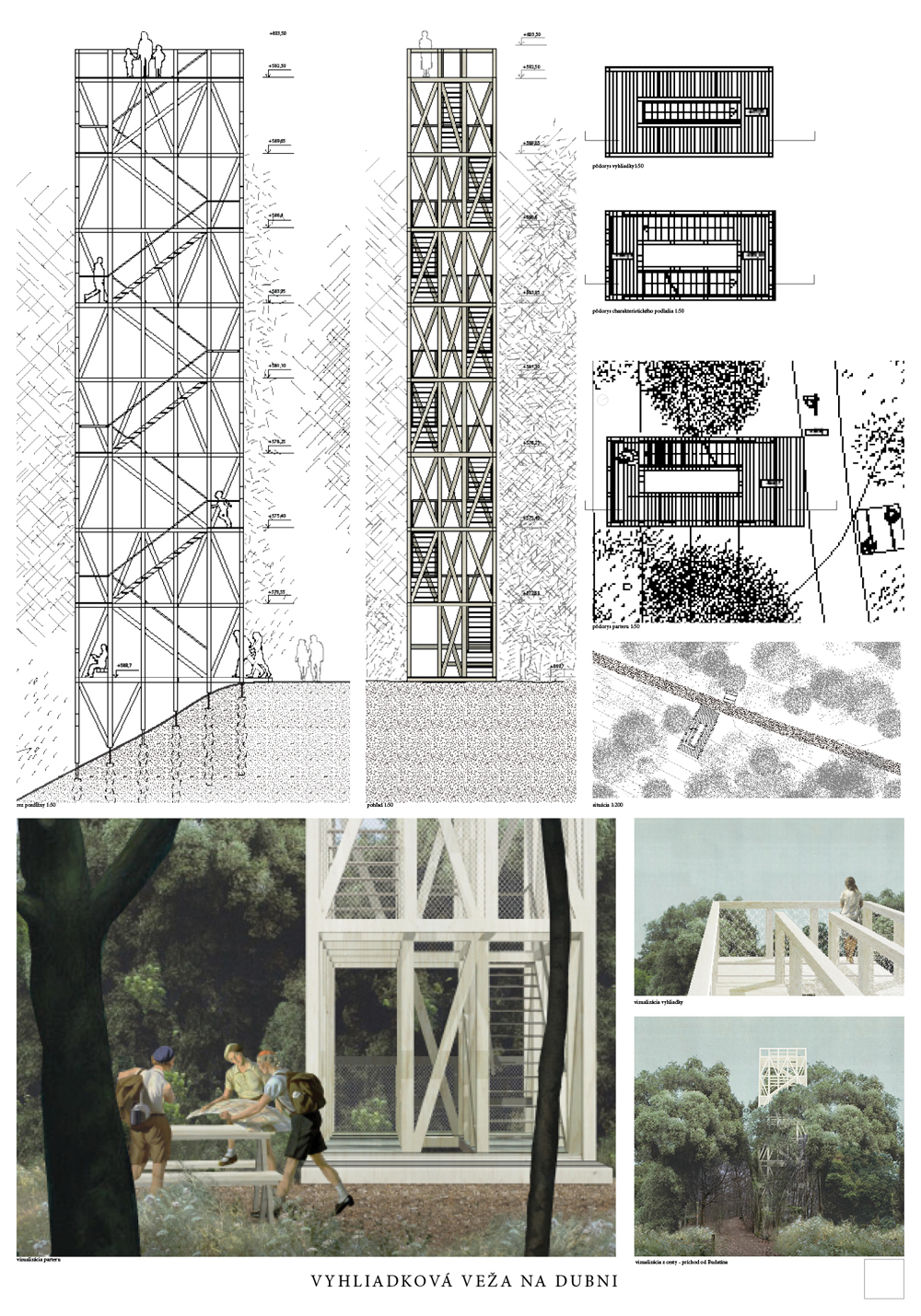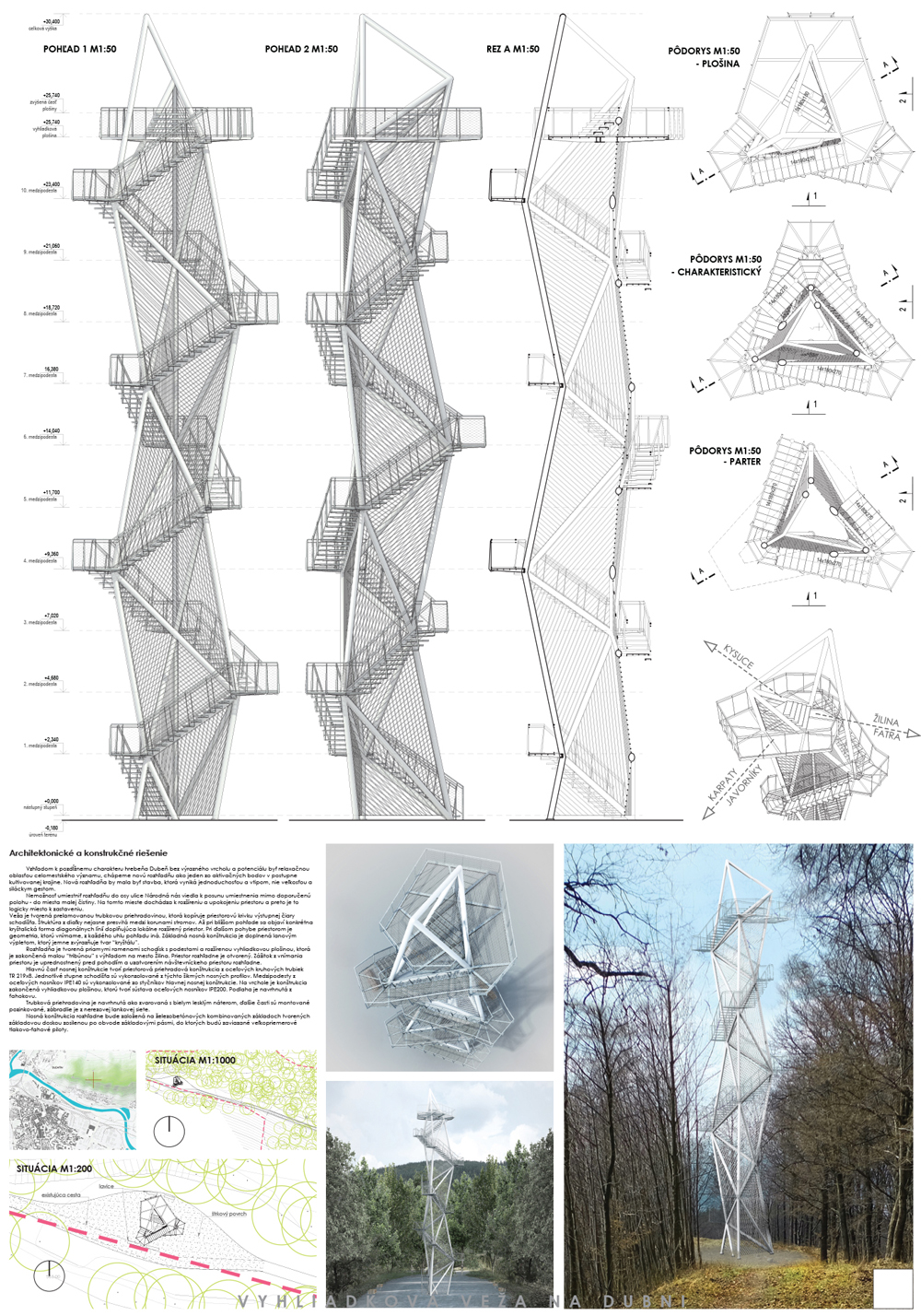 Vyhliadková veža je hravou kompozíciou oceľovej konštrukcie s vonkajším vejárovým schodiskom. Použitá je výplň plášťa, akási košieľka z oceľových laniek. Schodisko je priznané, konštrukčne oceľové s podlahou z pororoštu. Tento tvrdý materiál vytvára poetickú kompozíciu v prírodnom prostredí. Návrh je realizovateľný, spĺňa finančný limit na vyhotovenie. Nedostatkom sa javí neriešený priestor nástupu na vežu.