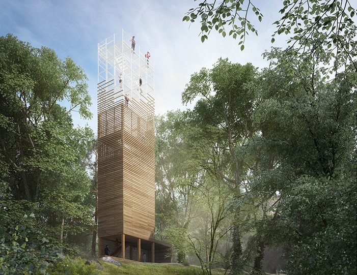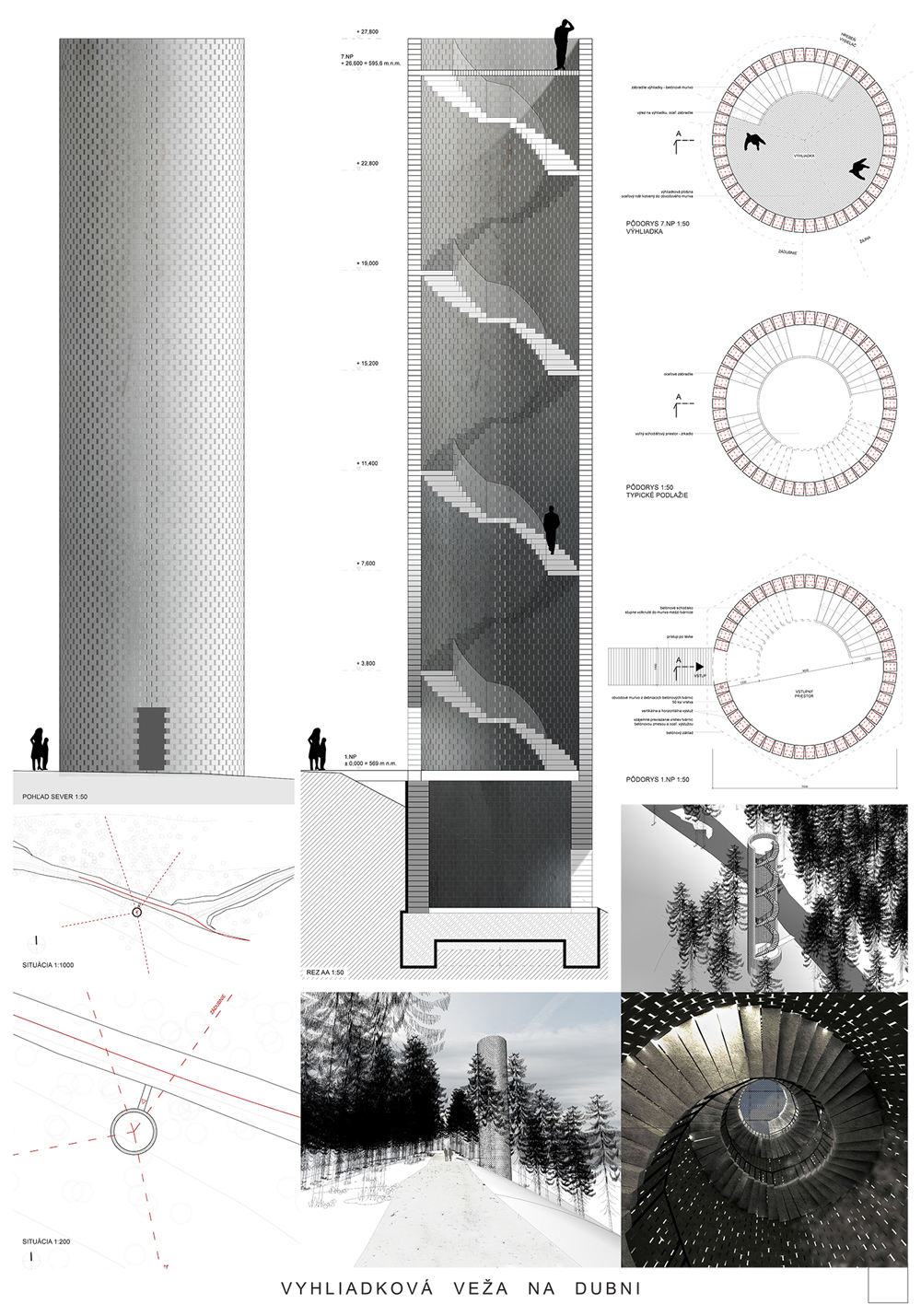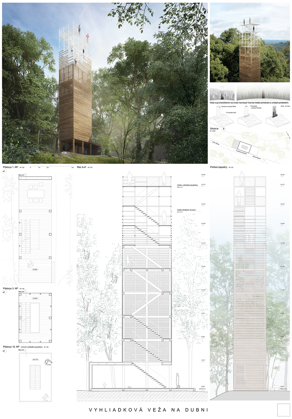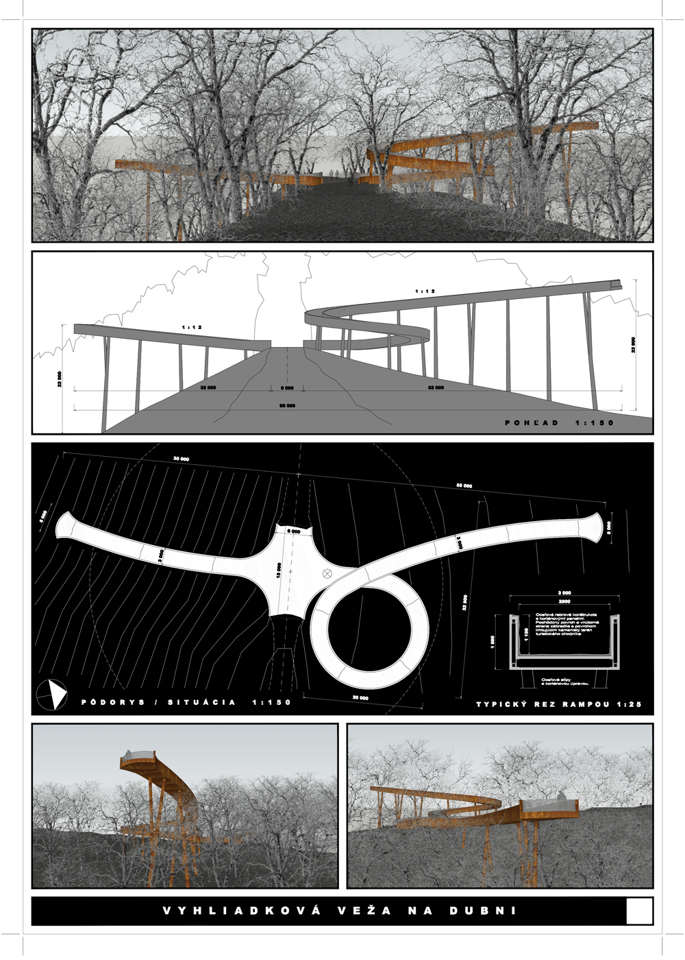 Vyhliadková veža je hravou kompozíciou oceľovej konštrukcie s vonkajším vejárovým schodiskom. Použitá je výplň plášťa, akási košieľka z oceľových laniek. Schodisko je priznané, konštrukčne oceľové s podlahou z pororoštu. Tento tvrdý materiál vytvára poetickú kompozíciu v prírodnom prostredí. Návrh je realizovateľný, spĺňa finančný limit na vyhotovenie. Nedostatkom sa javí neriešený priestor nástupu na vežu.