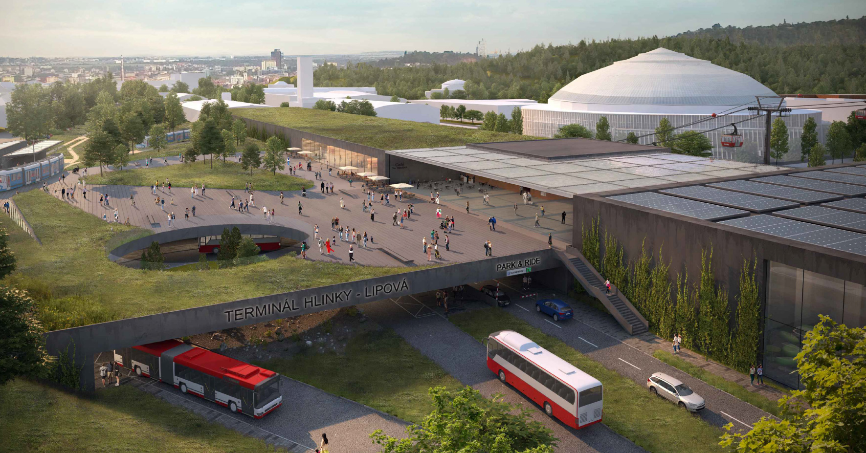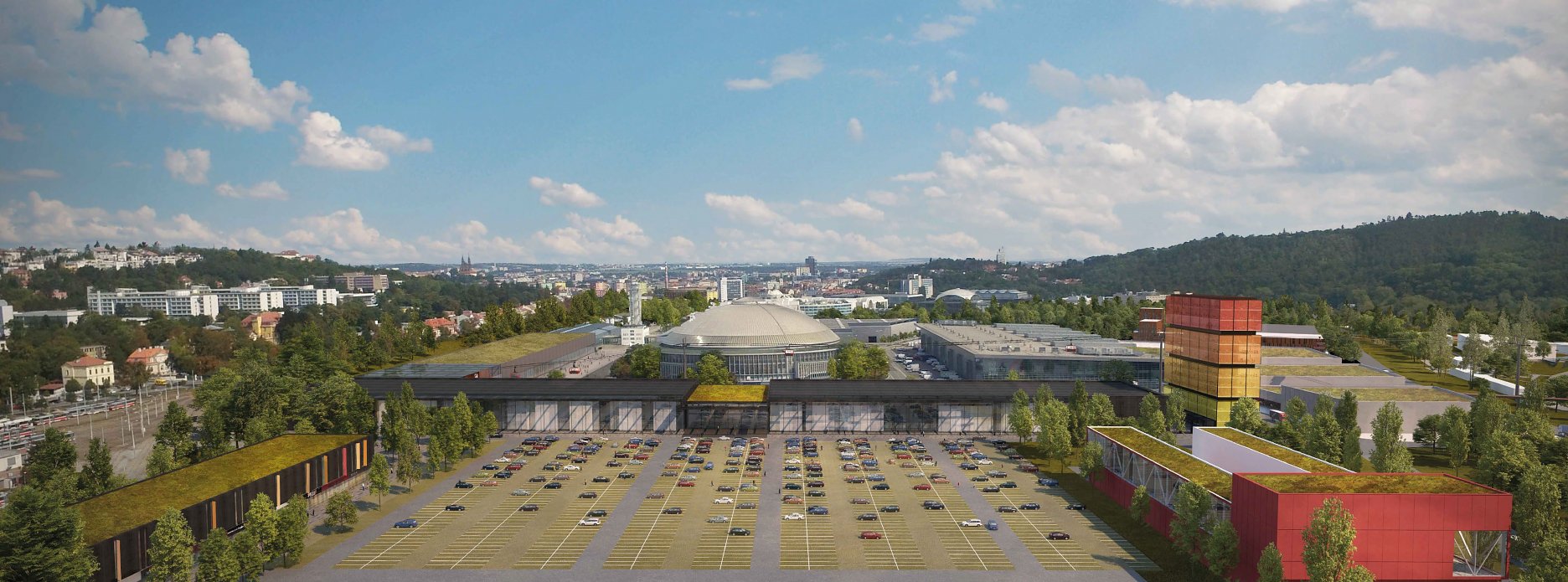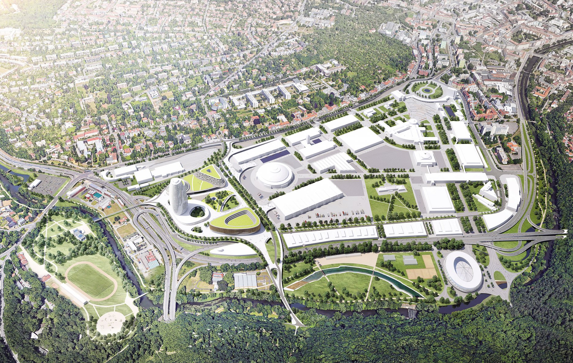Krátky popis návrhu: Zapojení areálu Výstaviště do organismu města. Otevření nového veřejného prostoru - zpřístupnění historické části areálu veřejnosti (využití památkově chráněných původních pavilonů). Posílení urbanistických a architektonických hodnot areálu - prodloužení historických pěších a kompozičních os - zajišťuje prostupnost území a vytváří nové dominanty. Bezbariérové propojení města s rekreační zónou - areál Riviéra, park Antropos a lesopark Červený kopec. Posílení výstavní funkce areálu - nové pavilony, vstupní terminály, provozní zázemí - variabilní využití.