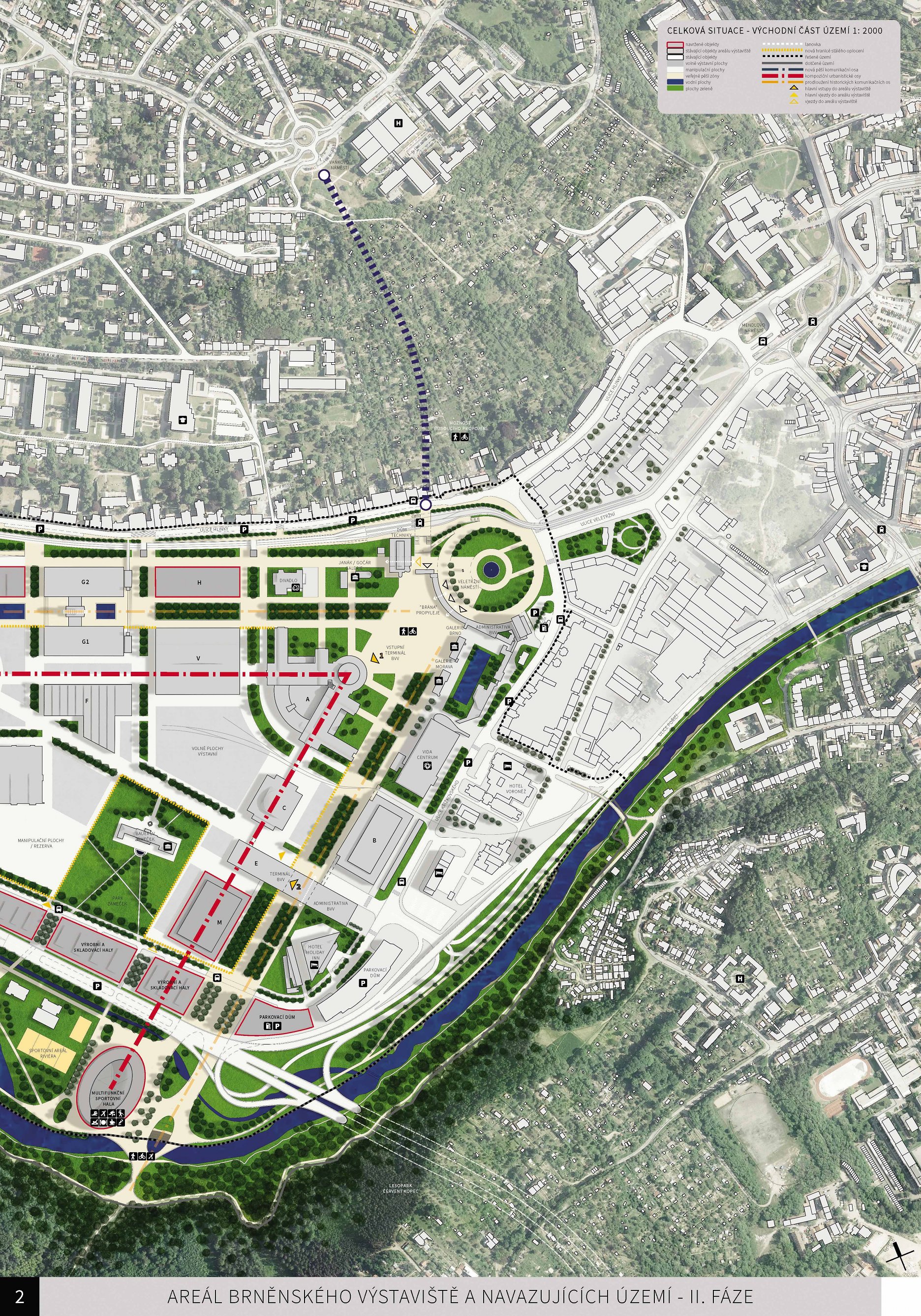 Hodnotenie poroty v II. fáze súťaže: Urbanistická struktura odpovídá místu, měřítko vychází z velikosti stávajících objektů. Beze změny jsou zachovány všechny kompoziční osy. Plocha kolem zámečku je navržena jako rozsáhlý park s výstavním náměstím. Západní část území je z hlediska výstavnictví problematicky obsloužitelná. Umístění skladovacích a výrobních ploch je pro výstavní účely nevyhovující, před pavilonem P chybí rozptylová plocha, která je pro účely výstavnictví potřebná. Zavedení MHD je považováno za pozitivní přínos. Napojení navržené tramvajové tratě na ulici Hlinky a Veletržní je však v dané městské struktuře obtížně realizovatelné. Je vhodné zvážit nahrazení jinou formou MHD (autobus, trolejbus). Variabilita rozsahu areálu ve východní části je z hlediska BVV problematická. Jižní strana zástavby území vytváří blokovou strukturu, její dopravní napojení na VMO v naznačeném rozsahu není možné. Předpokládaný provoz navržené městské ulice v západní části by mohl být v kolizi s hlavními zásobovacími trasami BVV. Památkově chráněné objekty jsou respektovány ve stávající podobě. Stávající hlavní vstup může vložením nového objektu bytového domu ztratit část své hodnoty. Nový vstup v západní části nevytváří reprezentativní předpolí areálu BVV. Rozšířením vozovny se návrh nezabývá. Plochy rekreace podél Svratky zůstávají beze změny. Stanice HZS je přimknuta k vozovně, z dopravního hlediska není její napojení na VMO ideální.
