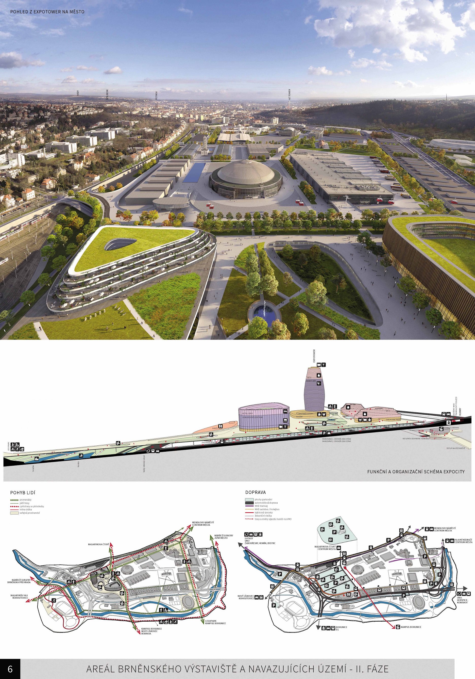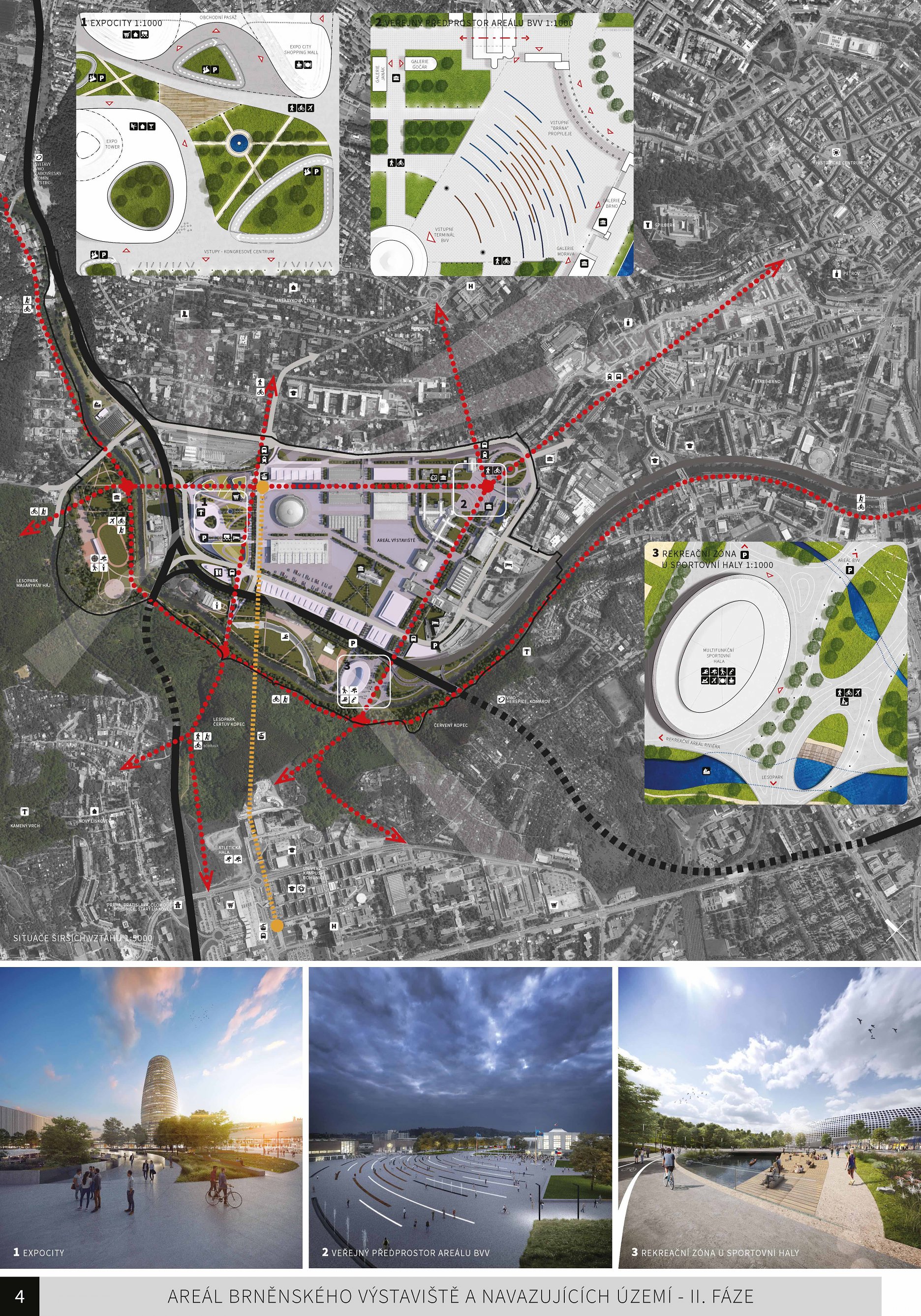 Hodnotenie poroty v II. fáze súťaže: Návrh vytváří novou urbanistickou strukturu, která nebrání rozvoji BVV. Západní část umožňuje nadměstské funkce a vytváří vstupní bránu při příjezdu od dálnice. Nová struktura západní části vymezuje pevnou hranu a jasně odděluje areál BVV a nové Expo City, které vytváří „městské pódium“ na konci výstaviště. Návrh definuje novou strukturu zastavění, ale etapizace jejího rozvoje může být problematická. Měřítko západní části je nepřiměřené, neodpovídá měřítku areálu, dominovala by areálu a velké části Brna. Kapacity Expo City (HPP) jsou pro potřeby Brna pravděpodobně naddimenzované. Sportovní a rekreační aktivity jsou v návrhu dále rozvíjeny. Multifunkční hala je vhodně umístěna v rekreační zóně v prodloužení kompoziční osy, je však nutné prověřit, zda má odpovídající měřítko. Dlouhá fronta skladů tvoří v jedné části bariéru mezi parkem kolem zámečku a Riviérou. Nová obslužná komunikace mezi manipulačním prostorem a sklady nemůže plnohodnotně plnit funkci městské ulice. Kapacity parkování jsou soustředěny převážně do jednoho místa, vhodnější by bylo rovnoměrné rozmístění. Návrh respektuje původní kompozici areálu. Navržené uzavírání areálu by bylo nutné lépe definovat. Prostor hlavního vstupu zůstává nezastavěný, jsou zachovány jeho prostorové kvality. Pavilony Brno, Morava, Umprum a divadlo jsou zpřístupněny veřejnosti. Je nutné dořešit rozpor provozu BVV a veřejného prostranství a zvážit vhodnost přemístění hlavního vstupu do pavilonu A. V blízkosti křižovatky Hlinky-Lipová je třeba dořešit nástup pro pěší přes zhlaví vozovny a její manipulační smyčku. Zapuštění tramvaje na úroveň BVV by generovalo nutnost kompletní přestavby vozovny, což není reálné. Zapuštění nepřináší odpovídající kvality v území. Umístění stanice HZS je vhodně napojeno na VMO. Otázkou je dostatečná manipulační plocha kolem budovy, která není z návrhu zcela patrná.