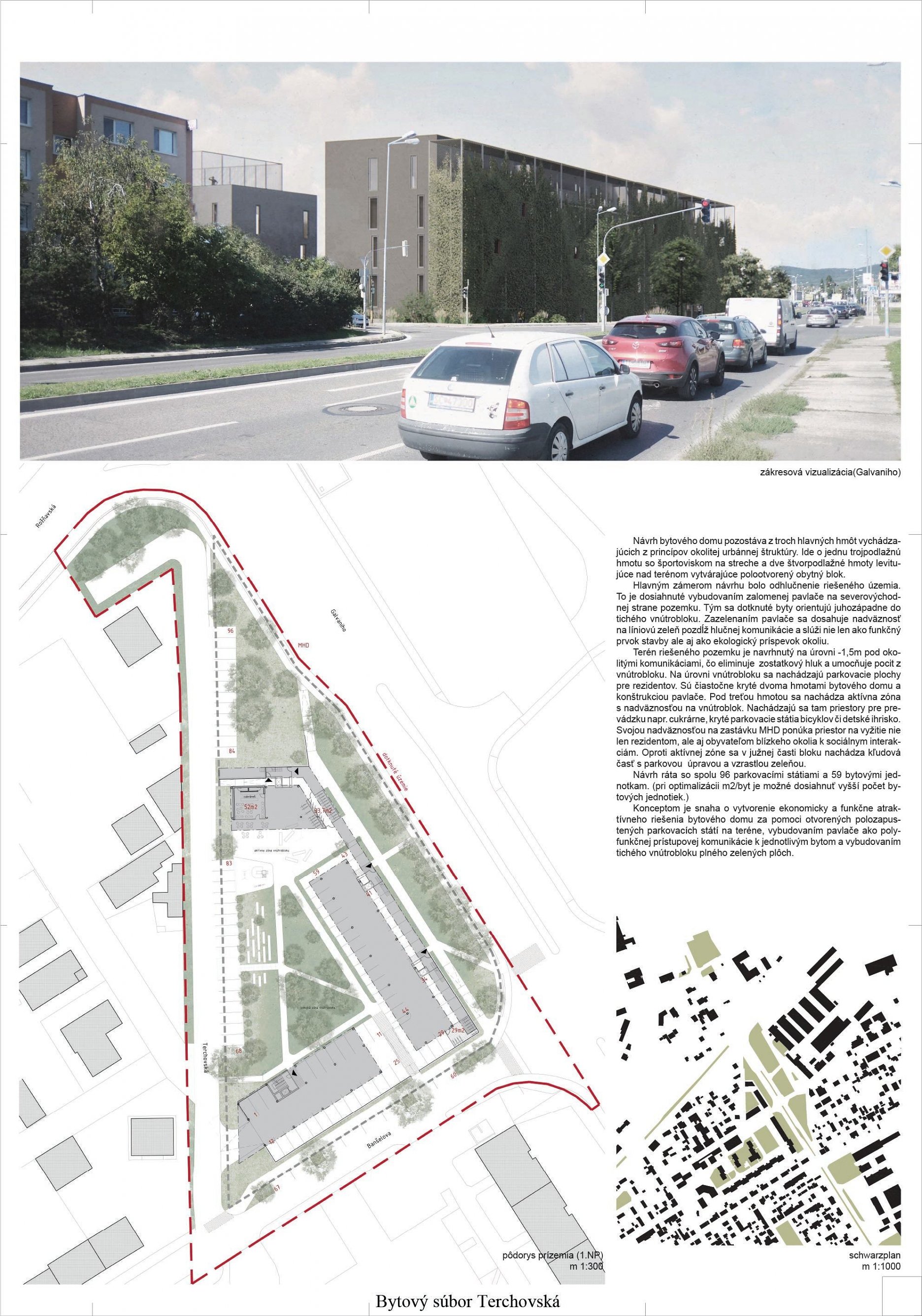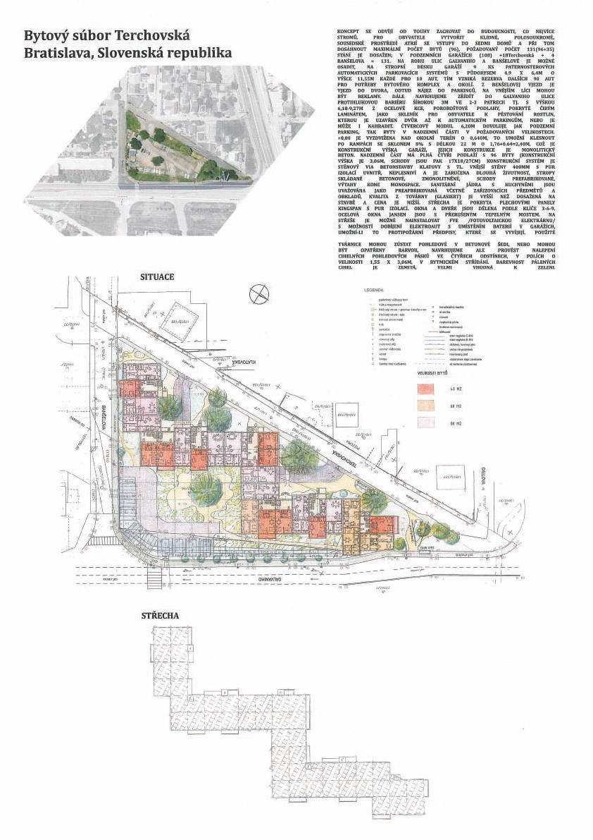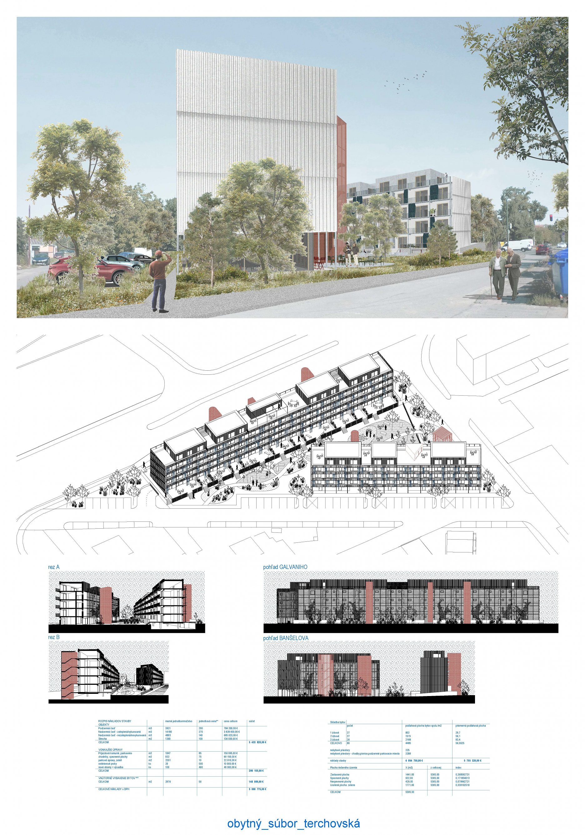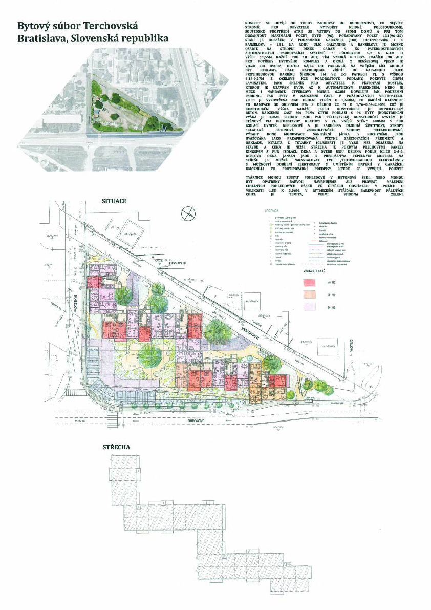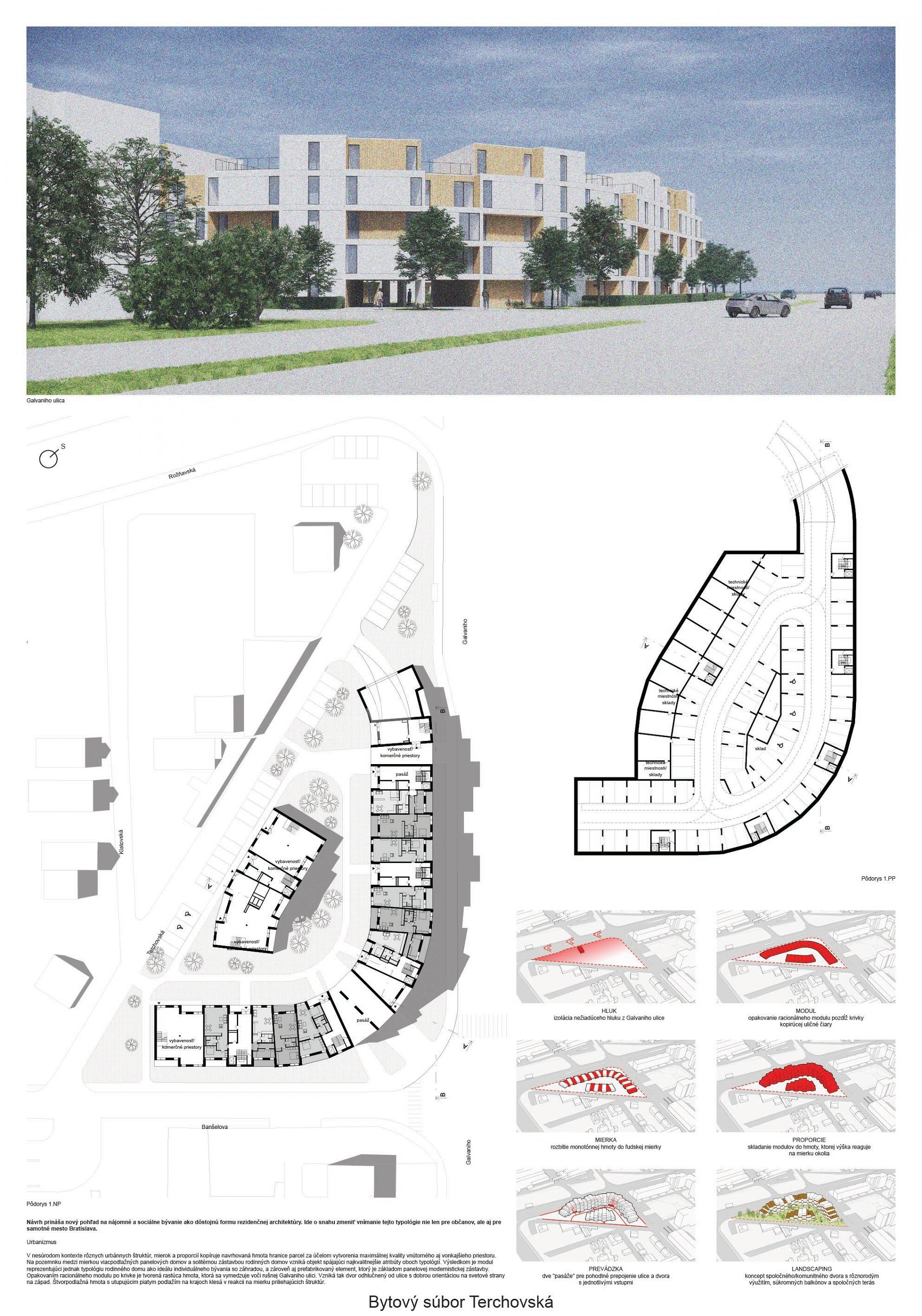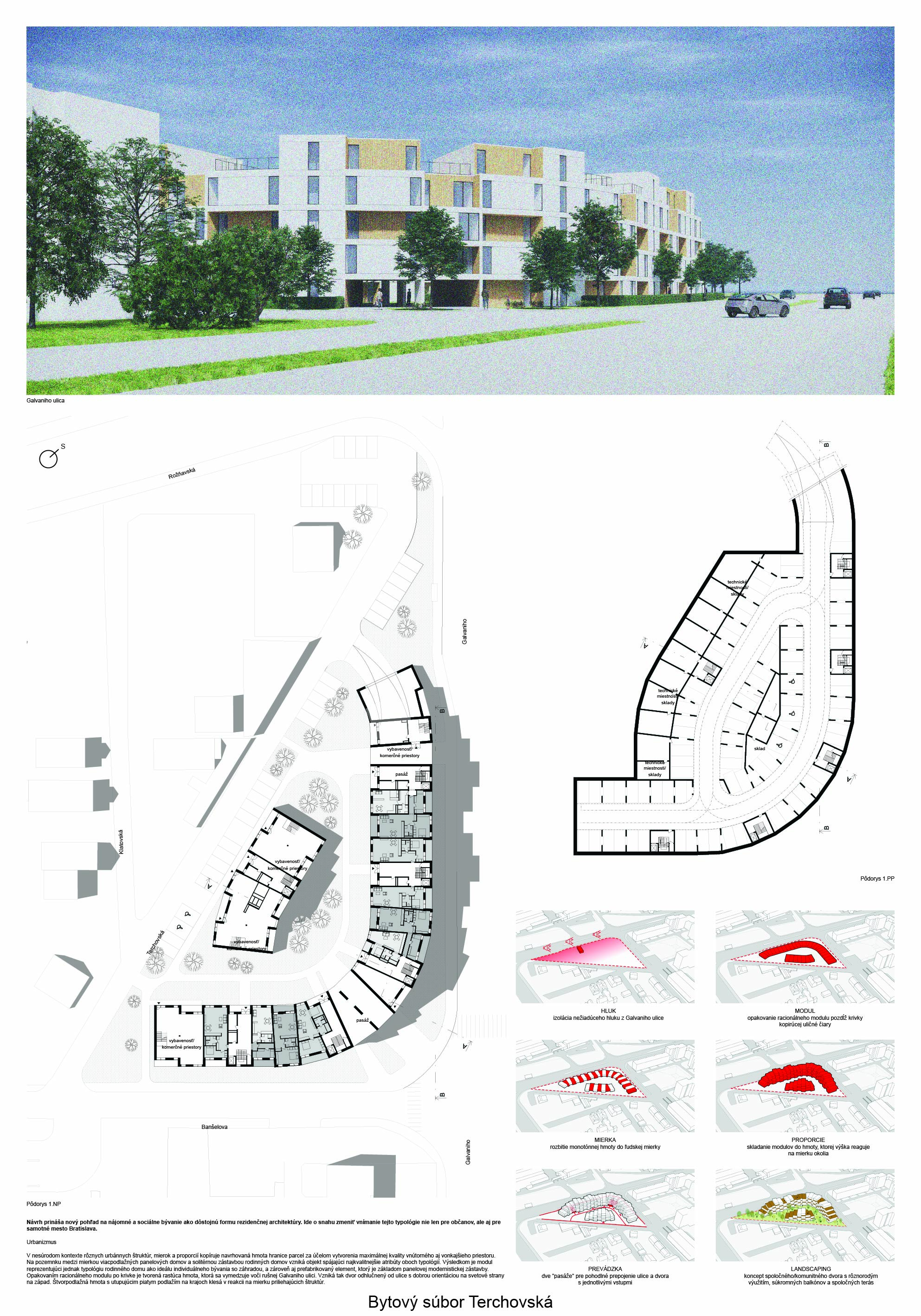 Pri víťaznom návrhu vyzdvihujeme predovšetkým vynikajúce urbanistické riešenie a citlivé začlenenie do územia. Bariérový pavlačový dom odtieňuje hluk z Galvaniho ulice a logicky dopĺňa rad štvorpodlažných panelových domov. Zároveň sa však ku koridoru Galvaniho ulice nestavia chrbtom, keď na oboch priečeliach autori umiestnili priestory vybavenosti. Správnosť tohto rozhodnutia potvrdzuje aj úprava a zvládnutie čelného priestoru pri križovatke Rožňavská - Galvaniho ulica. Skupina menších domov v západnej časti pozemku reaguje na mierku priľahlej zástavby a vytvára tak priepustné poloverejné priestory, ktoré nadväzujú na obdobné priestory medzi panelovými bytovými domami na juhovýchodnej strane Banšelovej ulice. Autori navyše vhodne umiestňujú vjazd do podzemnej halovej garáže do Banšelovej ulice, čím odľahčujú dynamickú dopravu v Terchovskej ulici a potvrdzujú jej status vedľajšej ukľudnenej slepej ulice.