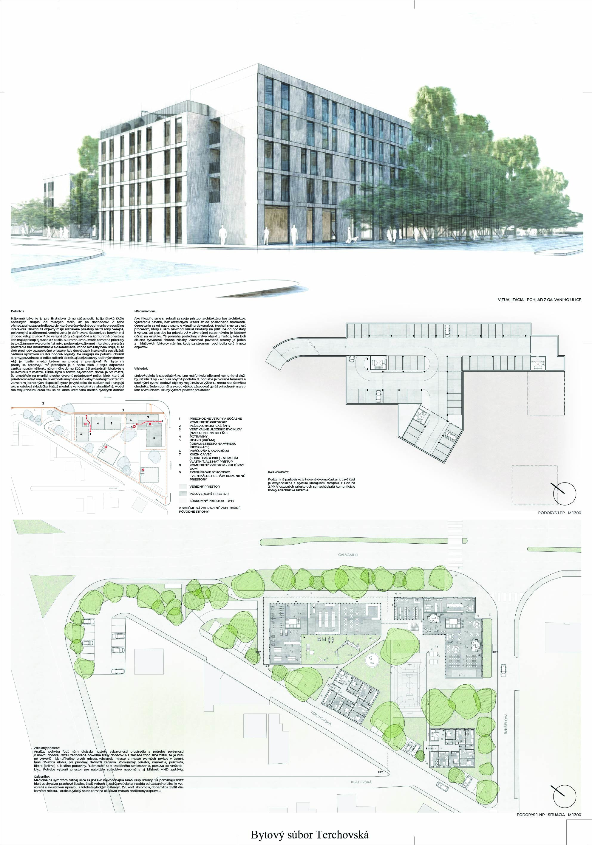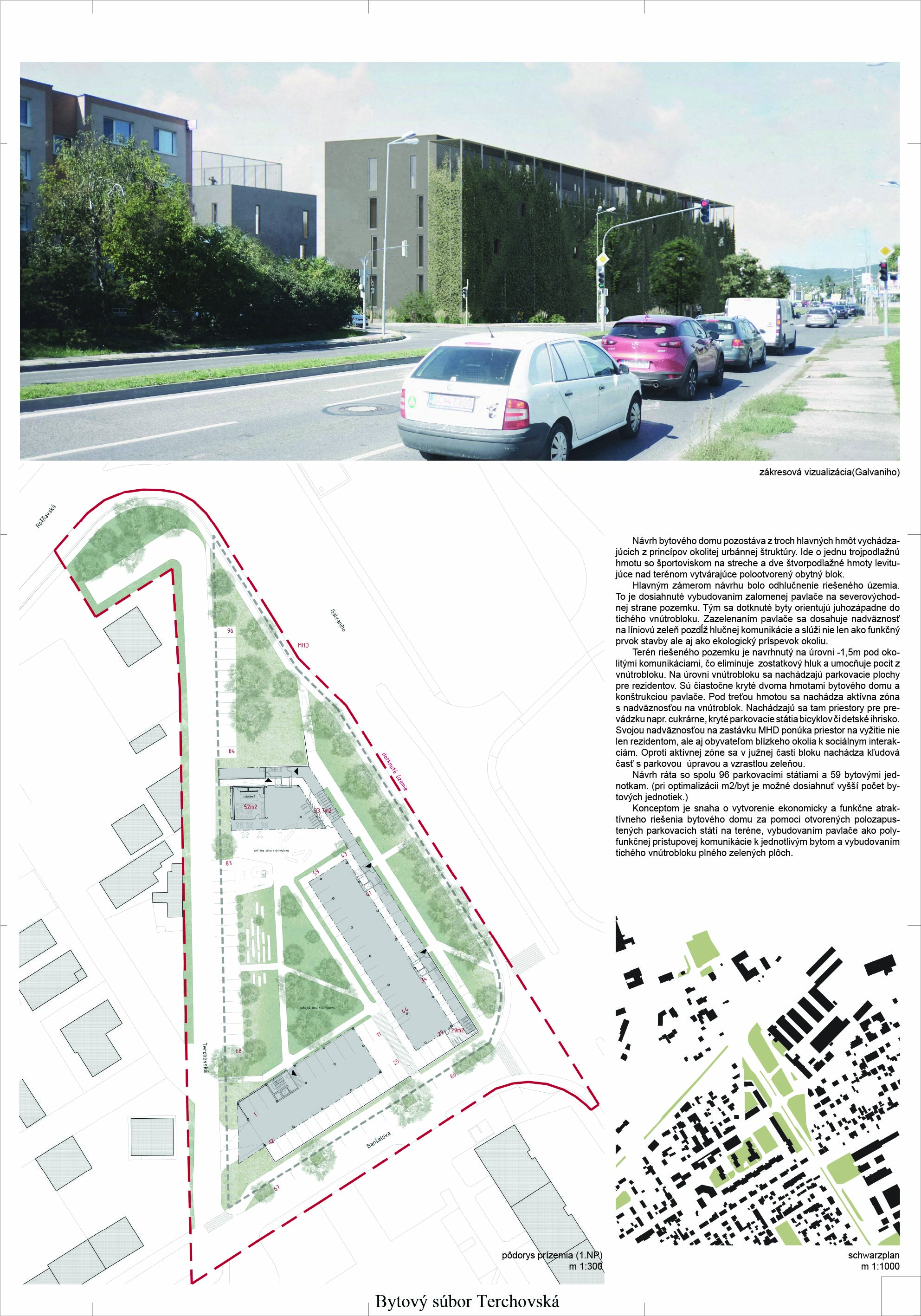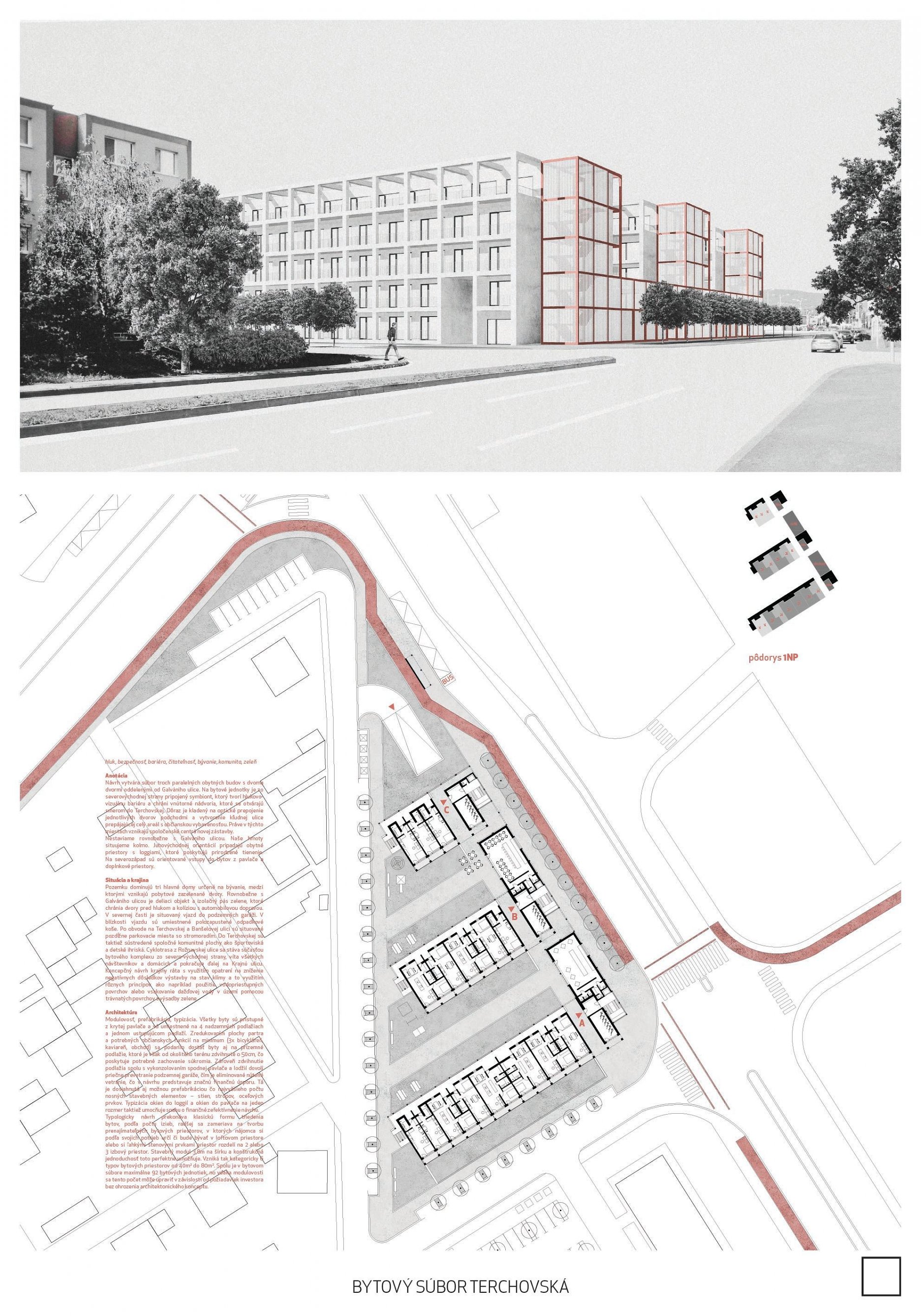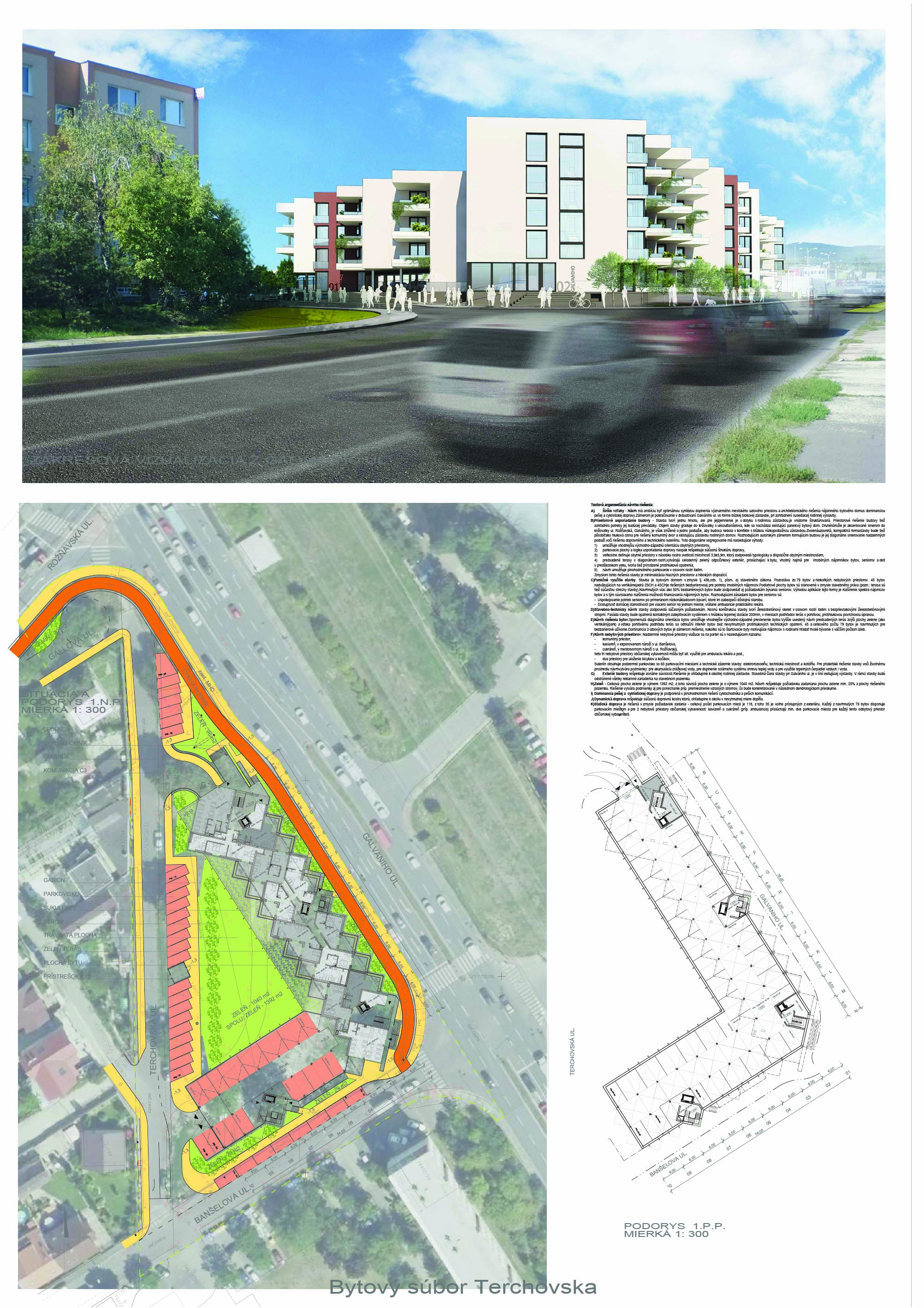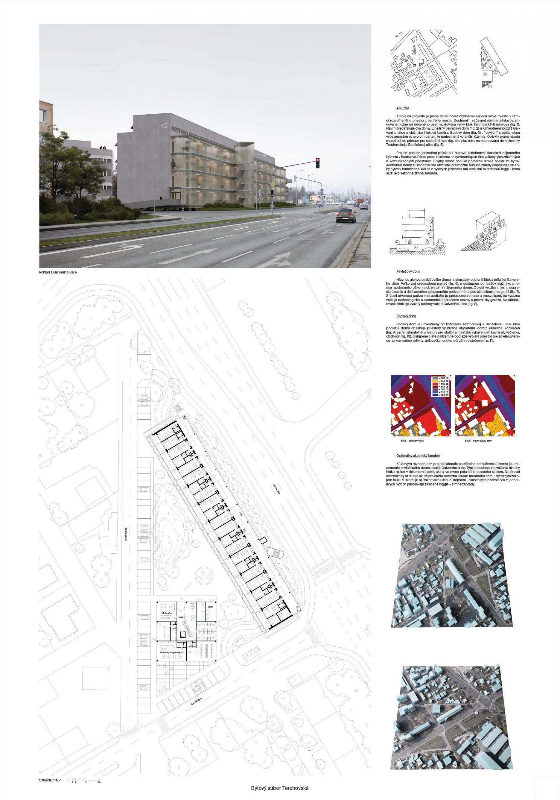 Pri víťaznom návrhu vyzdvihujeme predovšetkým vynikajúce urbanistické riešenie a citlivé začlenenie do územia. Bariérový pavlačový dom odtieňuje hluk z Galvaniho ulice a logicky dopĺňa rad štvorpodlažných panelových domov. Zároveň sa však ku koridoru Galvaniho ulice nestavia chrbtom, keď na oboch priečeliach autori umiestnili priestory vybavenosti. Správnosť tohto rozhodnutia potvrdzuje aj úprava a zvládnutie čelného priestoru pri križovatke Rožňavská - Galvaniho ulica. Skupina menších domov v západnej časti pozemku reaguje na mierku priľahlej zástavby a vytvára tak priepustné poloverejné priestory, ktoré nadväzujú na obdobné priestory medzi panelovými bytovými domami na juhovýchodnej strane Banšelovej ulice. Autori navyše vhodne umiestňujú vjazd do podzemnej halovej garáže do Banšelovej ulice, čím odľahčujú dynamickú dopravu v Terchovskej ulici a potvrdzujú jej status vedľajšej ukľudnenej slepej ulice.