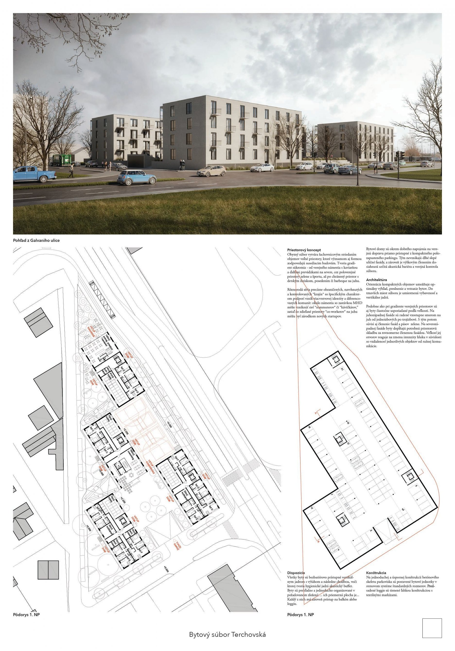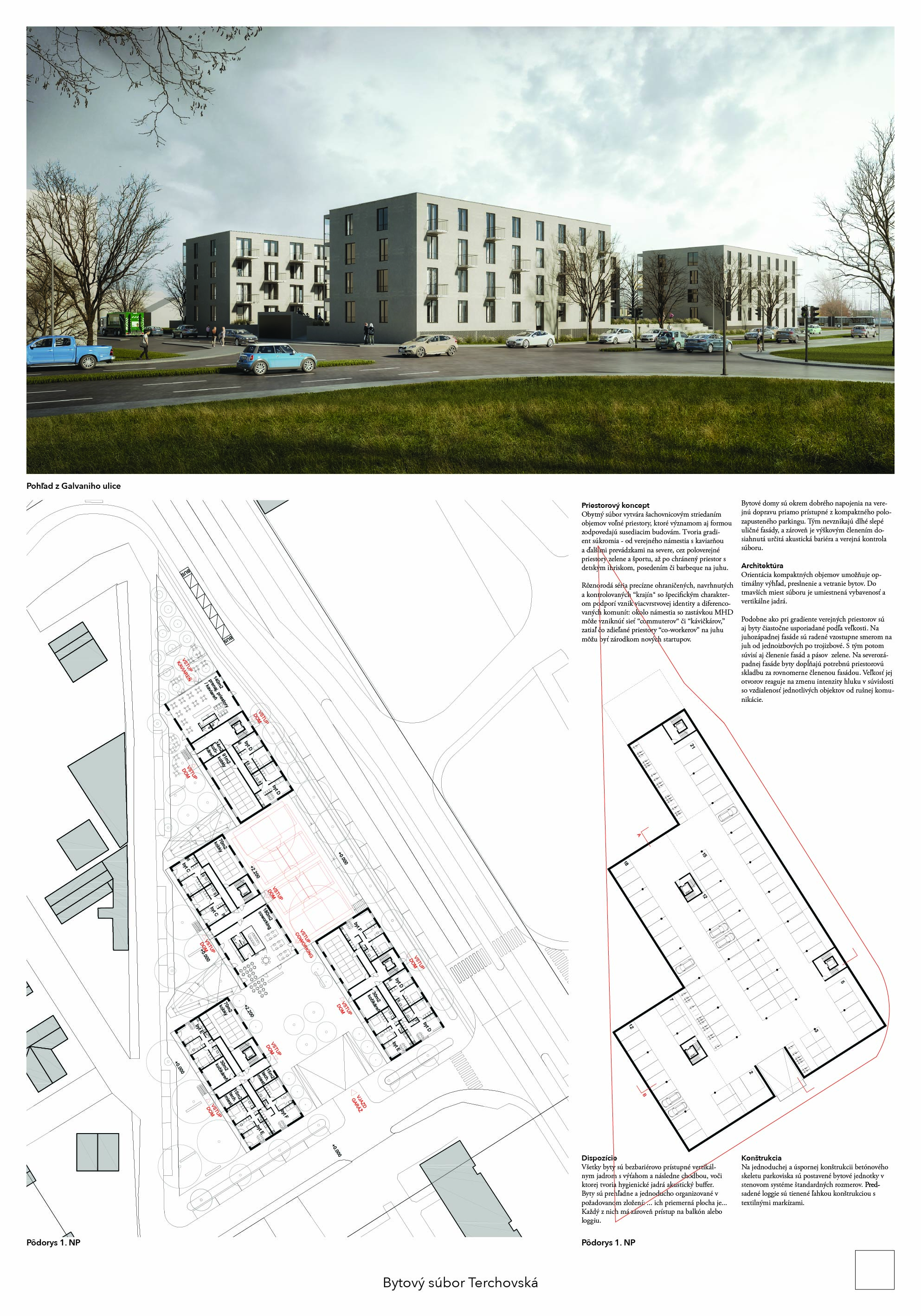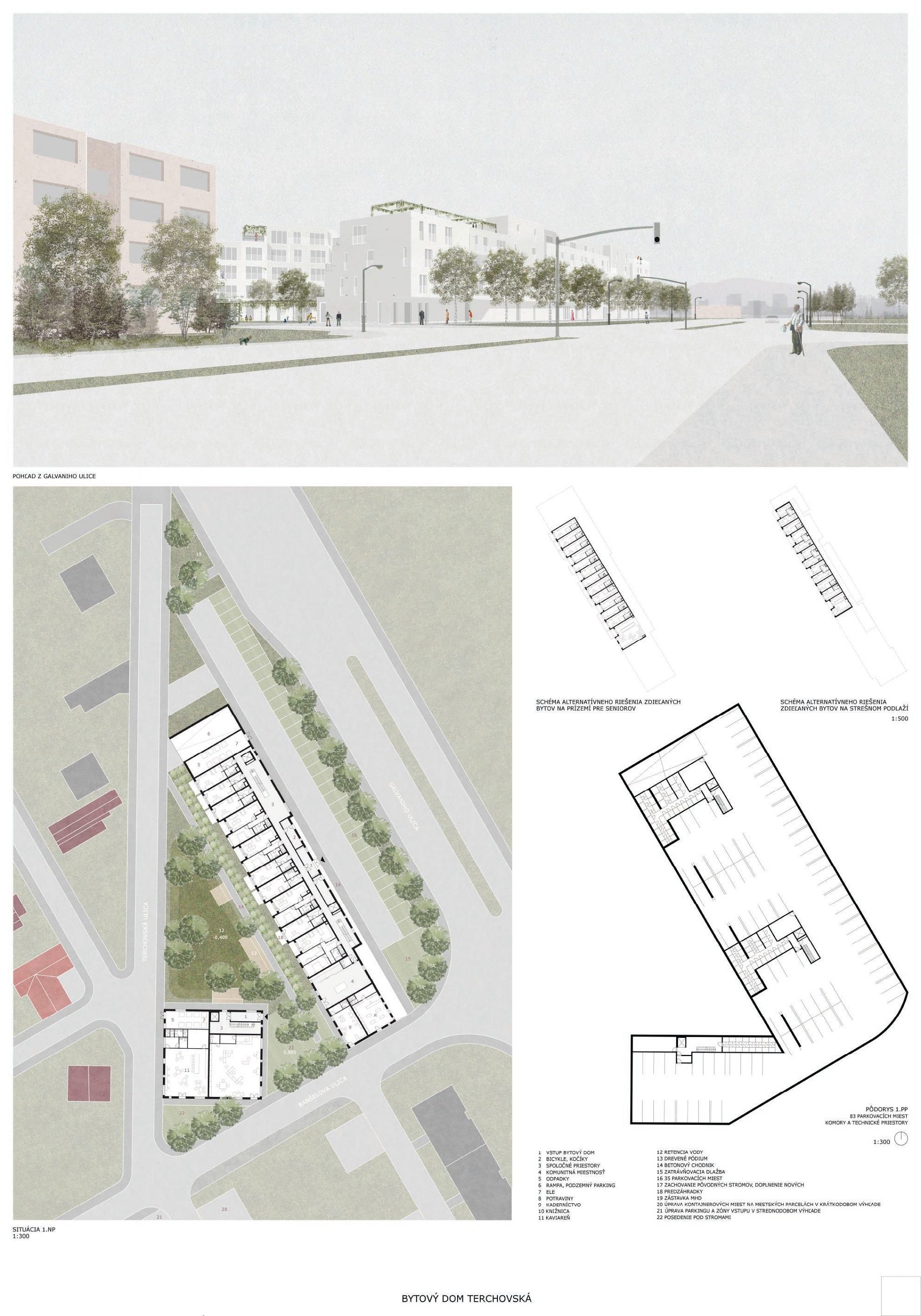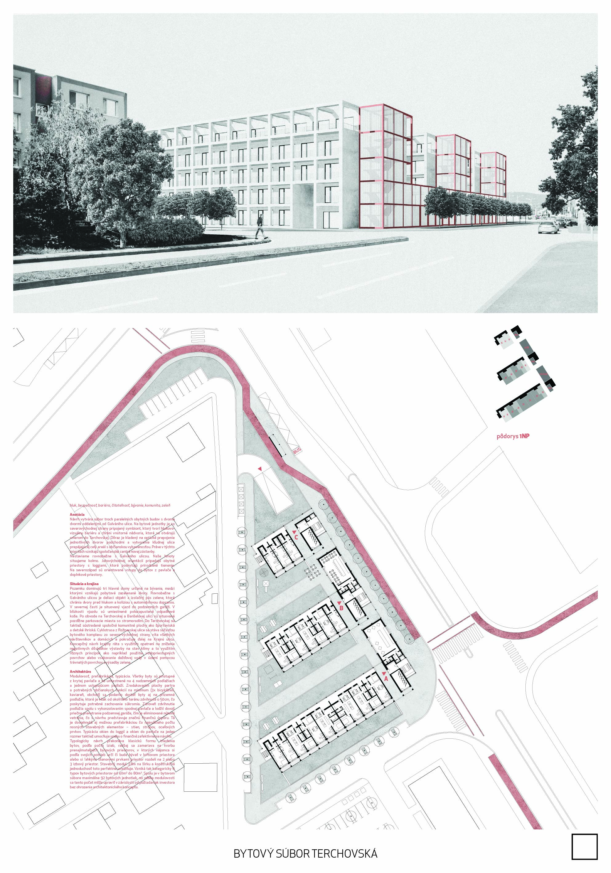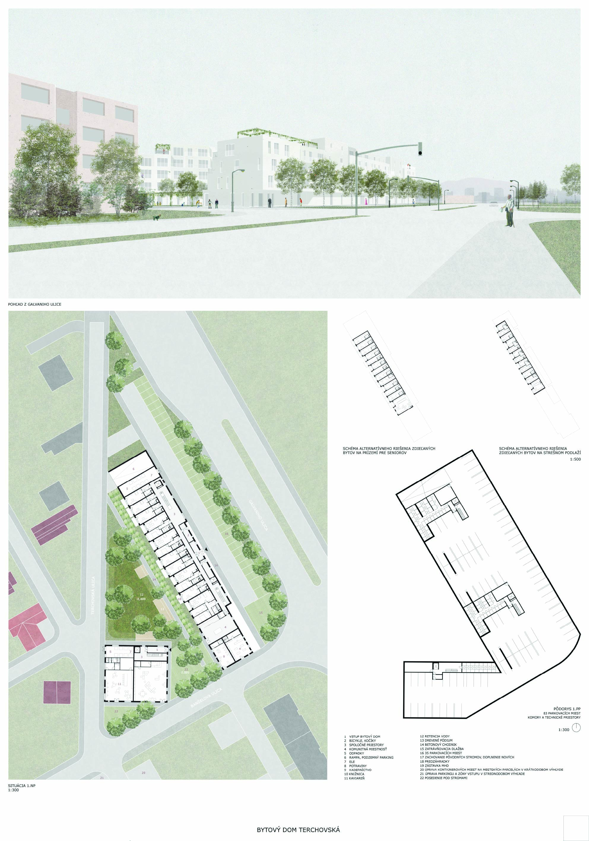 Pri víťaznom návrhu vyzdvihujeme predovšetkým vynikajúce urbanistické riešenie a citlivé začlenenie do územia. Bariérový pavlačový dom odtieňuje hluk z Galvaniho ulice a logicky dopĺňa rad štvorpodlažných panelových domov. Zároveň sa však ku koridoru Galvaniho ulice nestavia chrbtom, keď na oboch priečeliach autori umiestnili priestory vybavenosti. Správnosť tohto rozhodnutia potvrdzuje aj úprava a zvládnutie čelného priestoru pri križovatke Rožňavská - Galvaniho ulica. Skupina menších domov v západnej časti pozemku reaguje na mierku priľahlej zástavby a vytvára tak priepustné poloverejné priestory, ktoré nadväzujú na obdobné priestory medzi panelovými bytovými domami na juhovýchodnej strane Banšelovej ulice. Autori navyše vhodne umiestňujú vjazd do podzemnej halovej garáže do Banšelovej ulice, čím odľahčujú dynamickú dopravu v Terchovskej ulici a potvrdzujú jej status vedľajšej ukľudnenej slepej ulice.