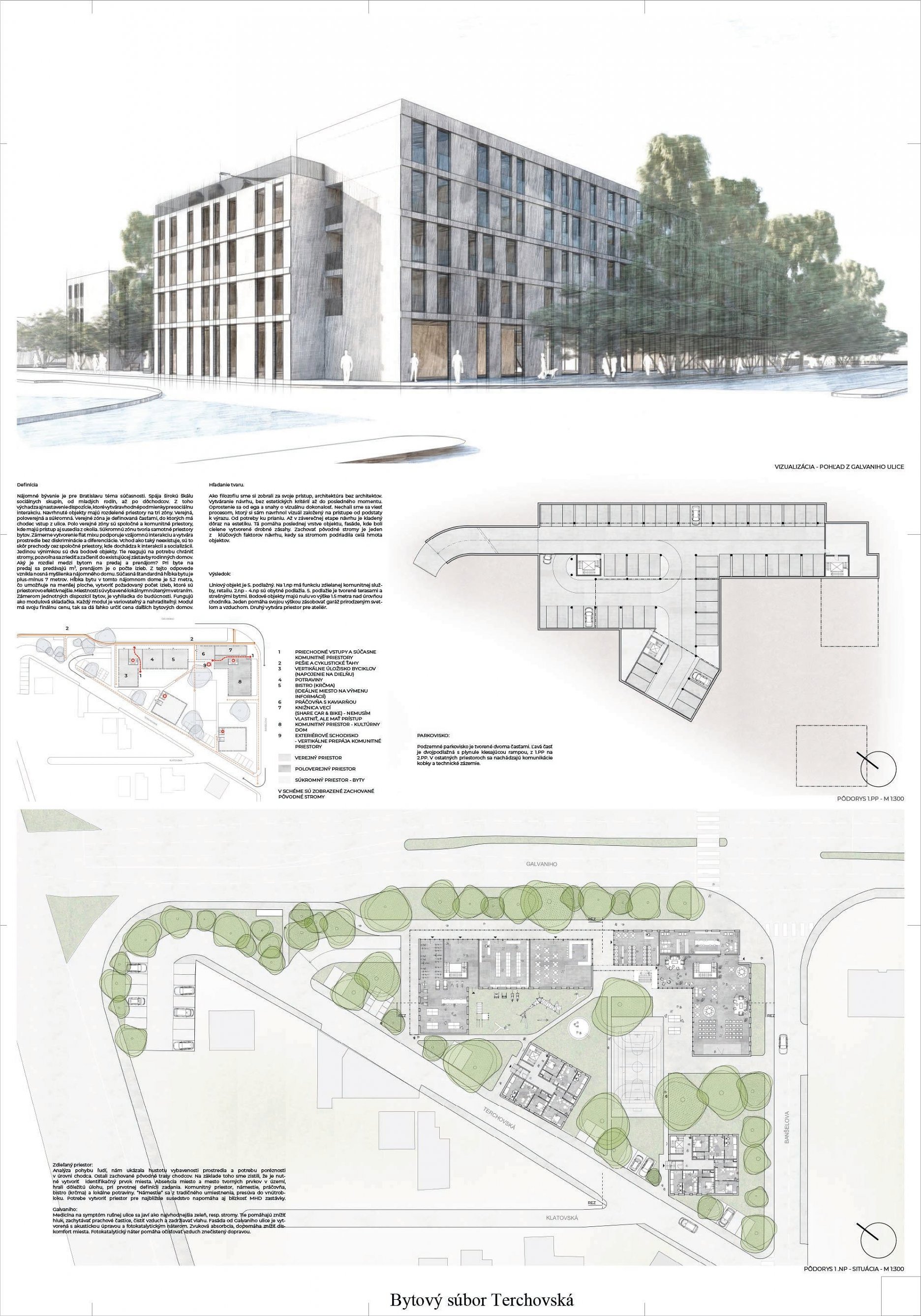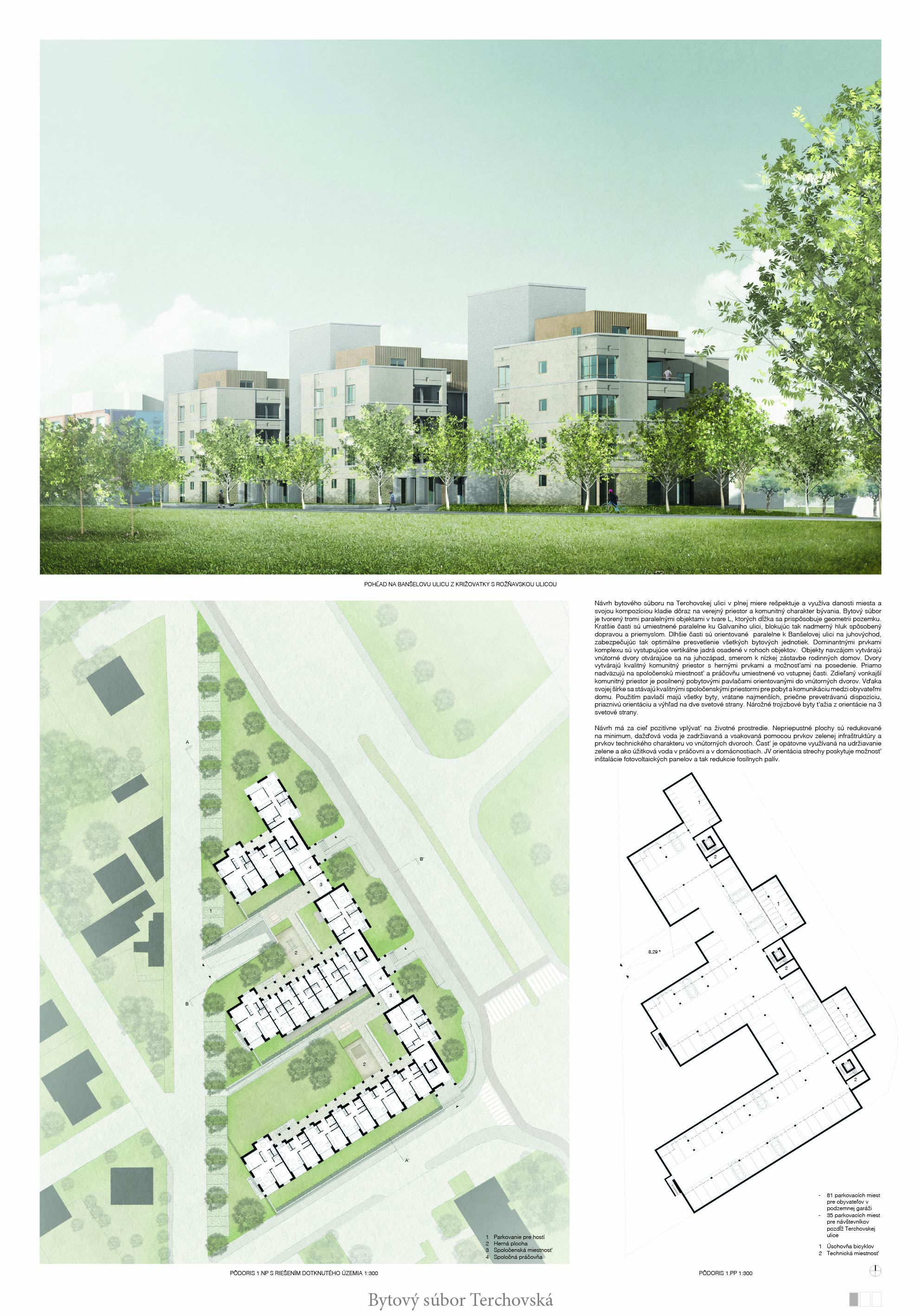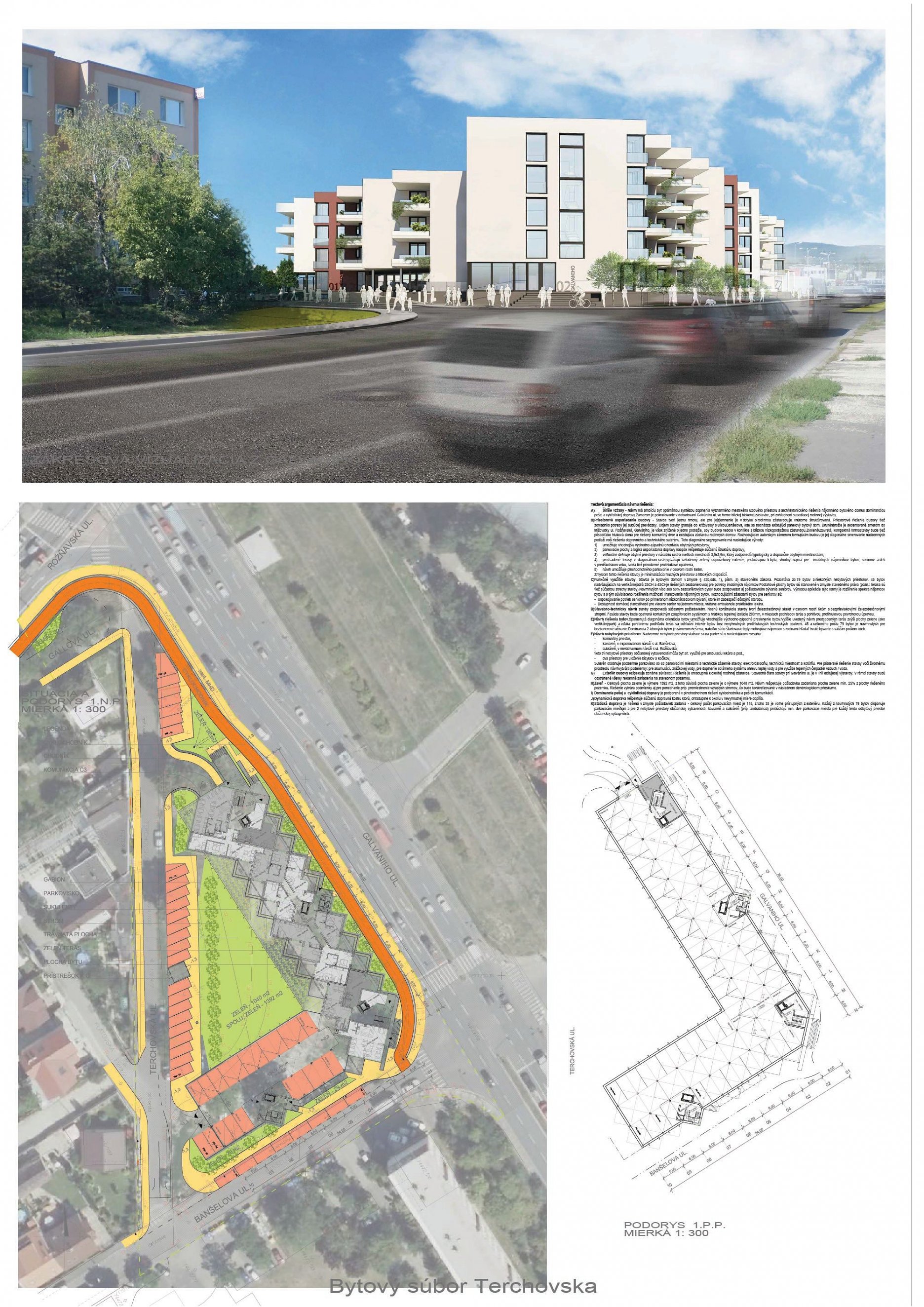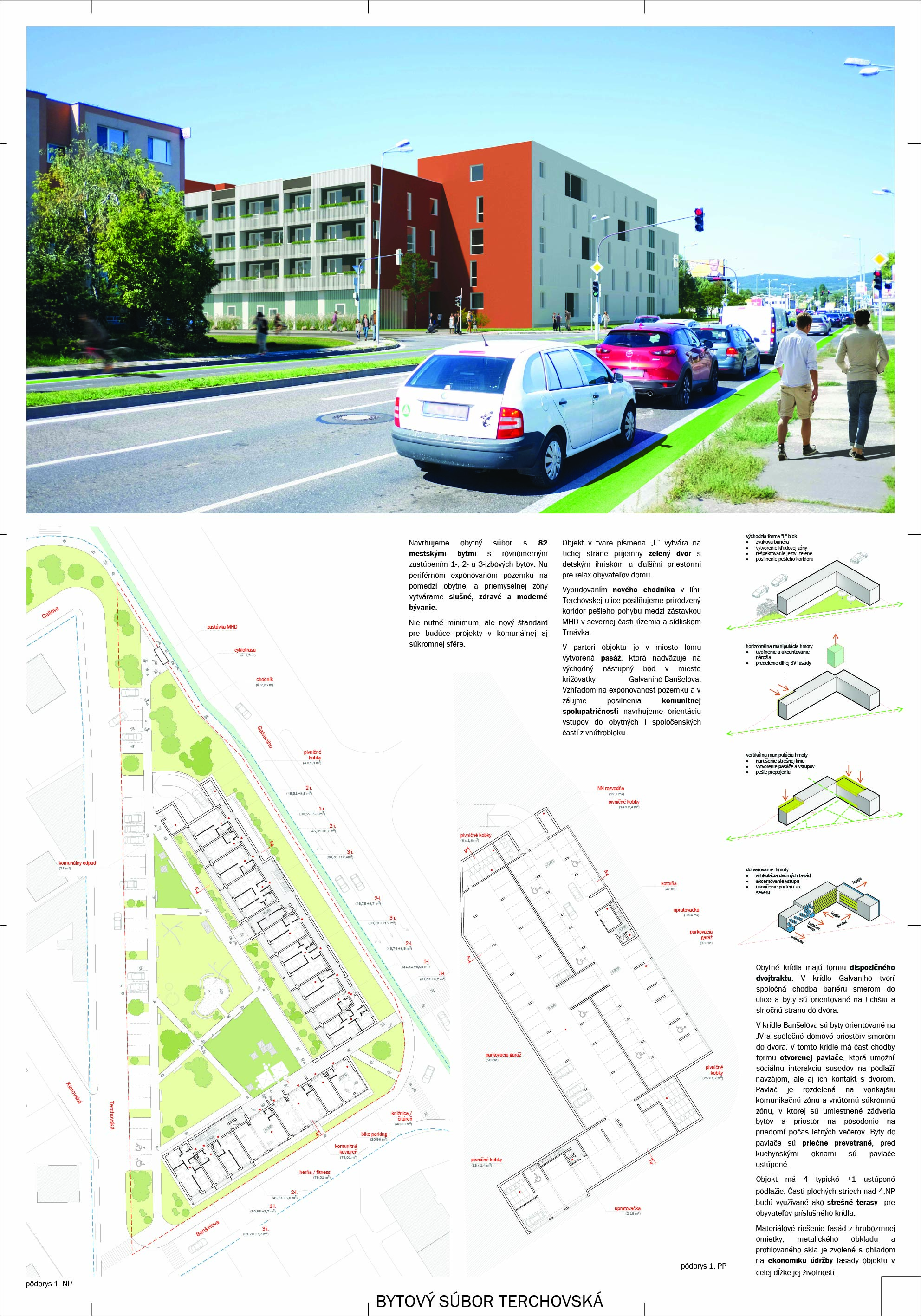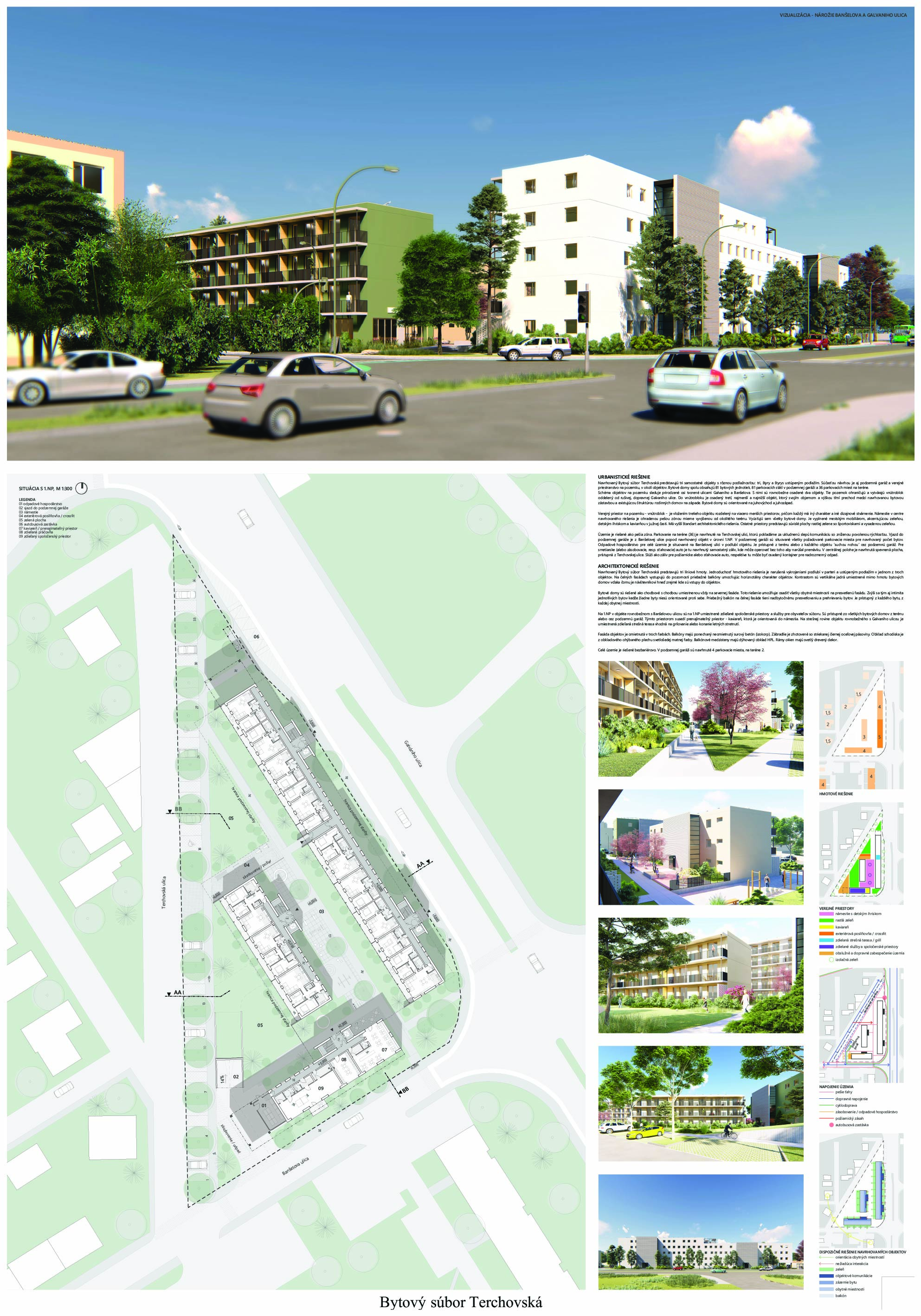 Pri víťaznom návrhu vyzdvihujeme predovšetkým vynikajúce urbanistické riešenie a citlivé začlenenie do územia. Bariérový pavlačový dom odtieňuje hluk z Galvaniho ulice a logicky dopĺňa rad štvorpodlažných panelových domov. Zároveň sa však ku koridoru Galvaniho ulice nestavia chrbtom, keď na oboch priečeliach autori umiestnili priestory vybavenosti. Správnosť tohto rozhodnutia potvrdzuje aj úprava a zvládnutie čelného priestoru pri križovatke Rožňavská - Galvaniho ulica. Skupina menších domov v západnej časti pozemku reaguje na mierku priľahlej zástavby a vytvára tak priepustné poloverejné priestory, ktoré nadväzujú na obdobné priestory medzi panelovými bytovými domami na juhovýchodnej strane Banšelovej ulice. Autori navyše vhodne umiestňujú vjazd do podzemnej halovej garáže do Banšelovej ulice, čím odľahčujú dynamickú dopravu v Terchovskej ulici a potvrdzujú jej status vedľajšej ukľudnenej slepej ulice.