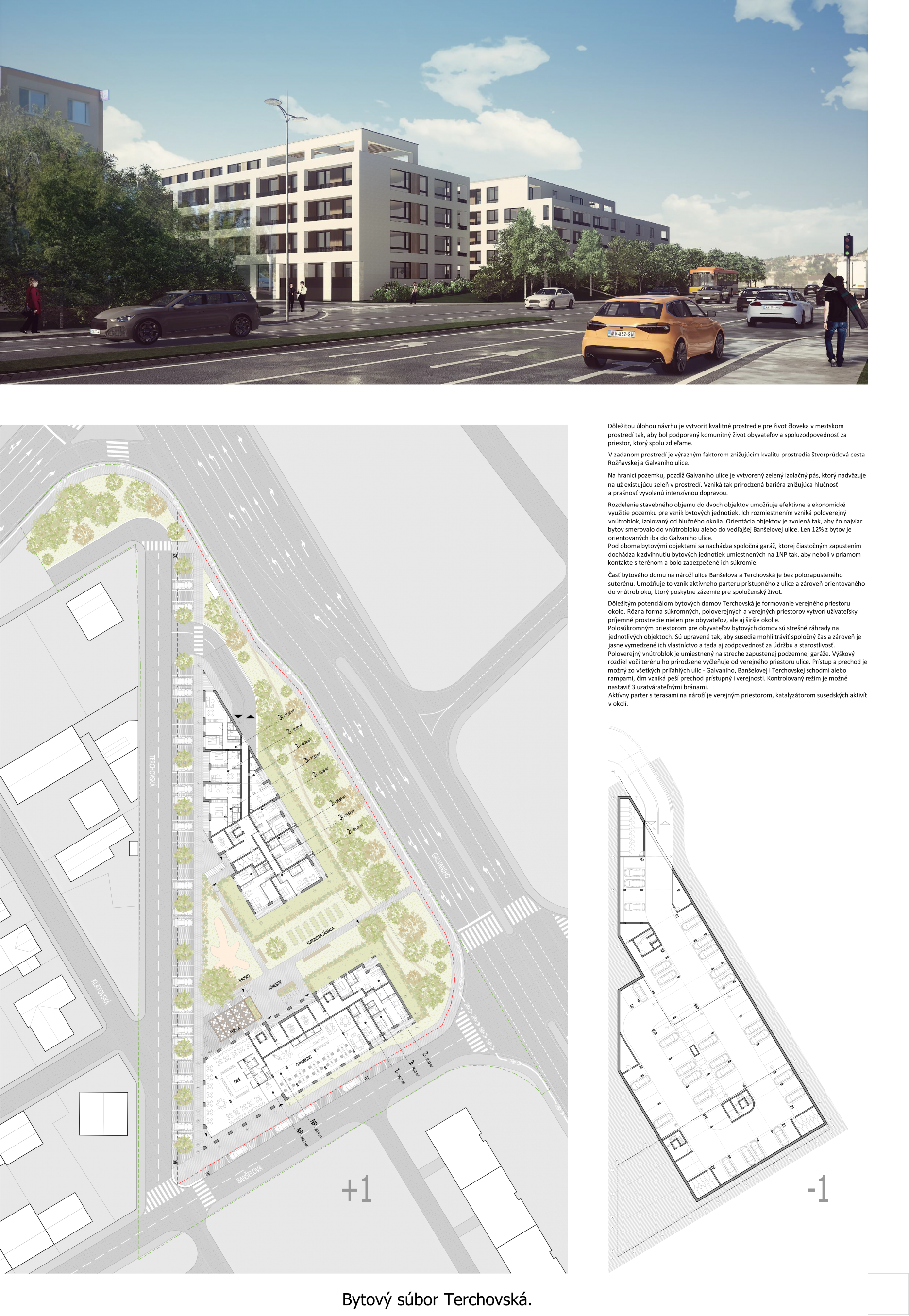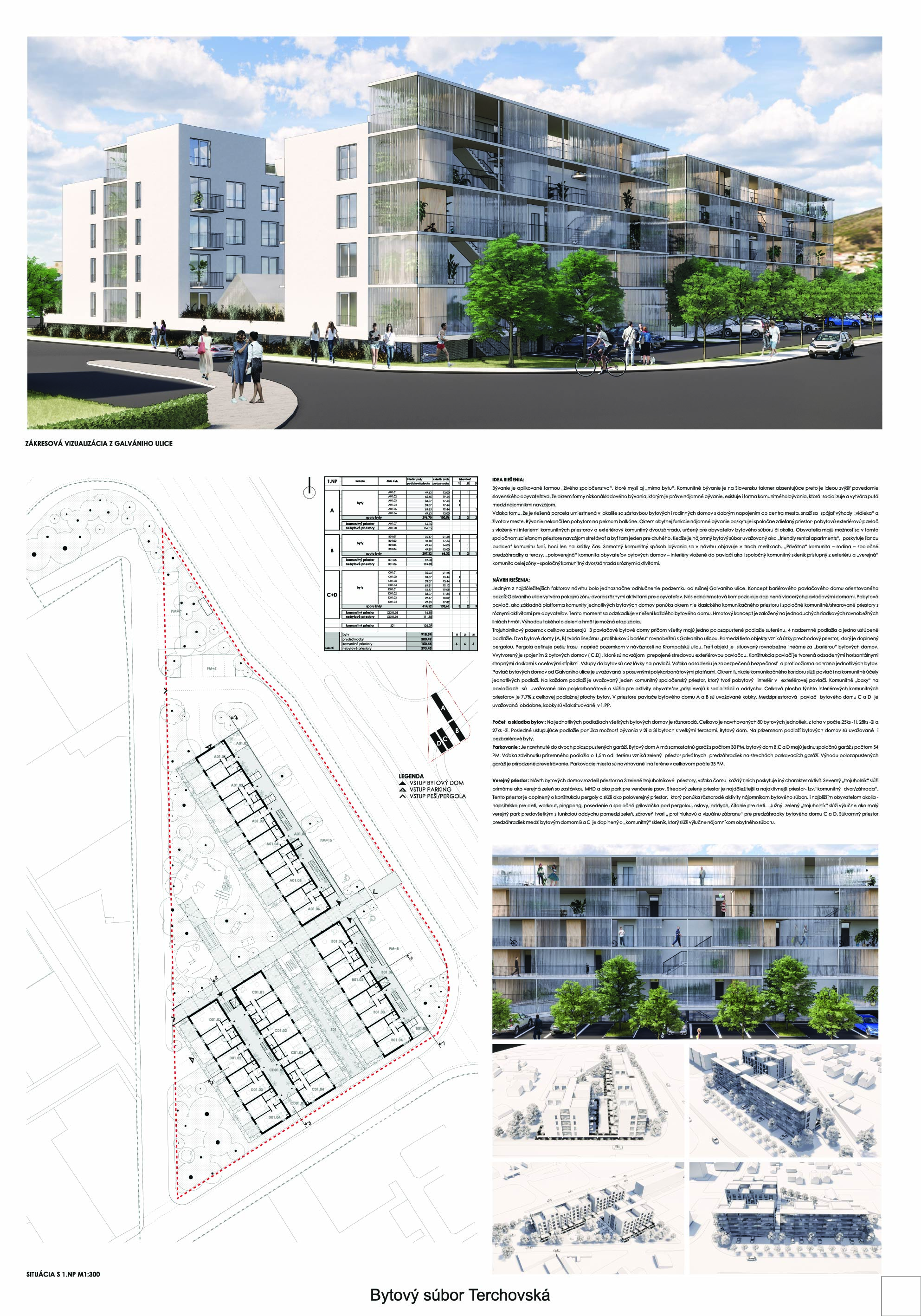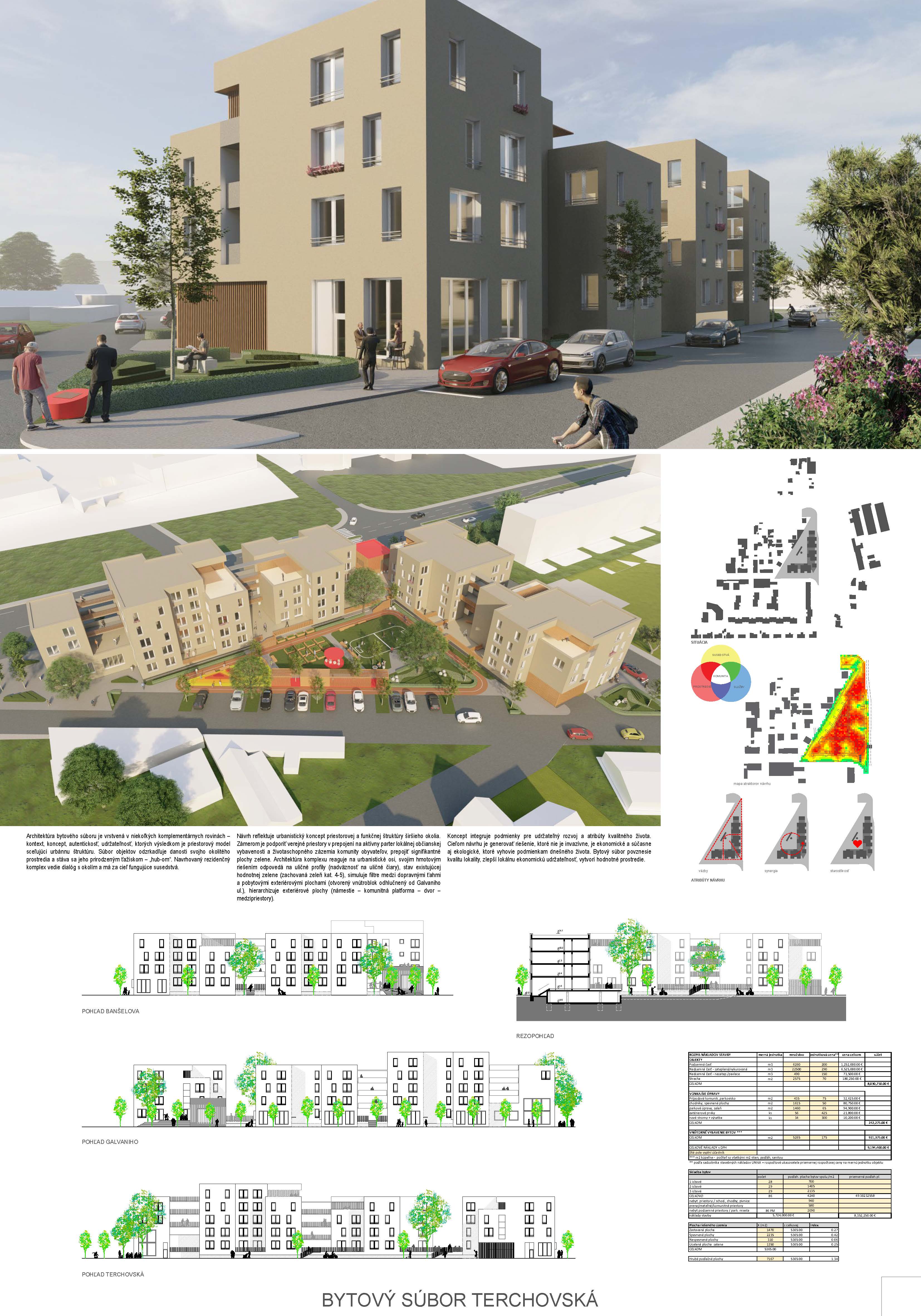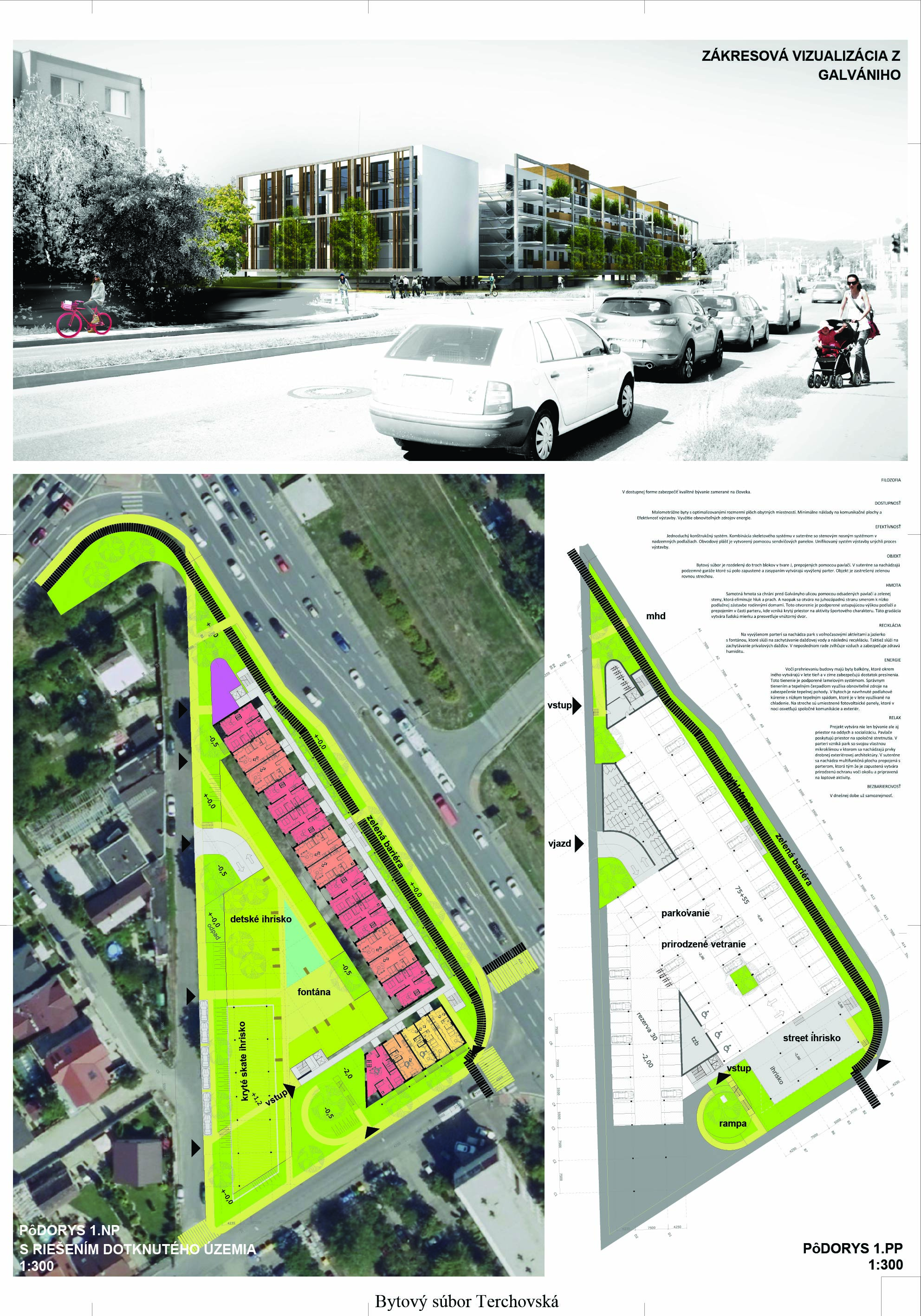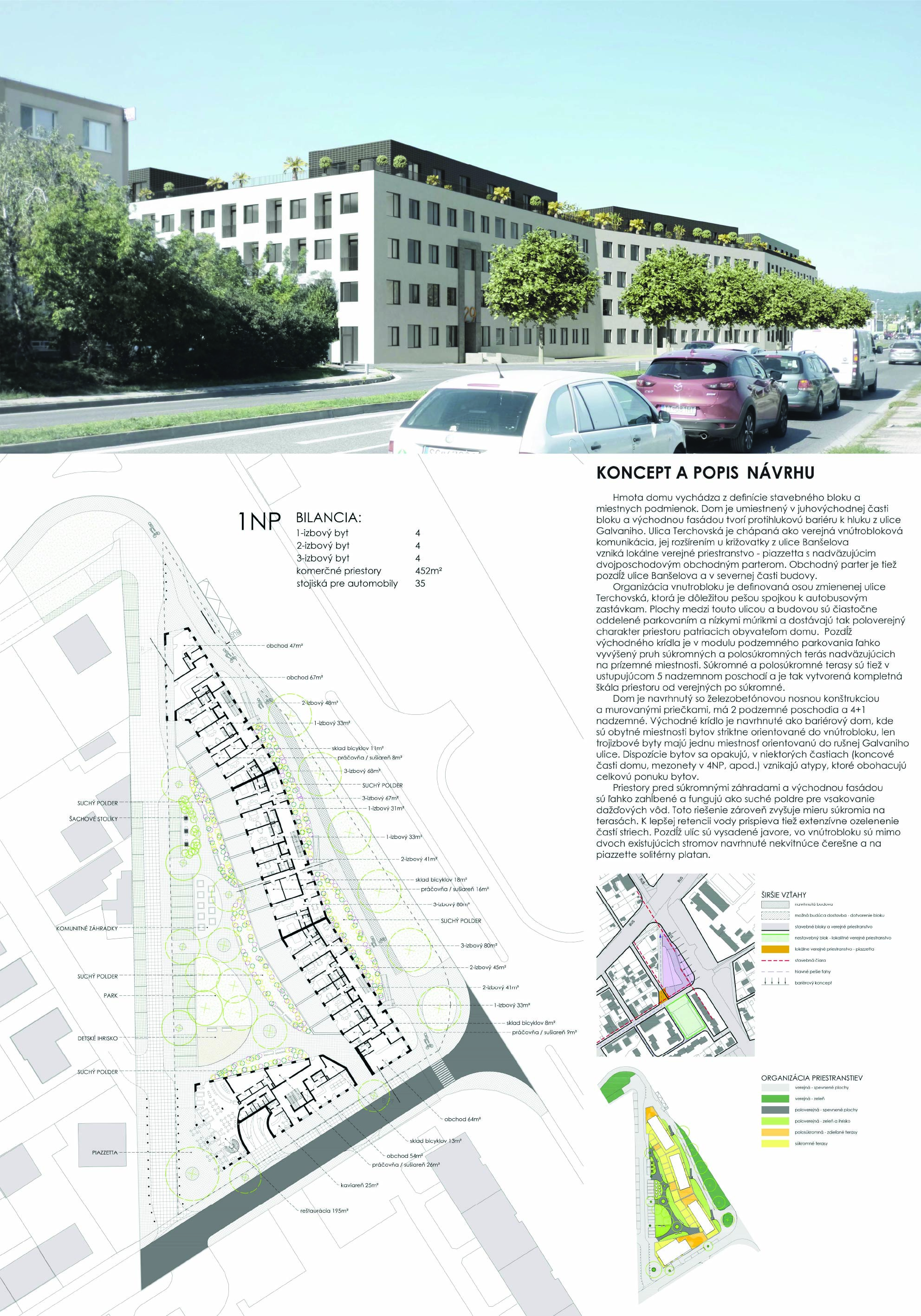 Pri víťaznom návrhu vyzdvihujeme predovšetkým vynikajúce urbanistické riešenie a citlivé začlenenie do územia. Bariérový pavlačový dom odtieňuje hluk z Galvaniho ulice a logicky dopĺňa rad štvorpodlažných panelových domov. Zároveň sa však ku koridoru Galvaniho ulice nestavia chrbtom, keď na oboch priečeliach autori umiestnili priestory vybavenosti. Správnosť tohto rozhodnutia potvrdzuje aj úprava a zvládnutie čelného priestoru pri križovatke Rožňavská - Galvaniho ulica. Skupina menších domov v západnej časti pozemku reaguje na mierku priľahlej zástavby a vytvára tak priepustné poloverejné priestory, ktoré nadväzujú na obdobné priestory medzi panelovými bytovými domami na juhovýchodnej strane Banšelovej ulice. Autori navyše vhodne umiestňujú vjazd do podzemnej halovej garáže do Banšelovej ulice, čím odľahčujú dynamickú dopravu v Terchovskej ulici a potvrdzujú jej status vedľajšej ukľudnenej slepej ulice.
