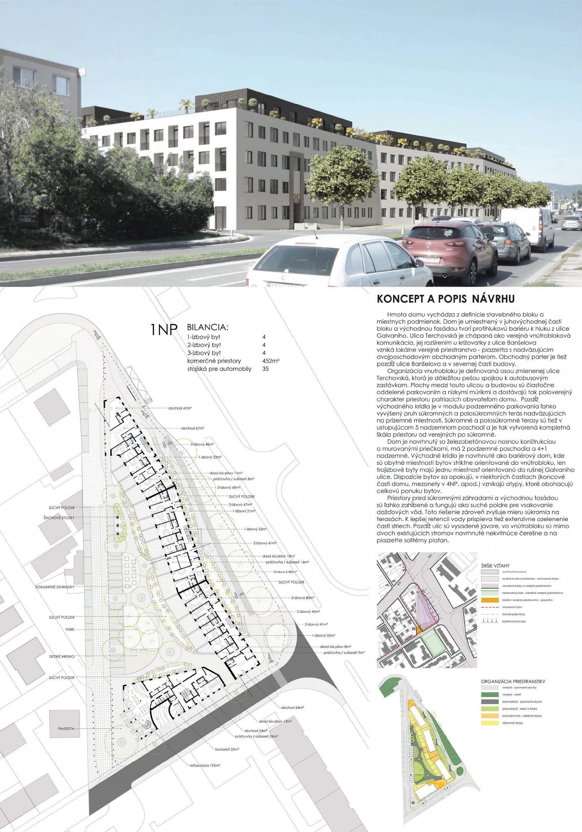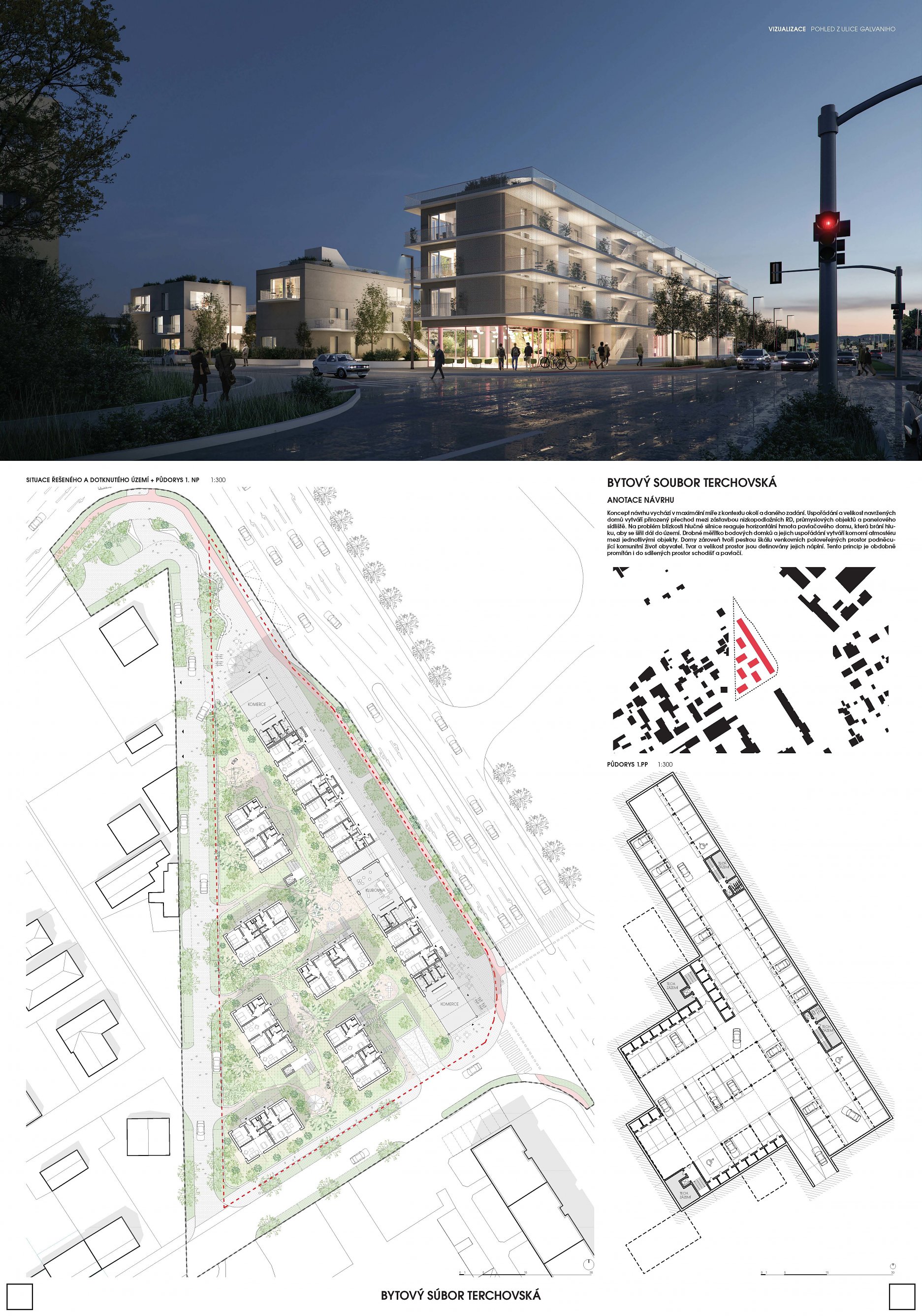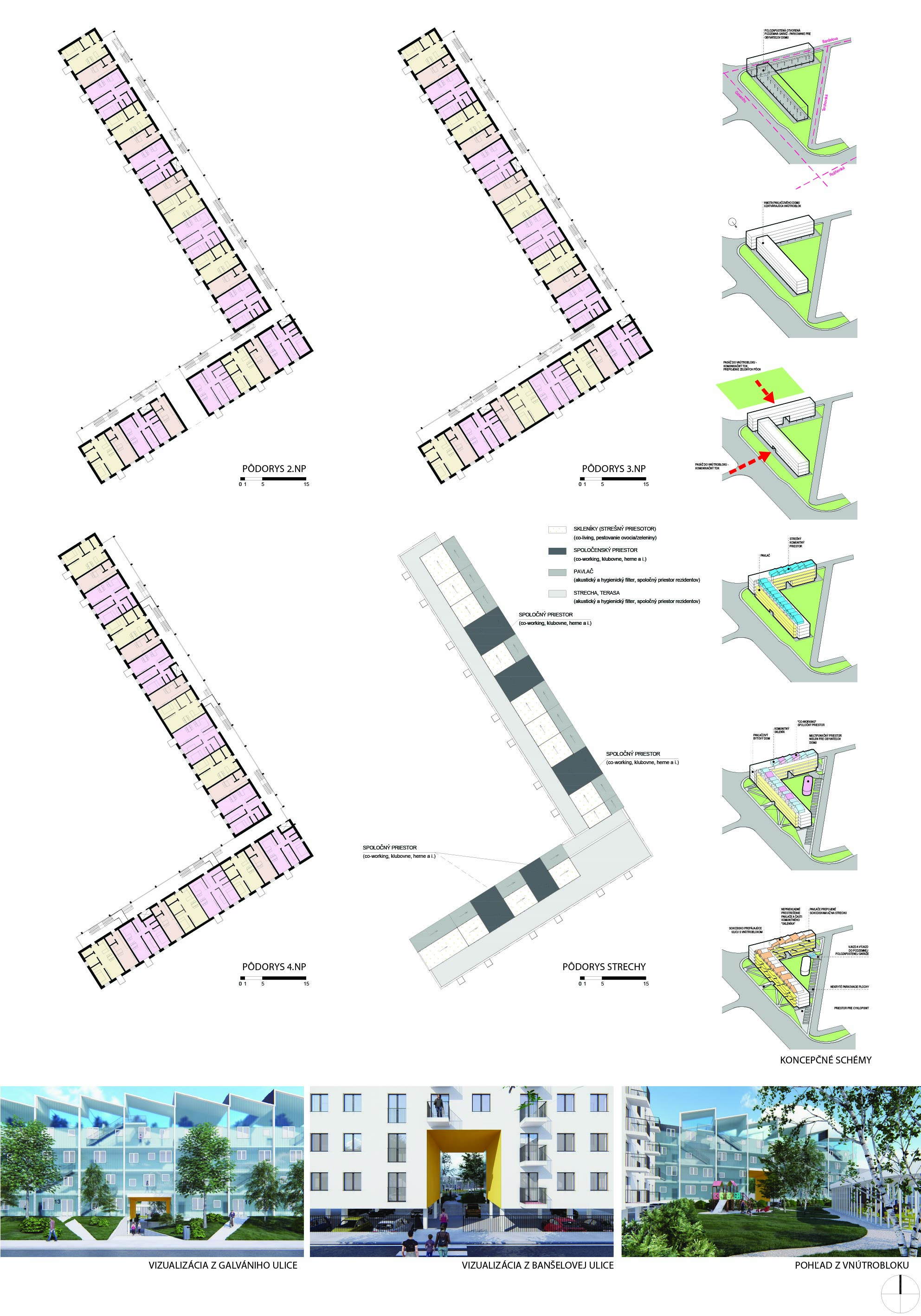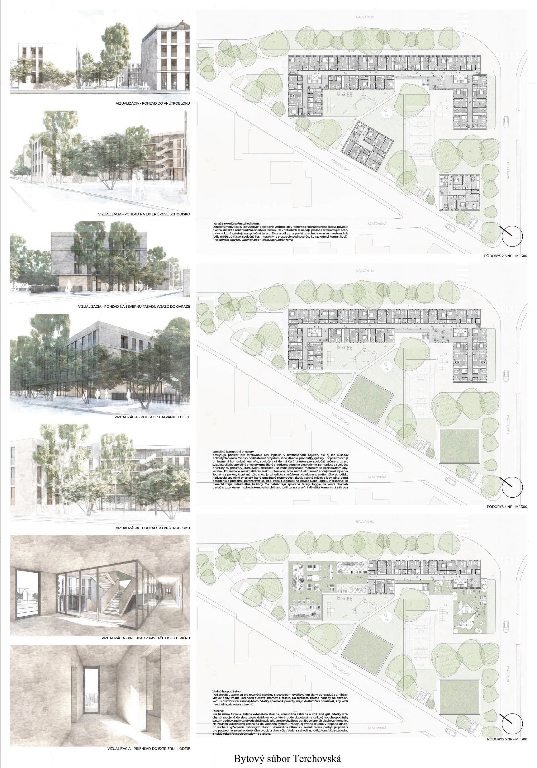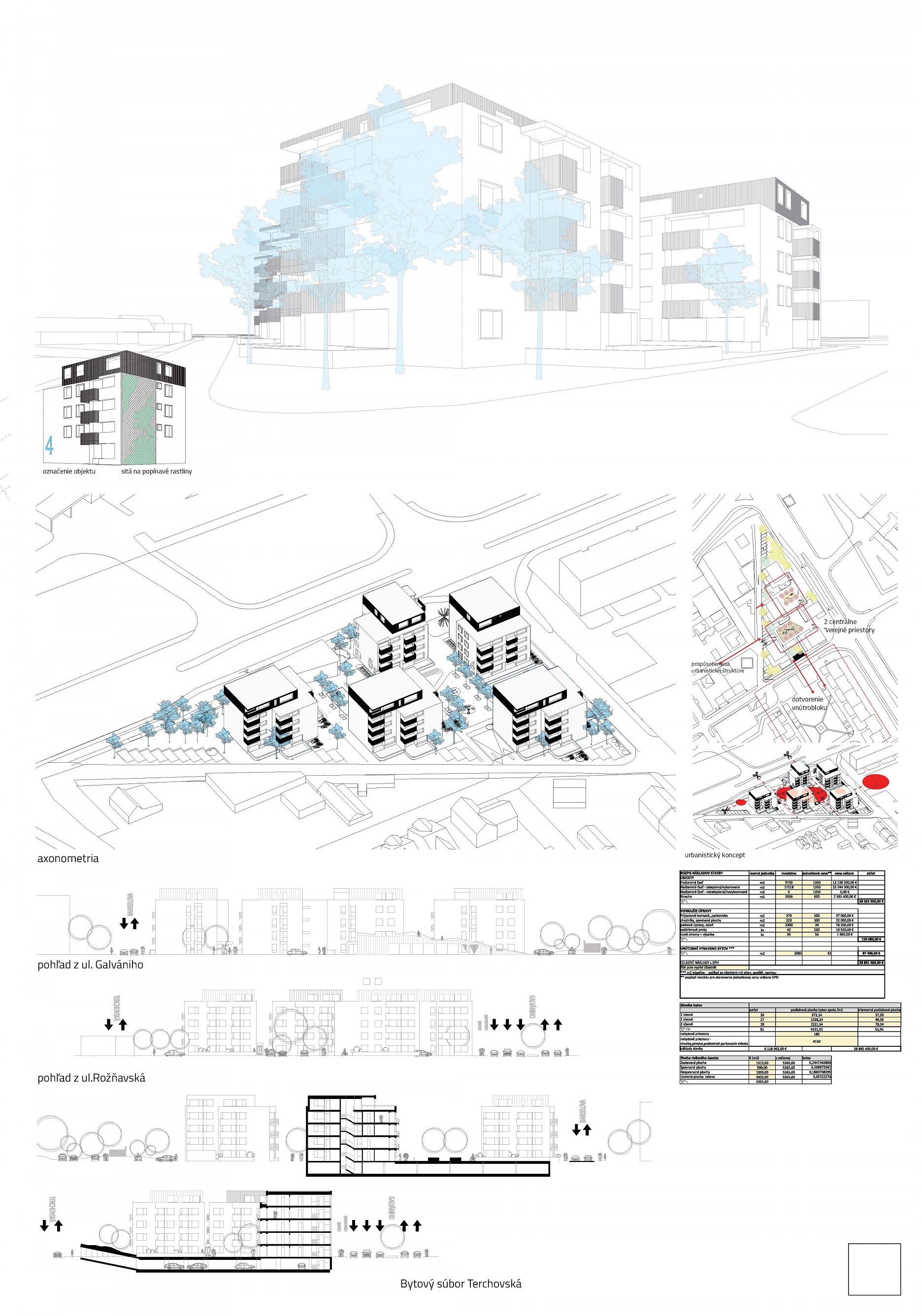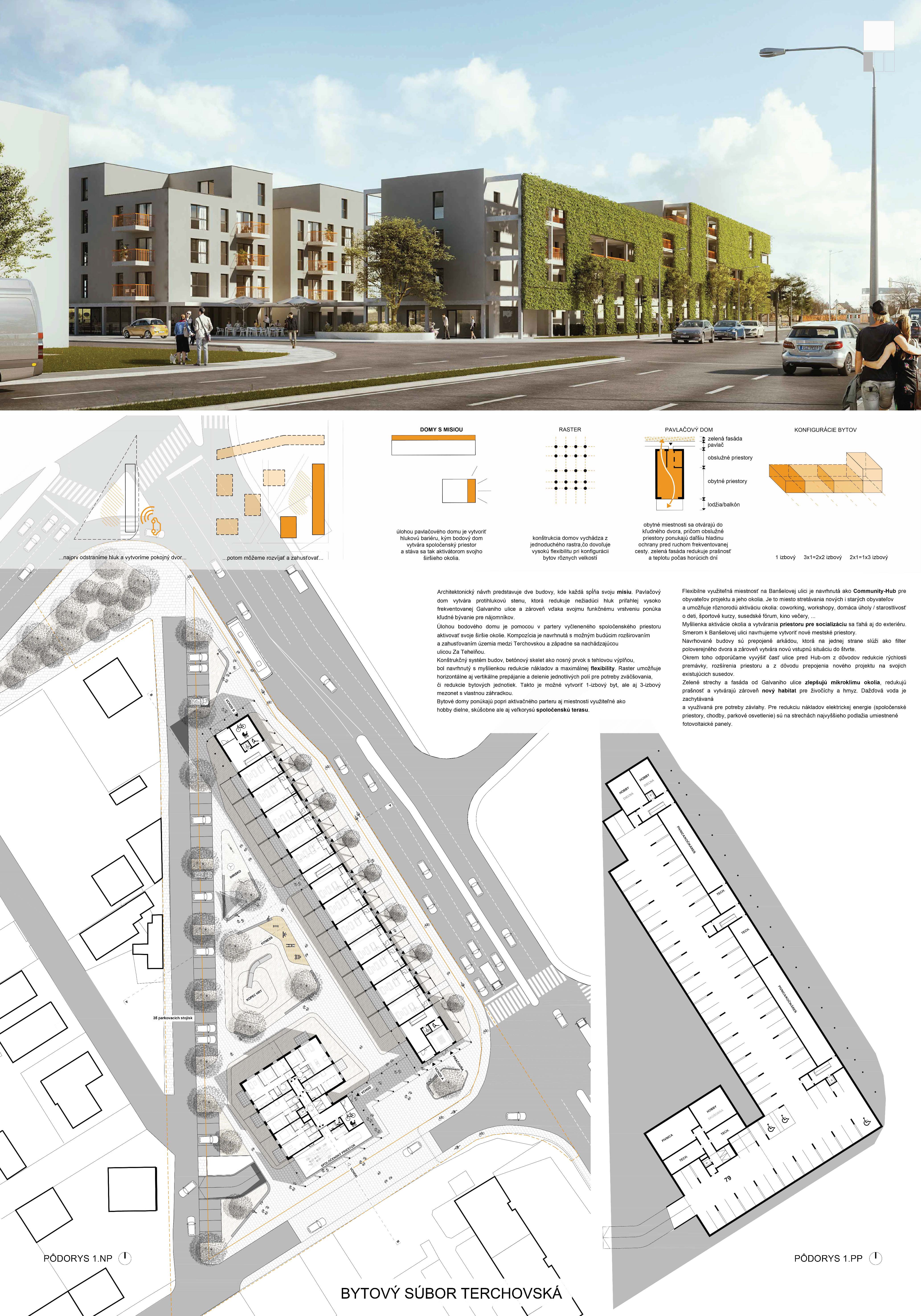 Pri víťaznom návrhu vyzdvihujeme predovšetkým vynikajúce urbanistické riešenie a citlivé začlenenie do územia. Bariérový pavlačový dom odtieňuje hluk z Galvaniho ulice a logicky dopĺňa rad štvorpodlažných panelových domov. Zároveň sa však ku koridoru Galvaniho ulice nestavia chrbtom, keď na oboch priečeliach autori umiestnili priestory vybavenosti. Správnosť tohto rozhodnutia potvrdzuje aj úprava a zvládnutie čelného priestoru pri križovatke Rožňavská - Galvaniho ulica. Skupina menších domov v západnej časti pozemku reaguje na mierku priľahlej zástavby a vytvára tak priepustné poloverejné priestory, ktoré nadväzujú na obdobné priestory medzi panelovými bytovými domami na juhovýchodnej strane Banšelovej ulice. Autori navyše vhodne umiestňujú vjazd do podzemnej halovej garáže do Banšelovej ulice, čím odľahčujú dynamickú dopravu v Terchovskej ulici a potvrdzujú jej status vedľajšej ukľudnenej slepej ulice.