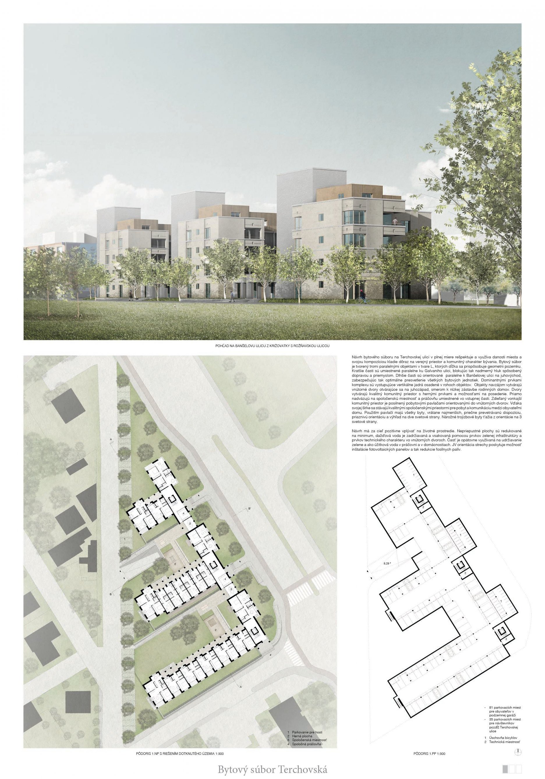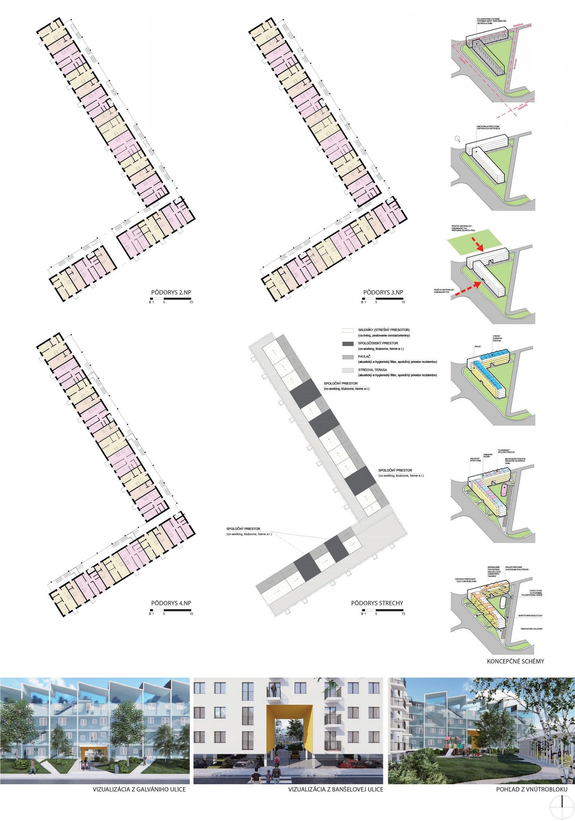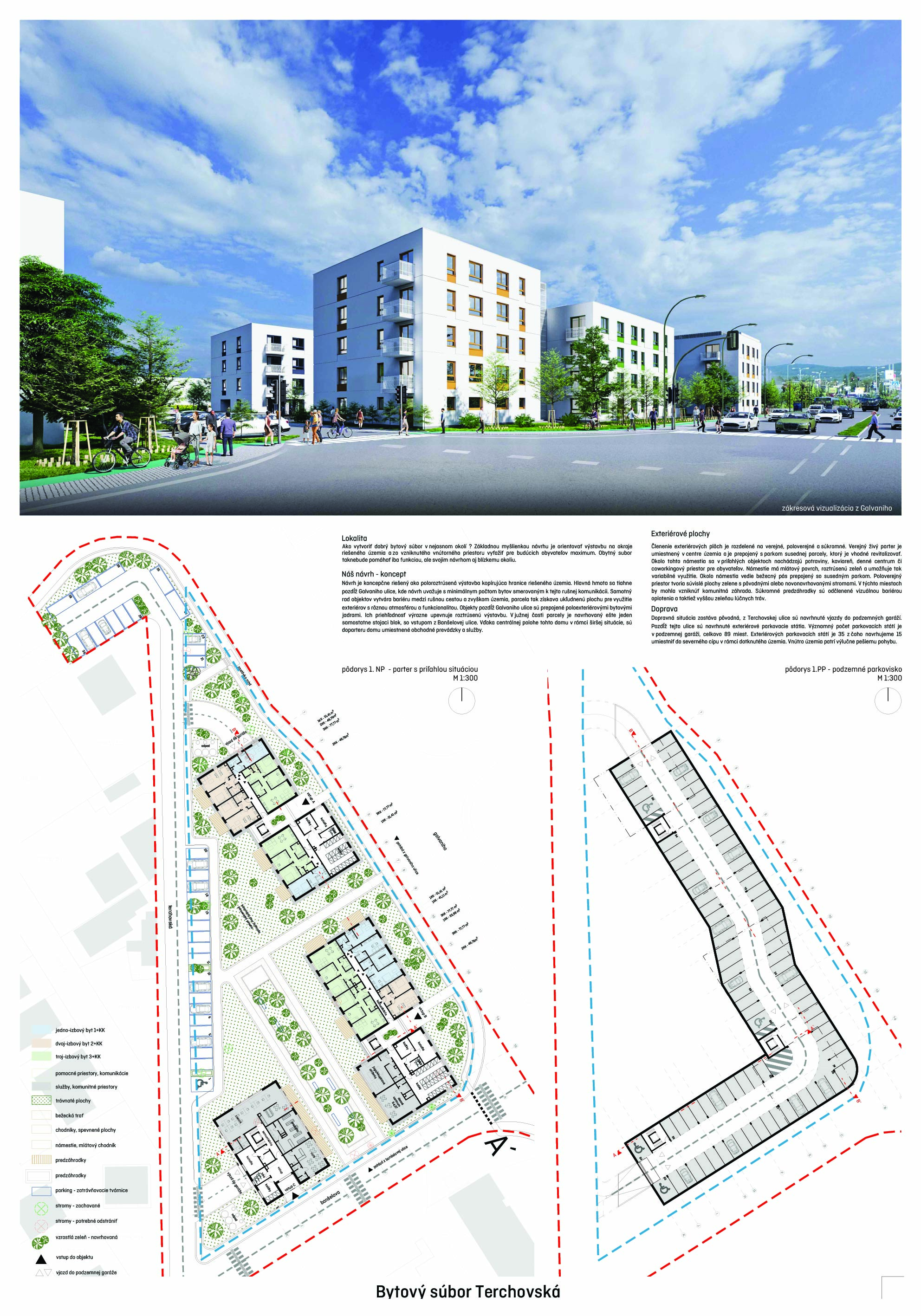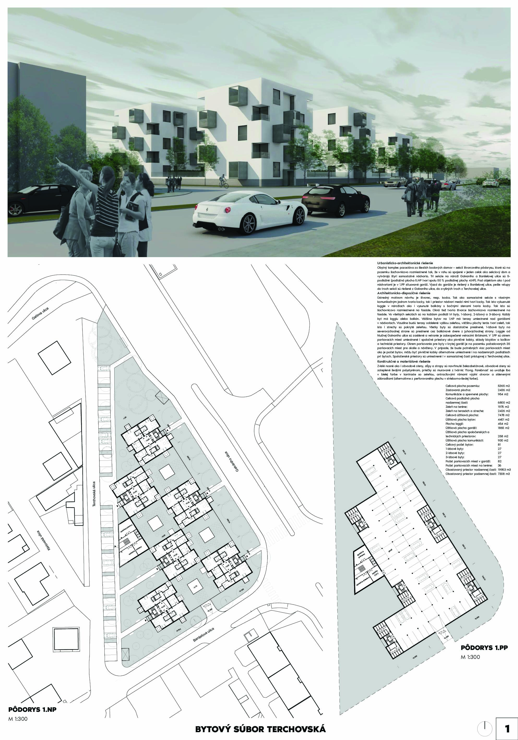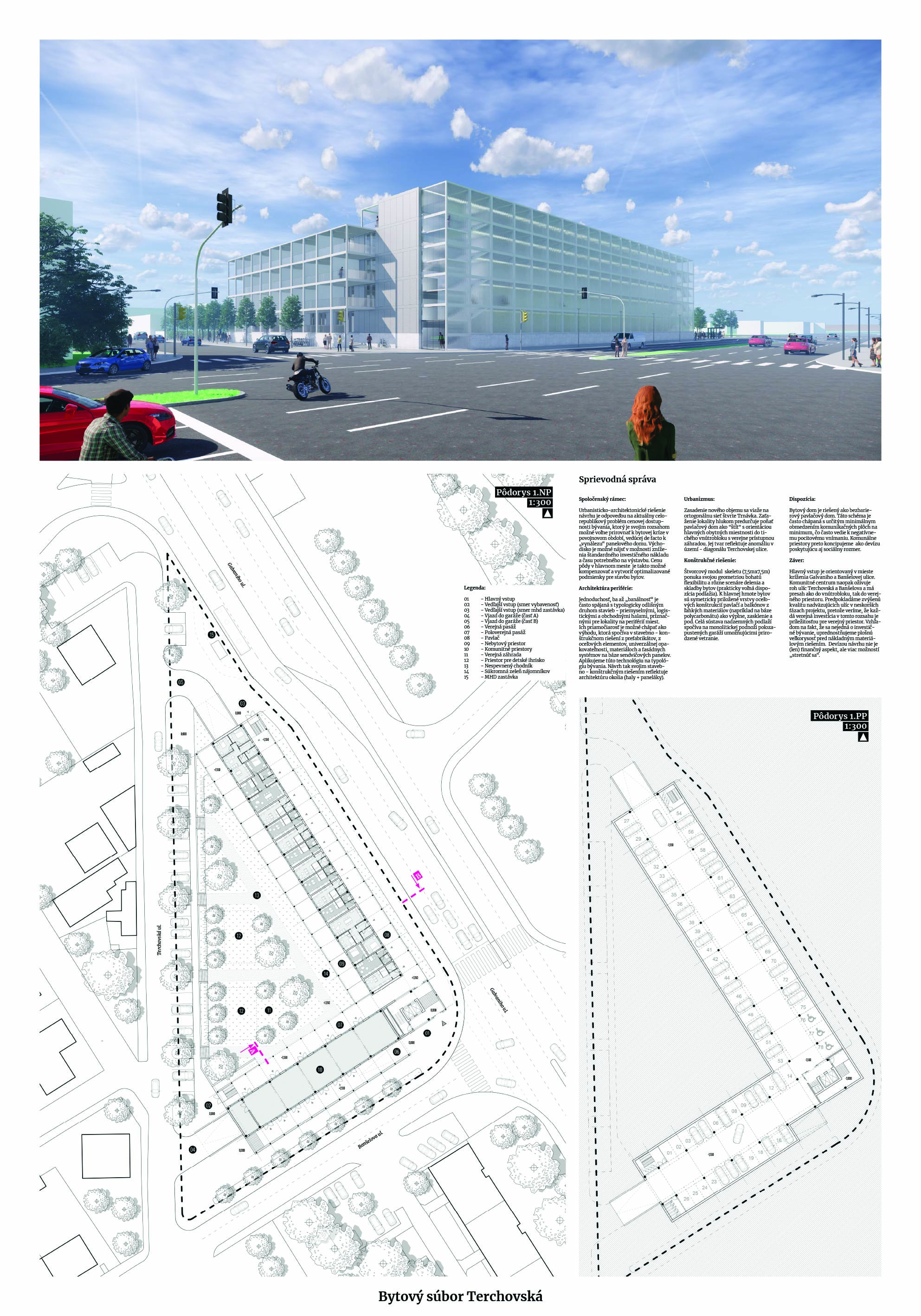 Pri víťaznom návrhu vyzdvihujeme predovšetkým vynikajúce urbanistické riešenie a citlivé začlenenie do územia. Bariérový pavlačový dom odtieňuje hluk z Galvaniho ulice a logicky dopĺňa rad štvorpodlažných panelových domov. Zároveň sa však ku koridoru Galvaniho ulice nestavia chrbtom, keď na oboch priečeliach autori umiestnili priestory vybavenosti. Správnosť tohto rozhodnutia potvrdzuje aj úprava a zvládnutie čelného priestoru pri križovatke Rožňavská - Galvaniho ulica. Skupina menších domov v západnej časti pozemku reaguje na mierku priľahlej zástavby a vytvára tak priepustné poloverejné priestory, ktoré nadväzujú na obdobné priestory medzi panelovými bytovými domami na juhovýchodnej strane Banšelovej ulice. Autori navyše vhodne umiestňujú vjazd do podzemnej halovej garáže do Banšelovej ulice, čím odľahčujú dynamickú dopravu v Terchovskej ulici a potvrdzujú jej status vedľajšej ukľudnenej slepej ulice.
