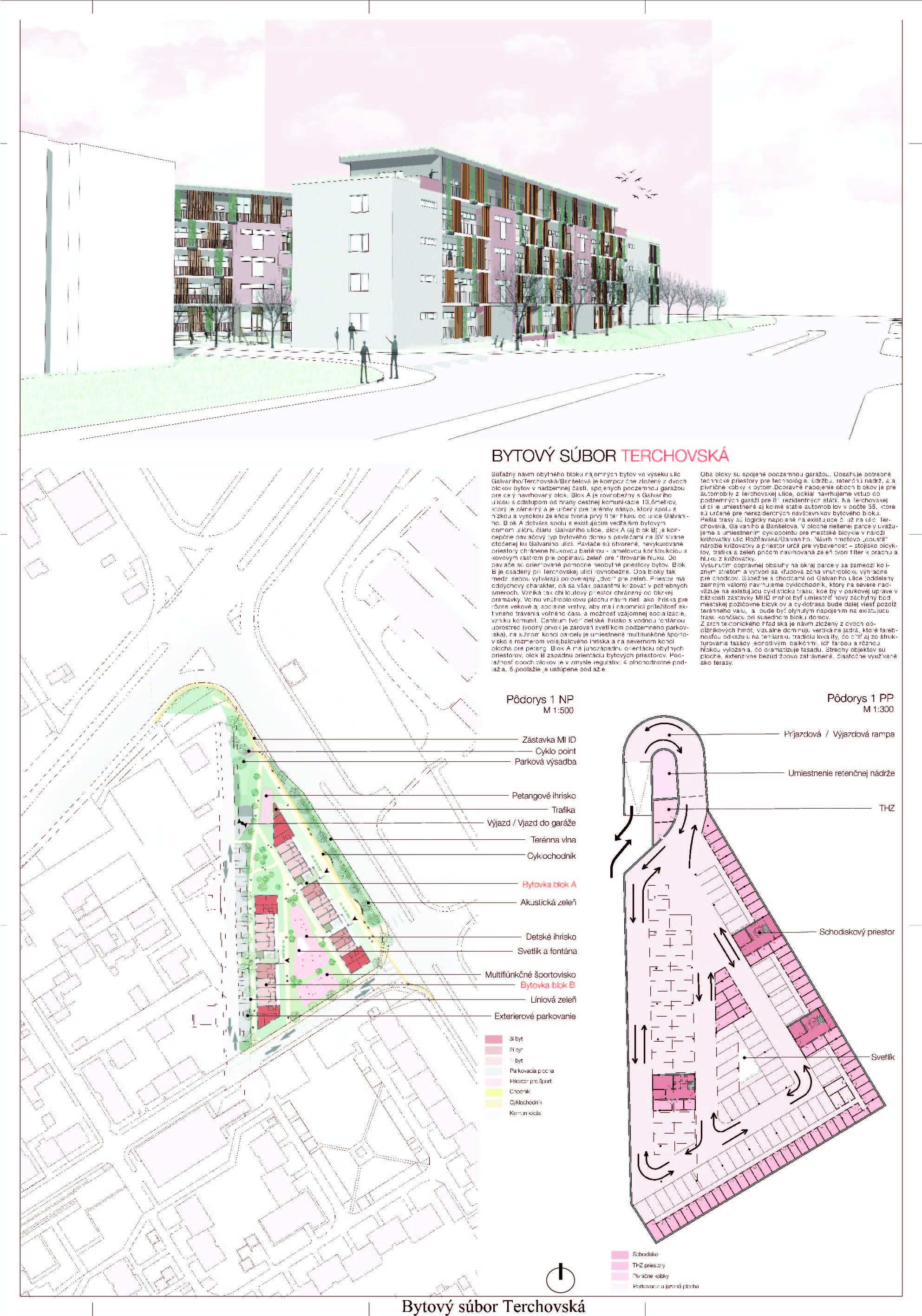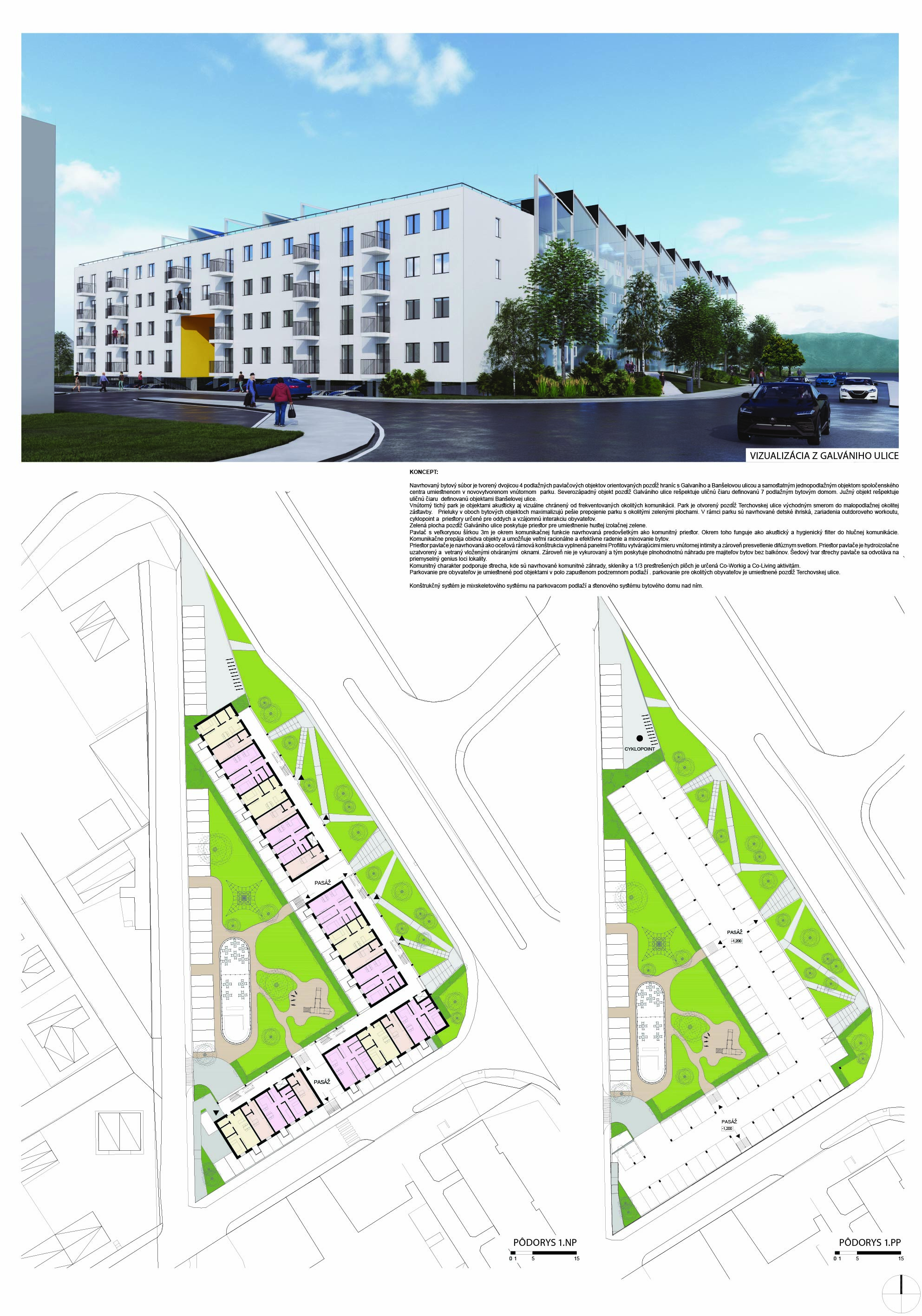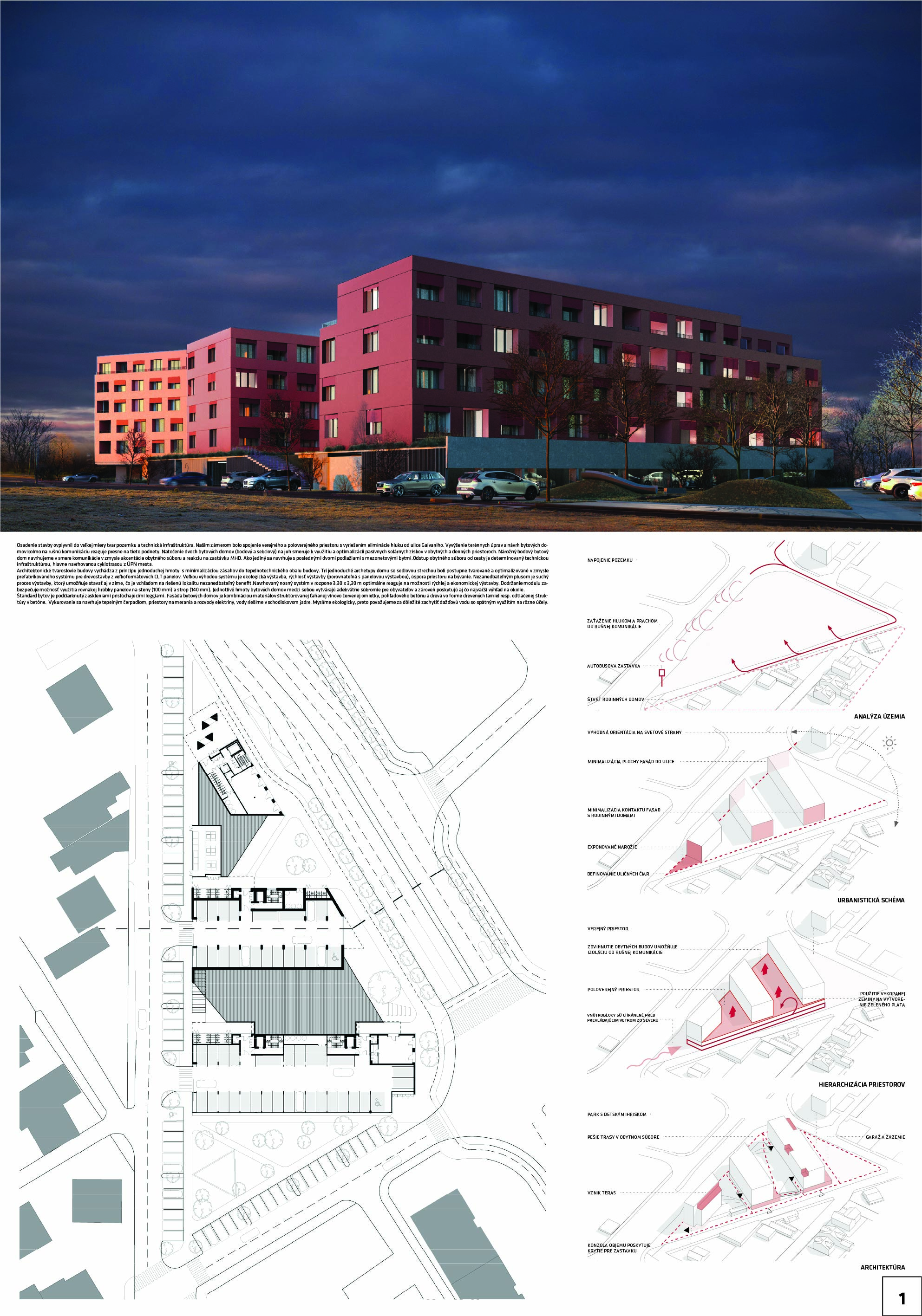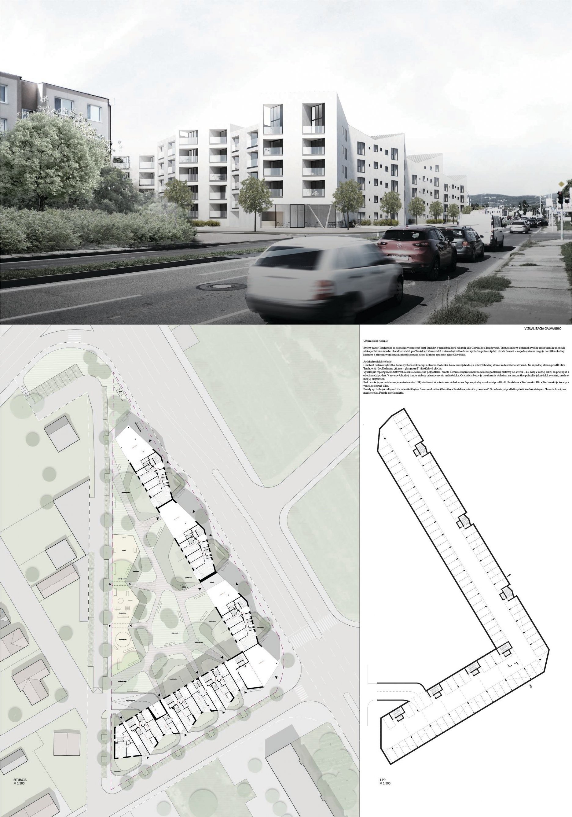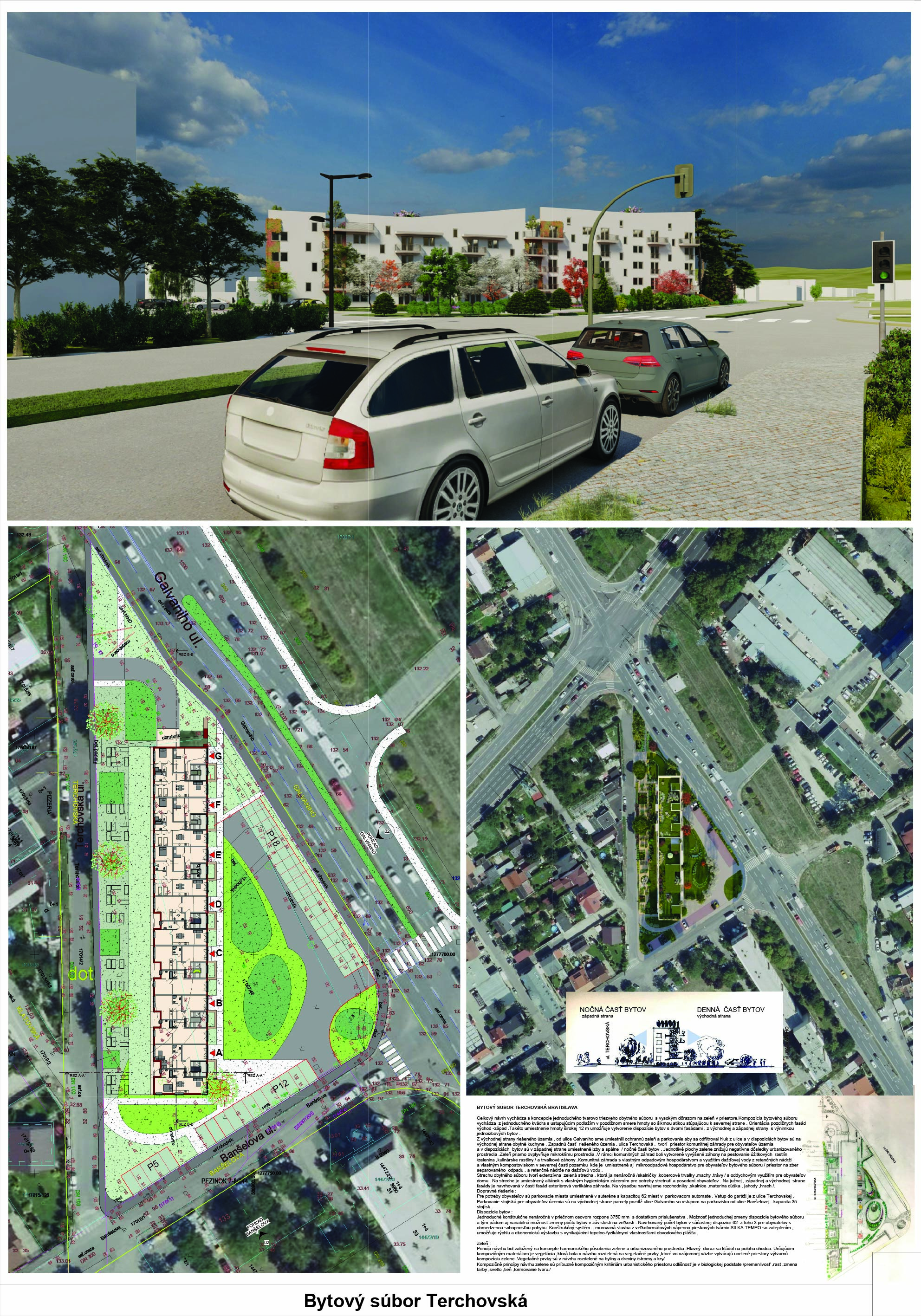 Pri víťaznom návrhu vyzdvihujeme predovšetkým vynikajúce urbanistické riešenie a citlivé začlenenie do územia. Bariérový pavlačový dom odtieňuje hluk z Galvaniho ulice a logicky dopĺňa rad štvorpodlažných panelových domov. Zároveň sa však ku koridoru Galvaniho ulice nestavia chrbtom, keď na oboch priečeliach autori umiestnili priestory vybavenosti. Správnosť tohto rozhodnutia potvrdzuje aj úprava a zvládnutie čelného priestoru pri križovatke Rožňavská - Galvaniho ulica. Skupina menších domov v západnej časti pozemku reaguje na mierku priľahlej zástavby a vytvára tak priepustné poloverejné priestory, ktoré nadväzujú na obdobné priestory medzi panelovými bytovými domami na juhovýchodnej strane Banšelovej ulice. Autori navyše vhodne umiestňujú vjazd do podzemnej halovej garáže do Banšelovej ulice, čím odľahčujú dynamickú dopravu v Terchovskej ulici a potvrdzujú jej status vedľajšej ukľudnenej slepej ulice.