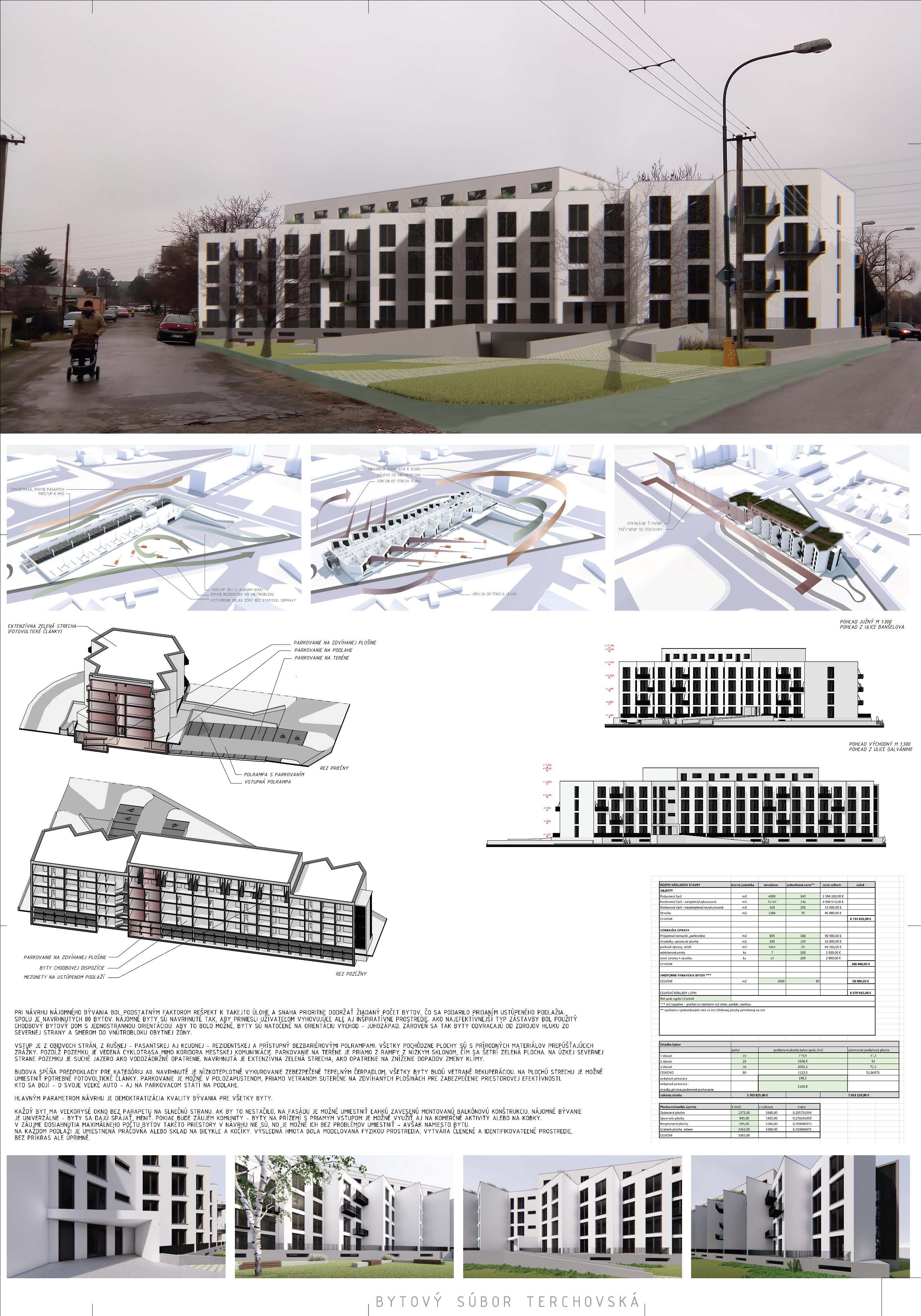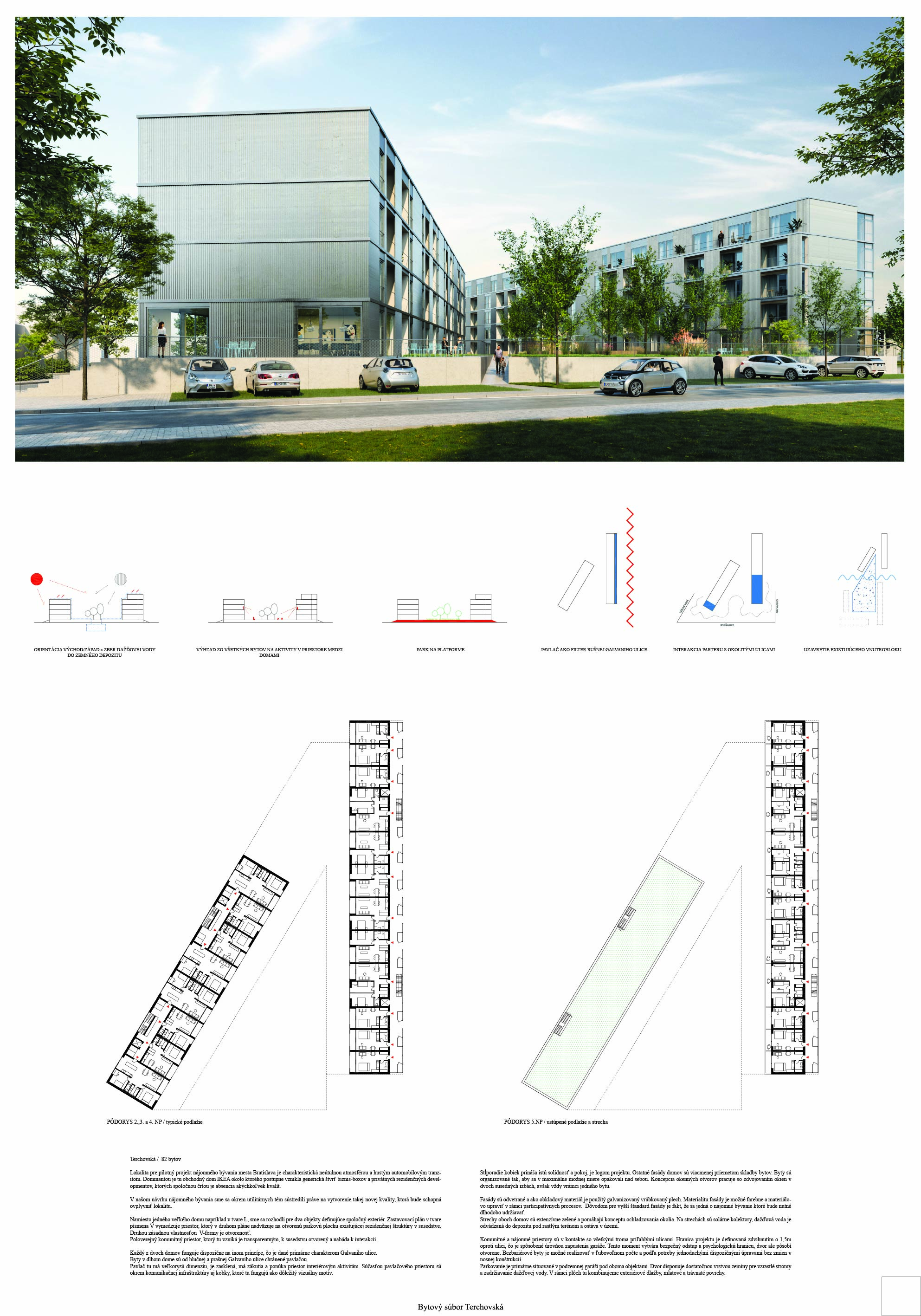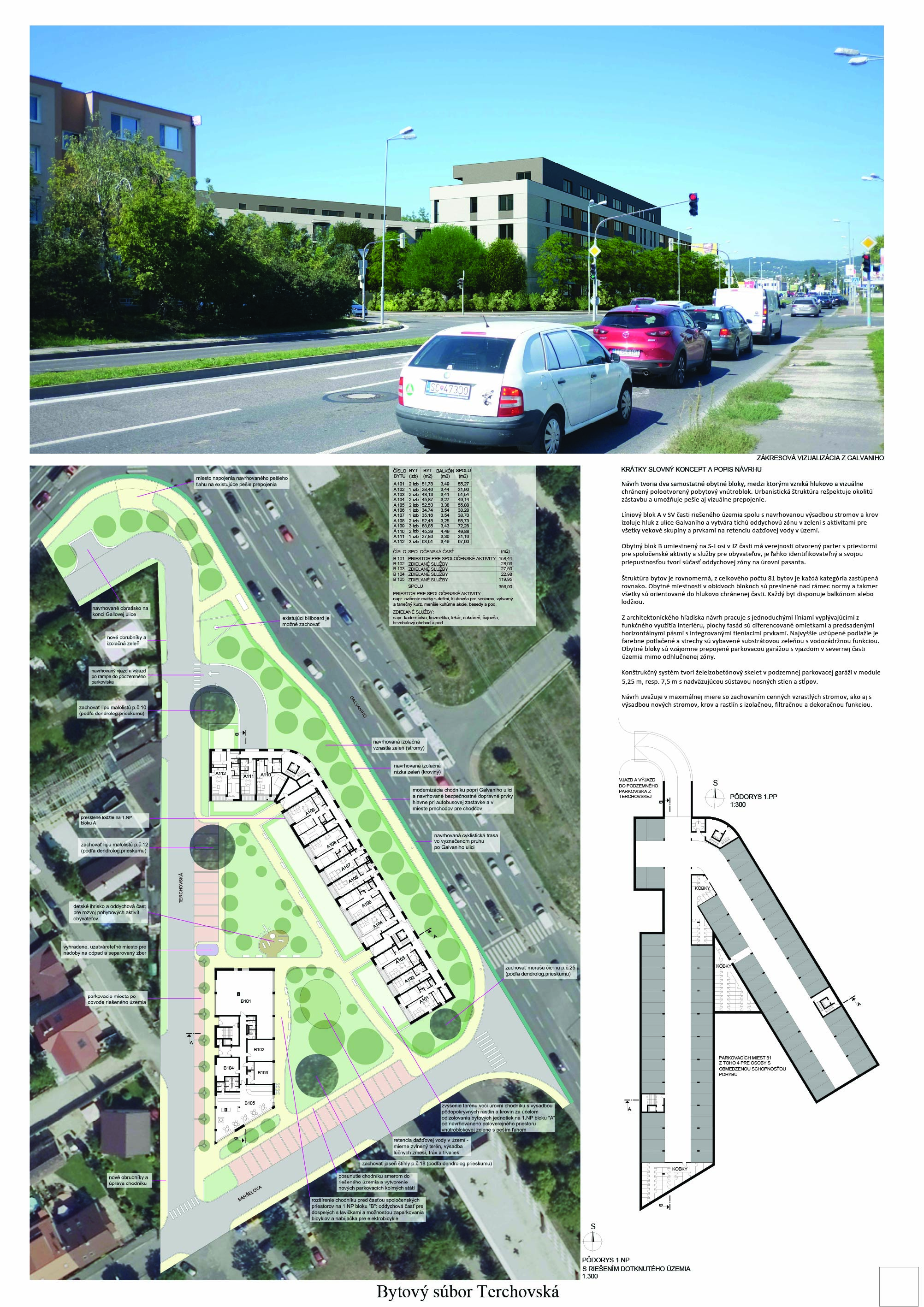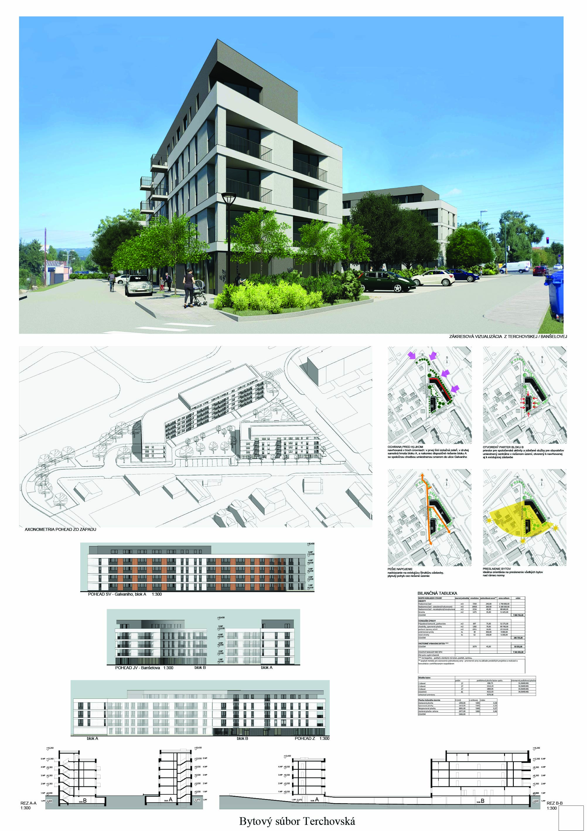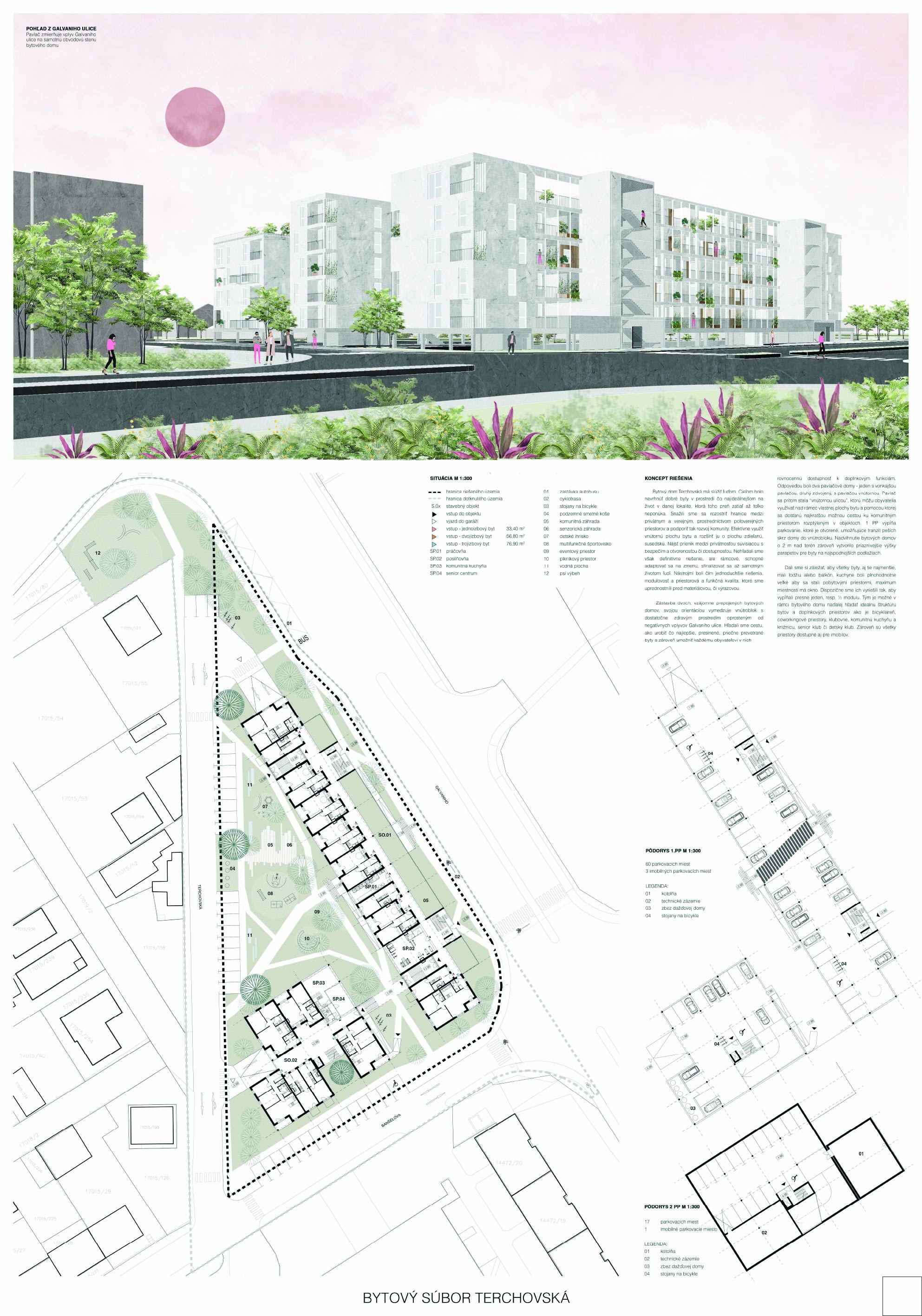 Pri víťaznom návrhu vyzdvihujeme predovšetkým vynikajúce urbanistické riešenie a citlivé začlenenie do územia. Bariérový pavlačový dom odtieňuje hluk z Galvaniho ulice a logicky dopĺňa rad štvorpodlažných panelových domov. Zároveň sa však ku koridoru Galvaniho ulice nestavia chrbtom, keď na oboch priečeliach autori umiestnili priestory vybavenosti. Správnosť tohto rozhodnutia potvrdzuje aj úprava a zvládnutie čelného priestoru pri križovatke Rožňavská - Galvaniho ulica. Skupina menších domov v západnej časti pozemku reaguje na mierku priľahlej zástavby a vytvára tak priepustné poloverejné priestory, ktoré nadväzujú na obdobné priestory medzi panelovými bytovými domami na juhovýchodnej strane Banšelovej ulice. Autori navyše vhodne umiestňujú vjazd do podzemnej halovej garáže do Banšelovej ulice, čím odľahčujú dynamickú dopravu v Terchovskej ulici a potvrdzujú jej status vedľajšej ukľudnenej slepej ulice.