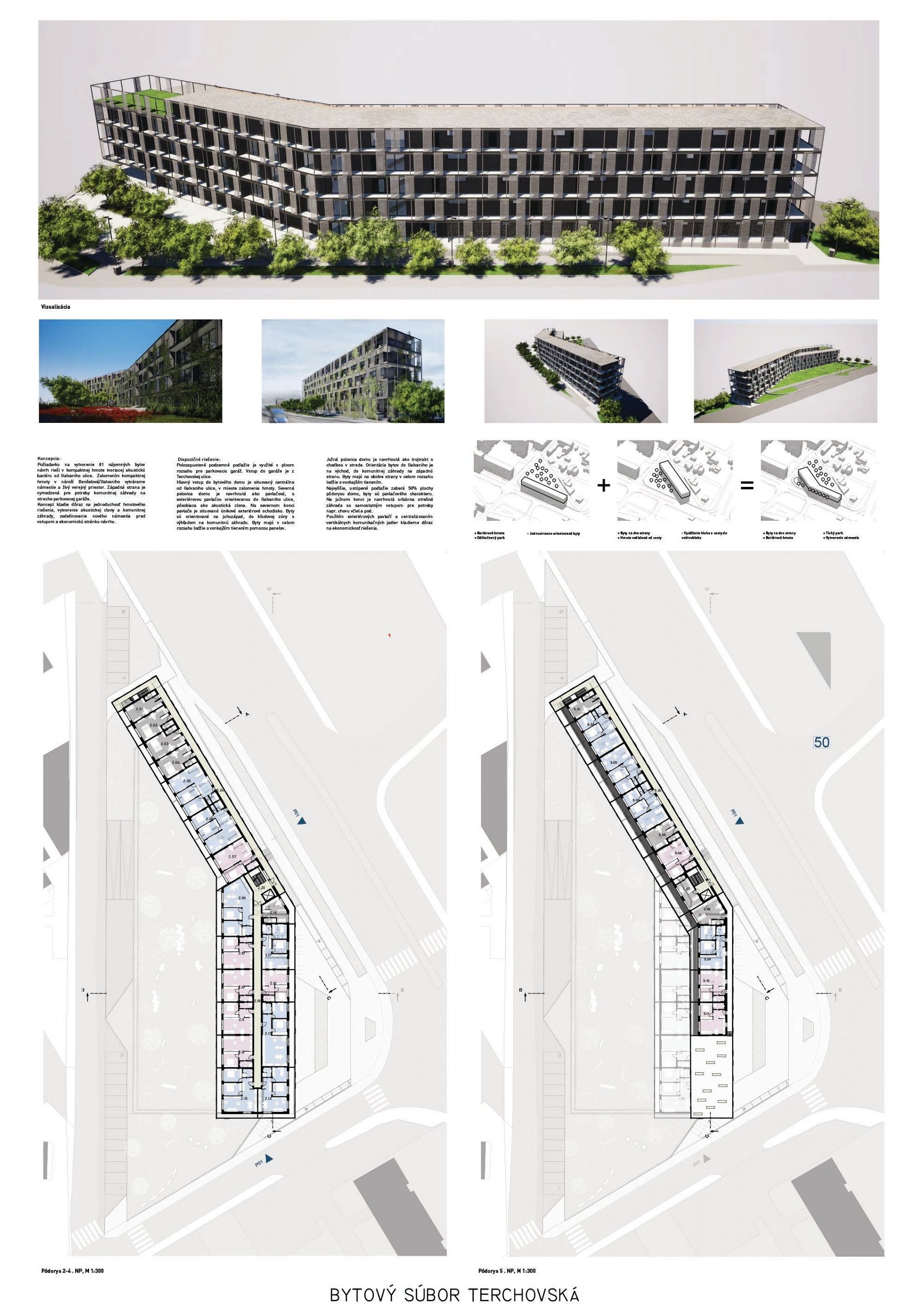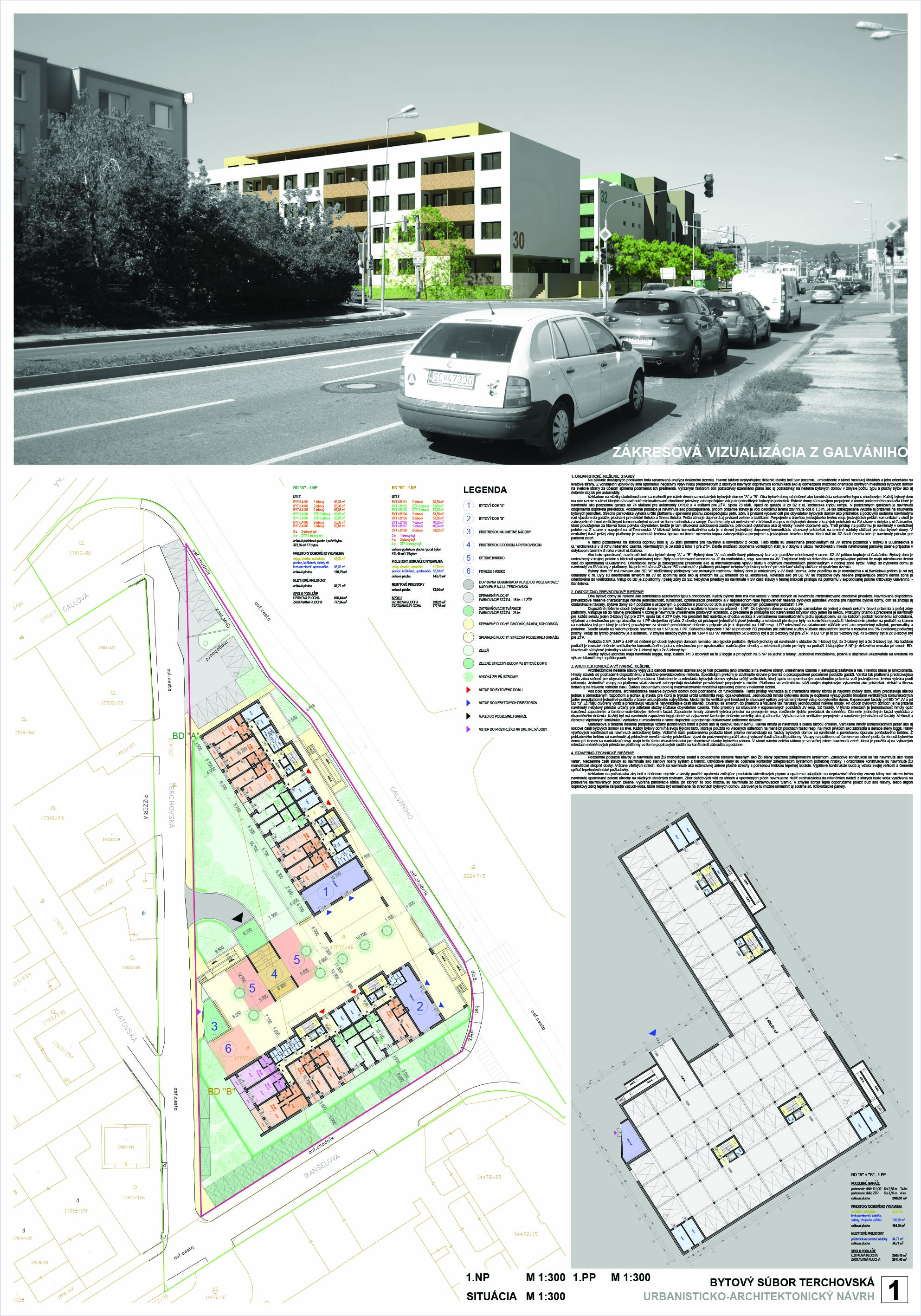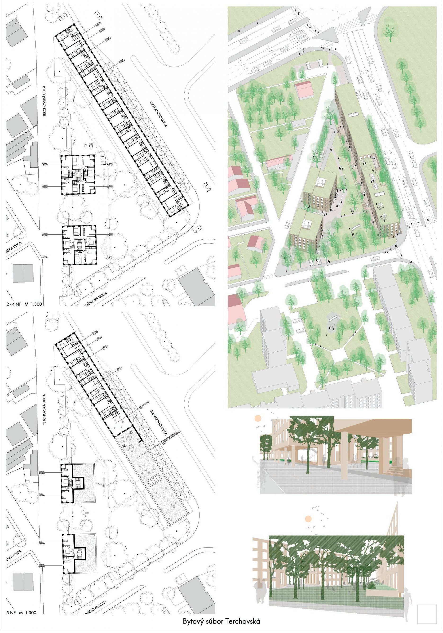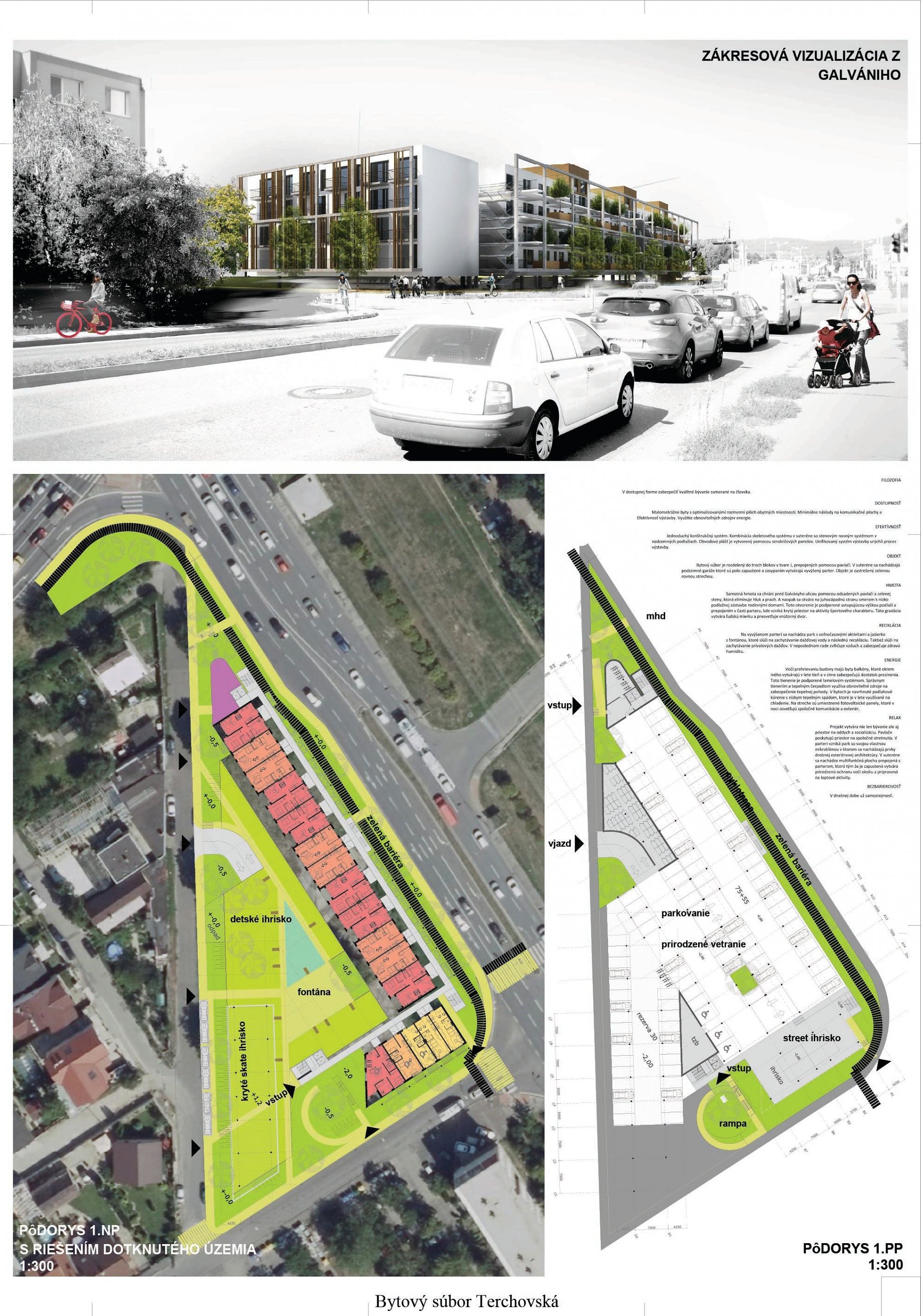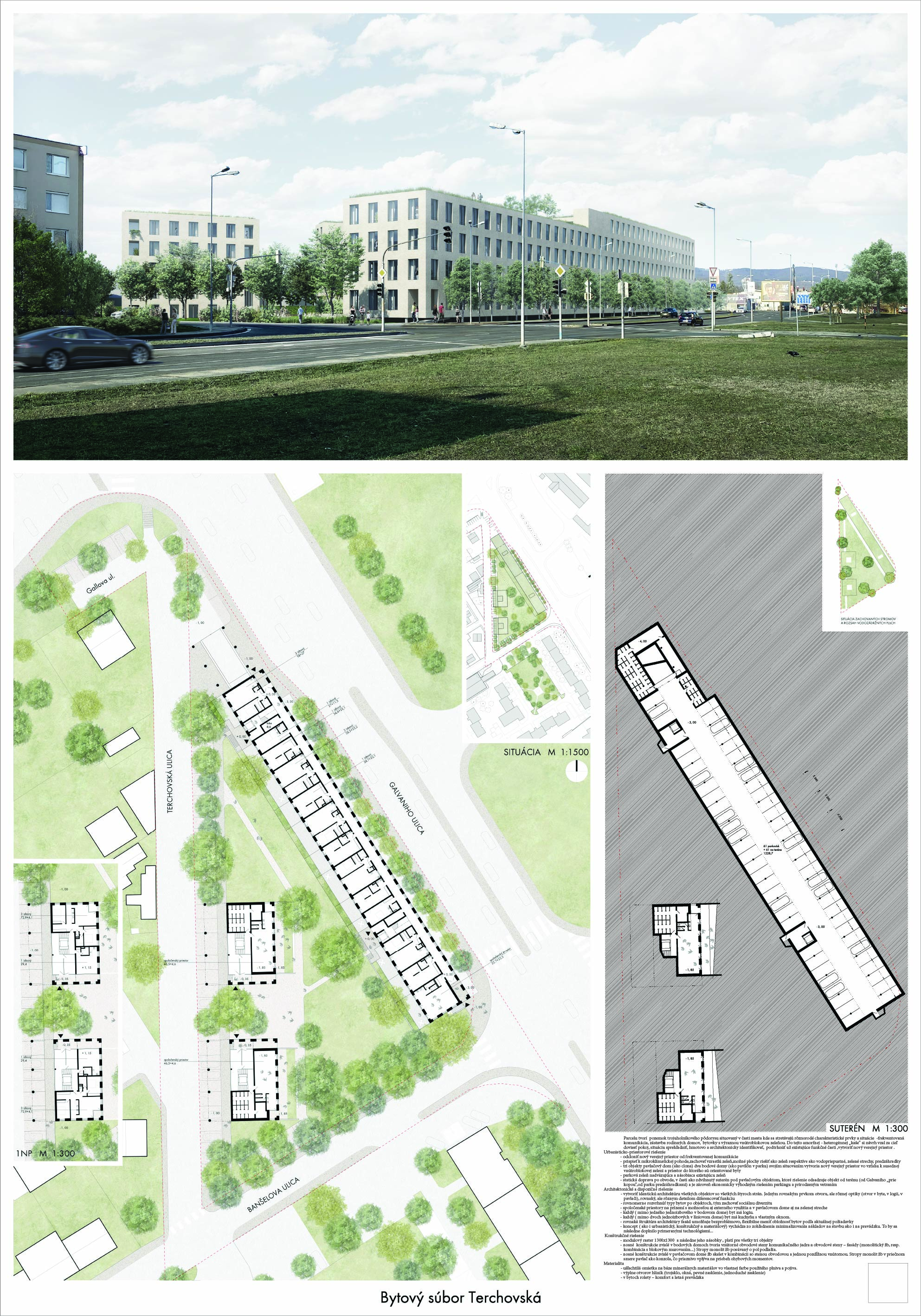 Pri víťaznom návrhu vyzdvihujeme predovšetkým vynikajúce urbanistické riešenie a citlivé začlenenie do územia. Bariérový pavlačový dom odtieňuje hluk z Galvaniho ulice a logicky dopĺňa rad štvorpodlažných panelových domov. Zároveň sa však ku koridoru Galvaniho ulice nestavia chrbtom, keď na oboch priečeliach autori umiestnili priestory vybavenosti. Správnosť tohto rozhodnutia potvrdzuje aj úprava a zvládnutie čelného priestoru pri križovatke Rožňavská - Galvaniho ulica. Skupina menších domov v západnej časti pozemku reaguje na mierku priľahlej zástavby a vytvára tak priepustné poloverejné priestory, ktoré nadväzujú na obdobné priestory medzi panelovými bytovými domami na juhovýchodnej strane Banšelovej ulice. Autori navyše vhodne umiestňujú vjazd do podzemnej halovej garáže do Banšelovej ulice, čím odľahčujú dynamickú dopravu v Terchovskej ulici a potvrdzujú jej status vedľajšej ukľudnenej slepej ulice.