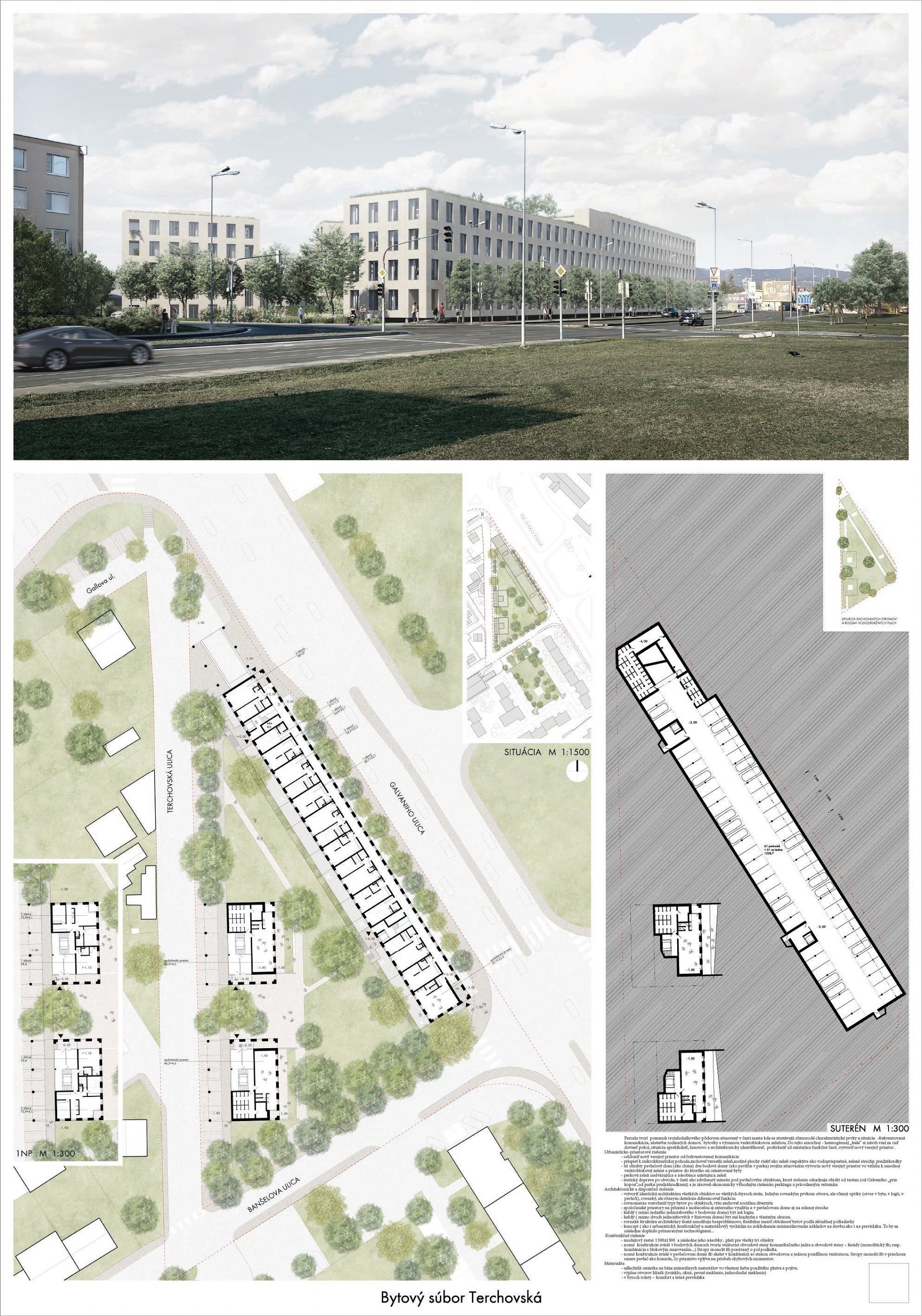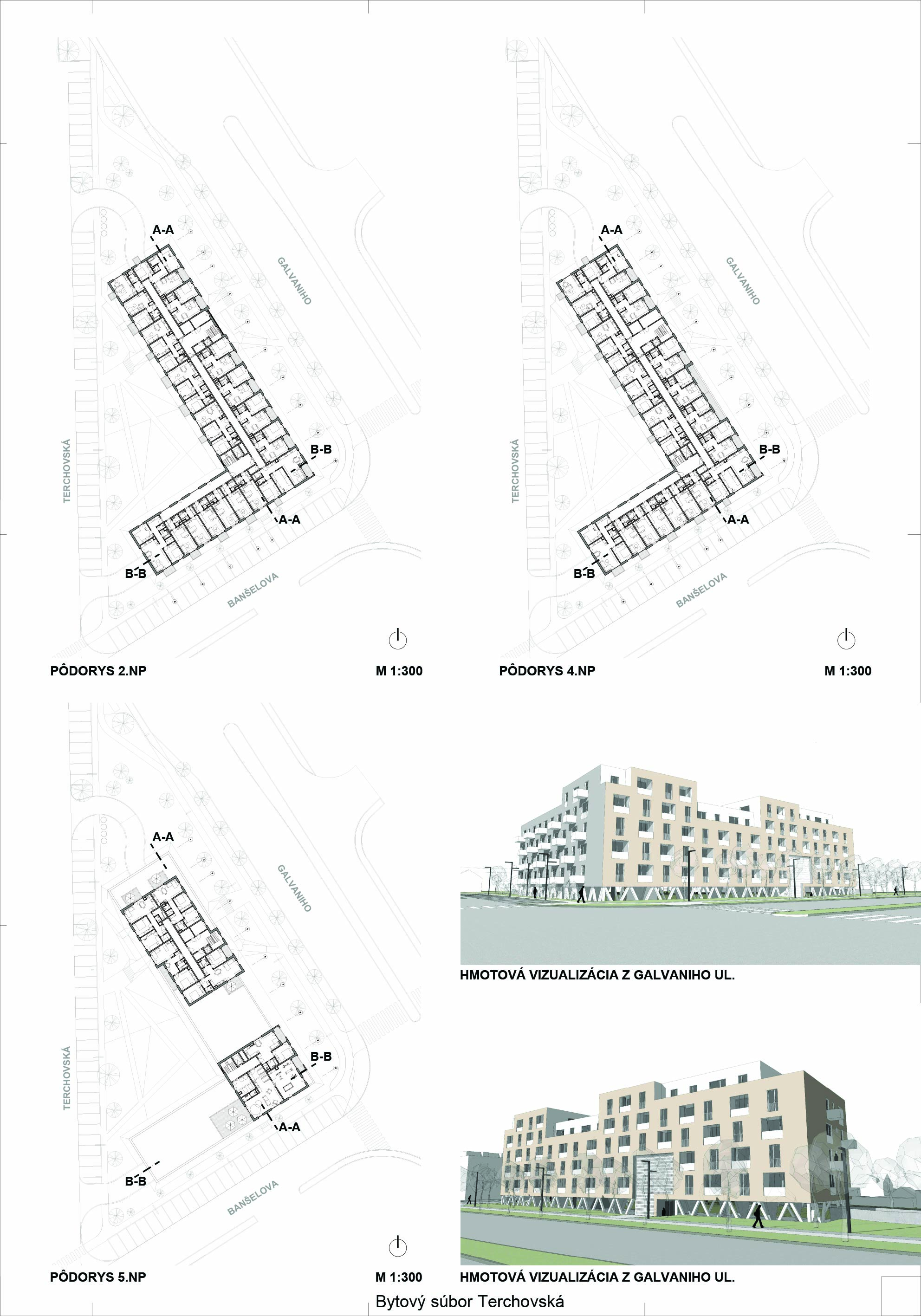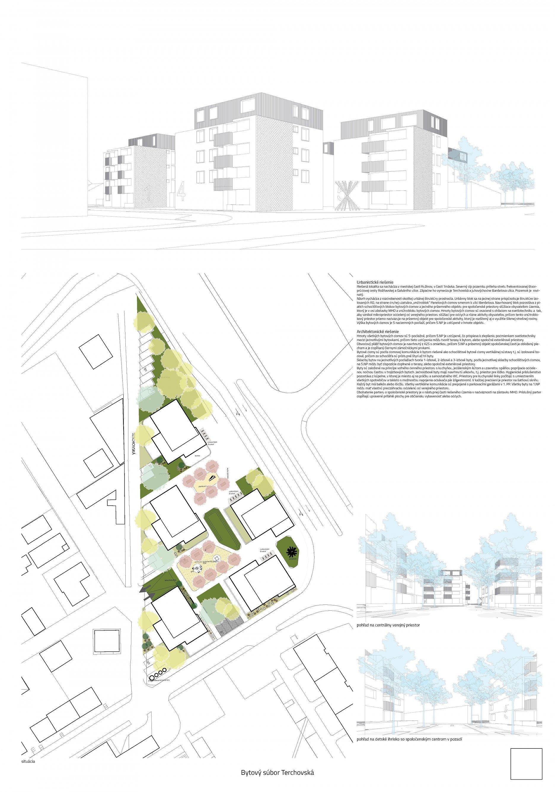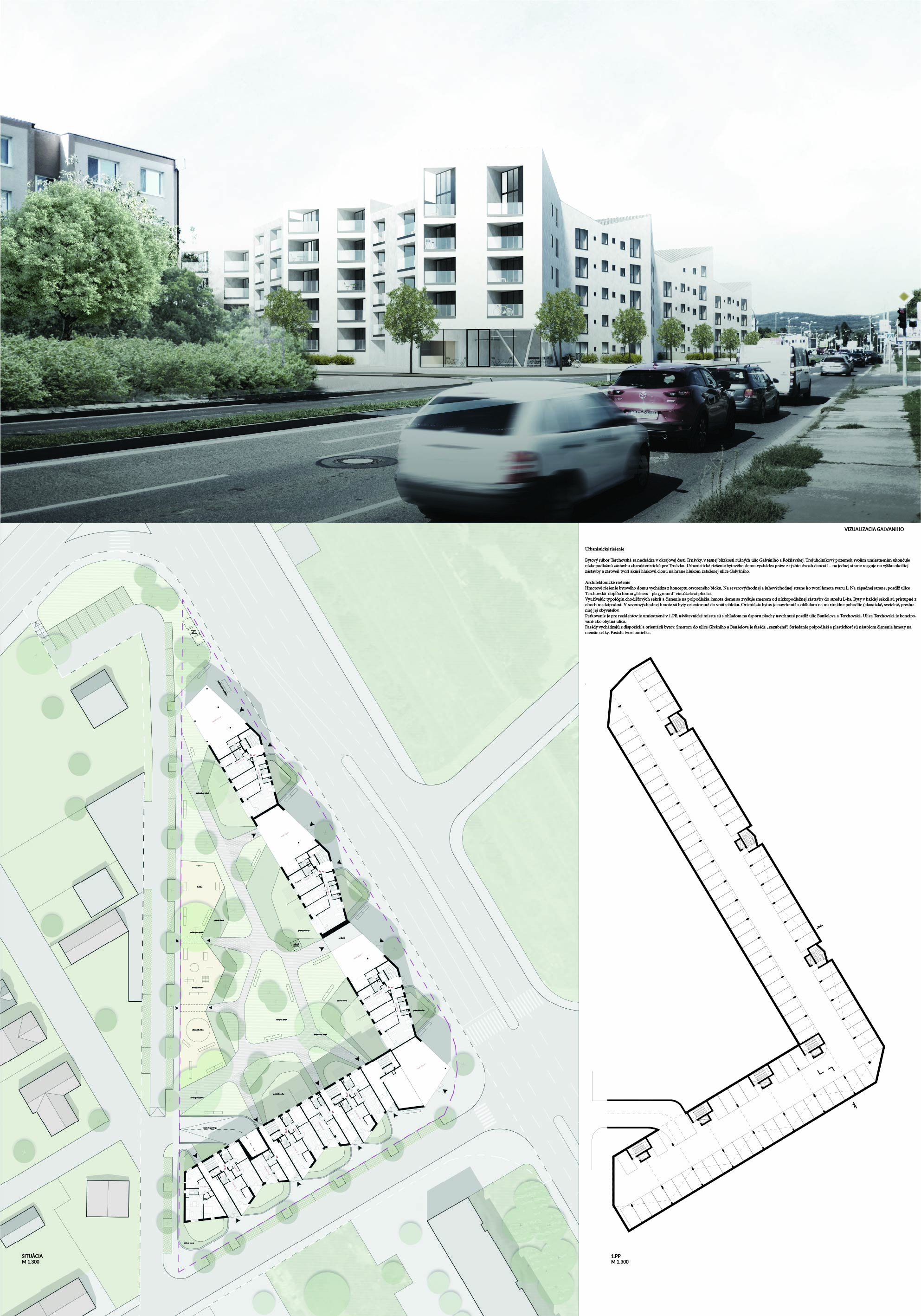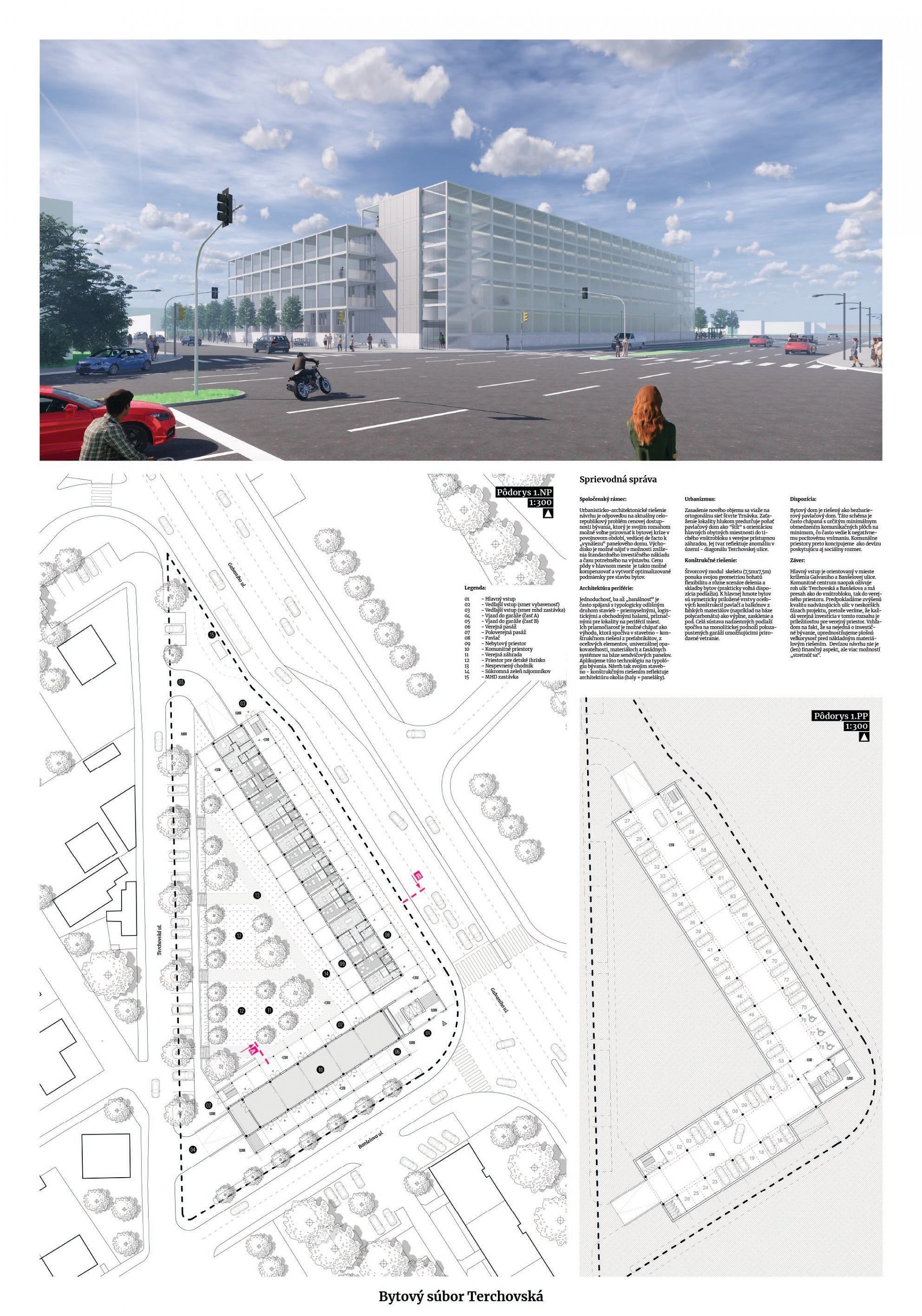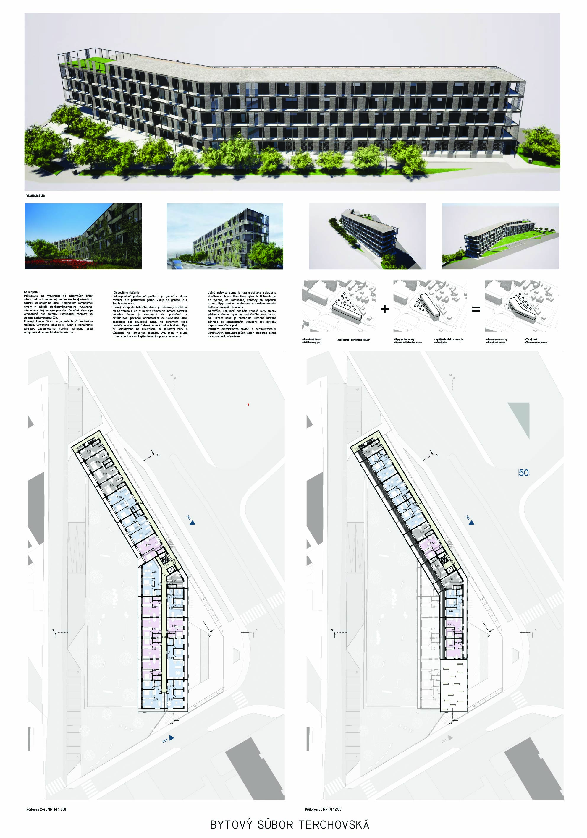 Pri víťaznom návrhu vyzdvihujeme predovšetkým vynikajúce urbanistické riešenie a citlivé začlenenie do územia. Bariérový pavlačový dom odtieňuje hluk z Galvaniho ulice a logicky dopĺňa rad štvorpodlažných panelových domov. Zároveň sa však ku koridoru Galvaniho ulice nestavia chrbtom, keď na oboch priečeliach autori umiestnili priestory vybavenosti. Správnosť tohto rozhodnutia potvrdzuje aj úprava a zvládnutie čelného priestoru pri križovatke Rožňavská - Galvaniho ulica. Skupina menších domov v západnej časti pozemku reaguje na mierku priľahlej zástavby a vytvára tak priepustné poloverejné priestory, ktoré nadväzujú na obdobné priestory medzi panelovými bytovými domami na juhovýchodnej strane Banšelovej ulice. Autori navyše vhodne umiestňujú vjazd do podzemnej halovej garáže do Banšelovej ulice, čím odľahčujú dynamickú dopravu v Terchovskej ulici a potvrdzujú jej status vedľajšej ukľudnenej slepej ulice.
