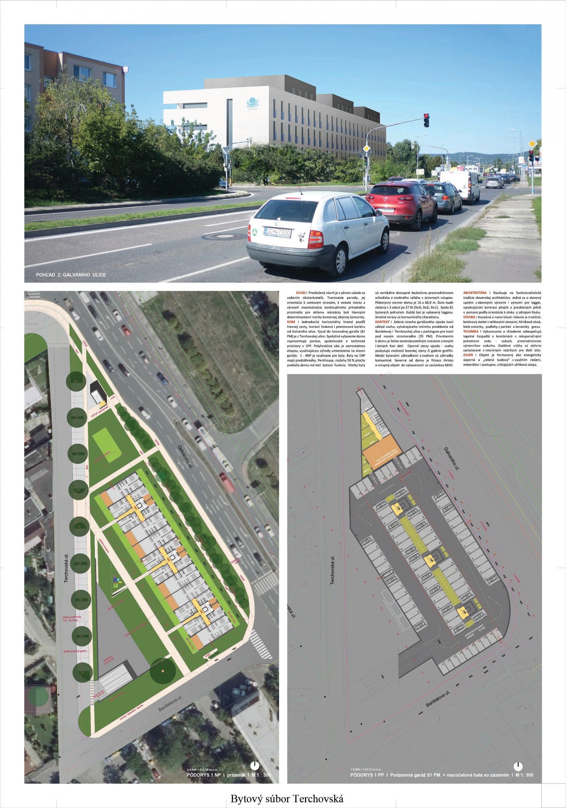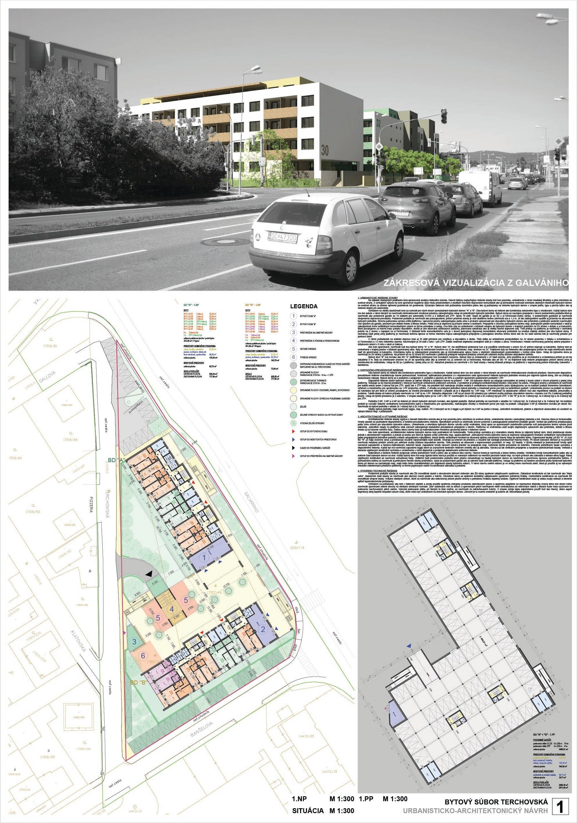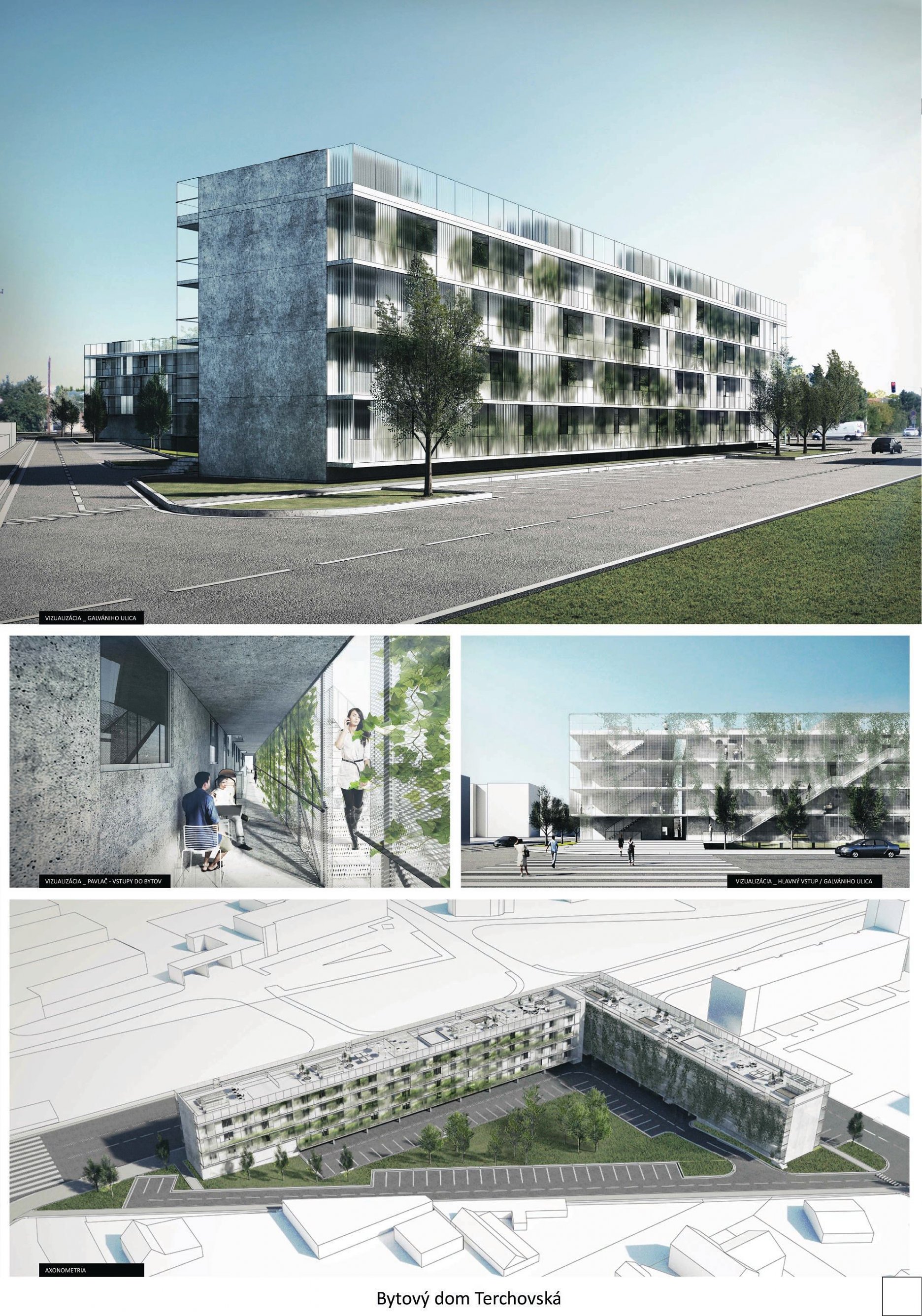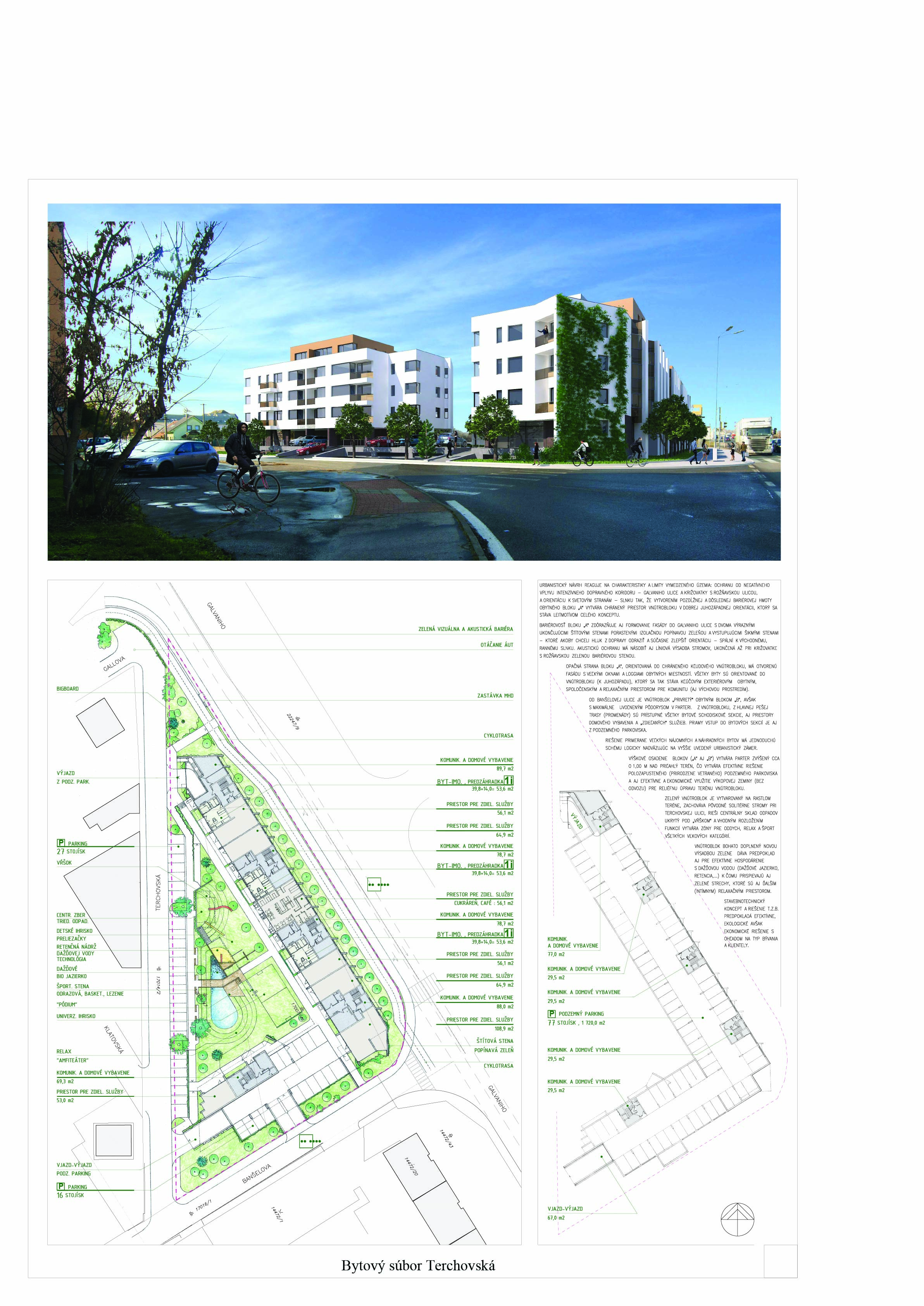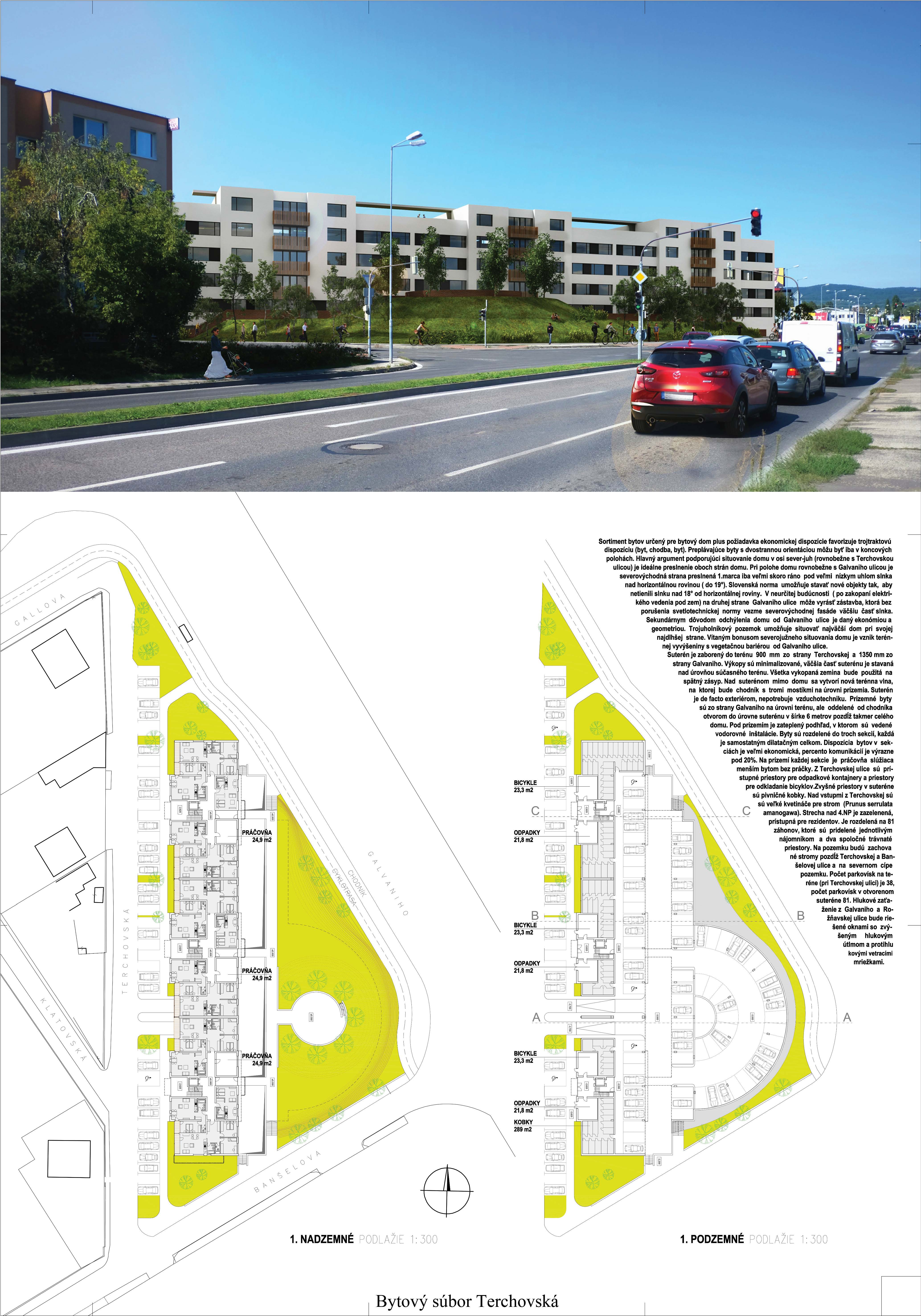 Pri víťaznom návrhu vyzdvihujeme predovšetkým vynikajúce urbanistické riešenie a citlivé začlenenie do územia. Bariérový pavlačový dom odtieňuje hluk z Galvaniho ulice a logicky dopĺňa rad štvorpodlažných panelových domov. Zároveň sa však ku koridoru Galvaniho ulice nestavia chrbtom, keď na oboch priečeliach autori umiestnili priestory vybavenosti. Správnosť tohto rozhodnutia potvrdzuje aj úprava a zvládnutie čelného priestoru pri križovatke Rožňavská - Galvaniho ulica. Skupina menších domov v západnej časti pozemku reaguje na mierku priľahlej zástavby a vytvára tak priepustné poloverejné priestory, ktoré nadväzujú na obdobné priestory medzi panelovými bytovými domami na juhovýchodnej strane Banšelovej ulice. Autori navyše vhodne umiestňujú vjazd do podzemnej halovej garáže do Banšelovej ulice, čím odľahčujú dynamickú dopravu v Terchovskej ulici a potvrdzujú jej status vedľajšej ukľudnenej slepej ulice.