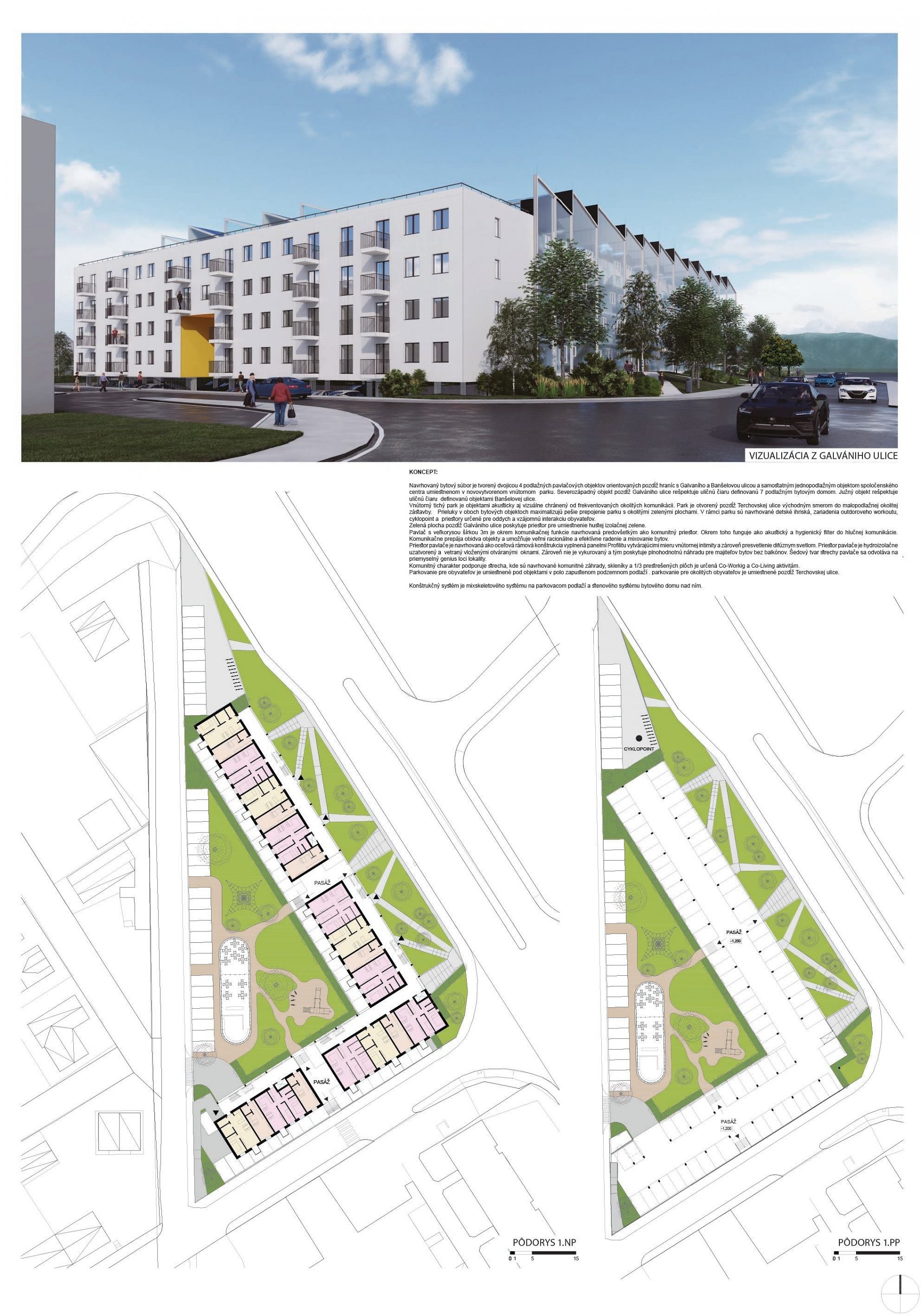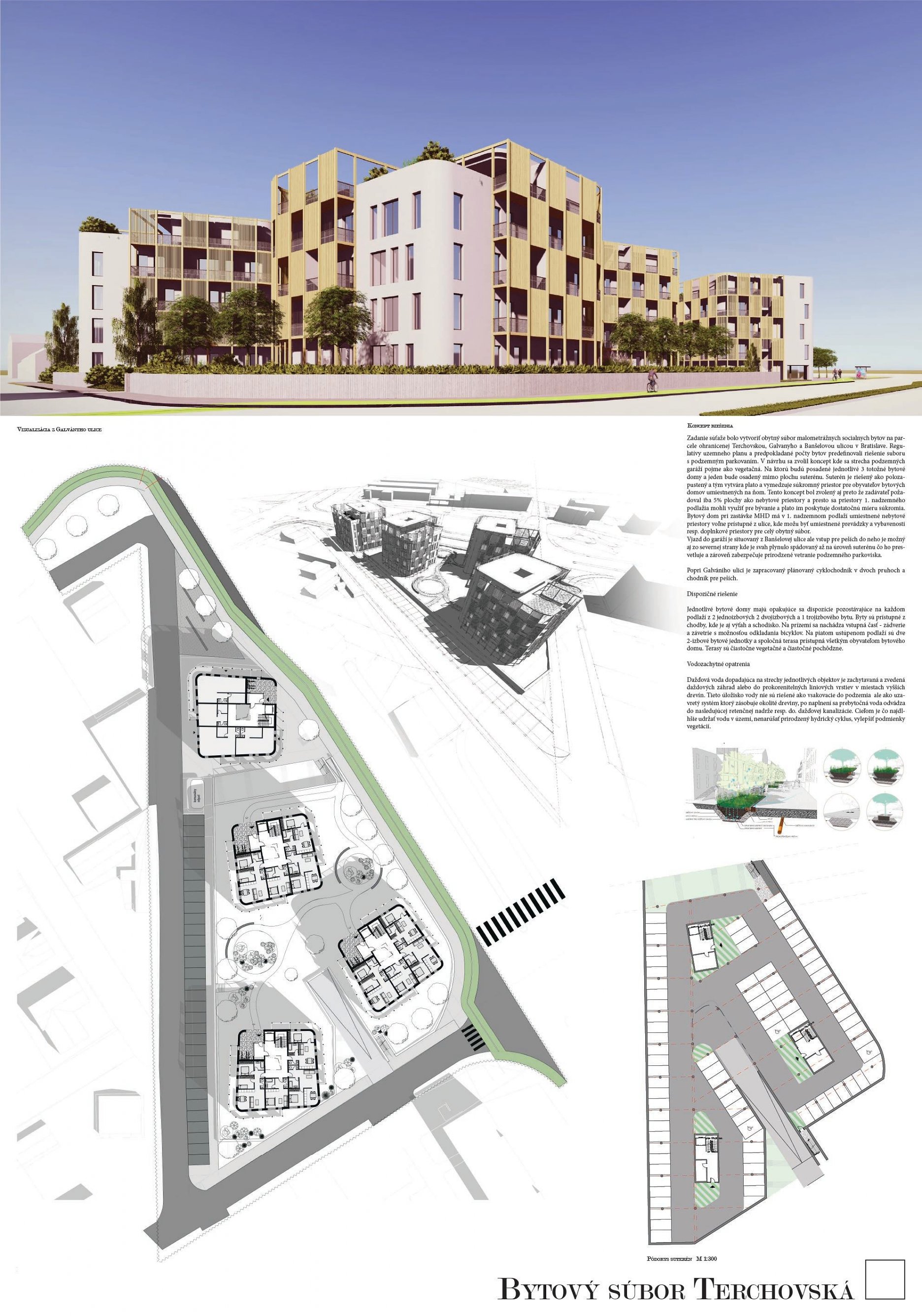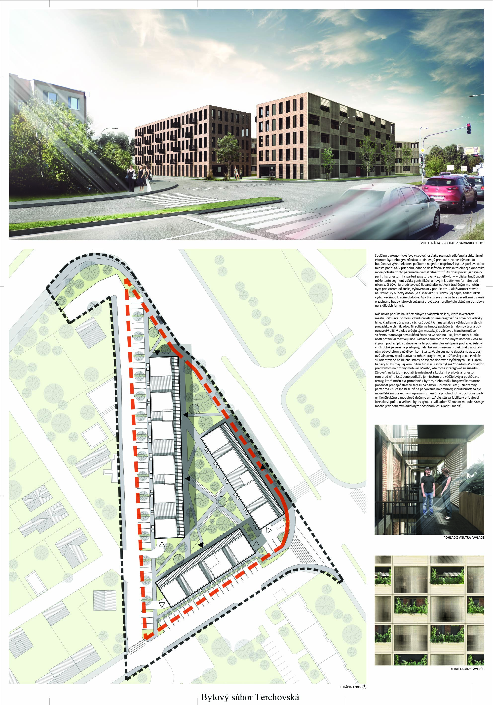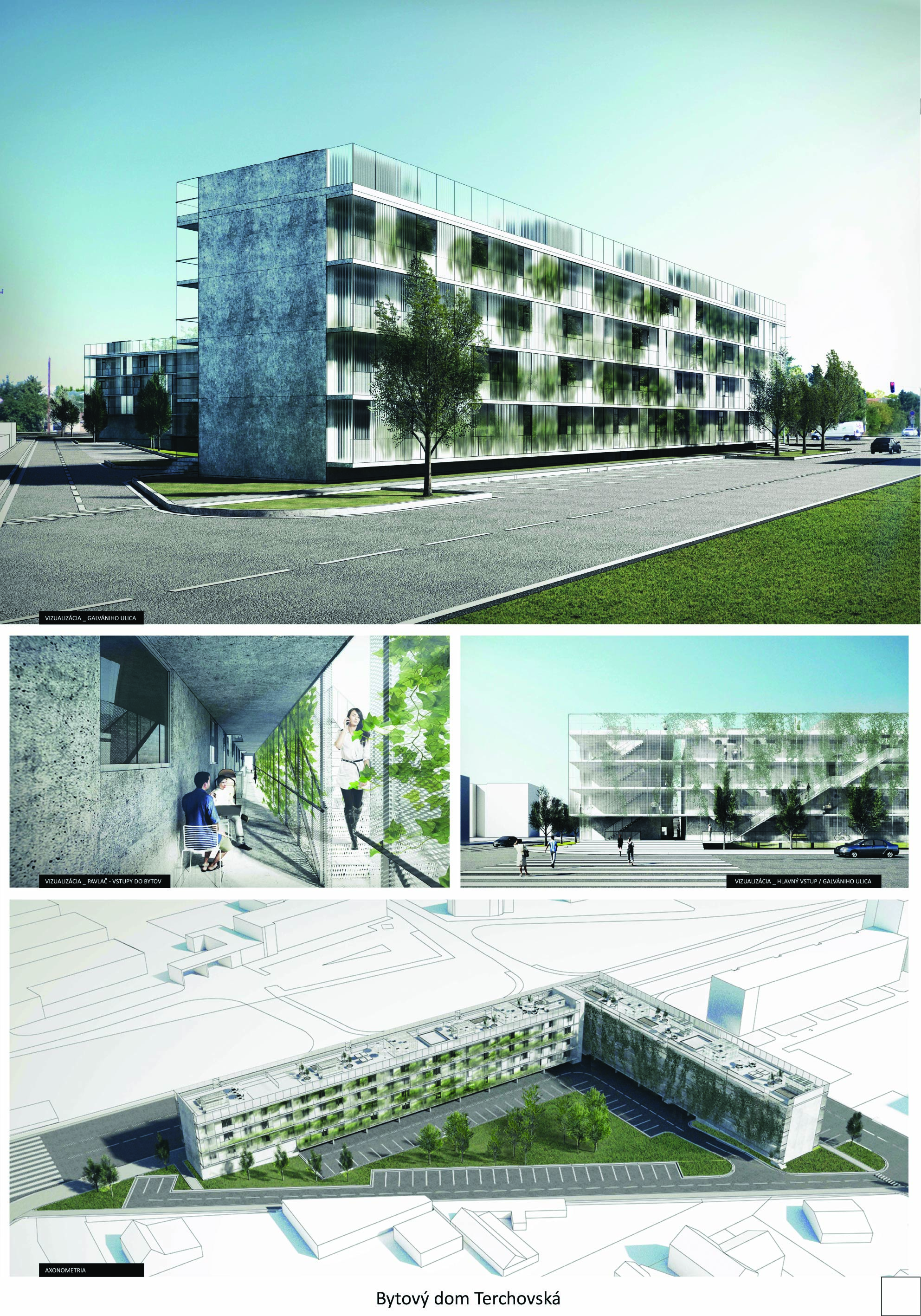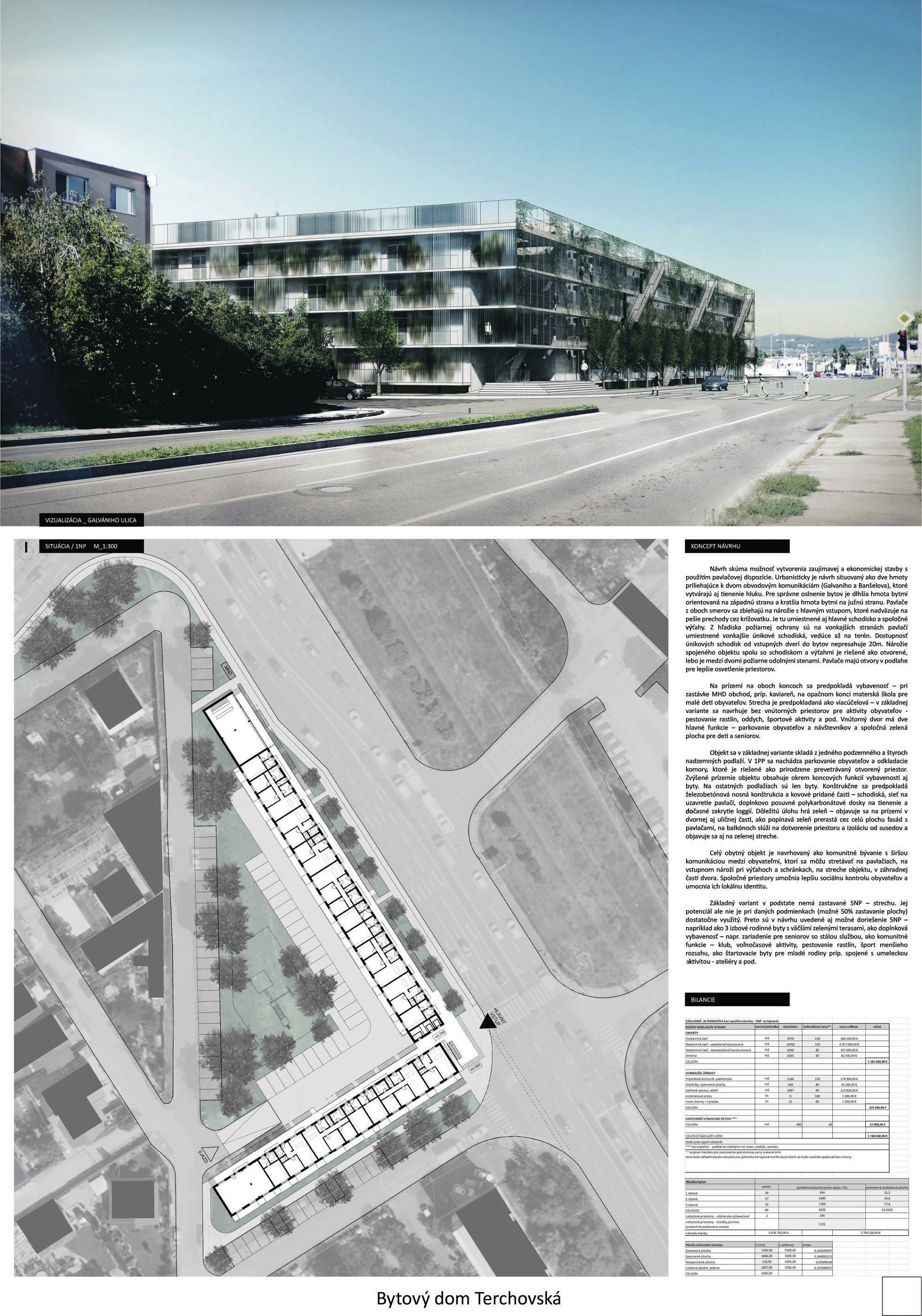 Pri víťaznom návrhu vyzdvihujeme predovšetkým vynikajúce urbanistické riešenie a citlivé začlenenie do územia. Bariérový pavlačový dom odtieňuje hluk z Galvaniho ulice a logicky dopĺňa rad štvorpodlažných panelových domov. Zároveň sa však ku koridoru Galvaniho ulice nestavia chrbtom, keď na oboch priečeliach autori umiestnili priestory vybavenosti. Správnosť tohto rozhodnutia potvrdzuje aj úprava a zvládnutie čelného priestoru pri križovatke Rožňavská - Galvaniho ulica. Skupina menších domov v západnej časti pozemku reaguje na mierku priľahlej zástavby a vytvára tak priepustné poloverejné priestory, ktoré nadväzujú na obdobné priestory medzi panelovými bytovými domami na juhovýchodnej strane Banšelovej ulice. Autori navyše vhodne umiestňujú vjazd do podzemnej halovej garáže do Banšelovej ulice, čím odľahčujú dynamickú dopravu v Terchovskej ulici a potvrdzujú jej status vedľajšej ukľudnenej slepej ulice.