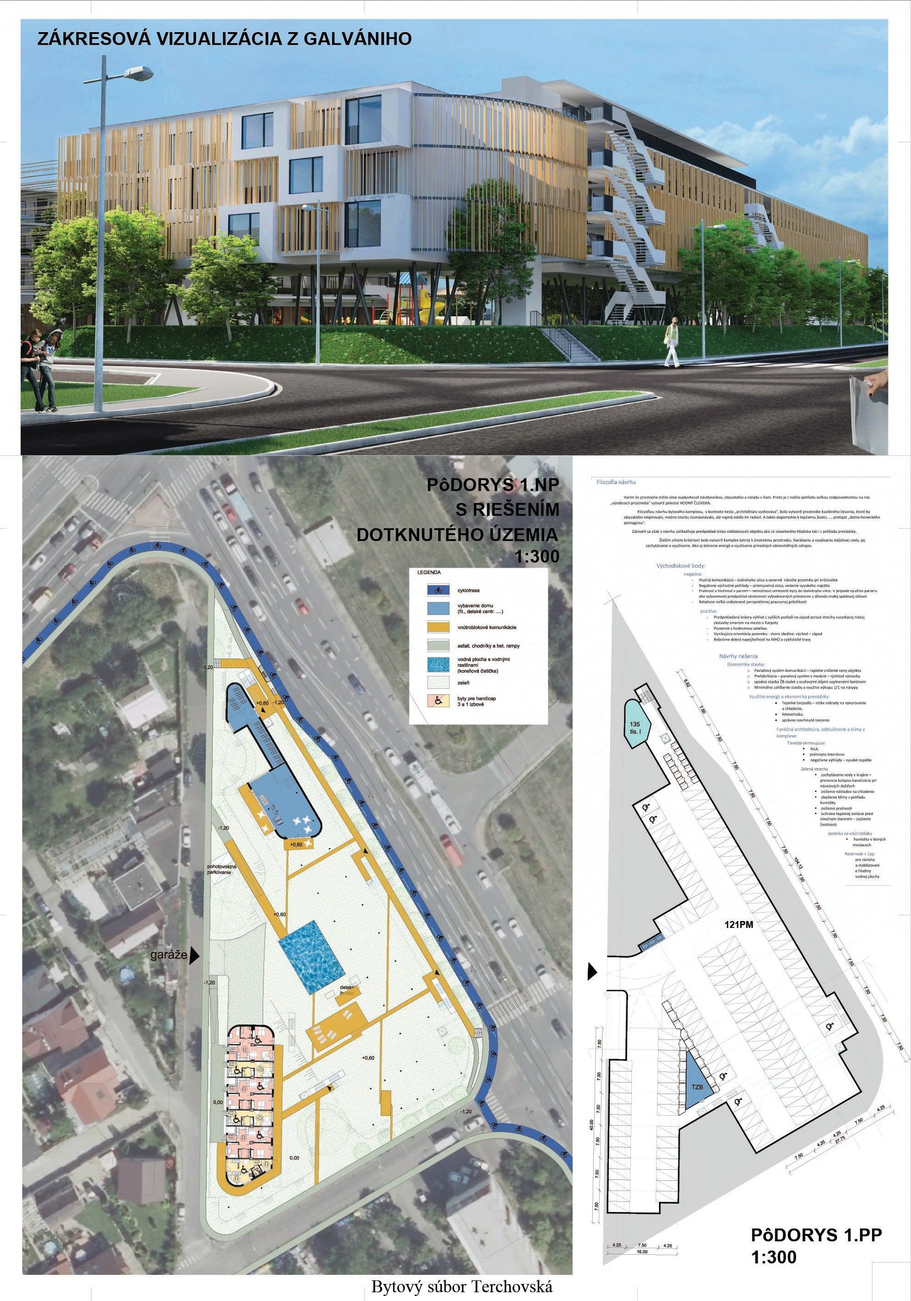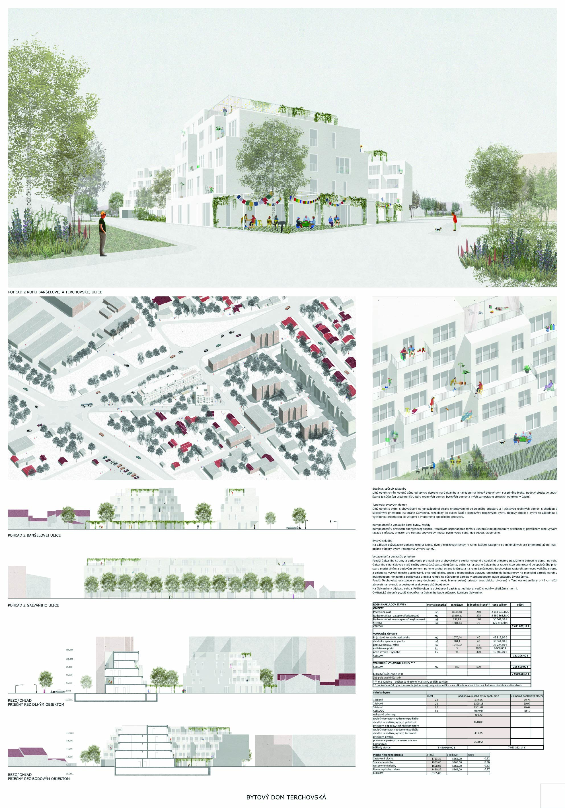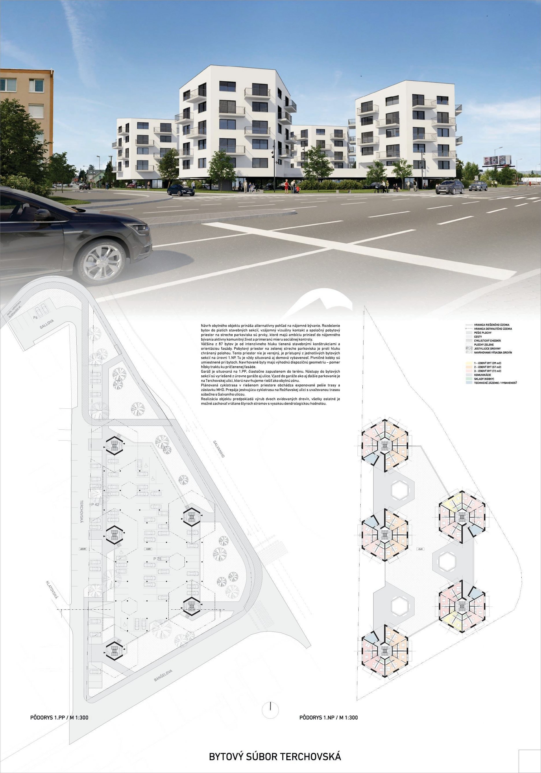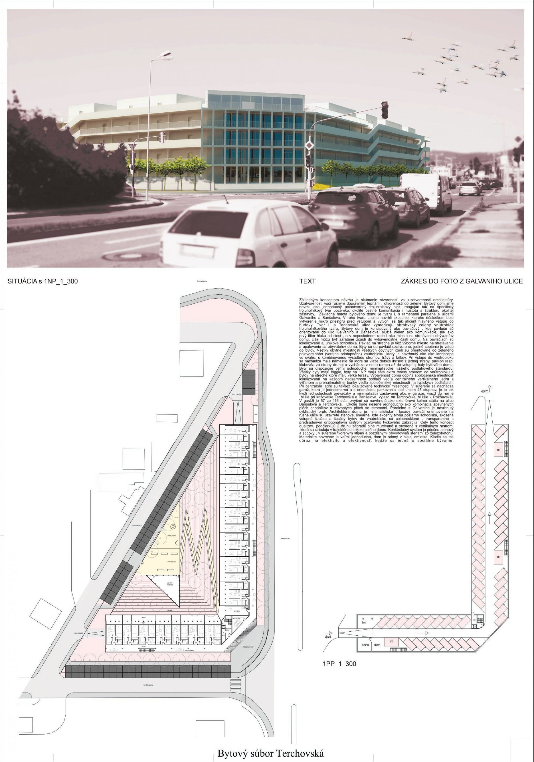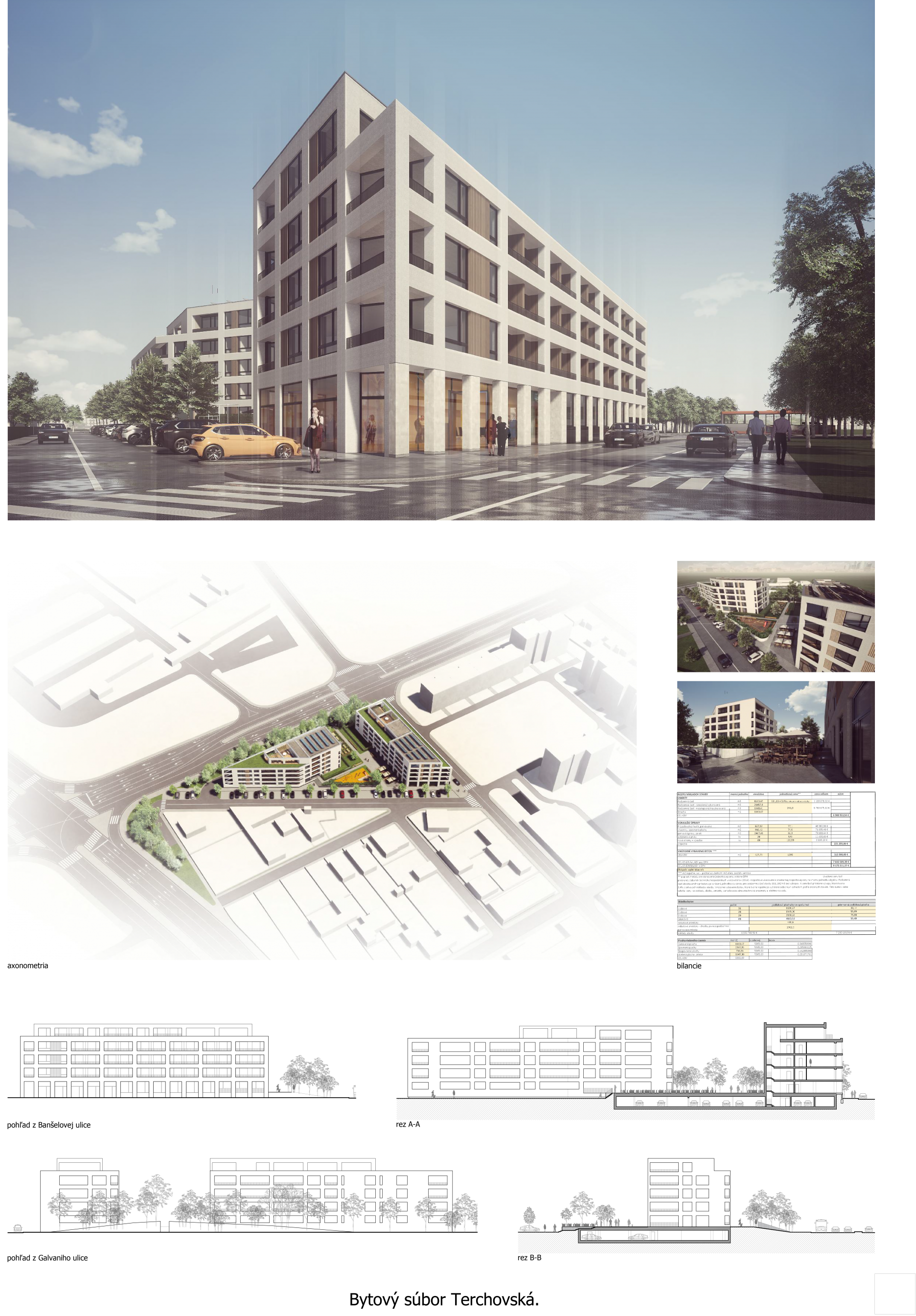 Pri víťaznom návrhu vyzdvihujeme predovšetkým vynikajúce urbanistické riešenie a citlivé začlenenie do územia. Bariérový pavlačový dom odtieňuje hluk z Galvaniho ulice a logicky dopĺňa rad štvorpodlažných panelových domov. Zároveň sa však ku koridoru Galvaniho ulice nestavia chrbtom, keď na oboch priečeliach autori umiestnili priestory vybavenosti. Správnosť tohto rozhodnutia potvrdzuje aj úprava a zvládnutie čelného priestoru pri križovatke Rožňavská - Galvaniho ulica. Skupina menších domov v západnej časti pozemku reaguje na mierku priľahlej zástavby a vytvára tak priepustné poloverejné priestory, ktoré nadväzujú na obdobné priestory medzi panelovými bytovými domami na juhovýchodnej strane Banšelovej ulice. Autori navyše vhodne umiestňujú vjazd do podzemnej halovej garáže do Banšelovej ulice, čím odľahčujú dynamickú dopravu v Terchovskej ulici a potvrdzujú jej status vedľajšej ukľudnenej slepej ulice.