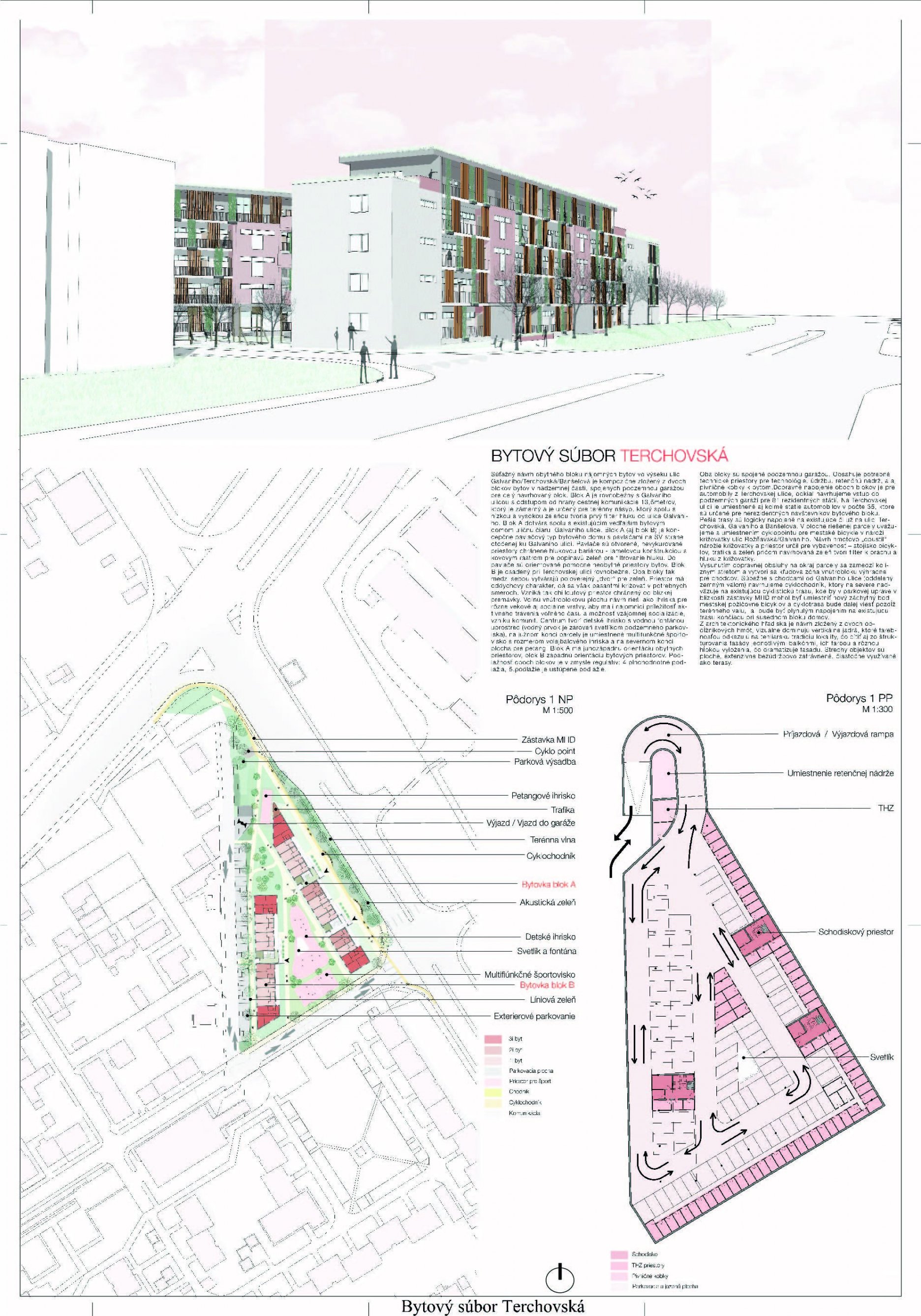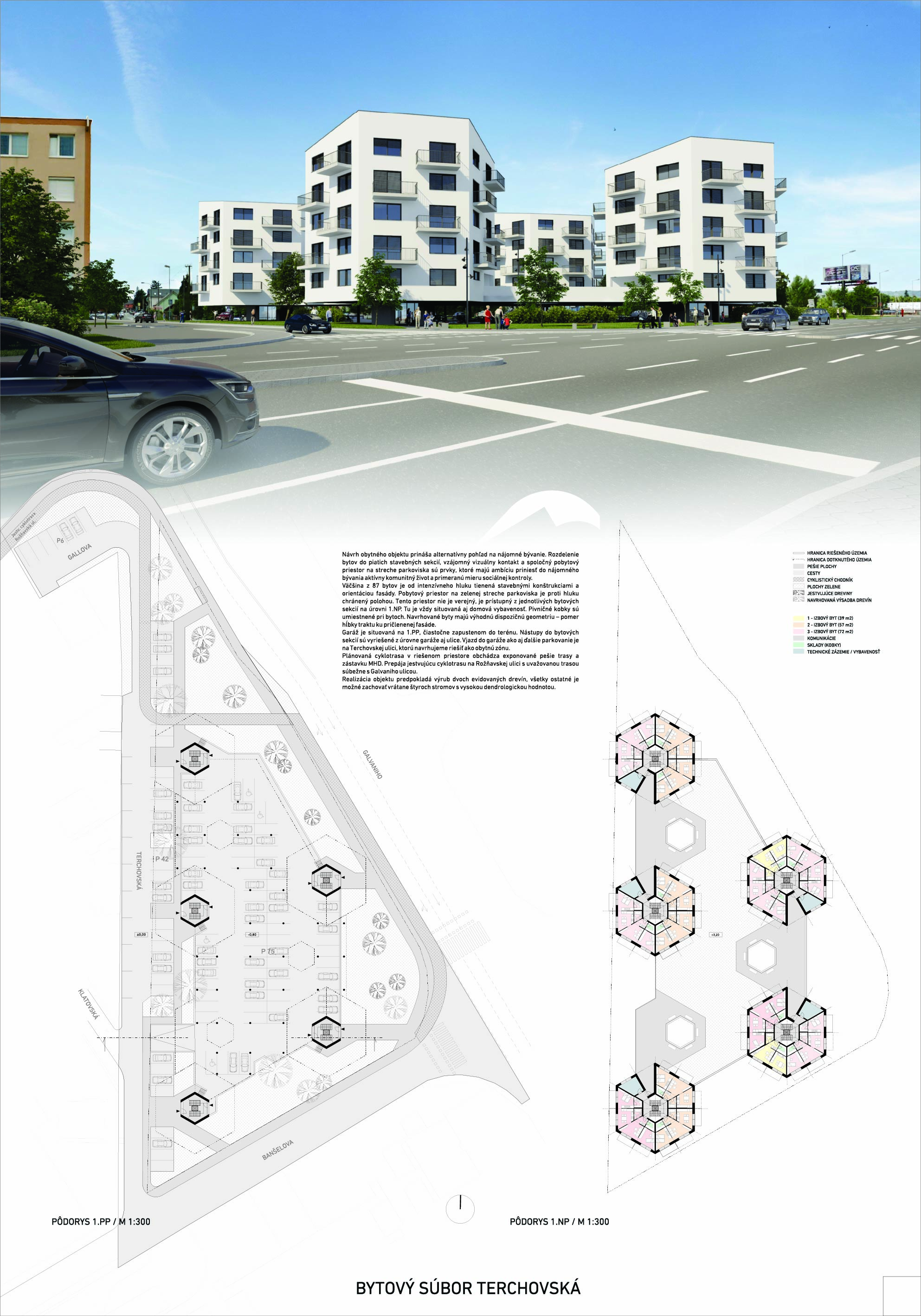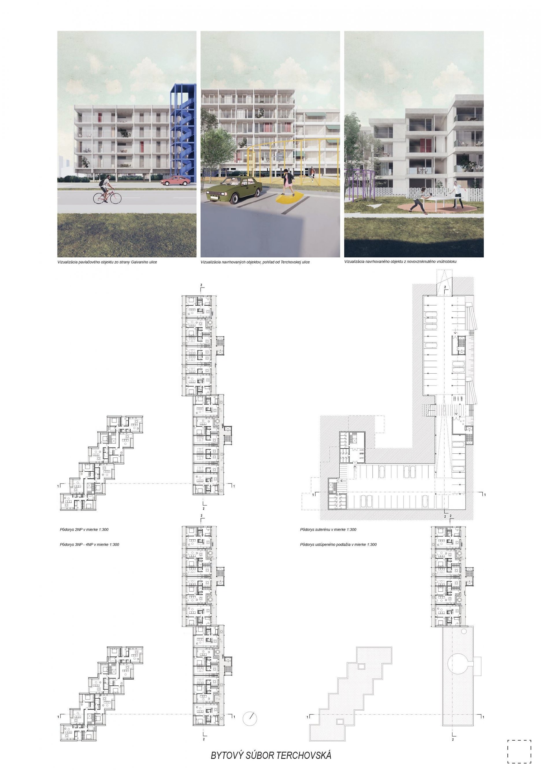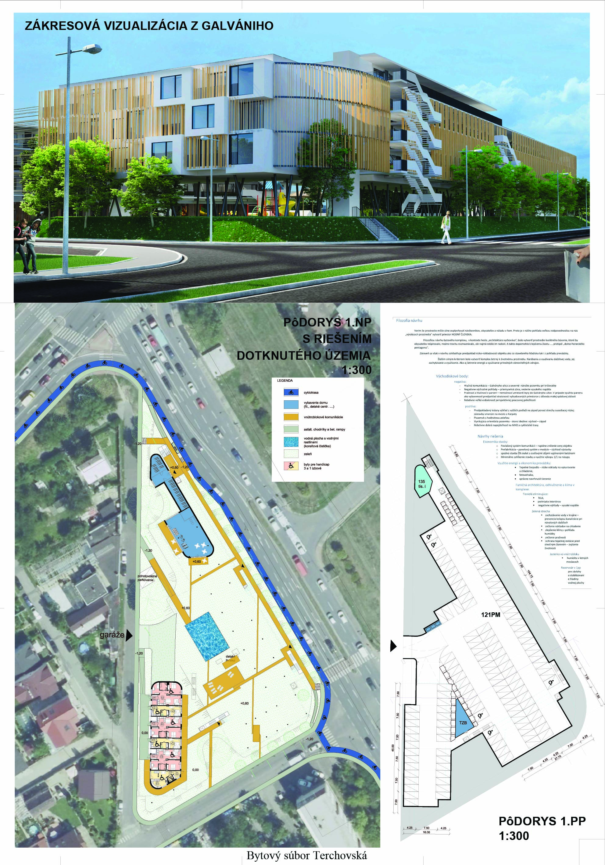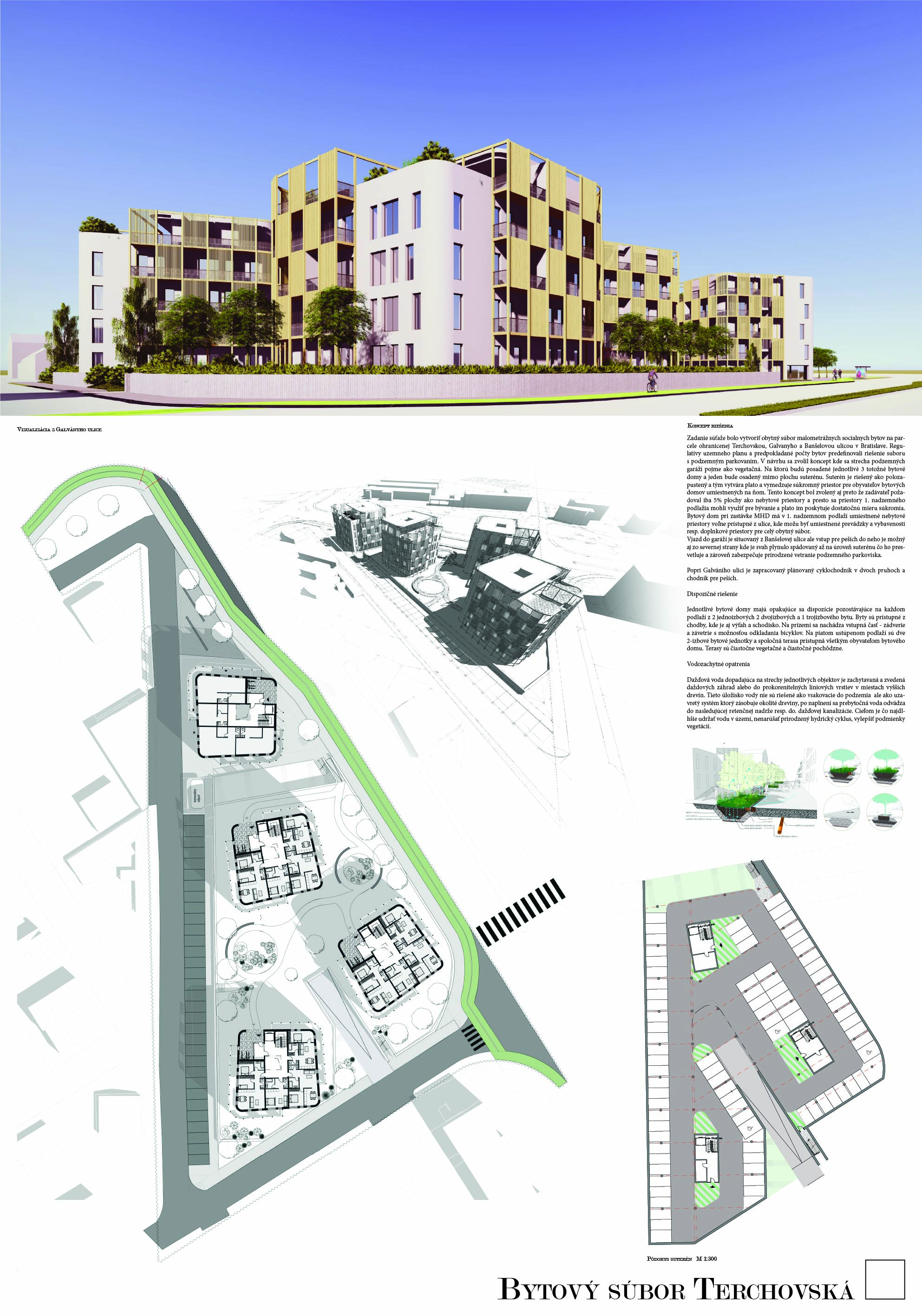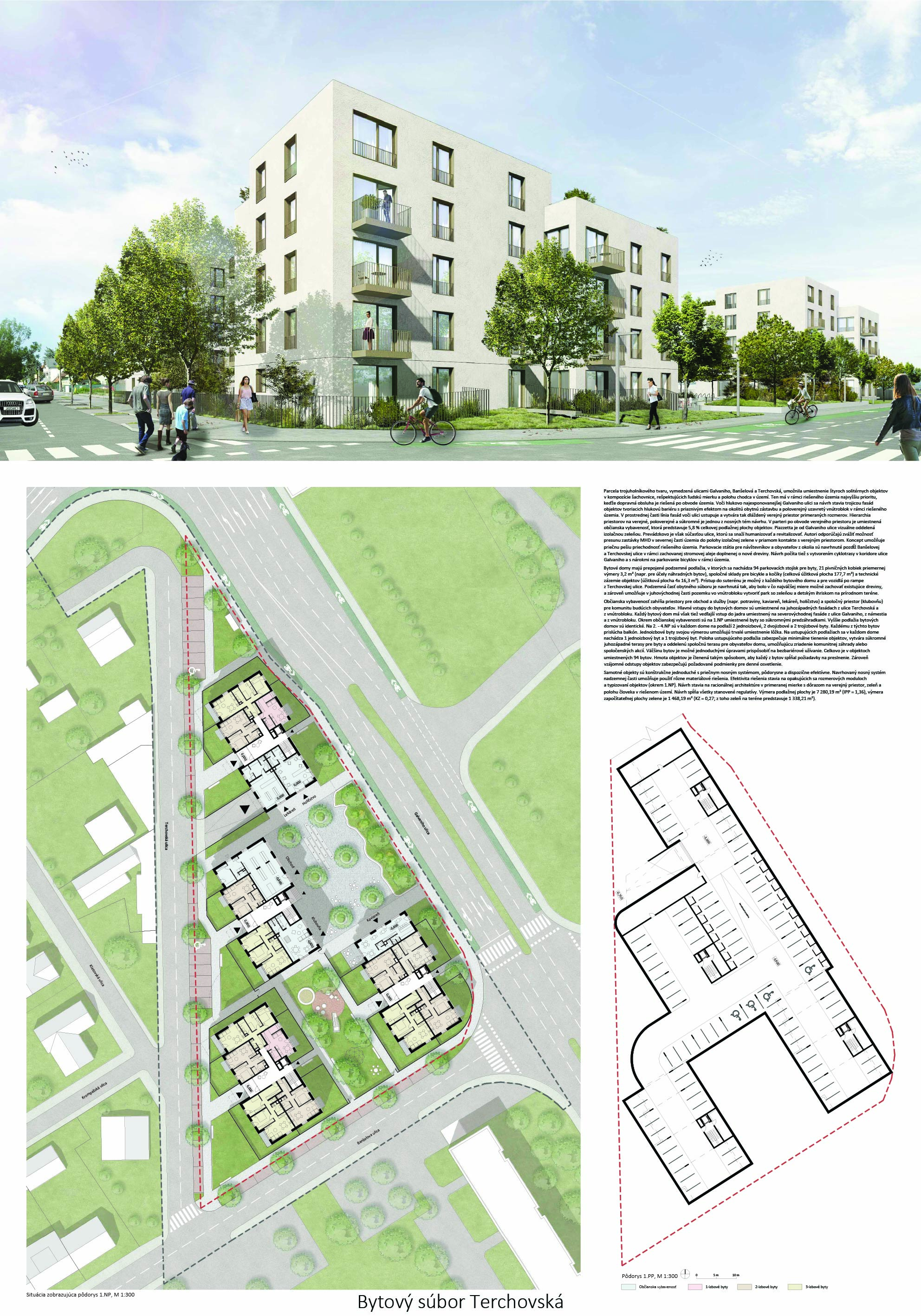 Pri víťaznom návrhu vyzdvihujeme predovšetkým vynikajúce urbanistické riešenie a citlivé začlenenie do územia. Bariérový pavlačový dom odtieňuje hluk z Galvaniho ulice a logicky dopĺňa rad štvorpodlažných panelových domov. Zároveň sa však ku koridoru Galvaniho ulice nestavia chrbtom, keď na oboch priečeliach autori umiestnili priestory vybavenosti. Správnosť tohto rozhodnutia potvrdzuje aj úprava a zvládnutie čelného priestoru pri križovatke Rožňavská - Galvaniho ulica. Skupina menších domov v západnej časti pozemku reaguje na mierku priľahlej zástavby a vytvára tak priepustné poloverejné priestory, ktoré nadväzujú na obdobné priestory medzi panelovými bytovými domami na juhovýchodnej strane Banšelovej ulice. Autori navyše vhodne umiestňujú vjazd do podzemnej halovej garáže do Banšelovej ulice, čím odľahčujú dynamickú dopravu v Terchovskej ulici a potvrdzujú jej status vedľajšej ukľudnenej slepej ulice.